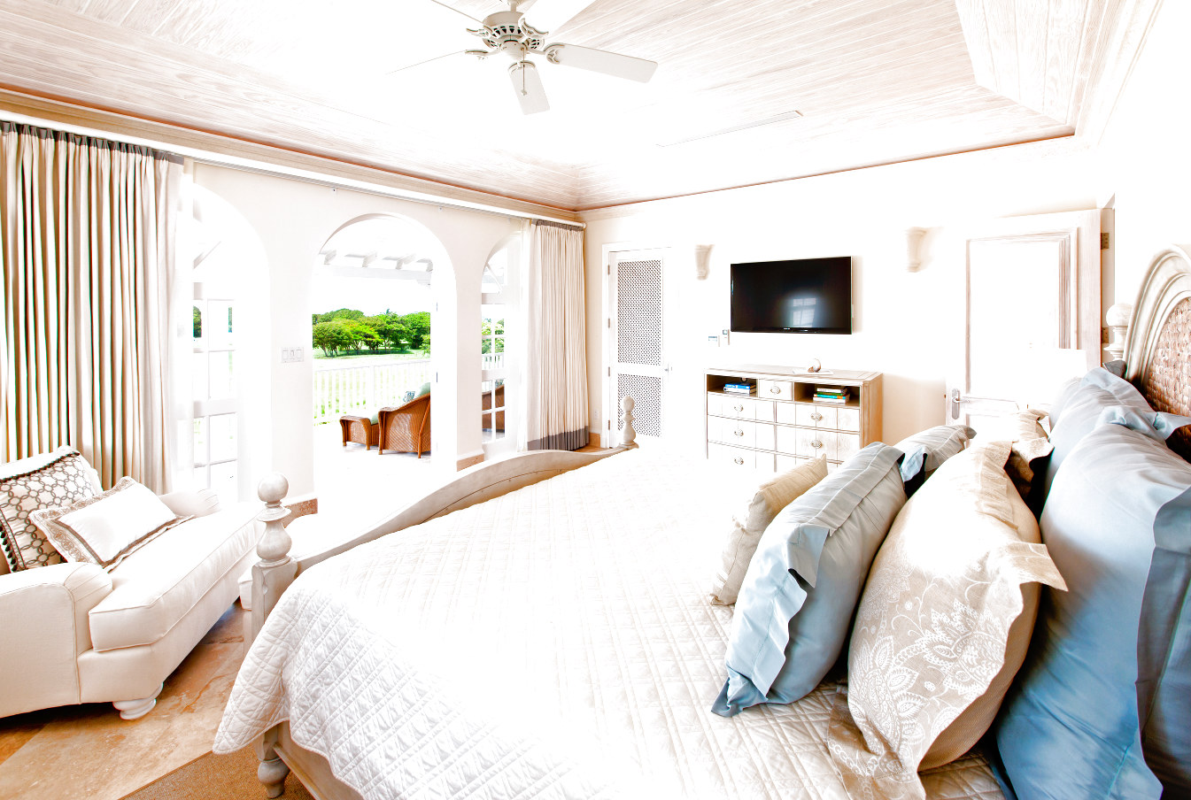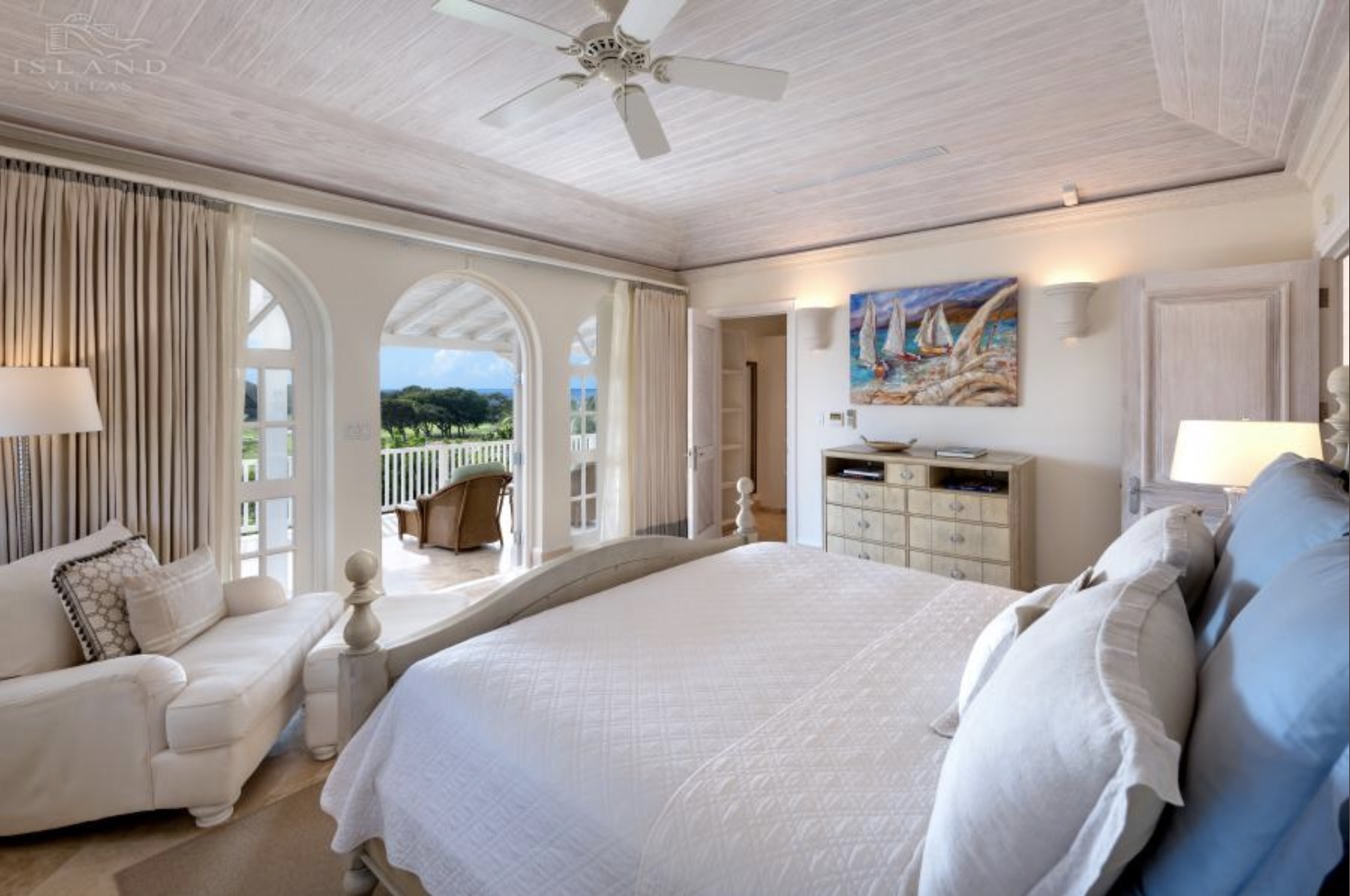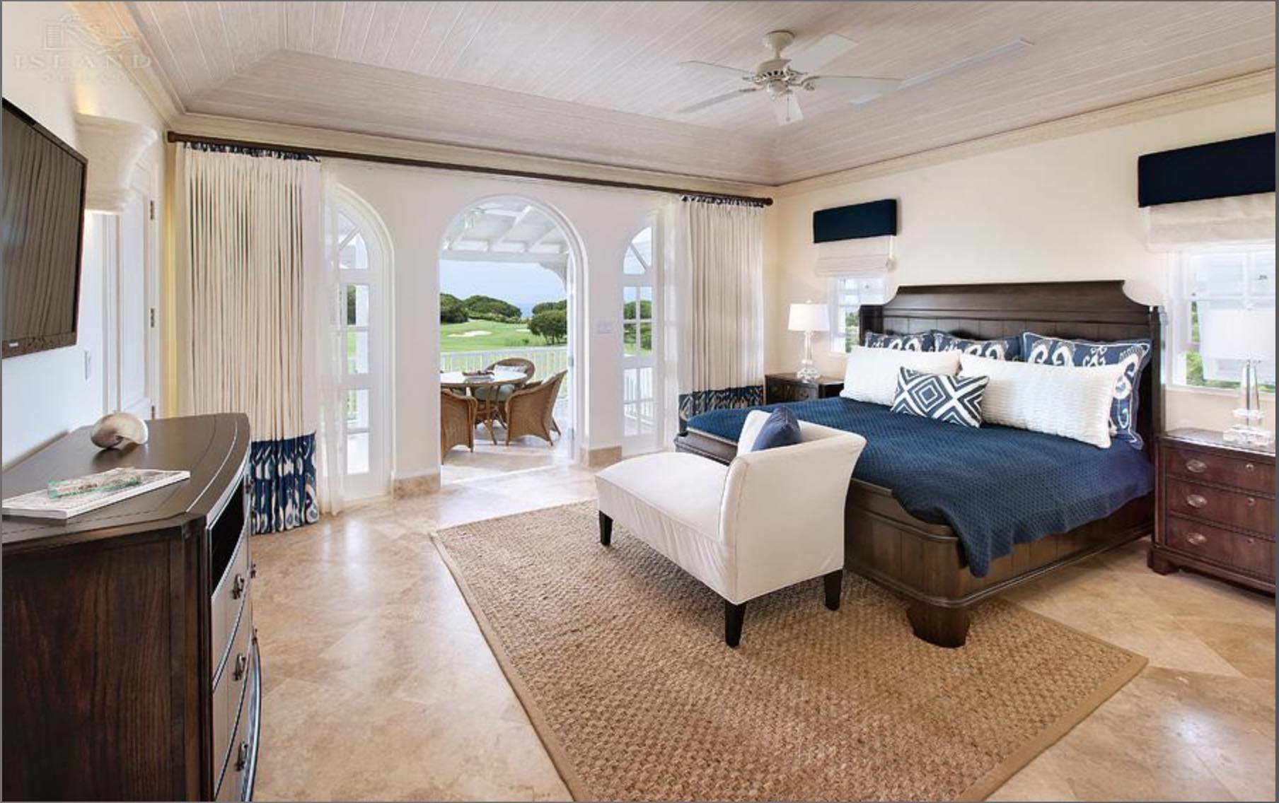 On the upper level, the Master Suite and first guest en suite bedroom both enjoy views of the sea and golf course. These bedrooms share an interconnecting walk-in closet; which can be locked off, as well as a shared patio and are outfitted with king beds and offer the option of ceiling fans or air conditioning.