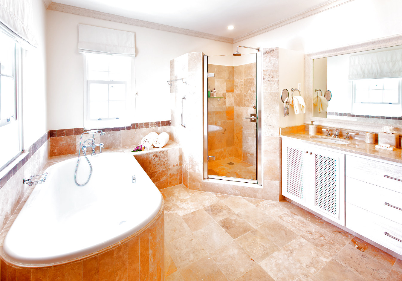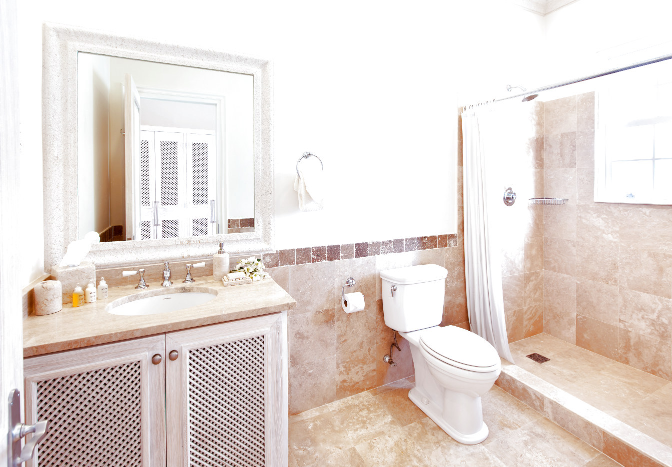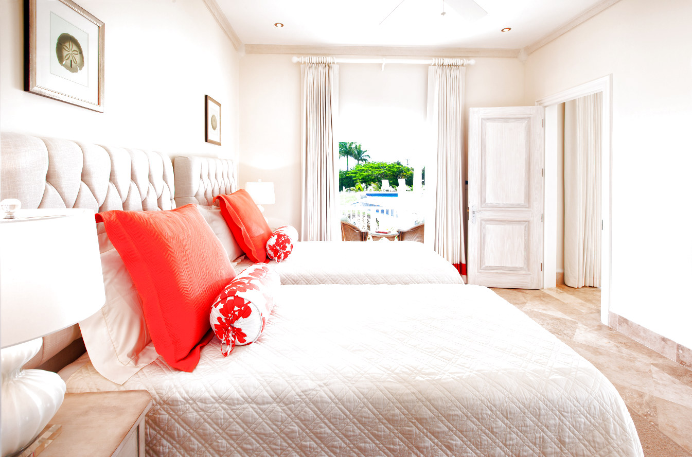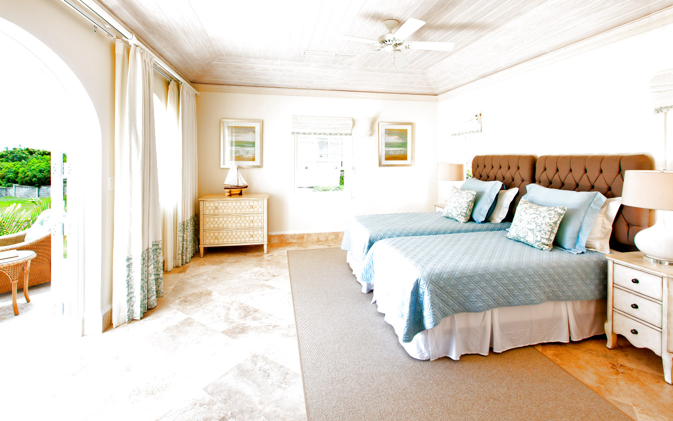 On the upper level, the Master Suite and first guest en suite bedroom both enjoy views of the sea and golf course. These bedrooms share an interconnecting walk-in closet; which can be locked off, as well as a shared patio and are outfitted with king beds and offer the option of ceiling fans or air conditioning.