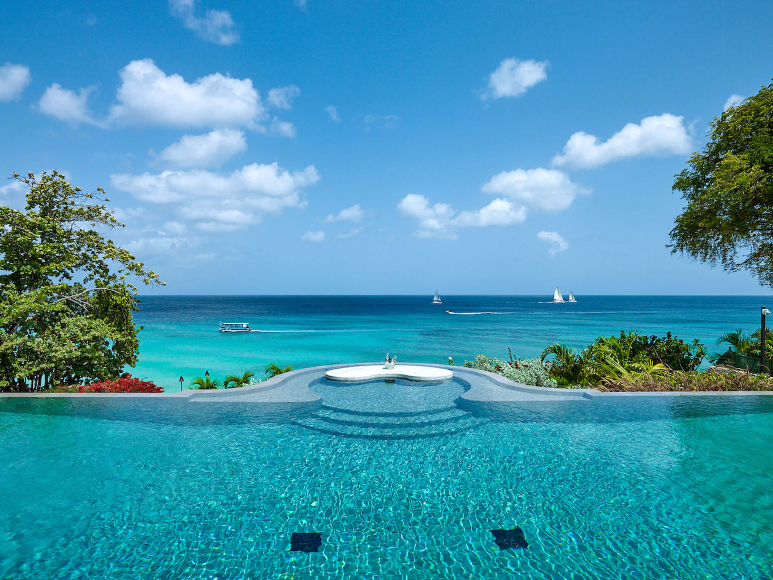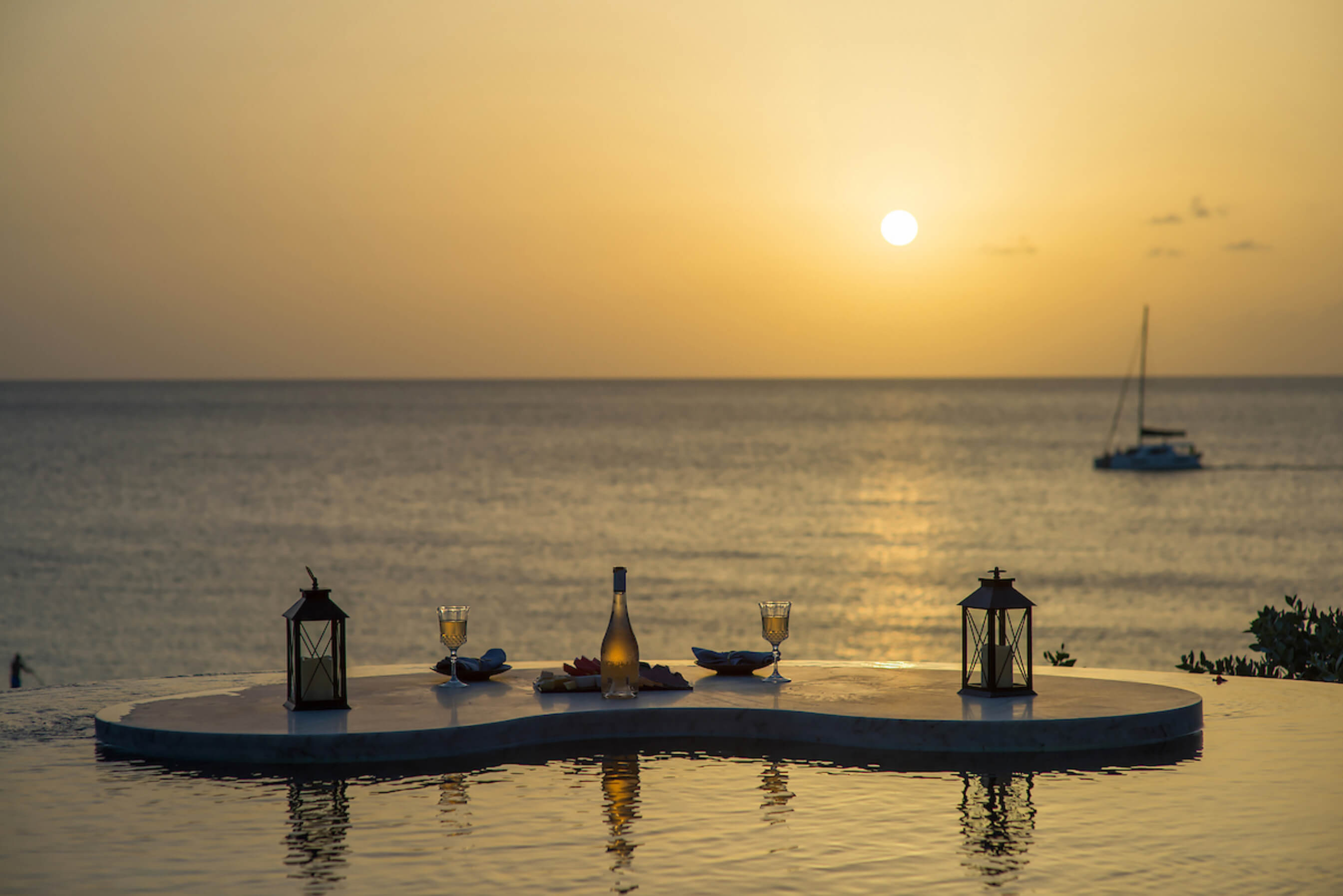 The one of a kind infinity edge lap pool has a built in bar table and sunken seats an ideal setting for unforgettable sundowners.