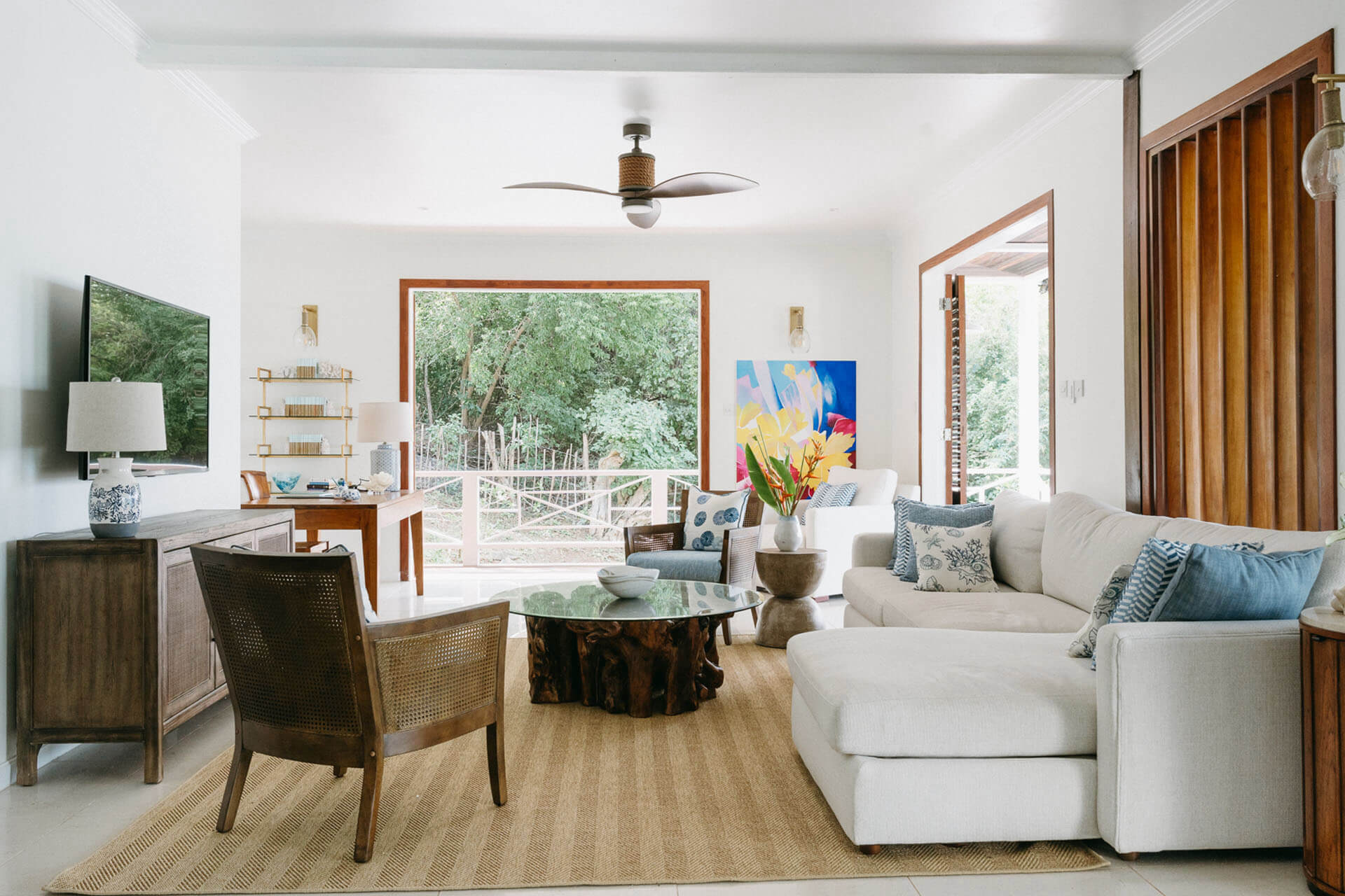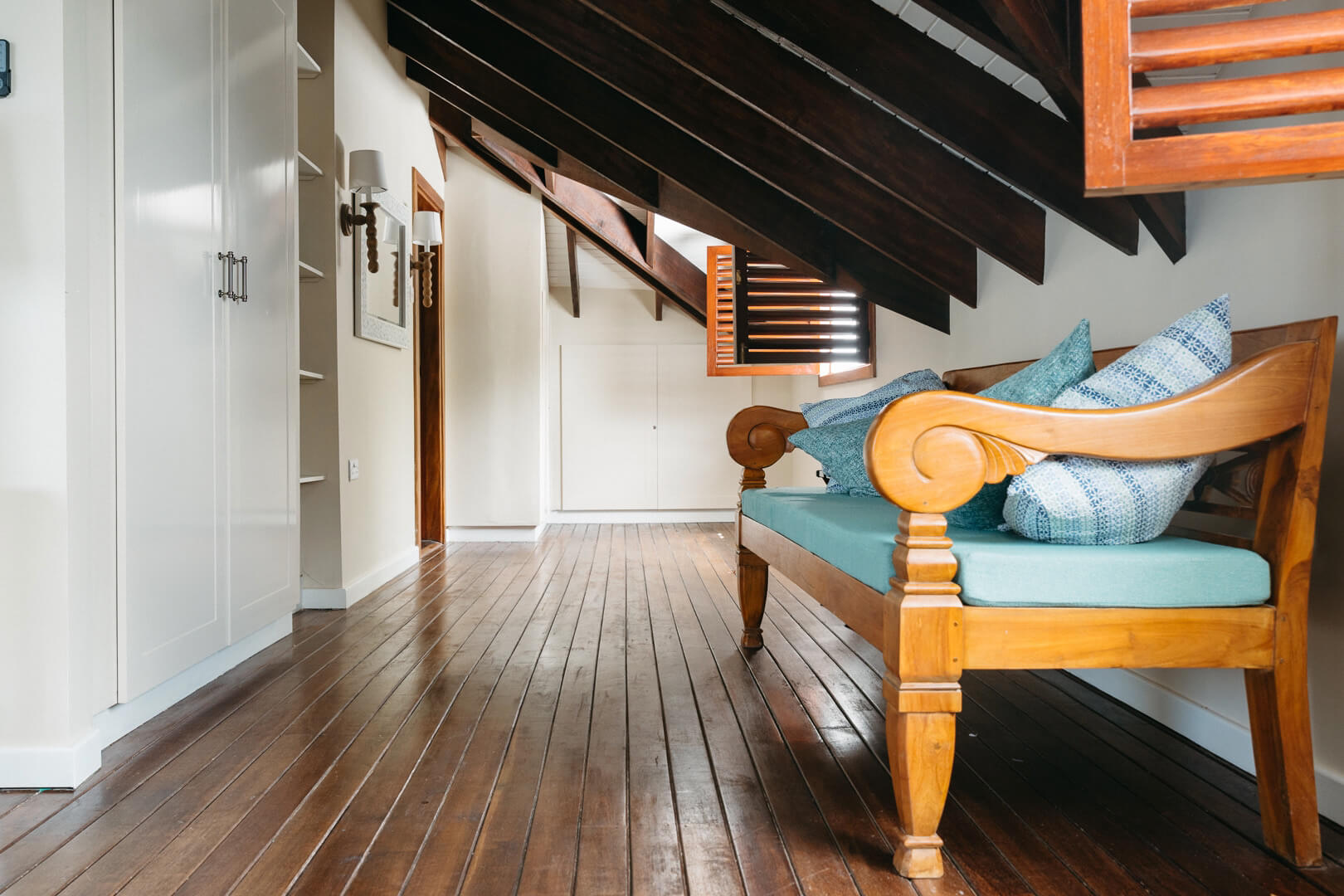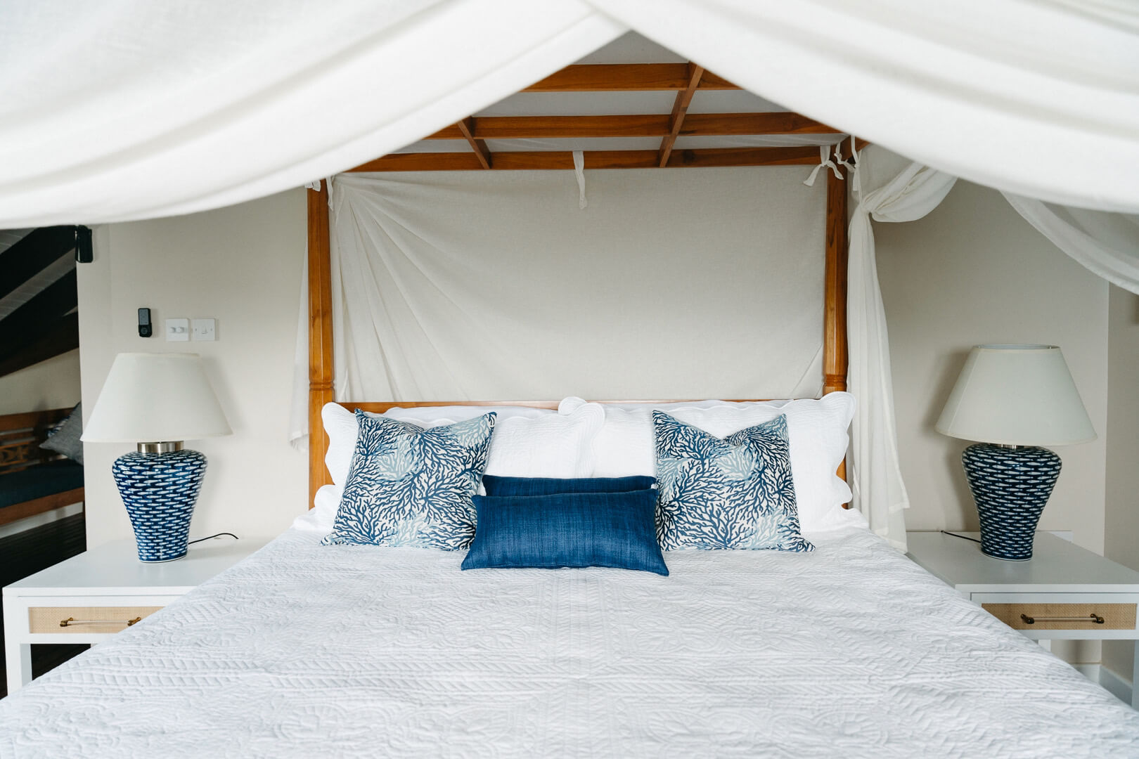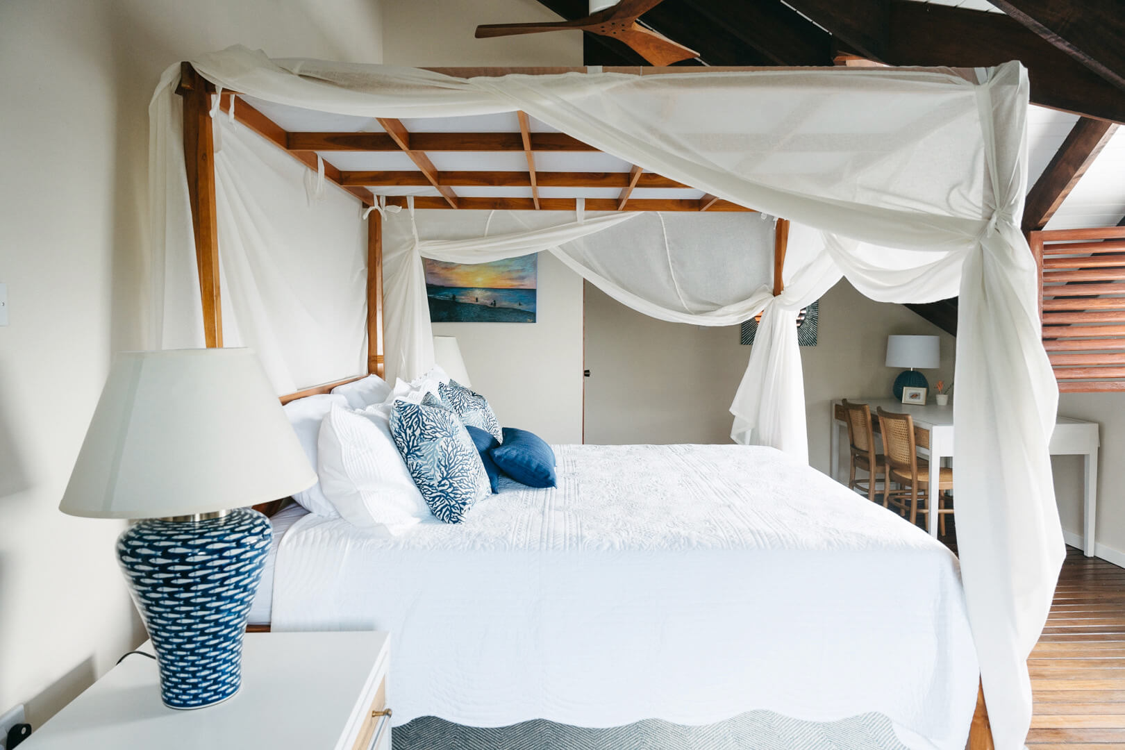 WiFi throughout, a 6ft flat screen TV & Blu Ray DVD player and a home office are available, although cable has yet to arrive on this unspoilt island. This spacious villas interior has pristine polished wooden walls,and contains beautiful pieces of sculpture.