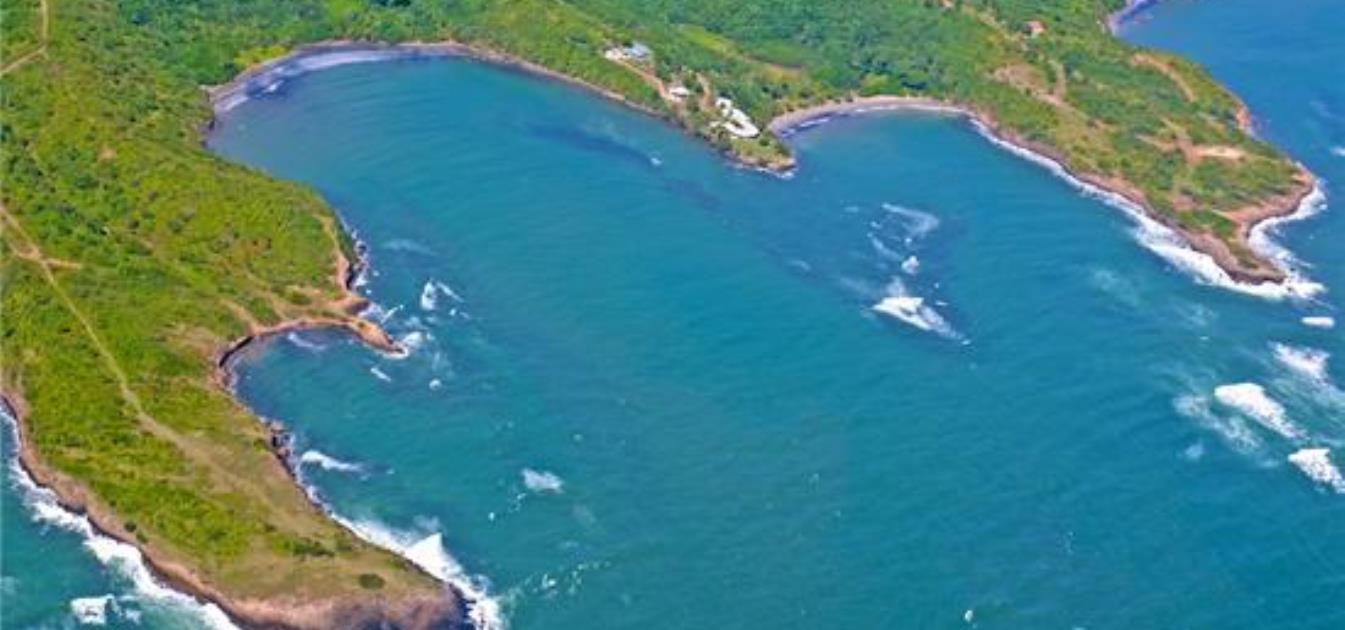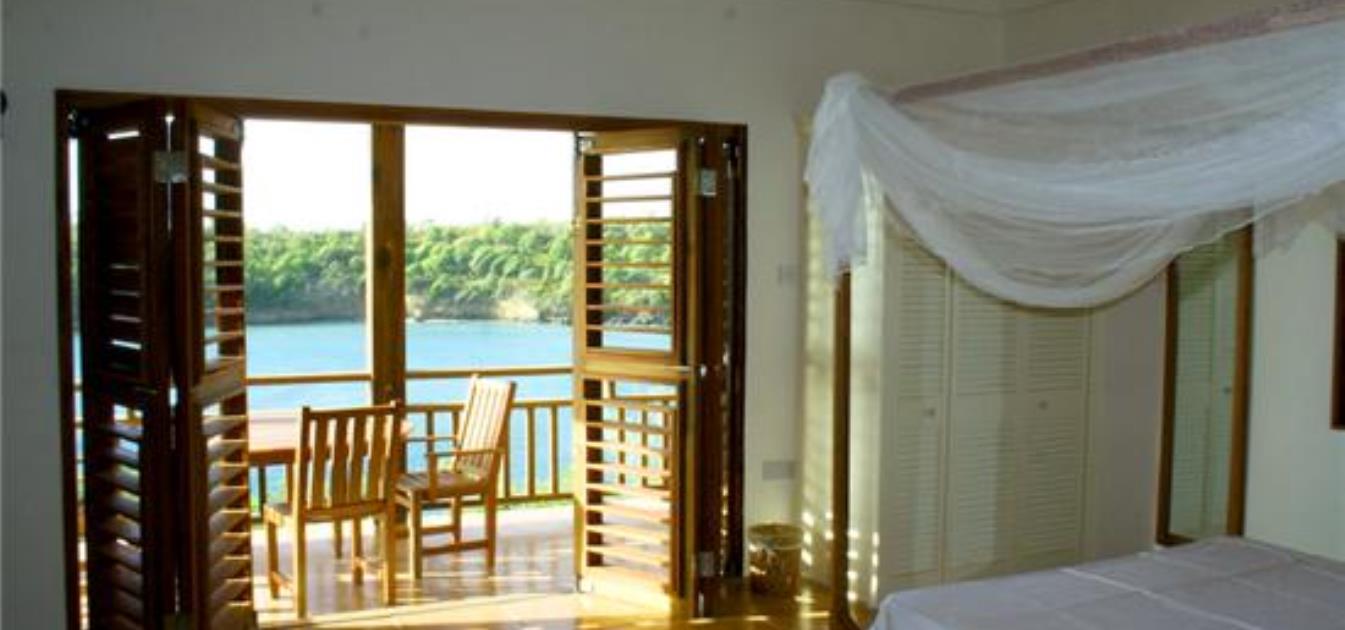 Two Bays nestles amongst gentle tropical slopes facing the ocean with an oft- deserted safe sandy beach just yards away. Lucky guests can lie back and enjoy these views from their four poster beds . The two bays are populated by local wildlife such as Ospreys and Pelicans and occasional local fishermen but little else. Some locals come down to the beach at weekends.