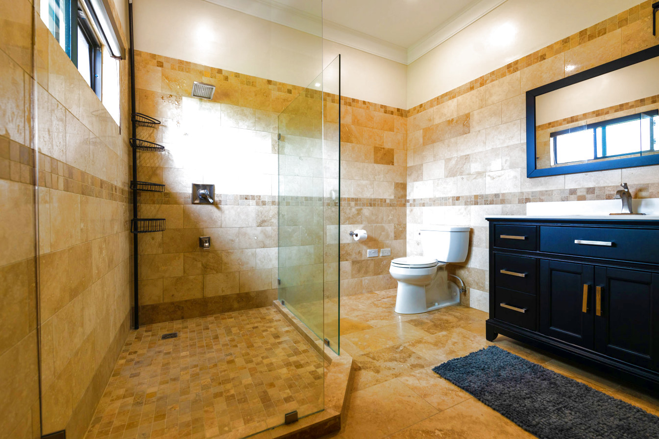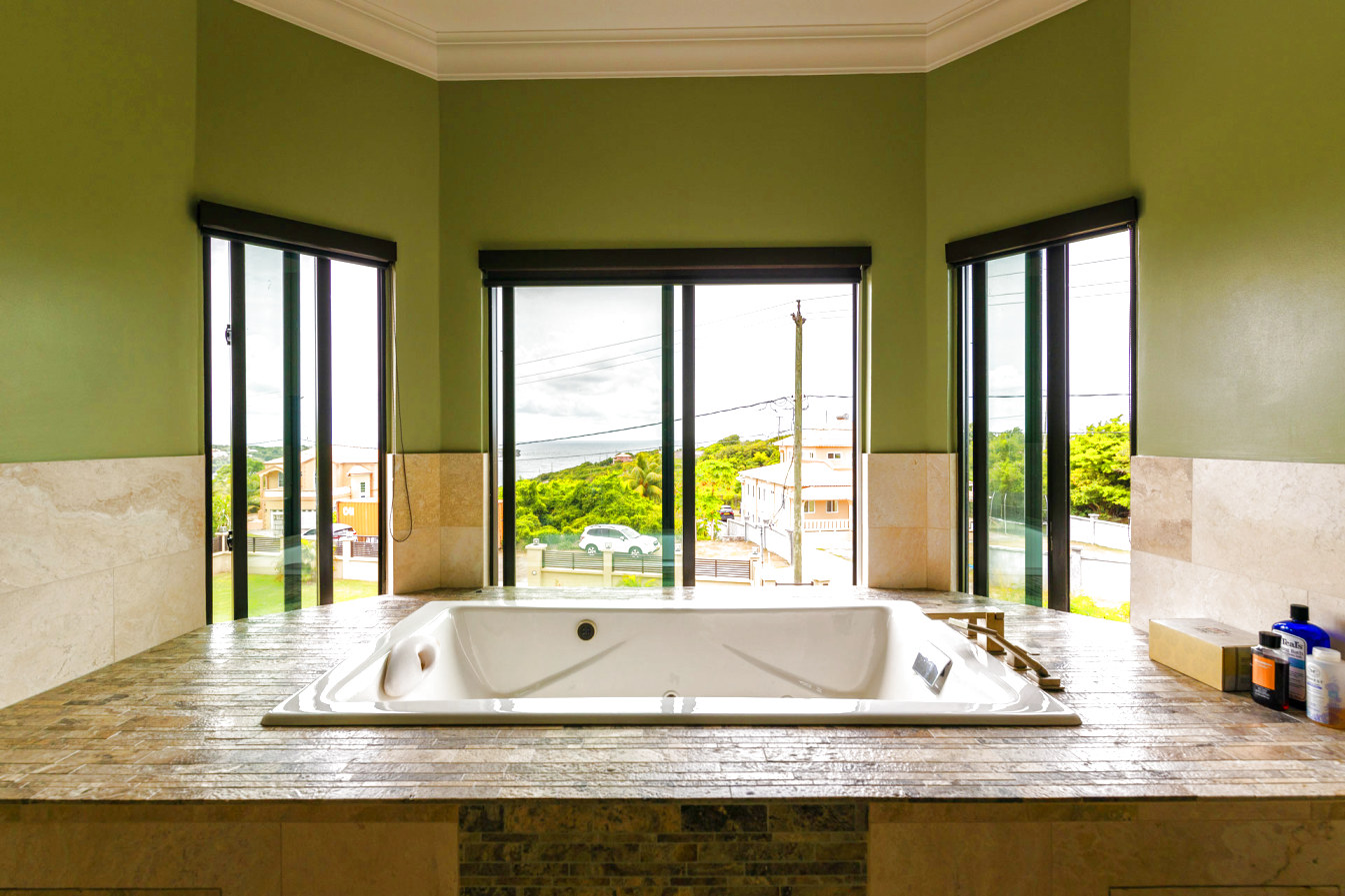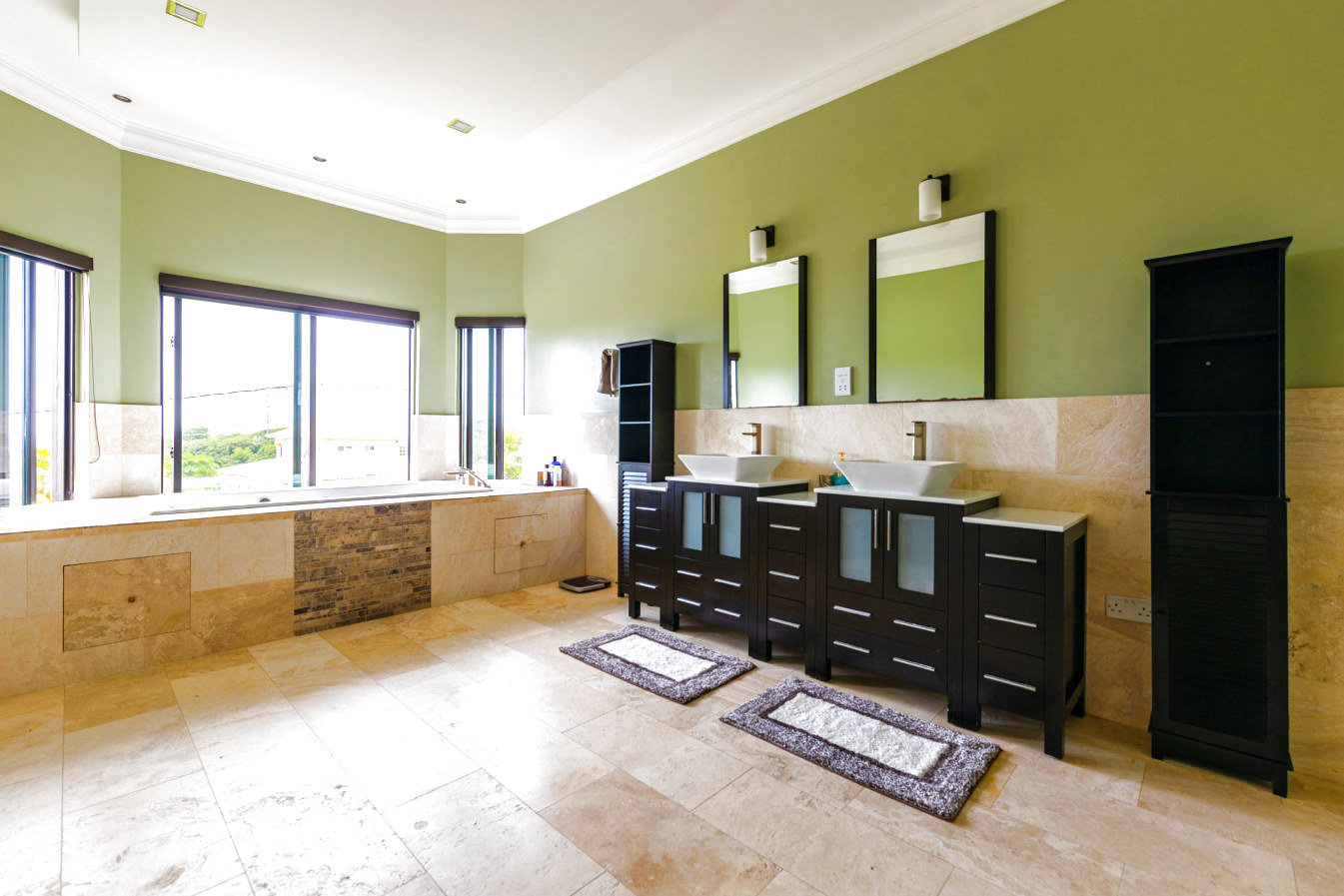 The master has a large built-in Bathtub within a raised platform enjoying superb views and plenty of space to park a glass of champagne while you soak.