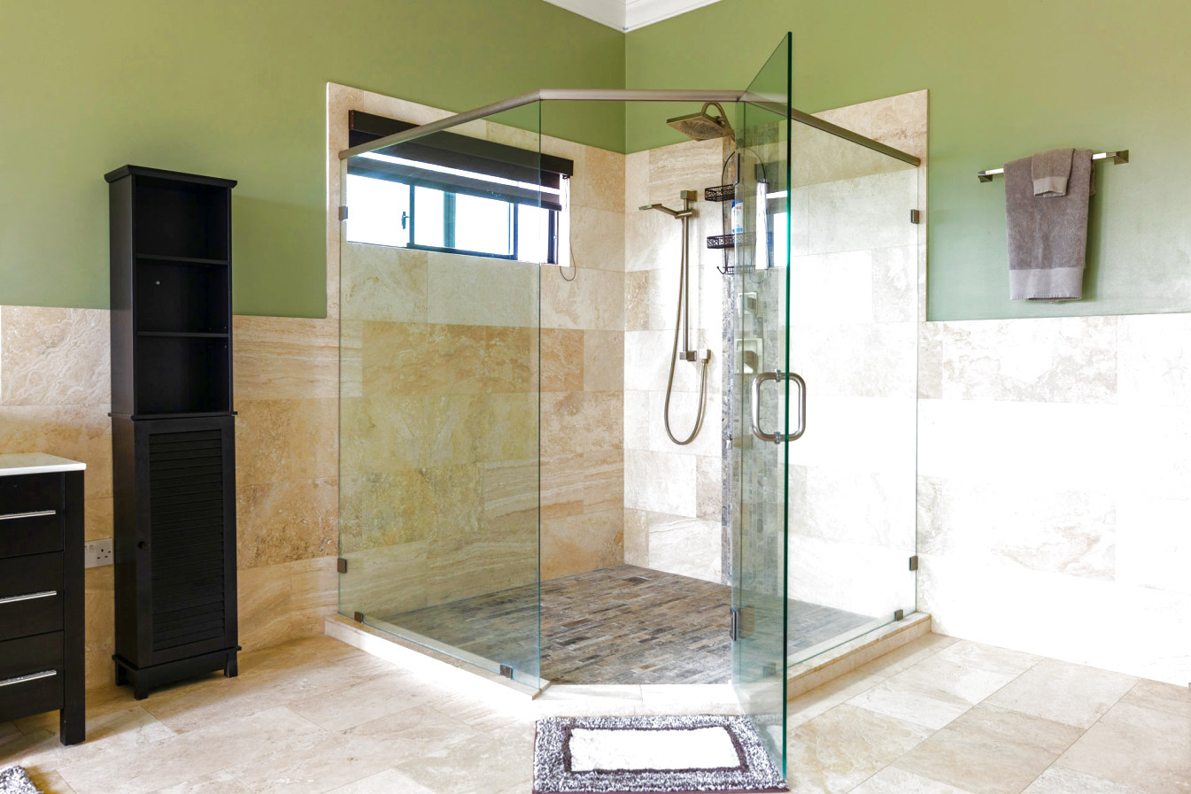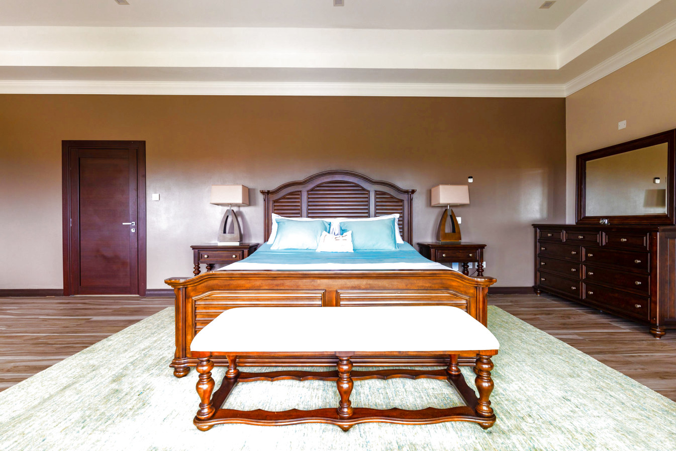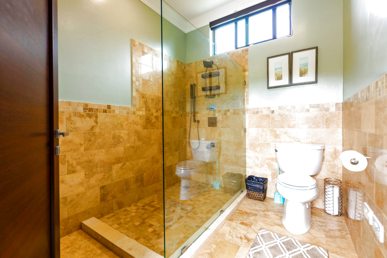 The master has a large built-in Bathtub within a raised platform enjoying superb views and plenty of space to park a glass of champagne while you soak.