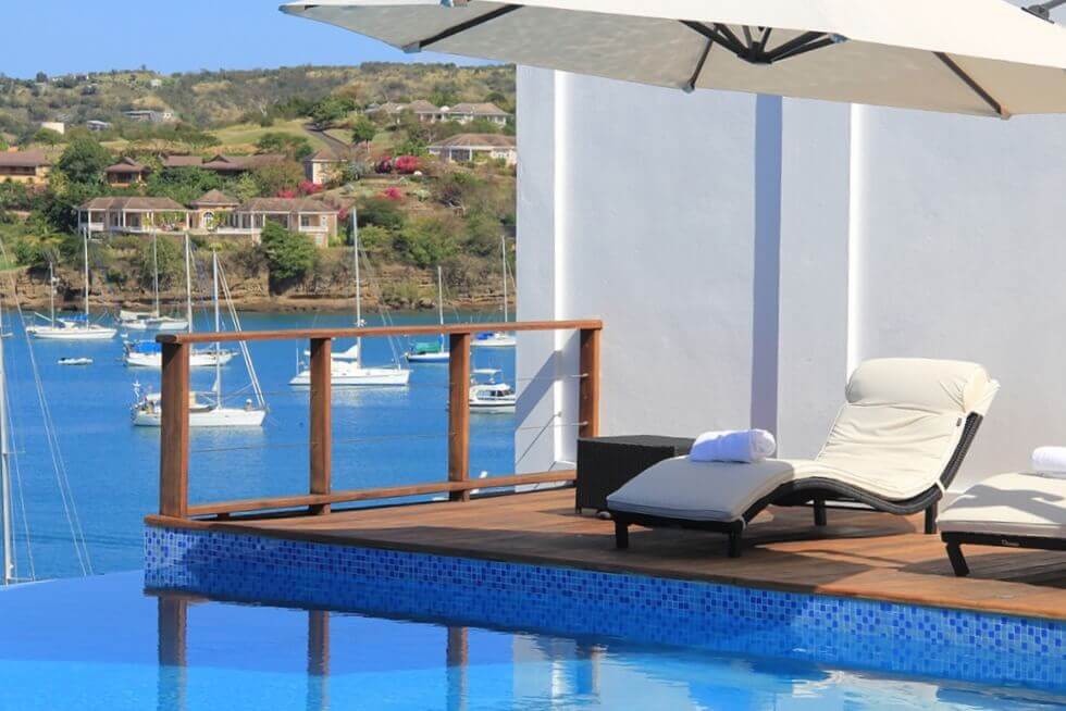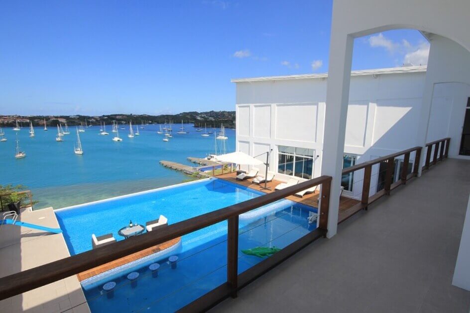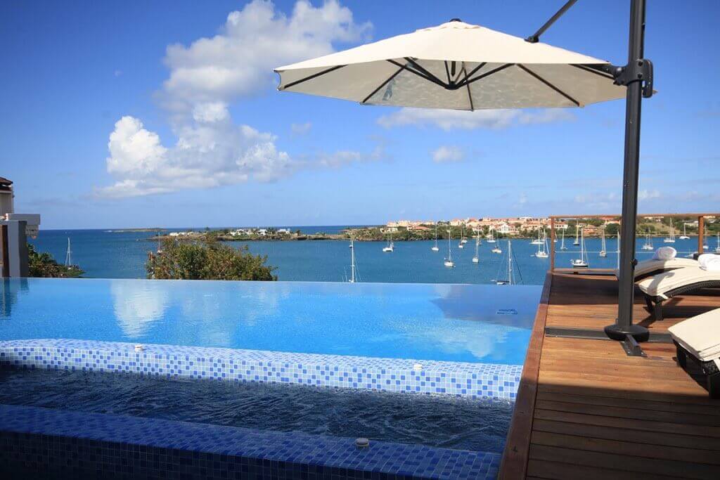 This beautiful infinity pool is 45 ft long, 35 ft wide and at It's deepest point 6ft deep. It's edge overlooks Prickly Bay, the cruise ships and sailing boats and is surrounded by chic sun loungers, pristine sun deck and an adjacent covered gazebo. There is a pool maintenance man who visits 3-4 times a week to clean the pool.