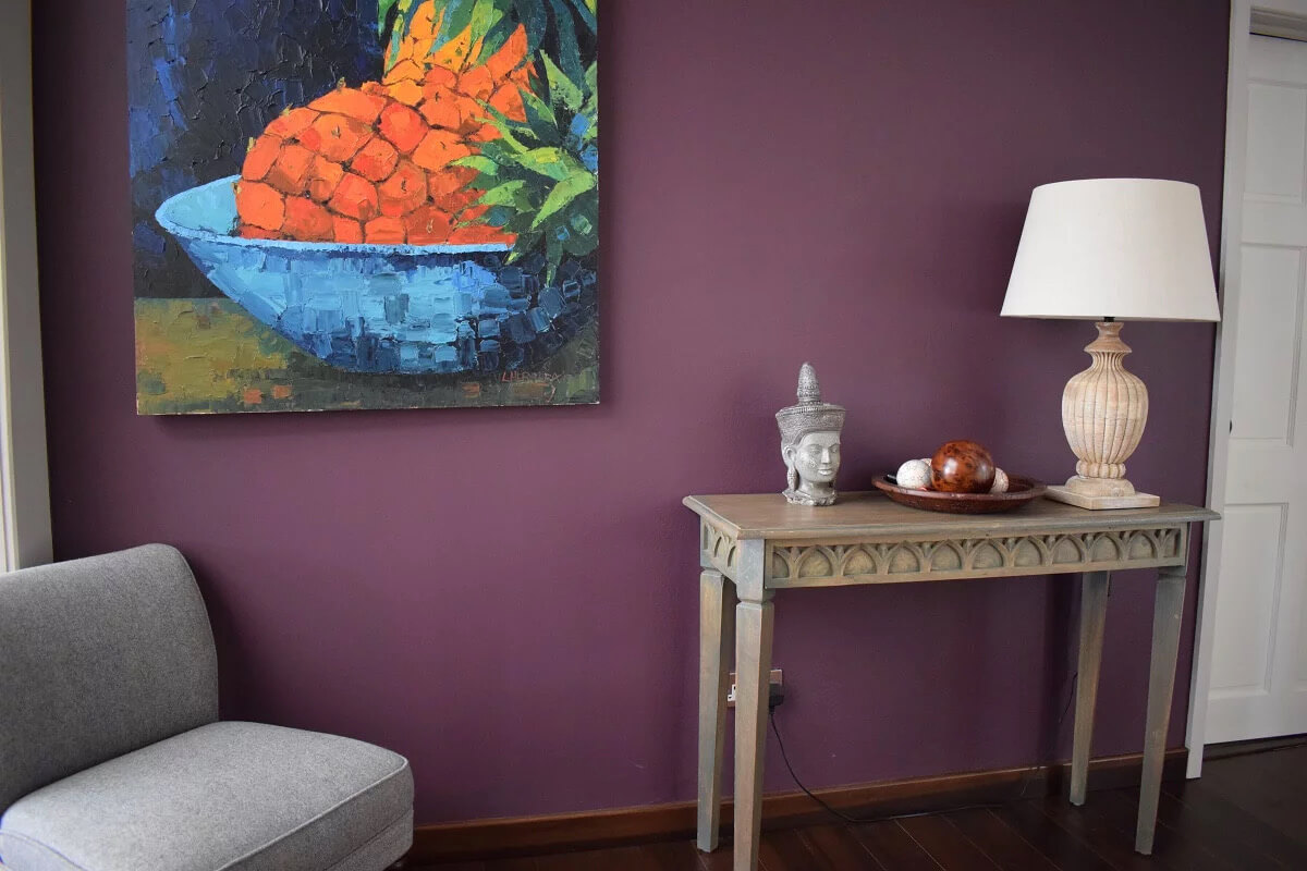 Welcoming entrance hall with views to the bay leading into the central open plan living area. Guest washroom with large scale maps of Grenada and the West Indies.