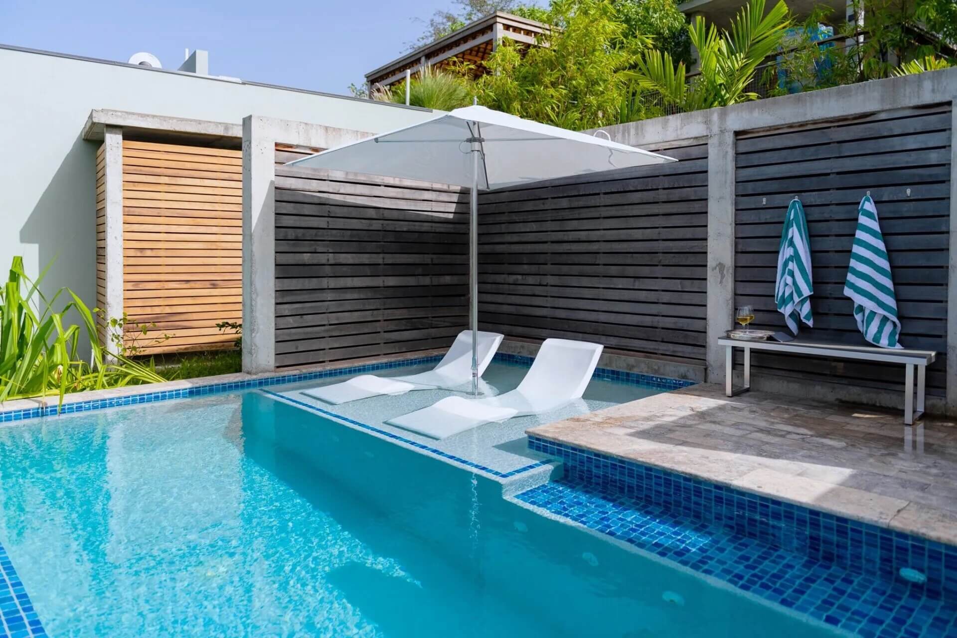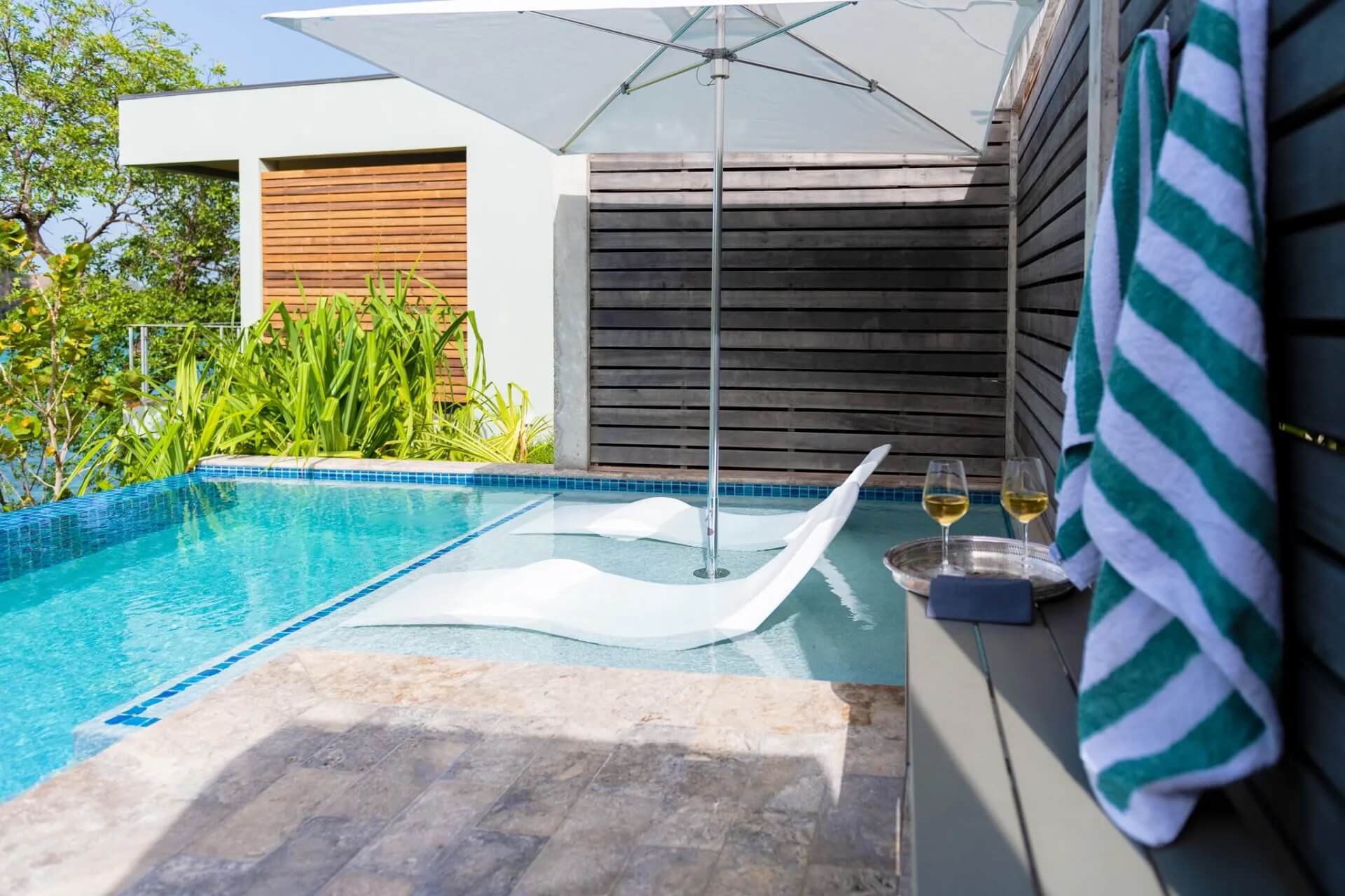 Relax poolside in submerged loungers with panoramic bay views.