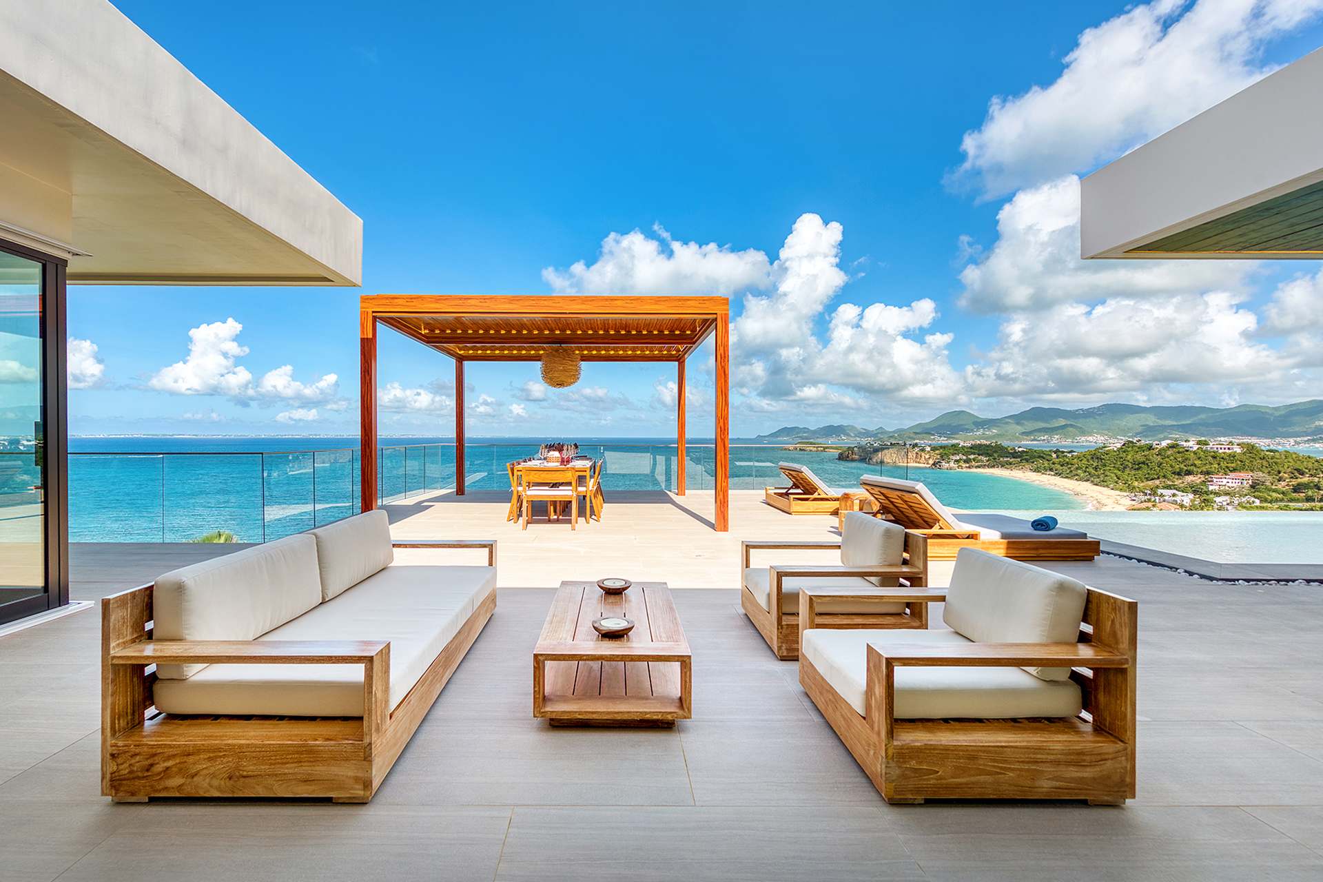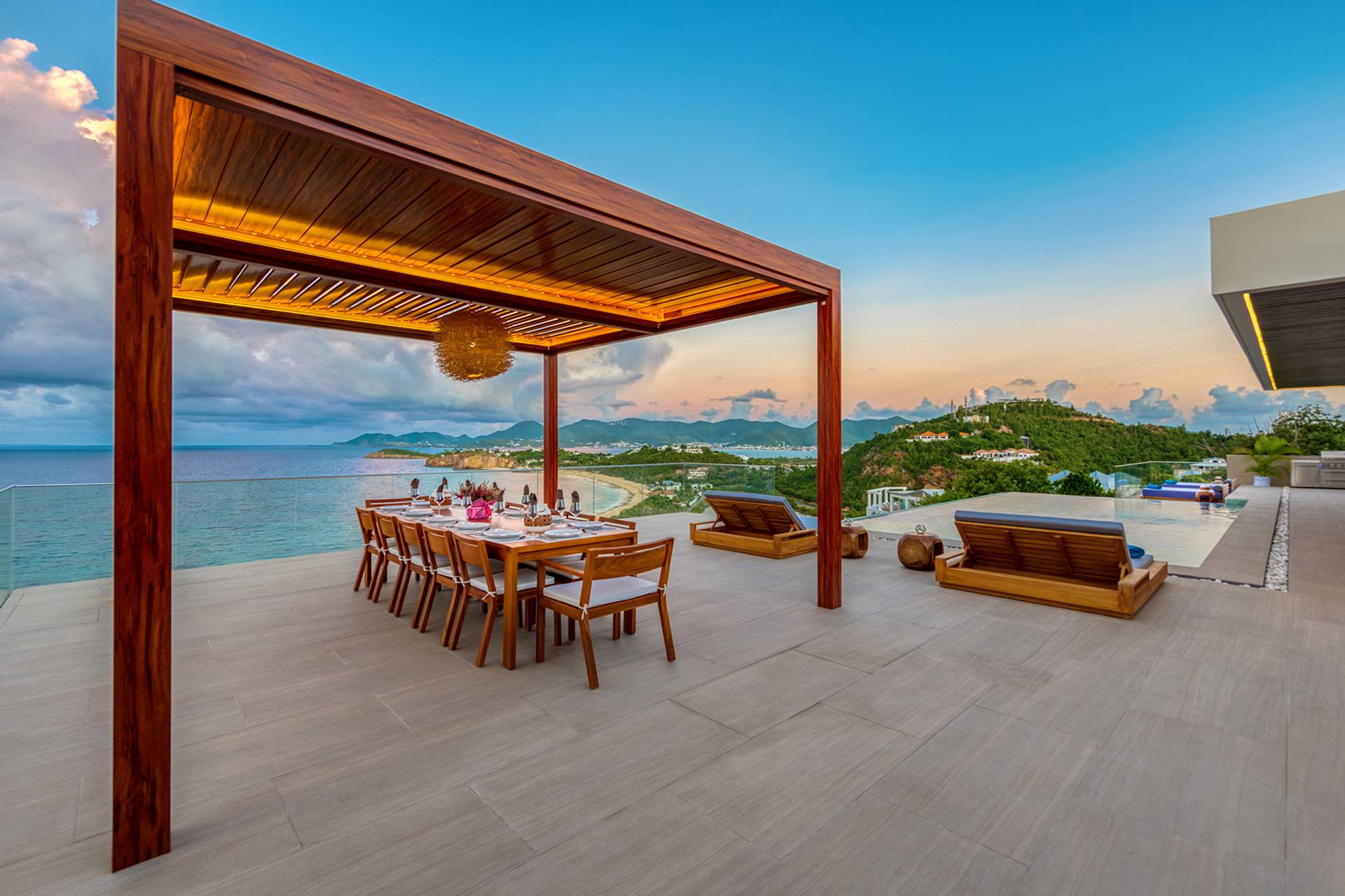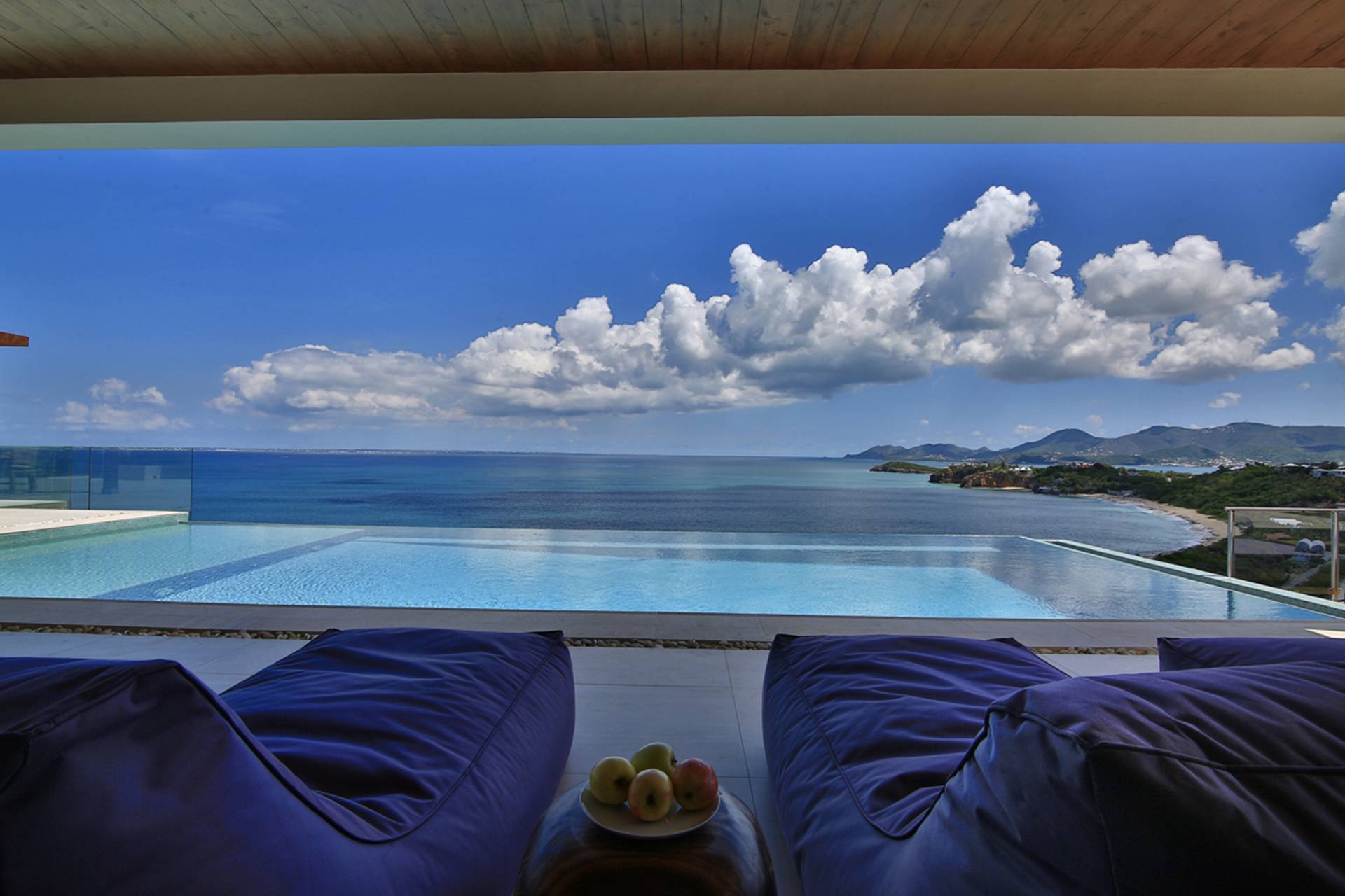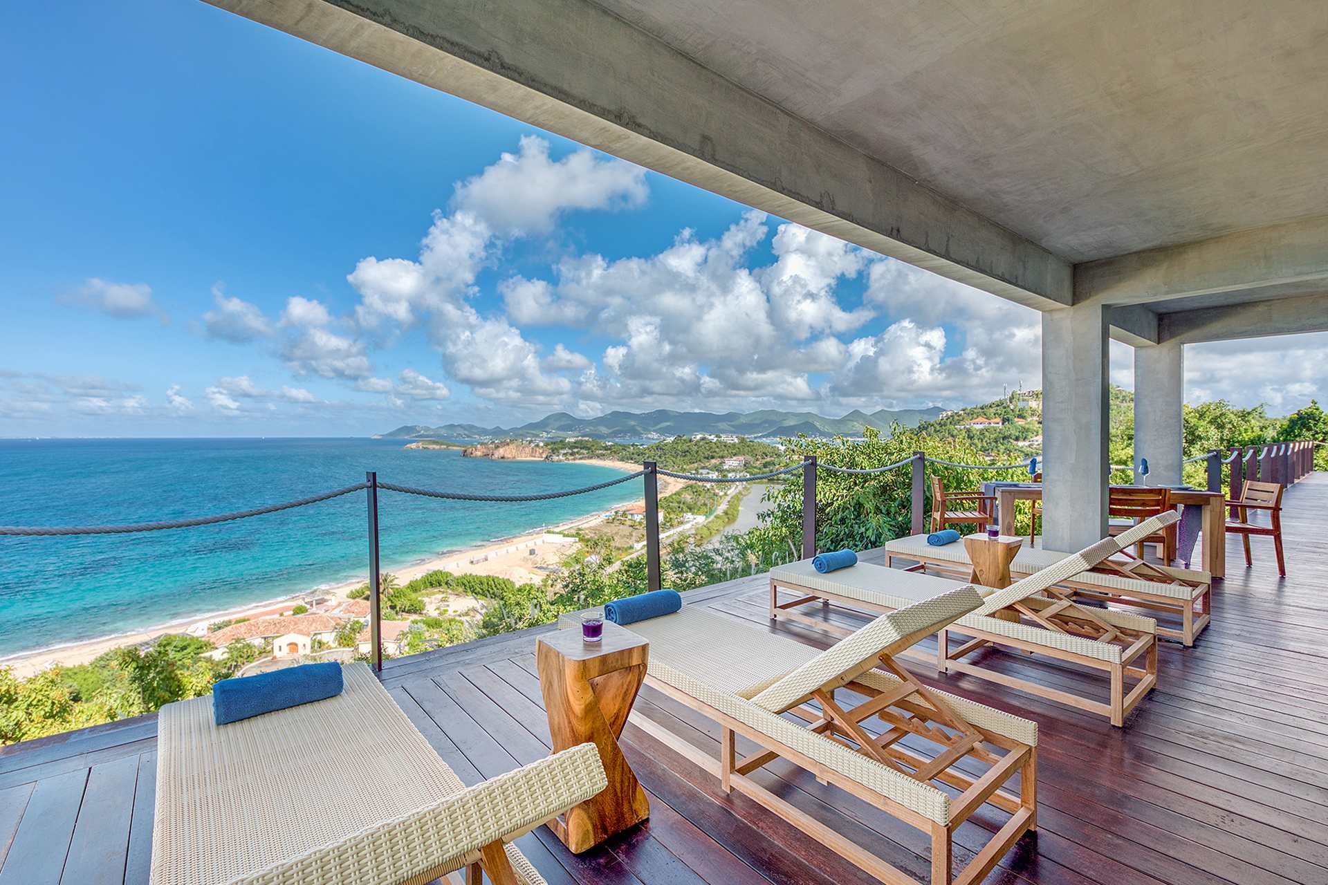 Villa Amandara is a modern-chic property with some of the best views on the island based in Terres Basses, St.Martin.Villa Amandara is one of the most stunning and desirable villas in St. Martin. This estate offers world-class views from all 5 bedrooms and its many communal spaces. You won’t need anything else once you see the villa's private Bali massage house with a carved stone Balinese tub, bar, and cinema with a window into the pool, as well as a regulation Petanque/Bocce ball court, a volleyball court with a basketball hoop, and a gym. This exceptional villa sits on 2.5 secluded acres. There is an incredible chef available for bookings, and six days a week of housekeeping and laundry are included with each booking. This estate was featured in a magazine article called, "10 Places to Stay Before You Die..” and Villa Amandara lives up to that reputation.Upon arrival, the gates open and reveal the tropical plants before greeting you to a spacious courtyard with a dazzling solid glass door entrance revealing breathtaking views. The exterior showcases an infinity pool that mimics the color of the ocean with its turquoise mosaic-lined details. The spacious terrace, with discrete and open spaces, extends the length of the villa. It is filled with private spots and gathering areas for lounging, sunning, and dining. The terrace is a perfect place to watch the ever-changing tropical sky; The true Caribbean dream. There is a little hanging bridge that leads you to the gazebo and is perfect for a massage. The Indonesian river pebbles define the spaces around them along with a beautiful teak pergola that establishes harmony in the terrace. For a quiet escape, a Thai pavilion awaits in the lower garden. The American-style interior opens to the modern and spacious living room with an airy feel lined with unique beamed ceilings. This room very quickly resembles a home all thanks to the wonderful wood details, exotic touches of teak and rattan furniture, and its neutral fabrics. The expansive great room seamlessly blends the lounging and dining areas with a beautiful modern kitchen in elegant woods, upscale appliances, and an unforgettable view.Four bedrooms, two masters, and two smaller rooms are all under one roof. Each room includes a brilliant view, internal access to the room, and serene white decor with gentle pops of color. The en-suite bathrooms exude a beautiful spa-style attitude. The two masters have fabulous outdoor showers and bathtubs open to the sky. The fifth bedroom is a huge apartment on the lower level with an interior and exterior entrance together with a kitchenette and a private terrace. The villa has a large game room on the lower level with a foosball and ping pong table for fun activities. In addition, there is a bar with a window view into the swimming pool.You are secluded, yet close to amenities with this prime spot. The fabulous restaurants and food purveyors in Porto Cupecoy are a few minutes' drive. You are 8 minutes to the French capital of Marigot, with its shops, restaurants, markets, and galleries, and 10 minutes to the airport. Grand Case and Philipsburg are 30 minutes away. The Location of the villa demonstrates a breathtaking view of the sapphire sea, the green mountains, and Baie Rouge Beach overlooking the edge of Grand Case. This makes the villa the perfect place to stay to gain an authentic experience of the friendly island.