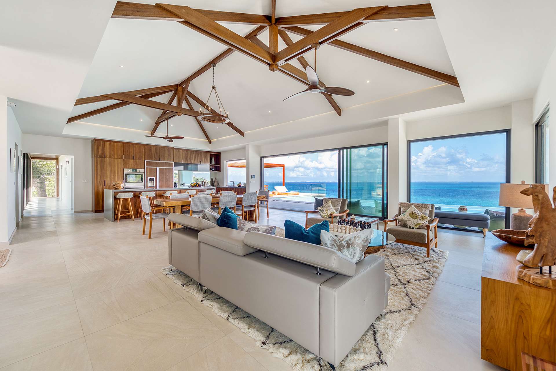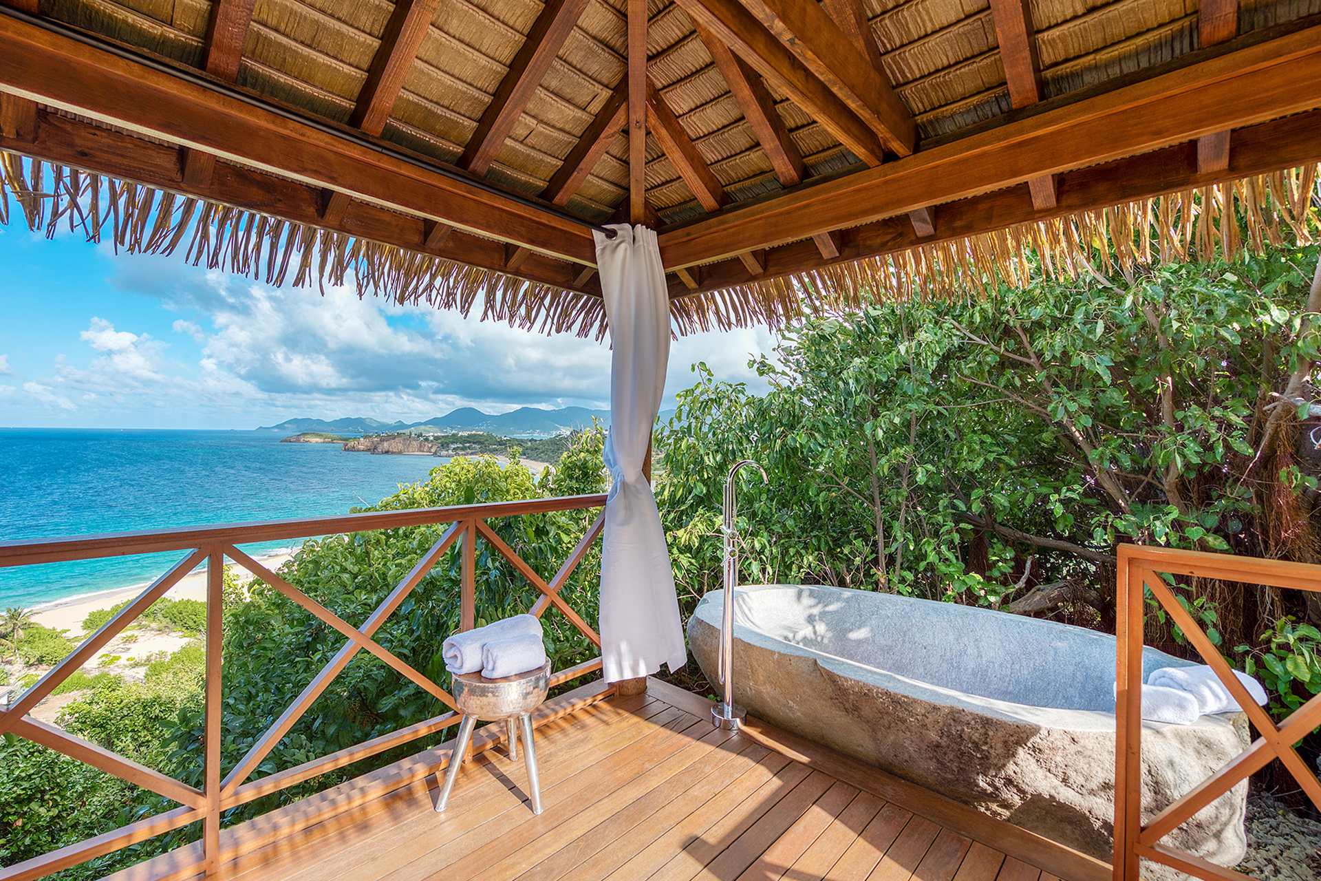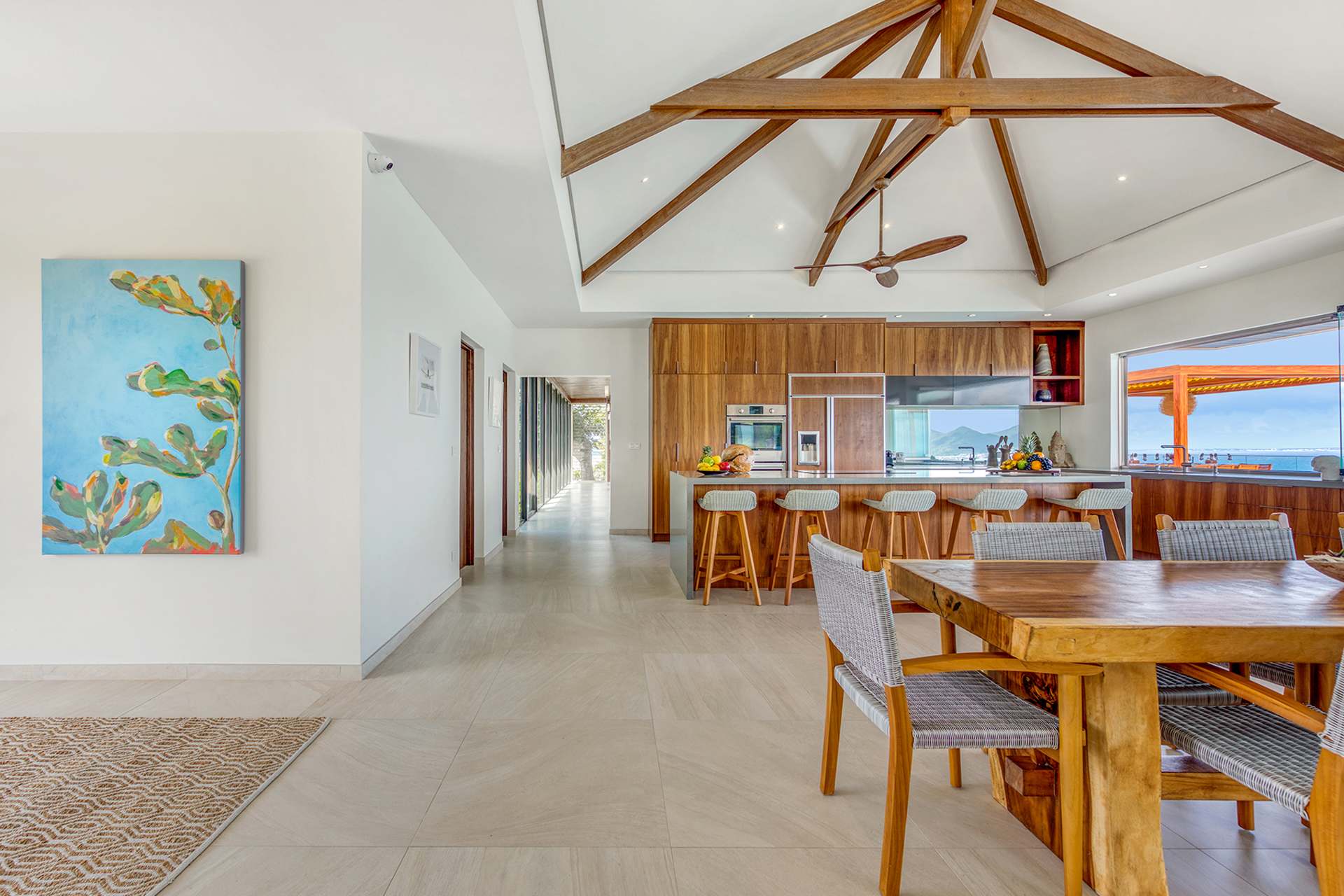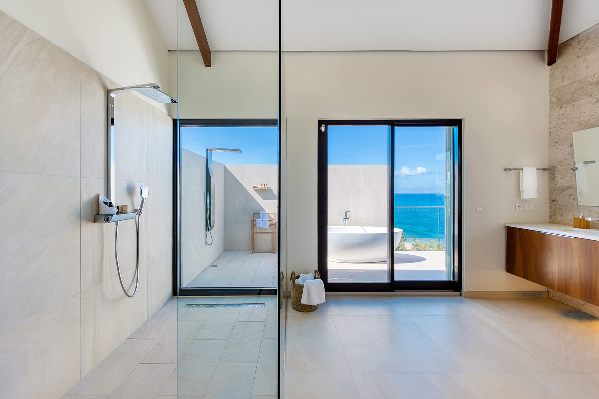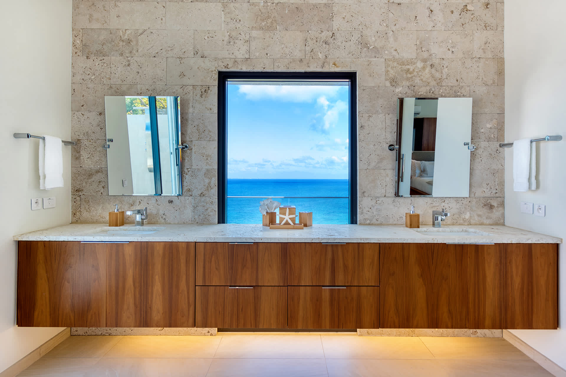 Villa Amandara is a modern-chic property with some of the best views on the island based in Terres Basses, St.Martin.Villa Amandara is one of the most stunning and desirable villas in St. Martin. This estate offers world-class views from all 5 bedrooms and its many communal spaces. You won’t need anything else once you see the villa's private Bali massage house with a carved stone Balinese tub, bar, and cinema with a window into the pool, as well as a regulation Petanque/Bocce ball court, a volleyball court with a basketball hoop, and a gym. This exceptional villa sits on 2.5 secluded acres. There is an incredible chef available for bookings, and six days a week of housekeeping and laundry are included with each booking. This estate was featured in a magazine article called, "10 Places to Stay Before You Die..” and Villa Amandara lives up to that reputation.Upon arrival, the gates open and reveal the tropical plants before greeting you to a spacious courtyard with a dazzling solid glass door entrance revealing breathtaking views. The exterior showcases an infinity pool that mimics the color of the ocean with its turquoise mosaic-lined details. The spacious terrace, with discrete and open spaces, extends the length of the villa. It is filled with private spots and gathering areas for lounging, sunning, and dining. The terrace is a perfect place to watch the ever-changing tropical sky; The true Caribbean dream. There is a little hanging bridge that leads you to the gazebo and is perfect for a massage. The Indonesian river pebbles define the spaces around them along with a beautiful teak pergola that establishes harmony in the terrace. For a quiet escape, a Thai pavilion awaits in the lower garden. The American-style interior opens to the modern and spacious living room with an airy feel lined with unique beamed ceilings. This room very quickly resembles a home all thanks to the wonderful wood details, exotic touches of teak and rattan furniture, and its neutral fabrics. The expansive great room seamlessly blends the lounging and dining areas with a beautiful modern kitchen in elegant woods, upscale appliances, and an unforgettable view.Four bedrooms, two masters, and two smaller rooms are all under one roof. Each room includes a brilliant view, internal access to the room, and serene white decor with gentle pops of color. The en-suite bathrooms exude a beautiful spa-style attitude. The two masters have fabulous outdoor showers and bathtubs open to the sky. The fifth bedroom is a huge apartment on the lower level with an interior and exterior entrance together with a kitchenette and a private terrace. The villa has a large game room on the lower level with a foosball and ping pong table for fun activities. In addition, there is a bar with a window view into the swimming pool.You are secluded, yet close to amenities with this prime spot. The fabulous restaurants and food purveyors in Porto Cupecoy are a few minutes' drive. You are 8 minutes to the French capital of Marigot, with its shops, restaurants, markets, and galleries, and 10 minutes to the airport. Grand Case and Philipsburg are 30 minutes away. The Location of the villa demonstrates a breathtaking view of the sapphire sea, the green mountains, and Baie Rouge Beach overlooking the edge of Grand Case. This makes the villa the perfect place to stay to gain an authentic experience of the friendly island.