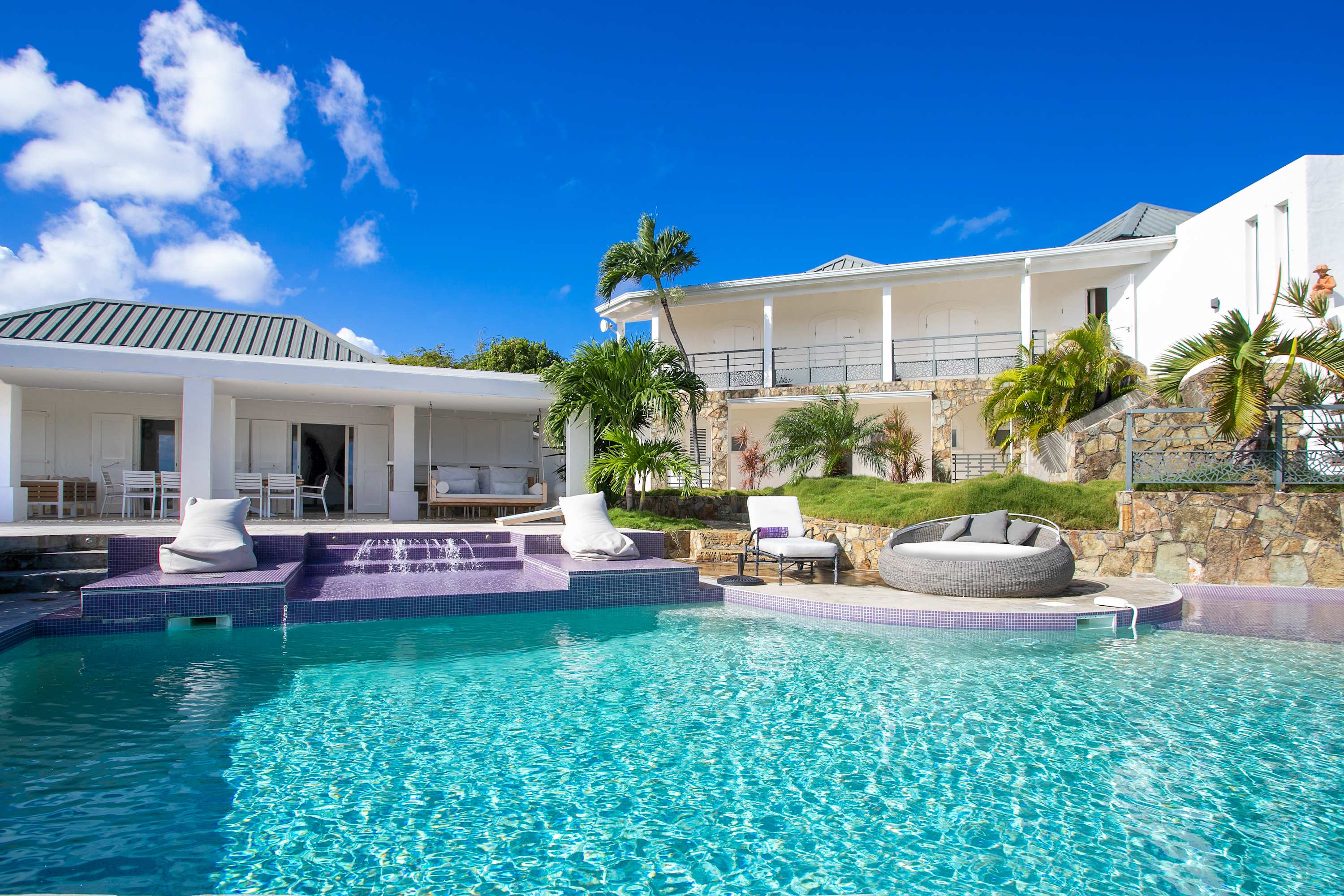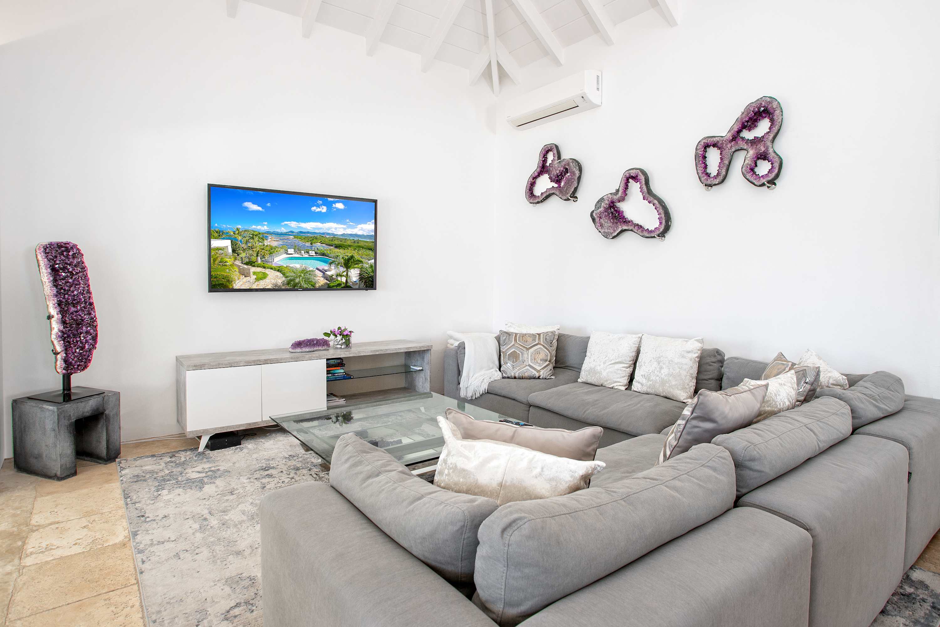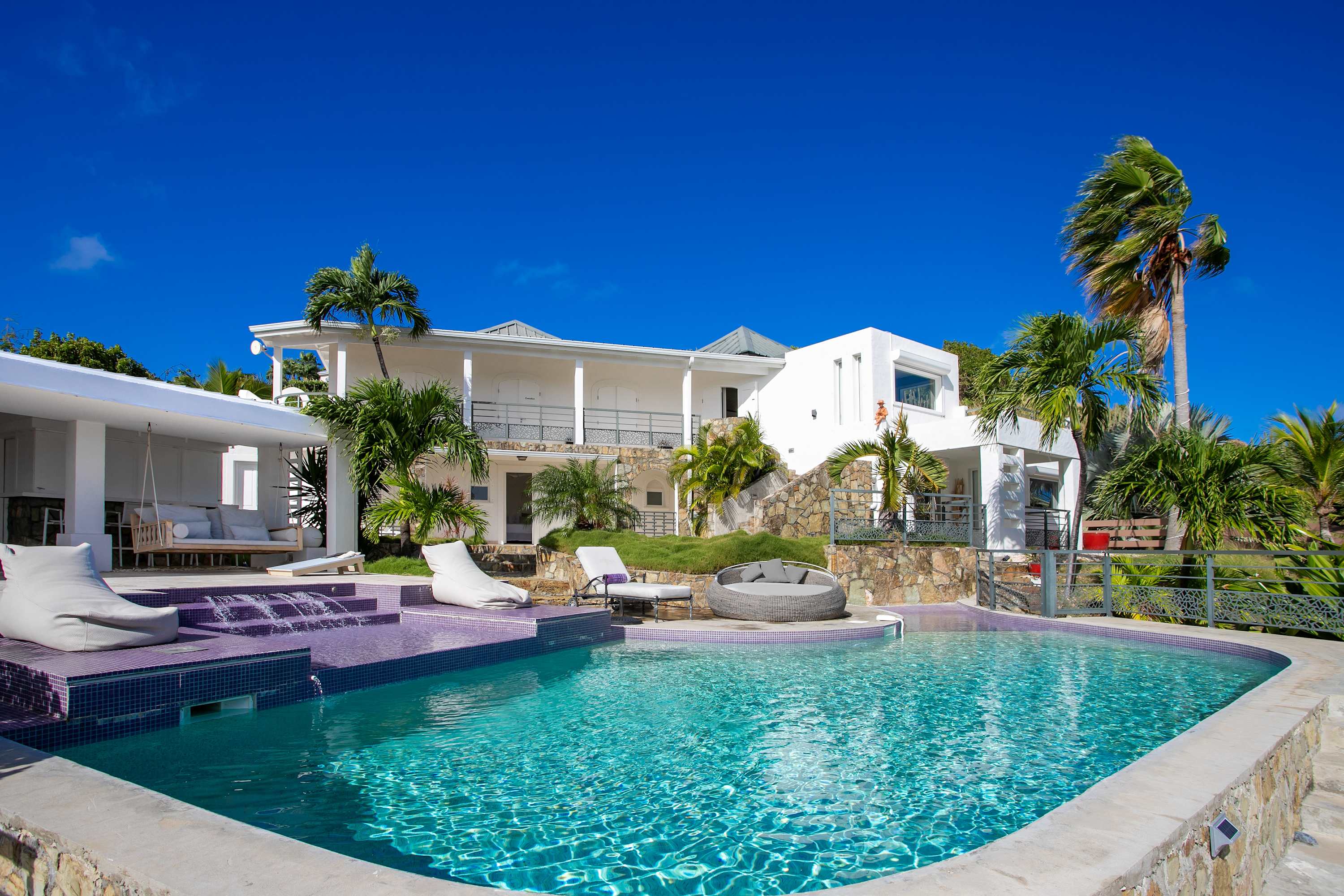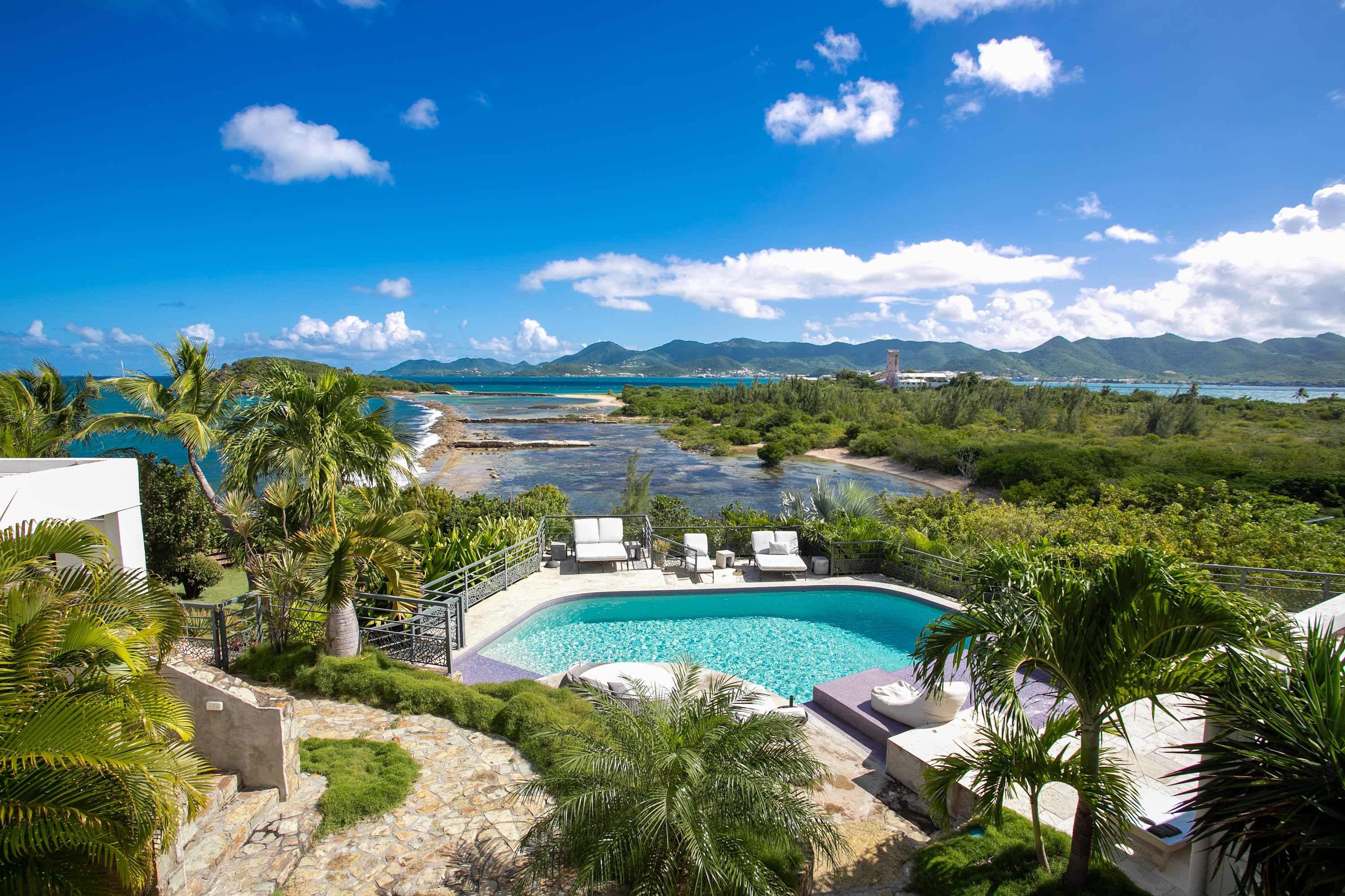 Villa Amethyst is an incredible cliffside property next to David's Hole in Terres Basses, St. Martin.From its privileged cliffside position overlooking the Pointe du Bluff in Terres Basses, on French St. Martin’s northern coastline, Villa Amethyst is nestled between the Baie aux Cayes and the spectacular natural rock archway known as the “Trou de David''. The view is spectacular and encompasses a 180-degree vista across the ocean with the natural beauty of the bay in the foreground and the picturesque St. Martin coastline and the neighboring island of Anguilla on the distant horizon. The evening view is just as pretty with the twinkling lights of Marigot Bay and Anguilla and the cruise ships passing by below. This beautiful five-bedroom home formerly known on the vacation rental market as Le Mas des Sables has now been completely rejuvenated into a luminous version of its former self. From the villa’s gated entrance a winding driveway leads up through tropical gardens to the main front door and stepping over the threshold a stunning view greets you as you enter from the arched entry courtyard into the villa’s inviting interior. This beautiful gem of a villa derives its name from a stunning pair of amethyst wings, situated in the living room/reception area. At just over 6ft tall this beautiful crystal radiates a soft lilac glow to the surrounding white walls and the decor has been kept intentionally understated so as not to detract from its natural beauty. Each bedroom is named for a healing crystal to further emphasize the natural bliss this villa imparts upon the villa’s fortunate occupants. The light-filled living room has on one side a comfortable TV viewing area and along the front, doorways framed by wooden shutters open out to the terrace and the unobstructed and breathtaking ocean view. The brand new galley kitchen, situated to the left of the living room features sleek white cabinetry and Neff appliances. There is a windowed breakfast nook at one end and at the opposite end, opening onto the terrace, a convivial bar area fitted with a wine cooler and ice machine. Outside, the covered terrace has a lounge area and a large dining table with seating for ten, and a large gas grill. The terrace follows the incline of the hillside and steps down to a beautiful free-form pool below, surrounded by plush loungers and daybeds and a lower-level sunning terrace. The terrace also extends around to the side of the house to enjoy the beautiful east-facing view overlooking the scenic Simpson Bay lagoon. For a more active option, a Cornhole game set is also available on the terrace. The villa’s five bedrooms are situated in a building independent from the communal living spaces and built on three levels into the hillside. Each bedroom possesses a unique design. On the ground floor are the bedrooms “Selenite” and “Citrine” and stone steps lead up to an ocean view balcony and the bedrooms “Howlite” and “Carnelian”. A 5th bedroom “Rose Quartz” is located in the main building below the living area with its own private deck area that can be accessed from the pool terrace and the entrance driveway. All five bedrooms offer king-size beds, beautiful en suite bathrooms and closets with his & her bathrobes, and a beach bag that comes in very handy for a walk down to the nearby beach. The “Howlite” bedroom also features a seating area with a large sea view window and its own private balcony and large daybed overlooking the ocean and the pool terrace below. “Citrine” on the ground floor also has its own private terrace with an ocean view. The beautiful natural surroundings and the tranquility of the site along with the many material comforts make Villa Amethyst an incredibly relaxing and inviting place to be, perfect for families or friends vacationing together. One of the island’s finest beaches, Baie Rouge is an easy 8-minute walk away or just a couple of minutes by car, and the villa is conveniently located, just a 10-minute drive, between Marigot and Cupecoy.
