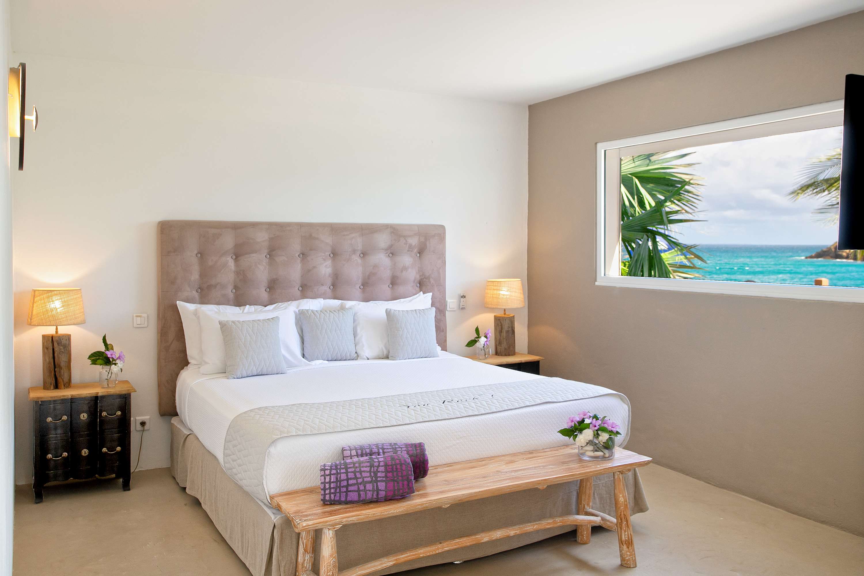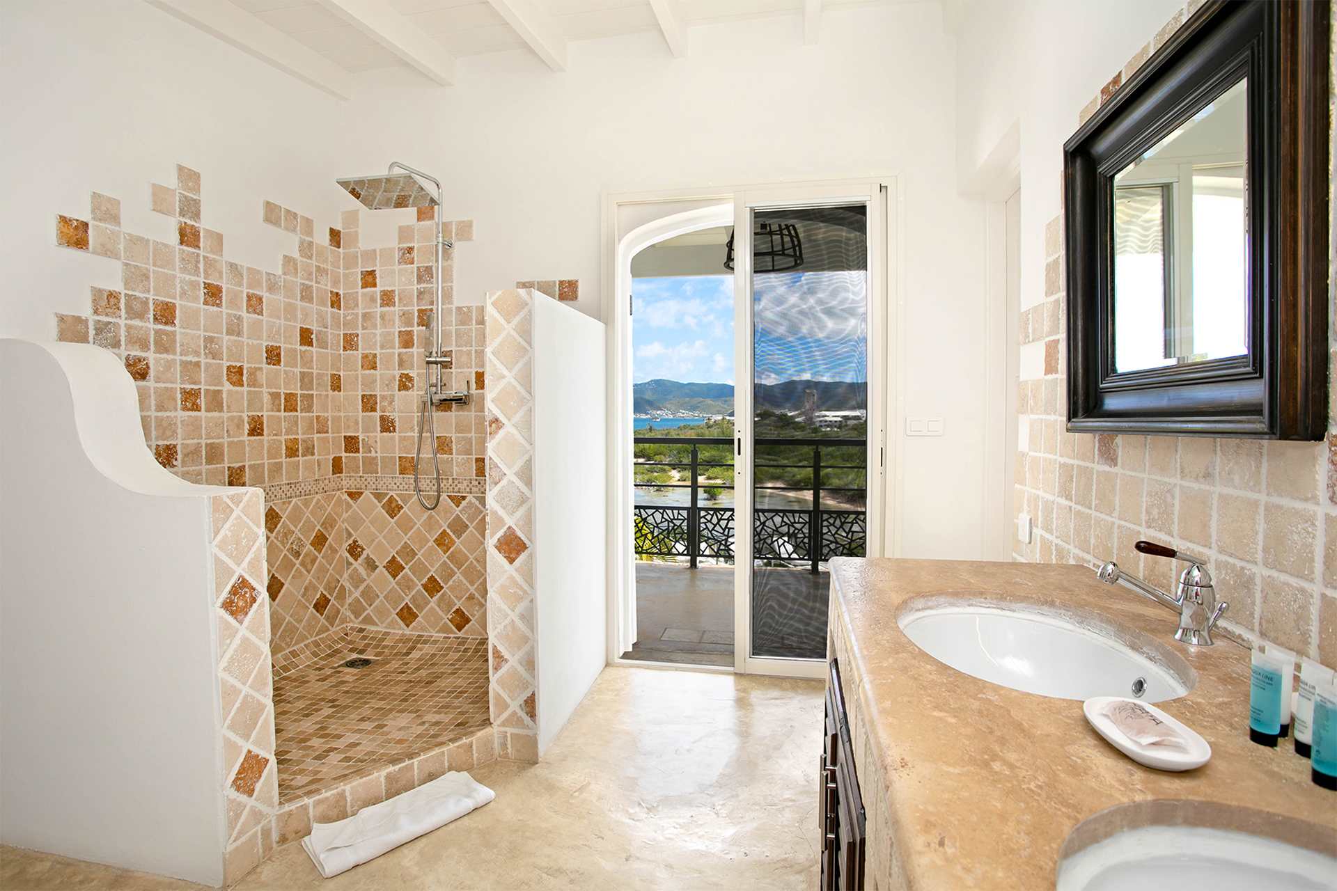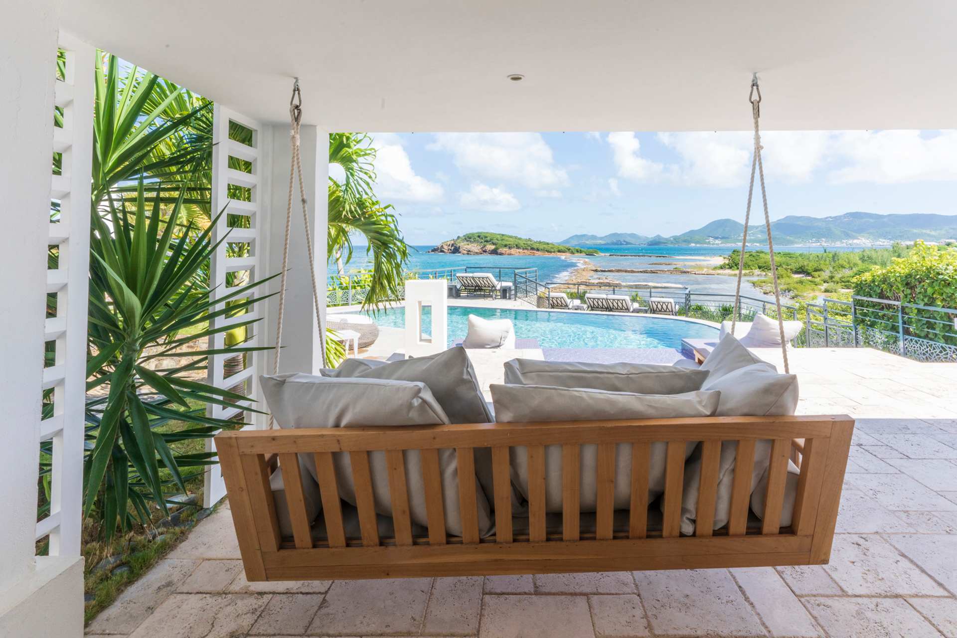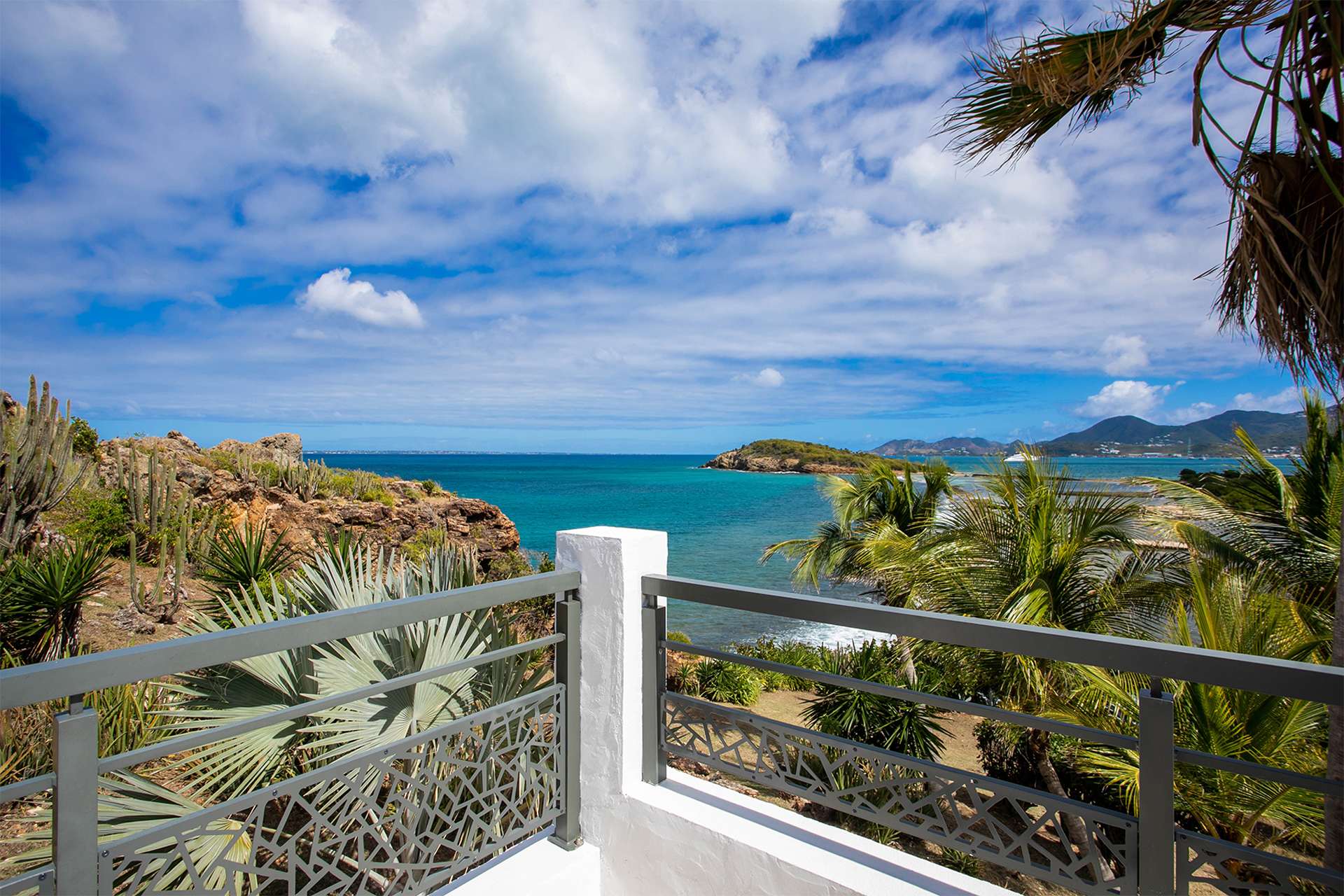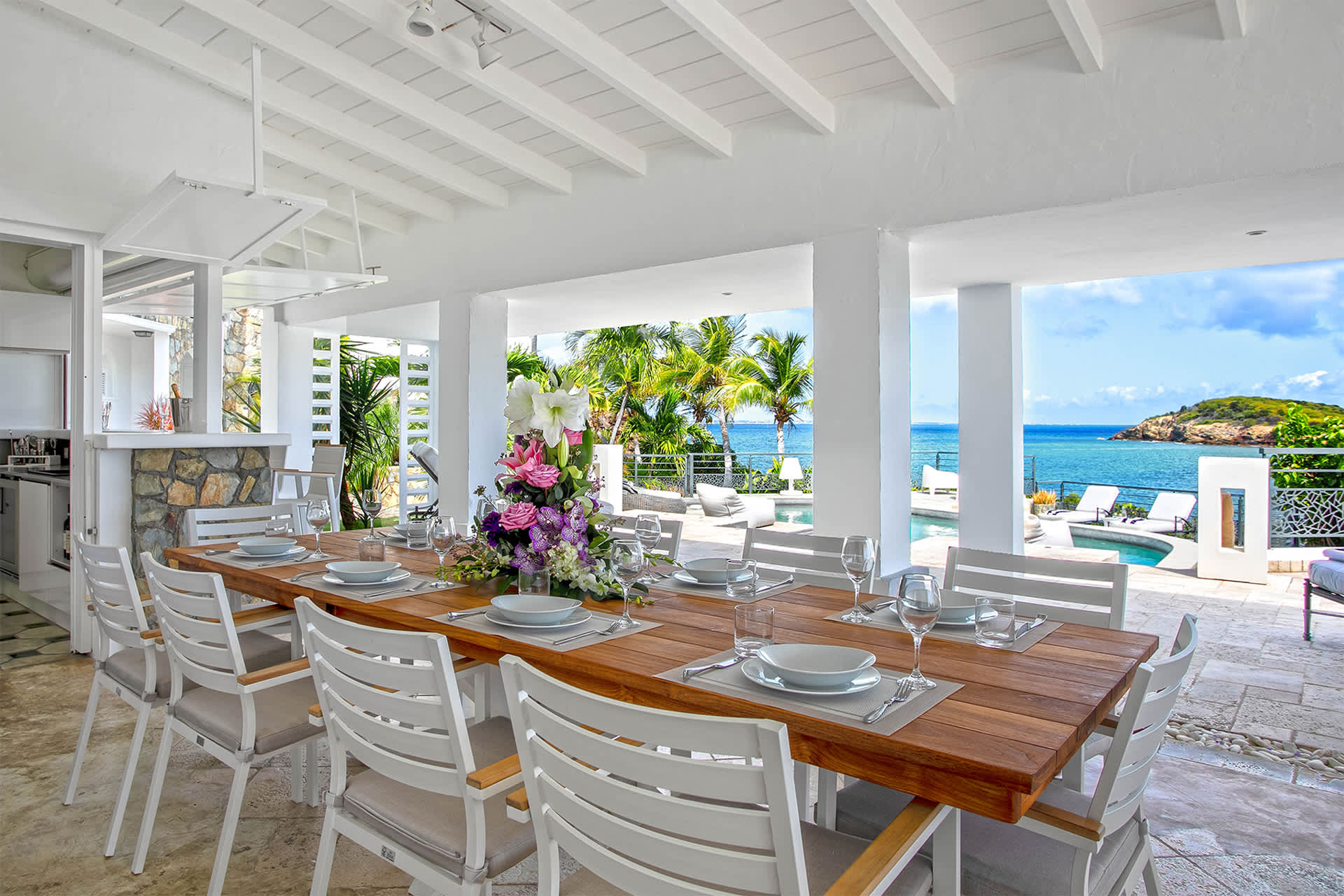 Villa Amethyst is an incredible cliffside property next to David's Hole in Terres Basses, St. Martin.From its privileged cliffside position overlooking the Pointe du Bluff in Terres Basses, on French St. Martin’s northern coastline, Villa Amethyst is nestled between the Baie aux Cayes and the spectacular natural rock archway known as the “Trou de David''. The view is spectacular and encompasses a 180-degree vista across the ocean with the natural beauty of the bay in the foreground and the picturesque St. Martin coastline and the neighboring island of Anguilla on the distant horizon. The evening view is just as pretty with the twinkling lights of Marigot Bay and Anguilla and the cruise ships passing by below. This beautiful five-bedroom home formerly known on the vacation rental market as Le Mas des Sables has now been completely rejuvenated into a luminous version of its former self. From the villa’s gated entrance a winding driveway leads up through tropical gardens to the main front door and stepping over the threshold a stunning view greets you as you enter from the arched entry courtyard into the villa’s inviting interior. This beautiful gem of a villa derives its name from a stunning pair of amethyst wings, situated in the living room/reception area. At just over 6ft tall this beautiful crystal radiates a soft lilac glow to the surrounding white walls and the decor has been kept intentionally understated so as not to detract from its natural beauty. Each bedroom is named for a healing crystal to further emphasize the natural bliss this villa imparts upon the villa’s fortunate occupants. The light-filled living room has on one side a comfortable TV viewing area and along the front, doorways framed by wooden shutters open out to the terrace and the unobstructed and breathtaking ocean view. The brand new galley kitchen, situated to the left of the living room features sleek white cabinetry and Neff appliances. There is a windowed breakfast nook at one end and at the opposite end, opening onto the terrace, a convivial bar area fitted with a wine cooler and ice machine. Outside, the covered terrace has a lounge area and a large dining table with seating for ten, and a large gas grill. The terrace follows the incline of the hillside and steps down to a beautiful free-form pool below, surrounded by plush loungers and daybeds and a lower-level sunning terrace. The terrace also extends around to the side of the house to enjoy the beautiful east-facing view overlooking the scenic Simpson Bay lagoon. For a more active option, a Cornhole game set is also available on the terrace. The villa’s five bedrooms are situated in a building independent from the communal living spaces and built on three levels into the hillside. Each bedroom possesses a unique design. On the ground floor are the bedrooms “Selenite” and “Citrine” and stone steps lead up to an ocean view balcony and the bedrooms “Howlite” and “Carnelian”. A 5th bedroom “Rose Quartz” is located in the main building below the living area with its own private deck area that can be accessed from the pool terrace and the entrance driveway. All five bedrooms offer king-size beds, beautiful en suite bathrooms and closets with his & her bathrobes, and a beach bag that comes in very handy for a walk down to the nearby beach. The “Howlite” bedroom also features a seating area with a large sea view window and its own private balcony and large daybed overlooking the ocean and the pool terrace below. “Citrine” on the ground floor also has its own private terrace with an ocean view. The beautiful natural surroundings and the tranquility of the site along with the many material comforts make Villa Amethyst an incredibly relaxing and inviting place to be, perfect for families or friends vacationing together. One of the island’s finest beaches, Baie Rouge is an easy 8-minute walk away or just a couple of minutes by car, and the villa is conveniently located, just a 10-minute drive, between Marigot and Cupecoy.