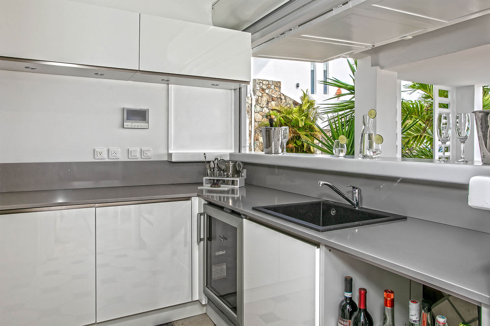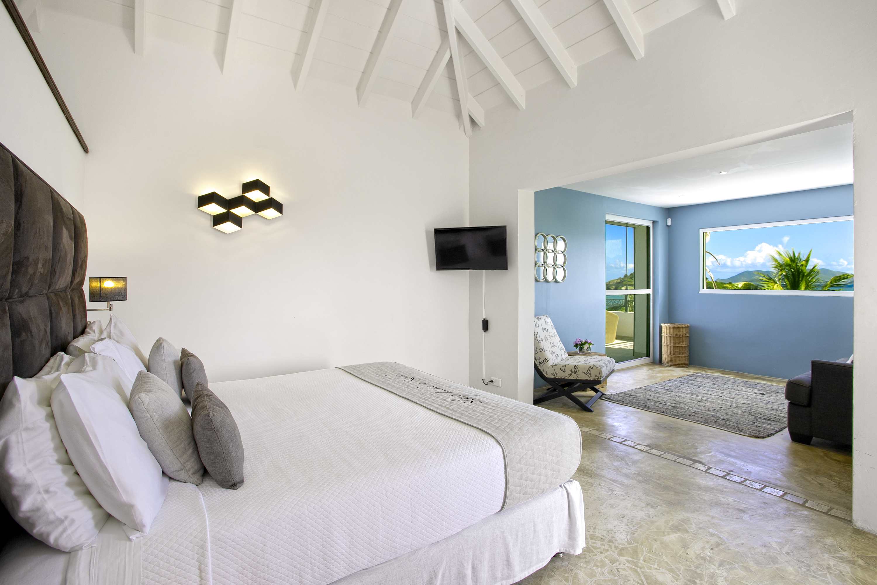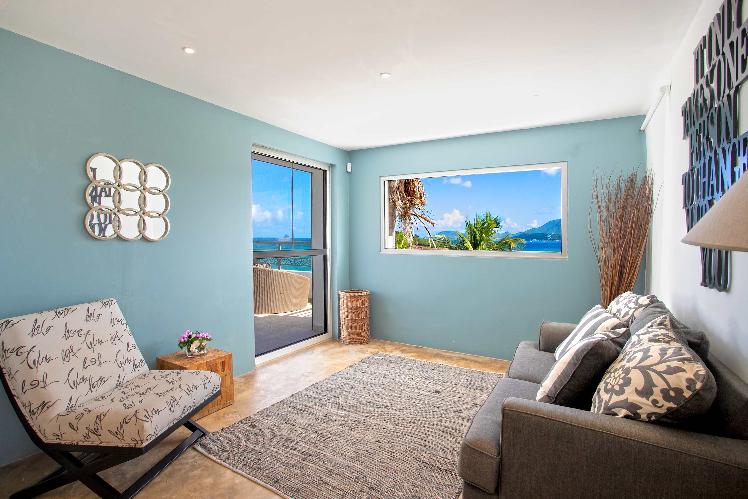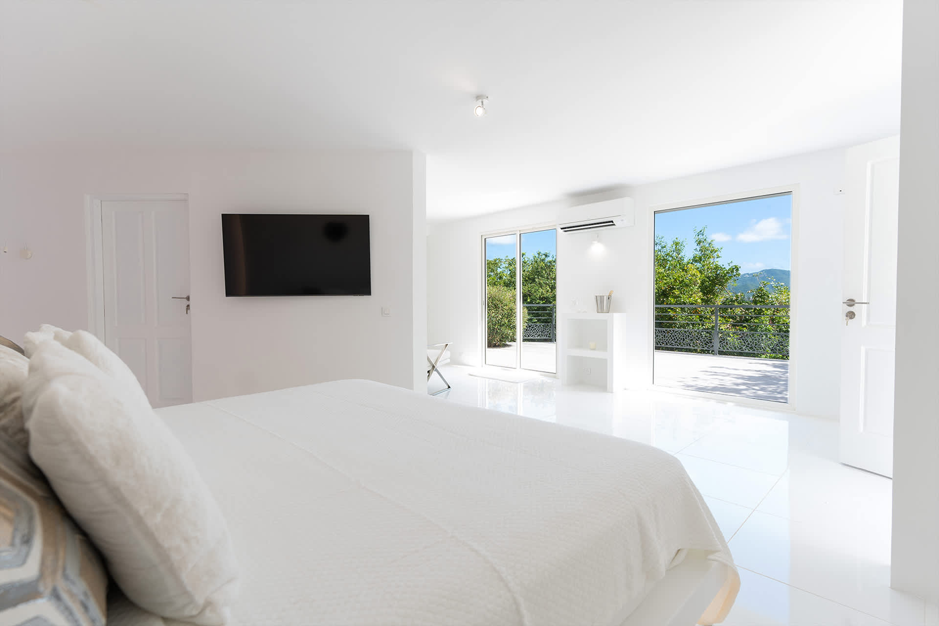 Villa Amethyst is an incredible cliffside property next to David's Hole in Terres Basses, St. Martin.From its privileged cliffside position overlooking the Pointe du Bluff in Terres Basses, on French St. Martin’s northern coastline, Villa Amethyst is nestled between the Baie aux Cayes and the spectacular natural rock archway known as the “Trou de David''. The view is spectacular and encompasses a 180-degree vista across the ocean with the natural beauty of the bay in the foreground and the picturesque St. Martin coastline and the neighboring island of Anguilla on the distant horizon. The evening view is just as pretty with the twinkling lights of Marigot Bay and Anguilla and the cruise ships passing by below. This beautiful five-bedroom home formerly known on the vacation rental market as Le Mas des Sables has now been completely rejuvenated into a luminous version of its former self. From the villa’s gated entrance a winding driveway leads up through tropical gardens to the main front door and stepping over the threshold a stunning view greets you as you enter from the arched entry courtyard into the villa’s inviting interior. This beautiful gem of a villa derives its name from a stunning pair of amethyst wings, situated in the living room/reception area. At just over 6ft tall this beautiful crystal radiates a soft lilac glow to the surrounding white walls and the decor has been kept intentionally understated so as not to detract from its natural beauty. Each bedroom is named for a healing crystal to further emphasize the natural bliss this villa imparts upon the villa’s fortunate occupants. The light-filled living room has on one side a comfortable TV viewing area and along the front, doorways framed by wooden shutters open out to the terrace and the unobstructed and breathtaking ocean view. The brand new galley kitchen, situated to the left of the living room features sleek white cabinetry and Neff appliances. There is a windowed breakfast nook at one end and at the opposite end, opening onto the terrace, a convivial bar area fitted with a wine cooler and ice machine. Outside, the covered terrace has a lounge area and a large dining table with seating for ten, and a large gas grill. The terrace follows the incline of the hillside and steps down to a beautiful free-form pool below, surrounded by plush loungers and daybeds and a lower-level sunning terrace. The terrace also extends around to the side of the house to enjoy the beautiful east-facing view overlooking the scenic Simpson Bay lagoon. For a more active option, a Cornhole game set is also available on the terrace. The villa’s five bedrooms are situated in a building independent from the communal living spaces and built on three levels into the hillside. Each bedroom possesses a unique design. On the ground floor are the bedrooms “Selenite” and “Citrine” and stone steps lead up to an ocean view balcony and the bedrooms “Howlite” and “Carnelian”. A 5th bedroom “Rose Quartz” is located in the main building below the living area with its own private deck area that can be accessed from the pool terrace and the entrance driveway. All five bedrooms offer king-size beds, beautiful en suite bathrooms and closets with his & her bathrobes, and a beach bag that comes in very handy for a walk down to the nearby beach. The “Howlite” bedroom also features a seating area with a large sea view window and its own private balcony and large daybed overlooking the ocean and the pool terrace below. “Citrine” on the ground floor also has its own private terrace with an ocean view. The beautiful natural surroundings and the tranquility of the site along with the many material comforts make Villa Amethyst an incredibly relaxing and inviting place to be, perfect for families or friends vacationing together. One of the island’s finest beaches, Baie Rouge is an easy 8-minute walk away or just a couple of minutes by car, and the villa is conveniently located, just a 10-minute drive, between Marigot and Cupecoy.