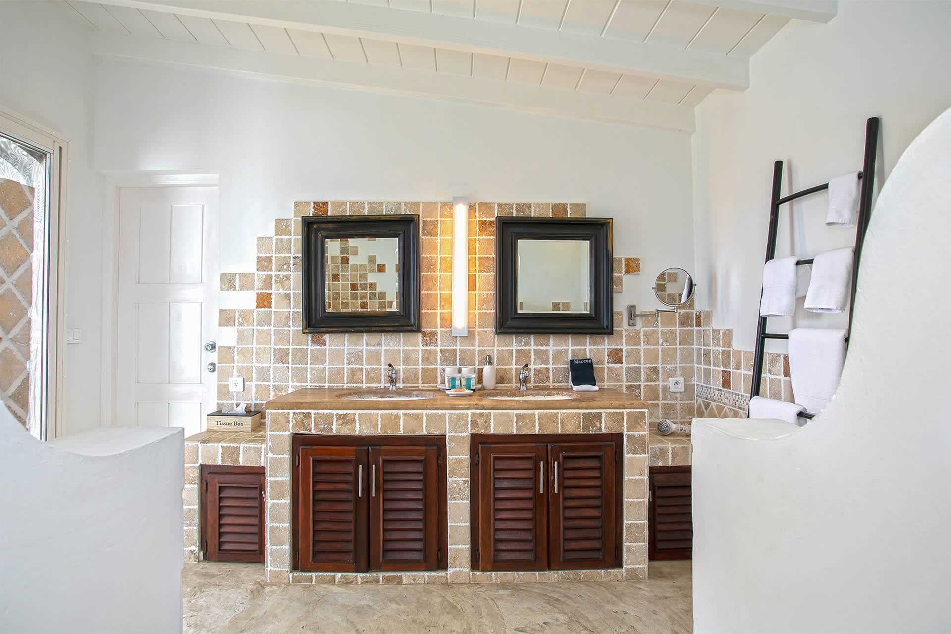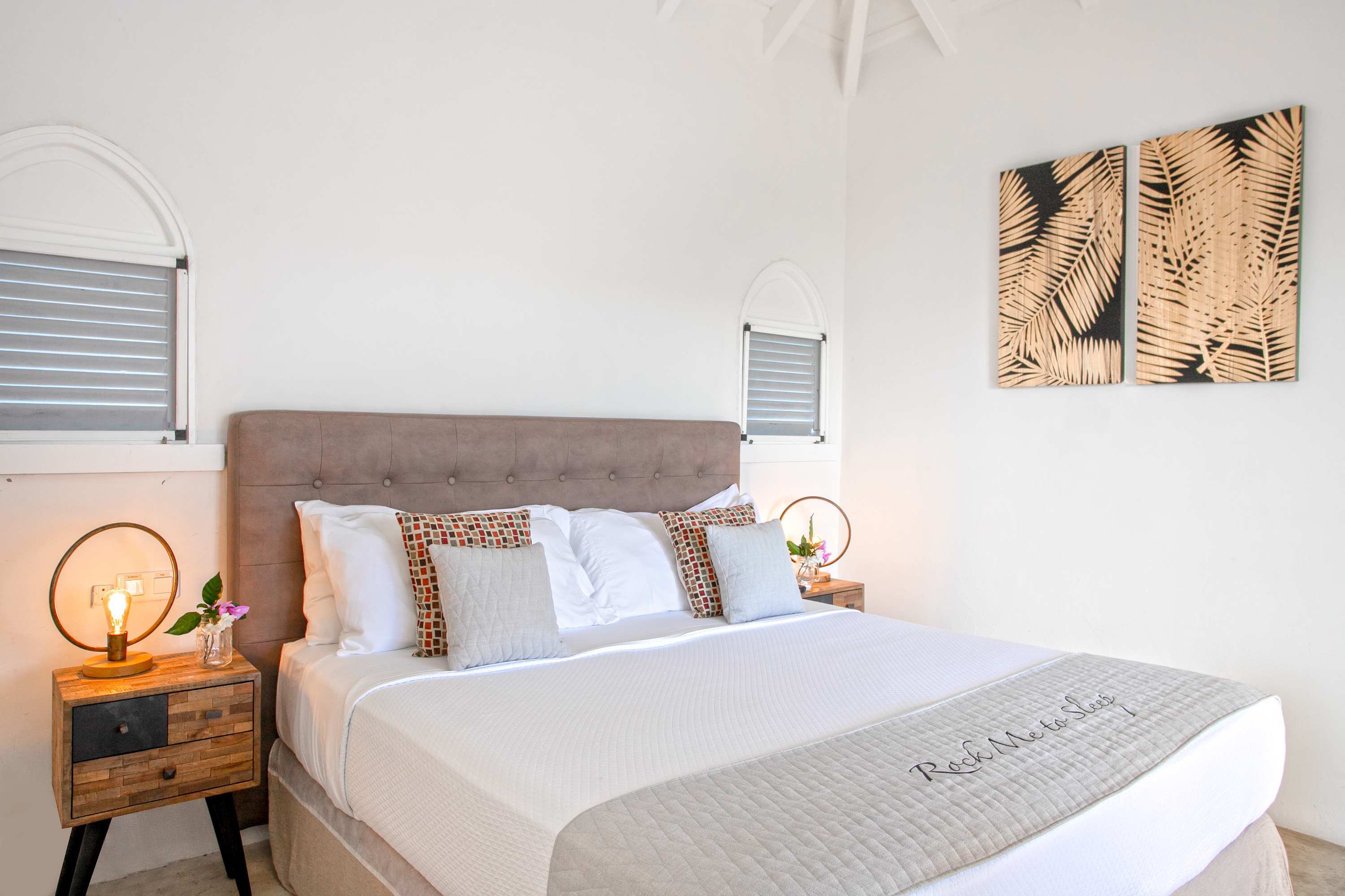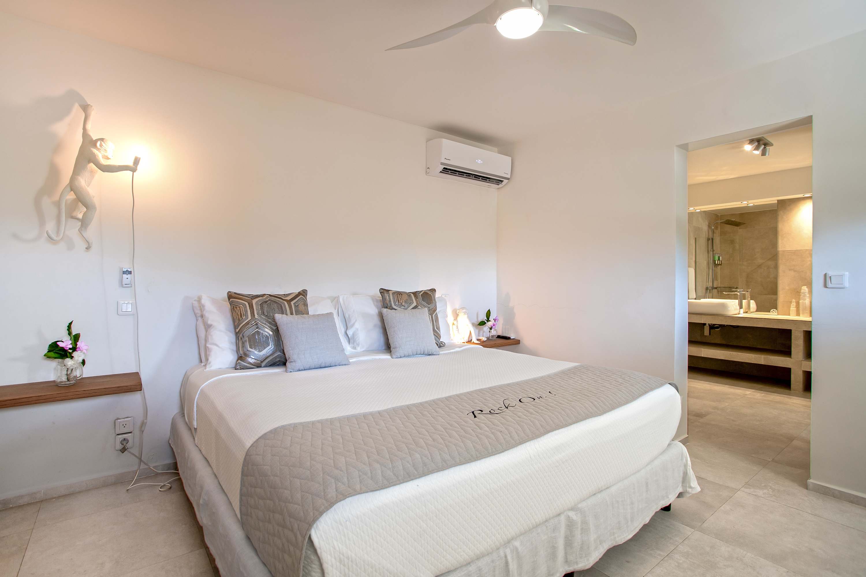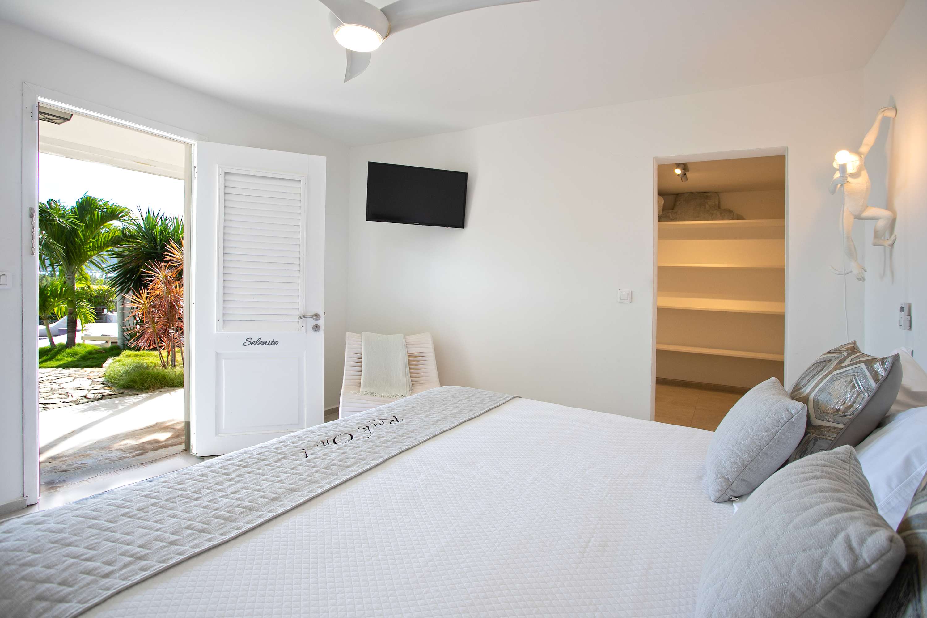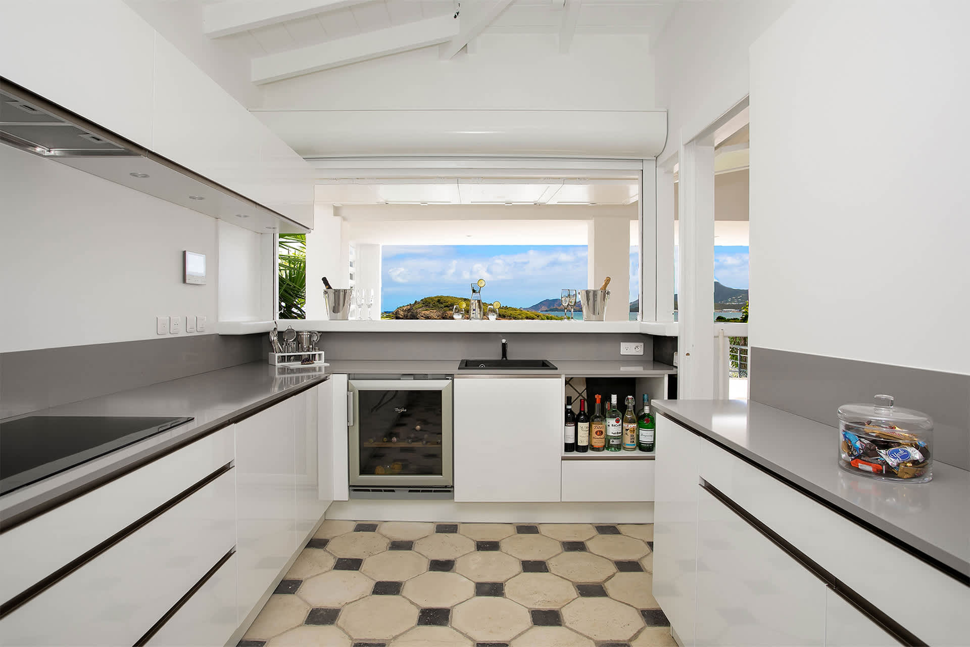 Villa Amethyst is an incredible cliffside property next to David's Hole in Terres Basses, St. Martin.From its privileged cliffside position overlooking the Pointe du Bluff in Terres Basses, on French St. Martin’s northern coastline, Villa Amethyst is nestled between the Baie aux Cayes and the spectacular natural rock archway known as the “Trou de David''. The view is spectacular and encompasses a 180-degree vista across the ocean with the natural beauty of the bay in the foreground and the picturesque St. Martin coastline and the neighboring island of Anguilla on the distant horizon. The evening view is just as pretty with the twinkling lights of Marigot Bay and Anguilla and the cruise ships passing by below. This beautiful five-bedroom home formerly known on the vacation rental market as Le Mas des Sables has now been completely rejuvenated into a luminous version of its former self. From the villa’s gated entrance a winding driveway leads up through tropical gardens to the main front door and stepping over the threshold a stunning view greets you as you enter from the arched entry courtyard into the villa’s inviting interior. This beautiful gem of a villa derives its name from a stunning pair of amethyst wings, situated in the living room/reception area. At just over 6ft tall this beautiful crystal radiates a soft lilac glow to the surrounding white walls and the decor has been kept intentionally understated so as not to detract from its natural beauty. Each bedroom is named for a healing crystal to further emphasize the natural bliss this villa imparts upon the villa’s fortunate occupants. The light-filled living room has on one side a comfortable TV viewing area and along the front, doorways framed by wooden shutters open out to the terrace and the unobstructed and breathtaking ocean view. The brand new galley kitchen, situated to the left of the living room features sleek white cabinetry and Neff appliances. There is a windowed breakfast nook at one end and at the opposite end, opening onto the terrace, a convivial bar area fitted with a wine cooler and ice machine. Outside, the covered terrace has a lounge area and a large dining table with seating for ten, and a large gas grill. The terrace follows the incline of the hillside and steps down to a beautiful free-form pool below, surrounded by plush loungers and daybeds and a lower-level sunning terrace. The terrace also extends around to the side of the house to enjoy the beautiful east-facing view overlooking the scenic Simpson Bay lagoon. For a more active option, a Cornhole game set is also available on the terrace. The villa’s five bedrooms are situated in a building independent from the communal living spaces and built on three levels into the hillside. Each bedroom possesses a unique design. On the ground floor are the bedrooms “Selenite” and “Citrine” and stone steps lead up to an ocean view balcony and the bedrooms “Howlite” and “Carnelian”. A 5th bedroom “Rose Quartz” is located in the main building below the living area with its own private deck area that can be accessed from the pool terrace and the entrance driveway. All five bedrooms offer king-size beds, beautiful en suite bathrooms and closets with his & her bathrobes, and a beach bag that comes in very handy for a walk down to the nearby beach. The “Howlite” bedroom also features a seating area with a large sea view window and its own private balcony and large daybed overlooking the ocean and the pool terrace below. “Citrine” on the ground floor also has its own private terrace with an ocean view. The beautiful natural surroundings and the tranquility of the site along with the many material comforts make Villa Amethyst an incredibly relaxing and inviting place to be, perfect for families or friends vacationing together. One of the island’s finest beaches, Baie Rouge is an easy 8-minute walk away or just a couple of minutes by car, and the villa is conveniently located, just a 10-minute drive, between Marigot and Cupecoy.
