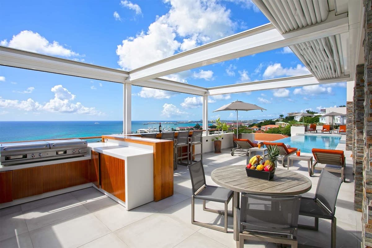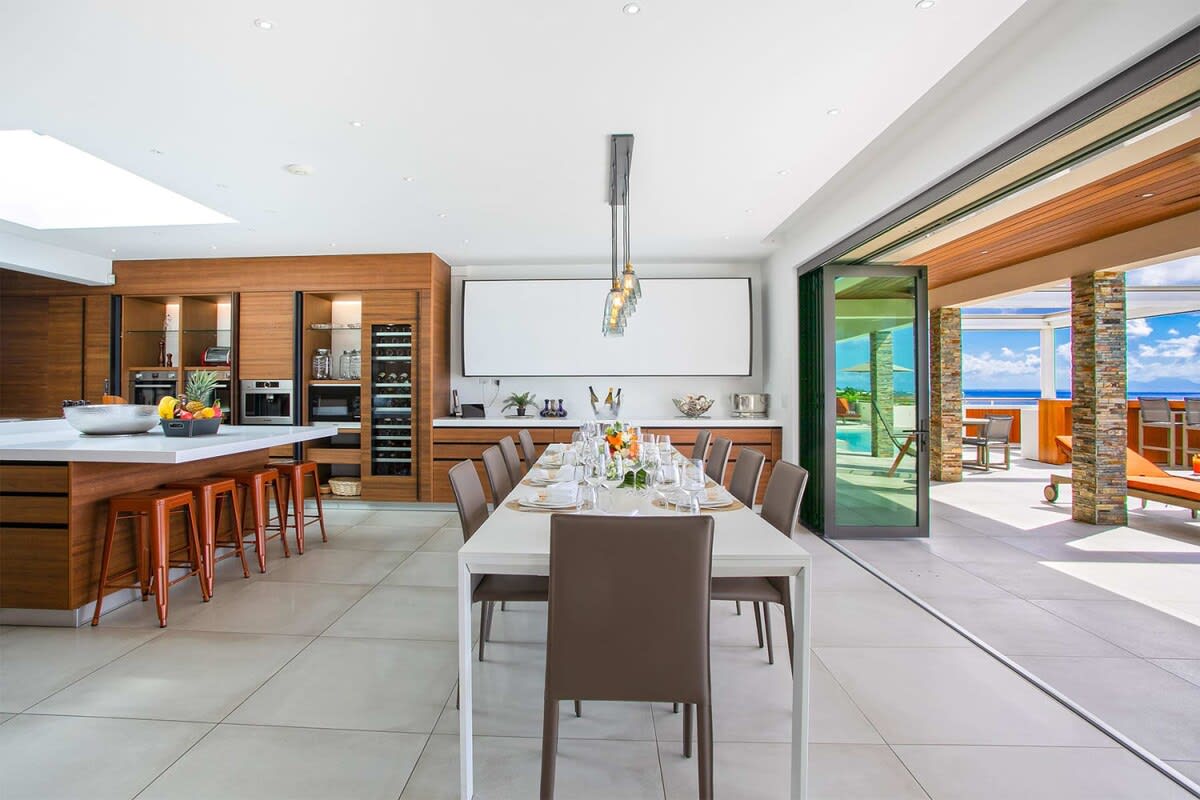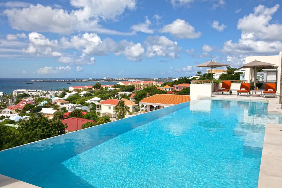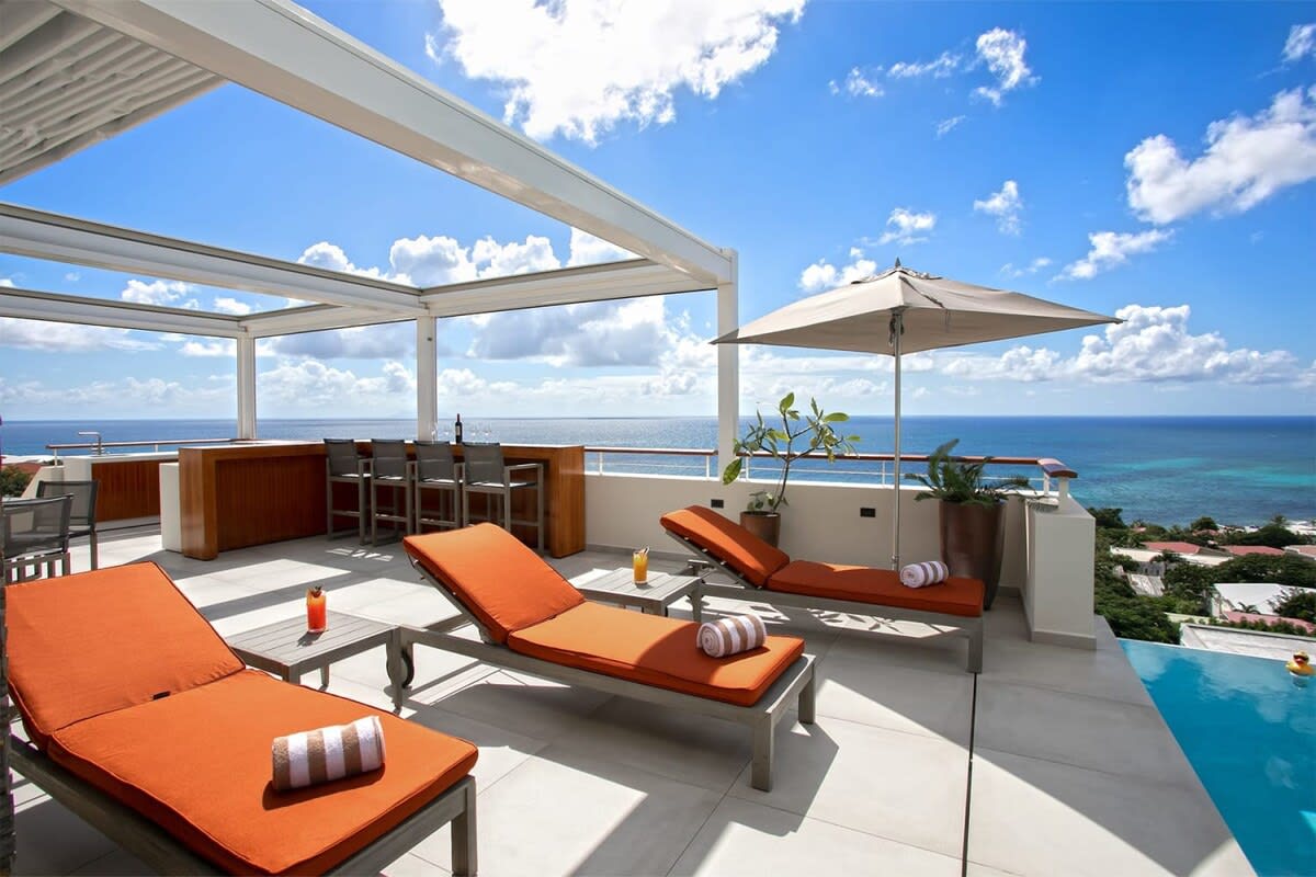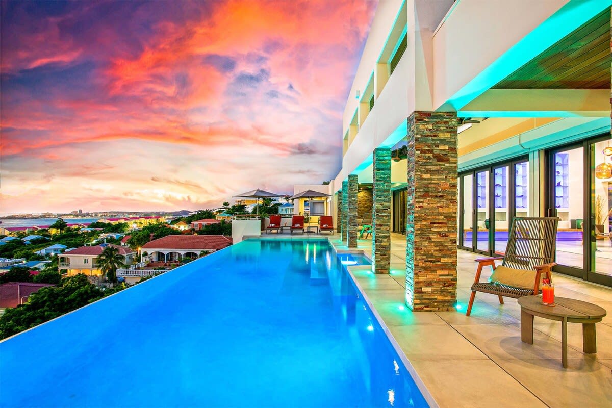 Villa Bella Vita features exquisite amenities and epic Caribbean sunset views over Pelican Key, St. Maarten.Life is good at Villa Bella Vita, a sumptuous 7-bedroom contemporary home located in the residential enclave of Pelican Key on the Dutch side of Sint Maarten. Just recently renovated, this spectacular home offers five-star amenities and unparalleled views over the Caribbean from its privileged cliffside position. From the beautiful infinity pool and spacious sun terrace, the unforgettable panorama unfolds of the Caribbean with the islands of Saba, St. Eustatius, and St. Kitts in the distance and picturesque Pelican Key just below. This beautifully appointed Villa Bella Vita with over 10,000 sq. ft of living space, includes 7 bedrooms, 8 ½ bathrooms, a large living room, a dining room, and a state-of-the-art gourmet kitchen, the villa also features a media room, a fitness room, and a roof-top terrace with summer kitchen. The seven-bedroom suites each have en-suite luxury bathrooms, six have king-size beds and the seventh has 2 full-size beds. Villa Bella Vita is eco-conscious, powered entirely by solar energy during the day and Tesla Powerwall technology in the evenings. All appliances have been chosen with this energy-saving philosophy in mind. The villa is powered by an AI home system that makes Villa Bella Vita unique in St. Maarten. The villa is conveniently located close to restaurants and nightlife in Simpson Bay and provides a dedicated onsite concierge to take advantage of the many activities that the island has to offer.