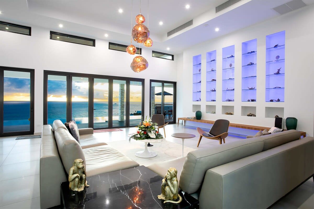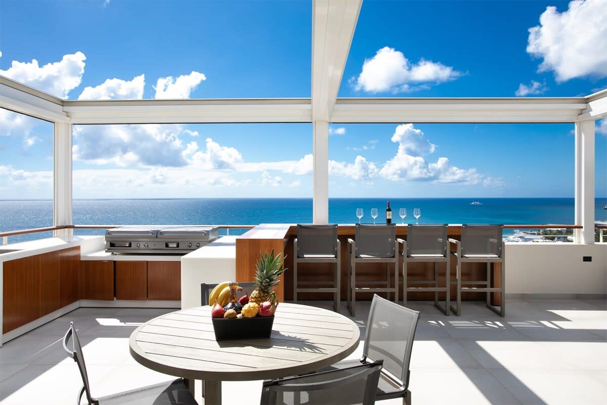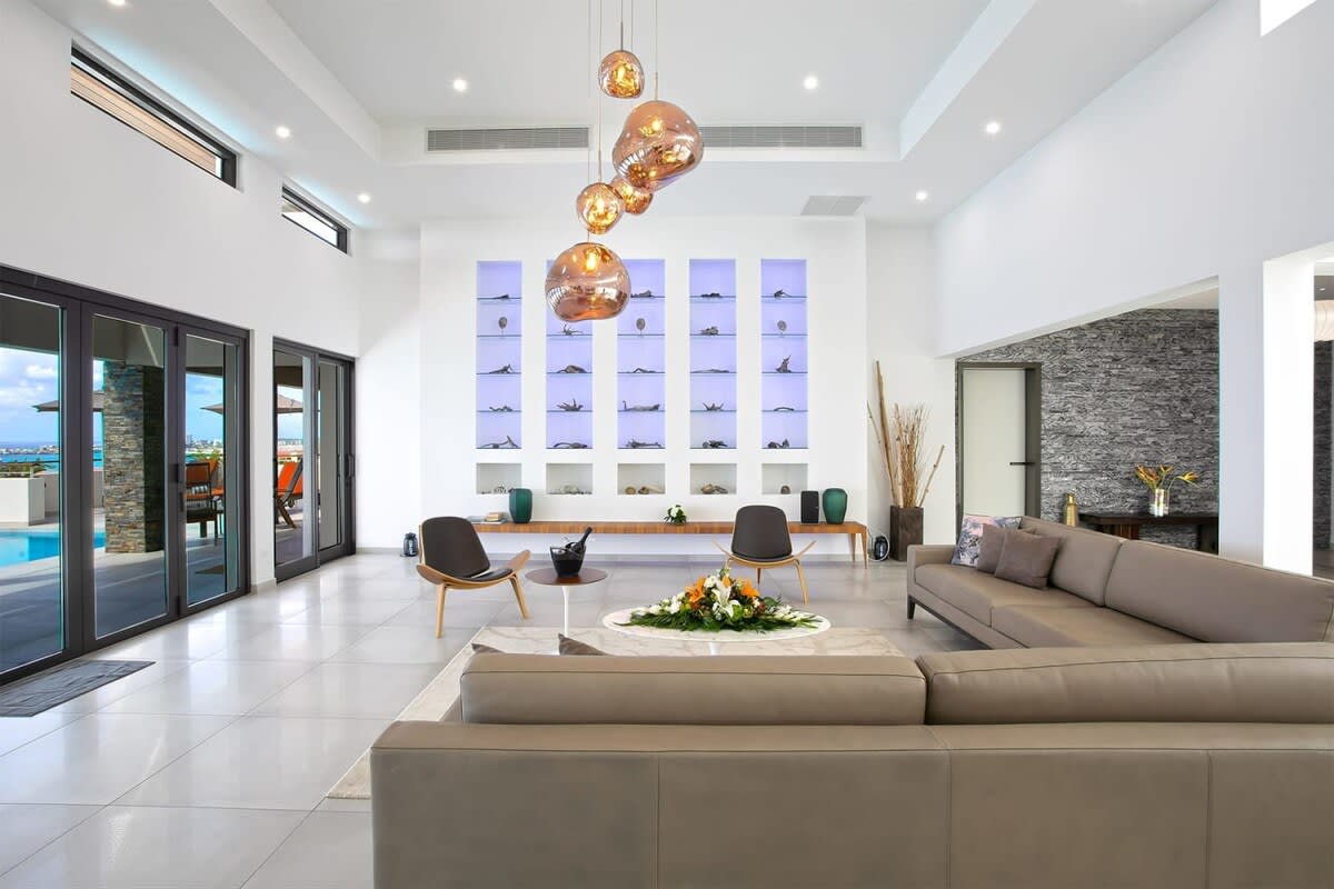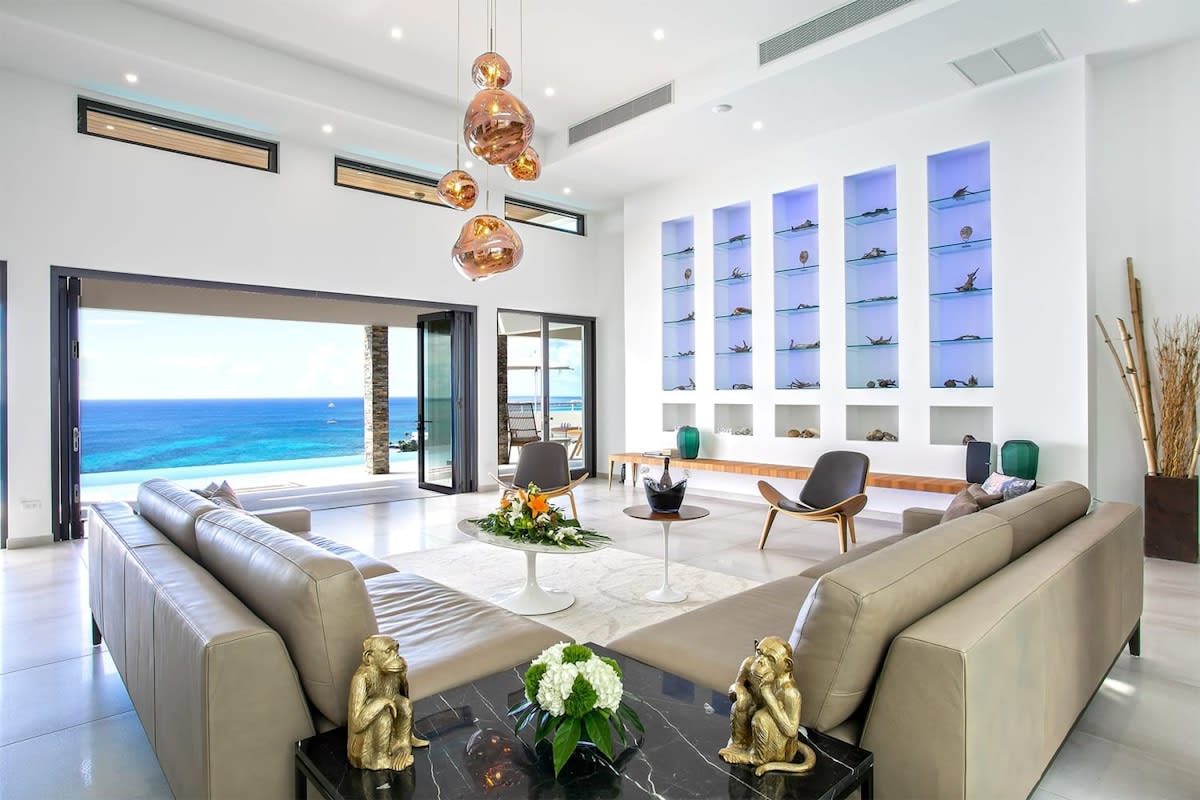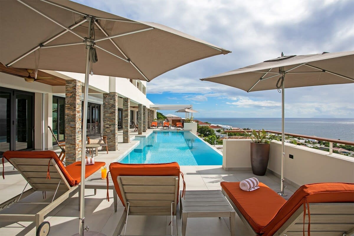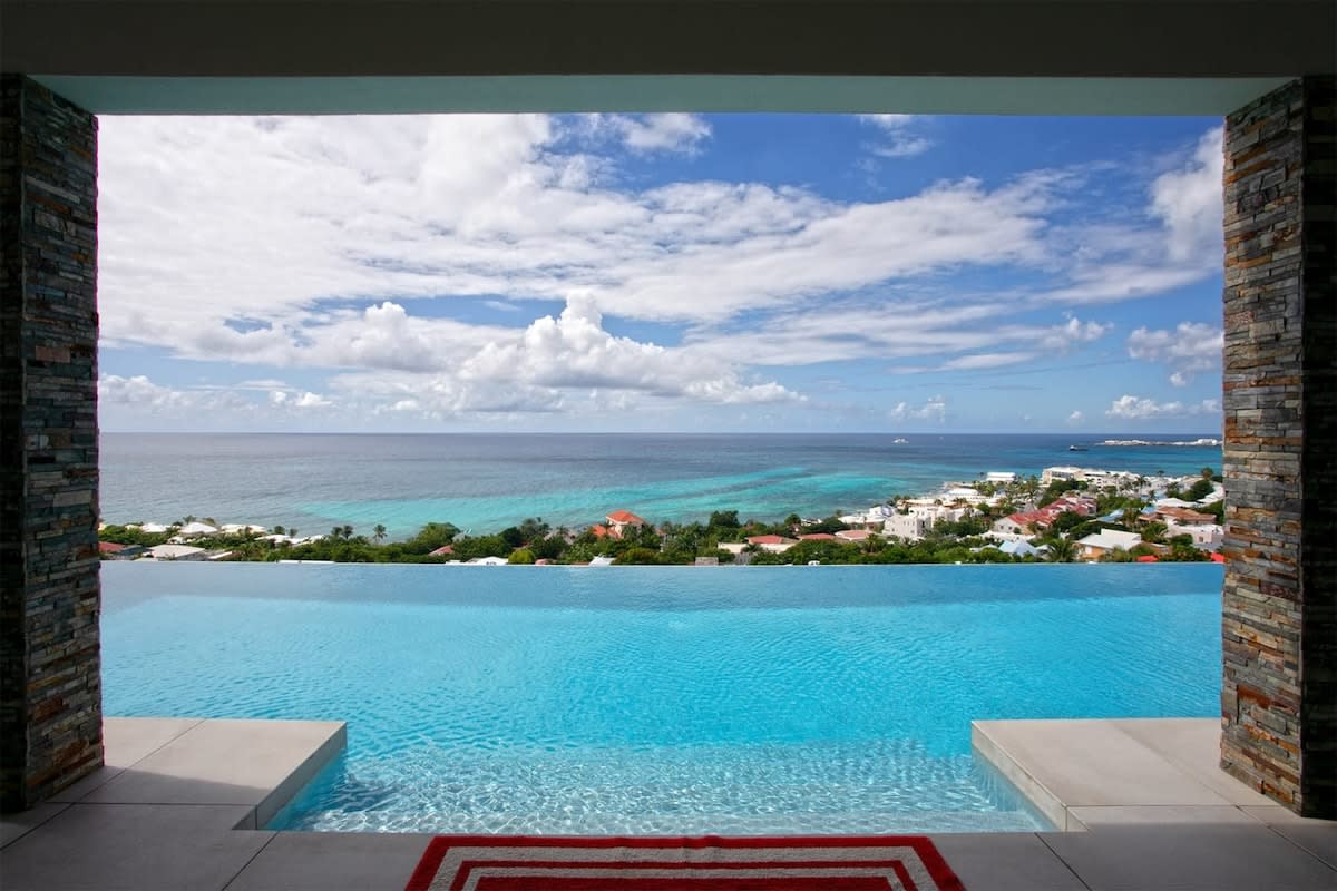 Villa Bella Vita features exquisite amenities and epic Caribbean sunset views over Pelican Key, St. Maarten.Life is good at Villa Bella Vita, a sumptuous 7-bedroom contemporary home located in the residential enclave of Pelican Key on the Dutch side of Sint Maarten. Just recently renovated, this spectacular home offers five-star amenities and unparalleled views over the Caribbean from its privileged cliffside position. From the beautiful infinity pool and spacious sun terrace, the unforgettable panorama unfolds of the Caribbean with the islands of Saba, St. Eustatius, and St. Kitts in the distance and picturesque Pelican Key just below. This beautifully appointed Villa Bella Vita with over 10,000 sq. ft of living space, includes 7 bedrooms, 8 ½ bathrooms, a large living room, a dining room, and a state-of-the-art gourmet kitchen, the villa also features a media room, a fitness room, and a roof-top terrace with summer kitchen. The seven-bedroom suites each have en-suite luxury bathrooms, six have king-size beds and the seventh has 2 full-size beds. Villa Bella Vita is eco-conscious, powered entirely by solar energy during the day and Tesla Powerwall technology in the evenings. All appliances have been chosen with this energy-saving philosophy in mind. The villa is powered by an AI home system that makes Villa Bella Vita unique in St. Maarten. The villa is conveniently located close to restaurants and nightlife in Simpson Bay and provides a dedicated onsite concierge to take advantage of the many activities that the island has to offer.