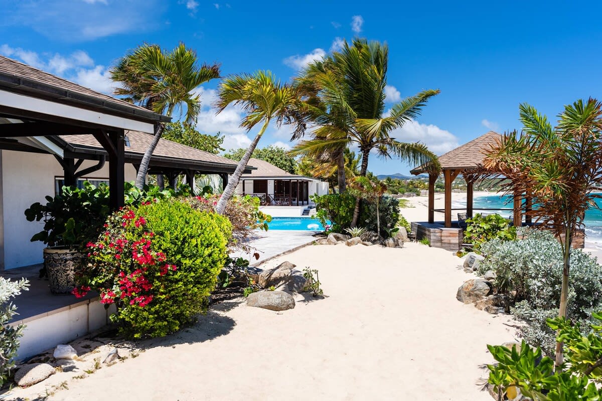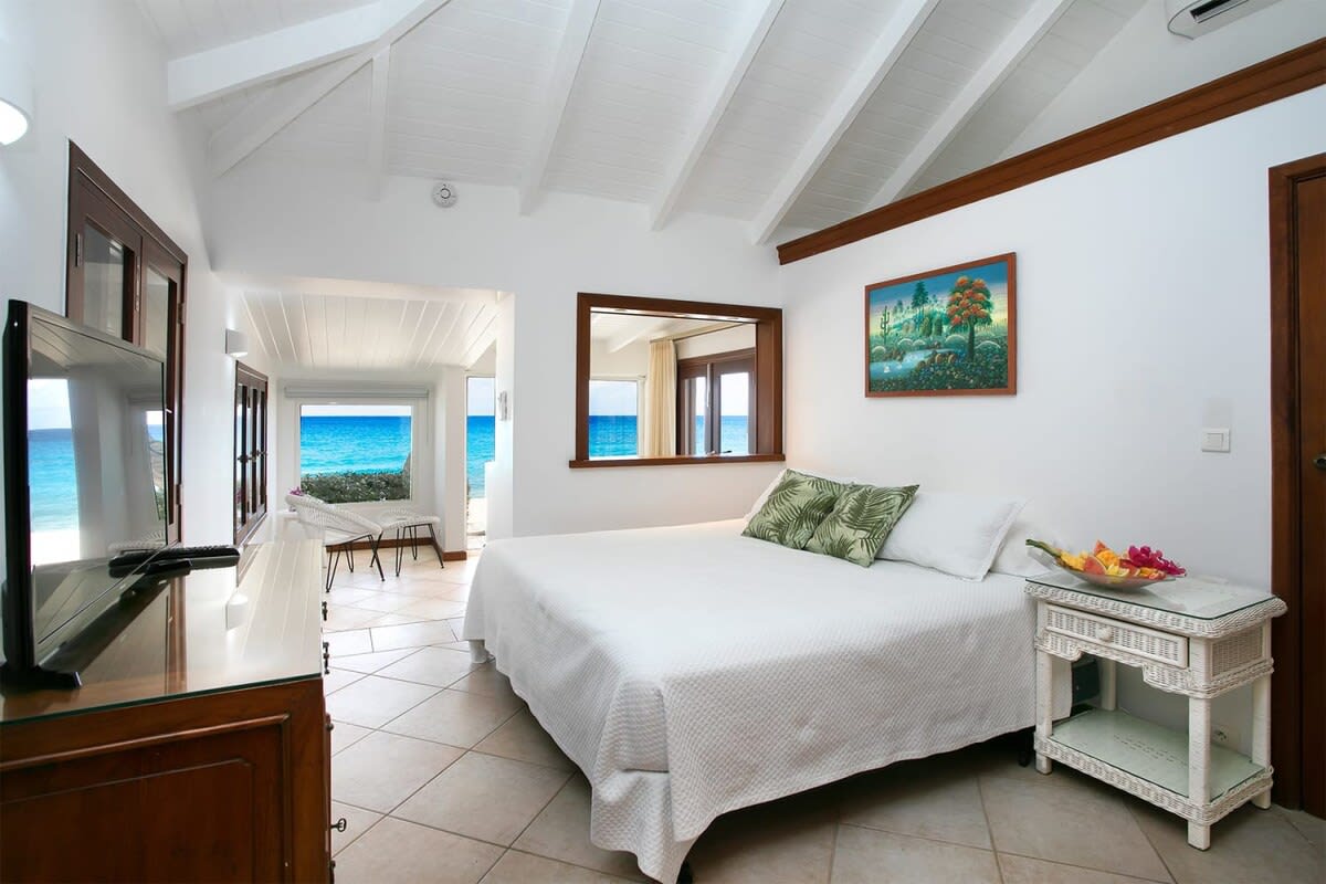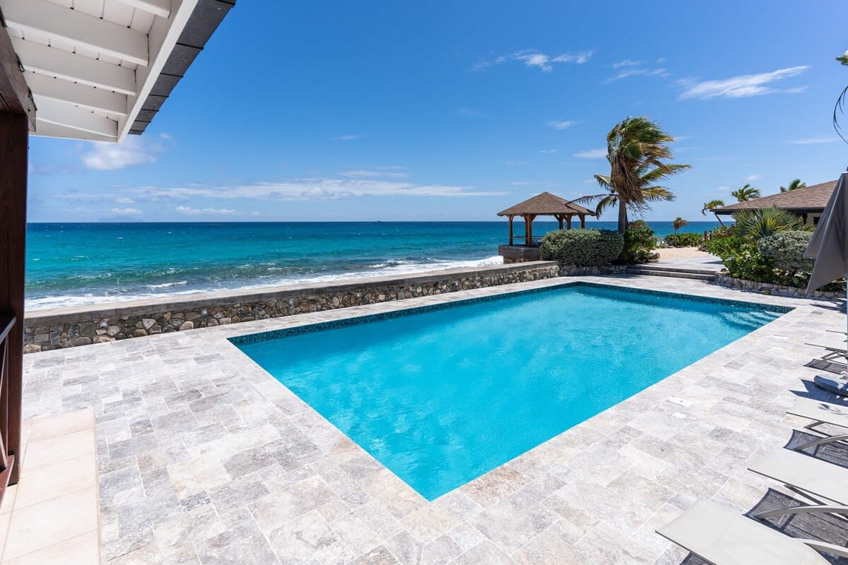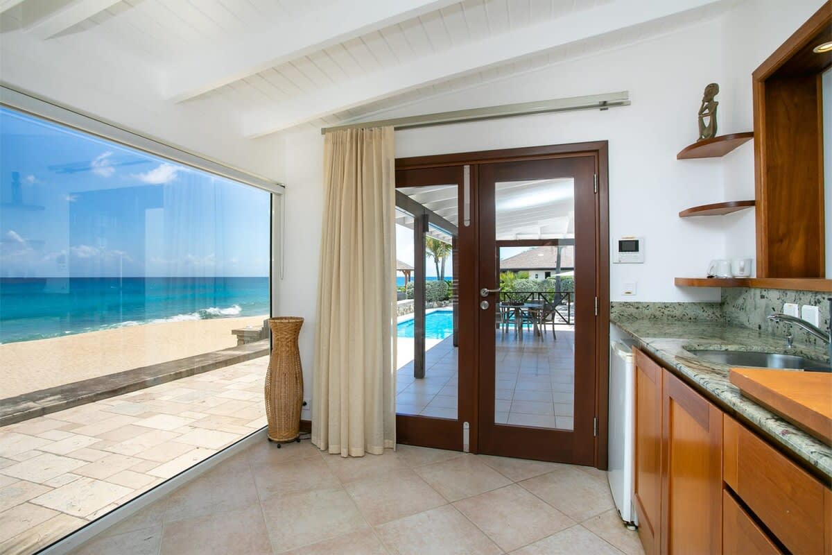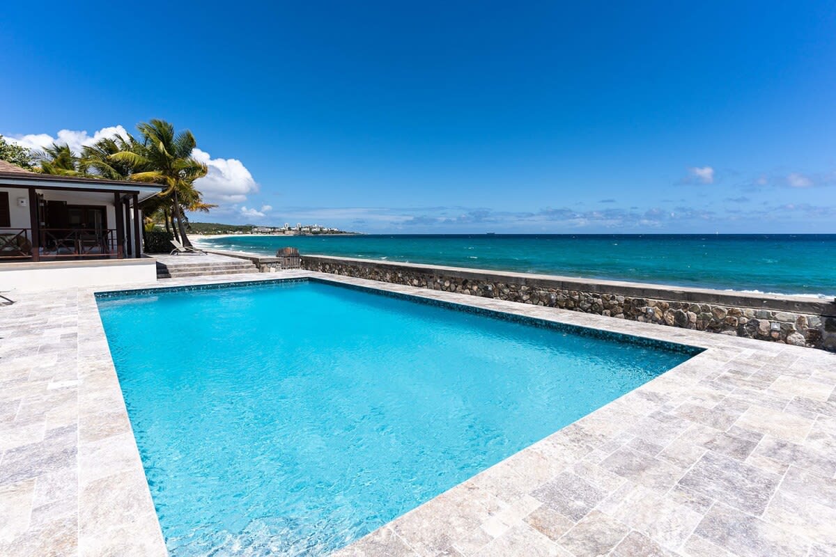 Villa Blue Beach sits on the immaculate Baie Longue Beach in Terres Basses, Saint Martin.Villa Blue Beach's breathtaking setting on Baie Longue beach in Terres Basses, Saint Martin, is an ocean lover's dream. Entering the fabulous coral stone drive and courtyard, the first things you see are iconic sea grapes and tropical shrubs topped by the brilliant blue sky; the first thing you hear is the sound of waves crashing onshore. You smell the intoxicating salty sea. This is heaven. Blue Beach sits on a hillock above the shore. It's an exotic, luxurious cottage that exudes Old World Caribbean style overlaid with a contemporary attitude. The views are simply breathtaking. You see the full length of Baie Lounge beach; straight ahead is the sapphire blue sea and the magical island of Saba. Sunsets are amazing. Embedded in lush tropical gardens, the house is composed of two wings flanking a large pool centered in a tumbled travertine terrace that expands the full length of the residence. Built on multi-levels, Villa Blue Beach's sweeping carved stairs connect the terrace spaces. The entire structure is just steps from the sandy shore. A pretty gazebo for watching sunsets sits at the terrace edge. At one end of the verandah is a two-bedroom cottage with a private patio. Both bedrooms have sea views; one has a kitchenette. The decor is romantic; serene, white, and comfortable. Beautiful custom mahogany Creole windows and doors add to the atmosphere. Each bedroom has an en-suite bathroom in pretty tiles. The main wing sits at the opposite end of the terrace. The open, airy great room, fully open to the view and the breezes, has spacious seating for relaxing. Rattan and teak furniture accented with tropical colors define the area. A well-equipped, modern galley-style kitchen opens to the great room and the views. Deep-covered verandahs with outdoor seating and dining spaces extend from the great room. You are steps from the ocean. A low coral stone sea wall, lined with silver buttonwood, palms, and bougainvillea, separates the terraces from the beach. Two additional bedrooms are off the great room. Both have sea views, and spa-style bathrooms, and are charmingly furnished in rattan, wicker, and teak with white linens. To expand sleeping capacity, Blue Beach can be rented along with its sister villa, Turtle Nest, right next door. It's like having Baie Longue Beach all to yourself. You are secluded, yet close to amenities. The beach is right in front of you. The fabulous restaurants and food purveyors in Baie Nettle and Porto Cupecoy are a few minutes' drive. You are 10 minutes to the French capital of Marigot, with its shops, restaurants, markets, and galleries, and 8 minutes to the airport. Grand Case and Philipsburg are 30 minutes away.