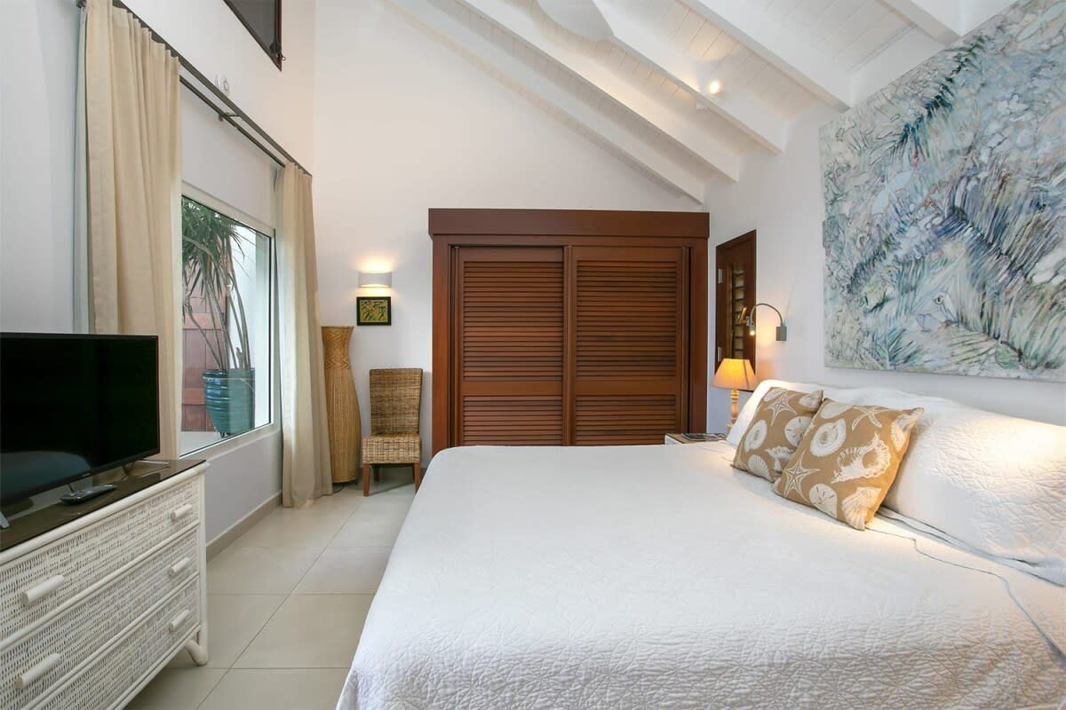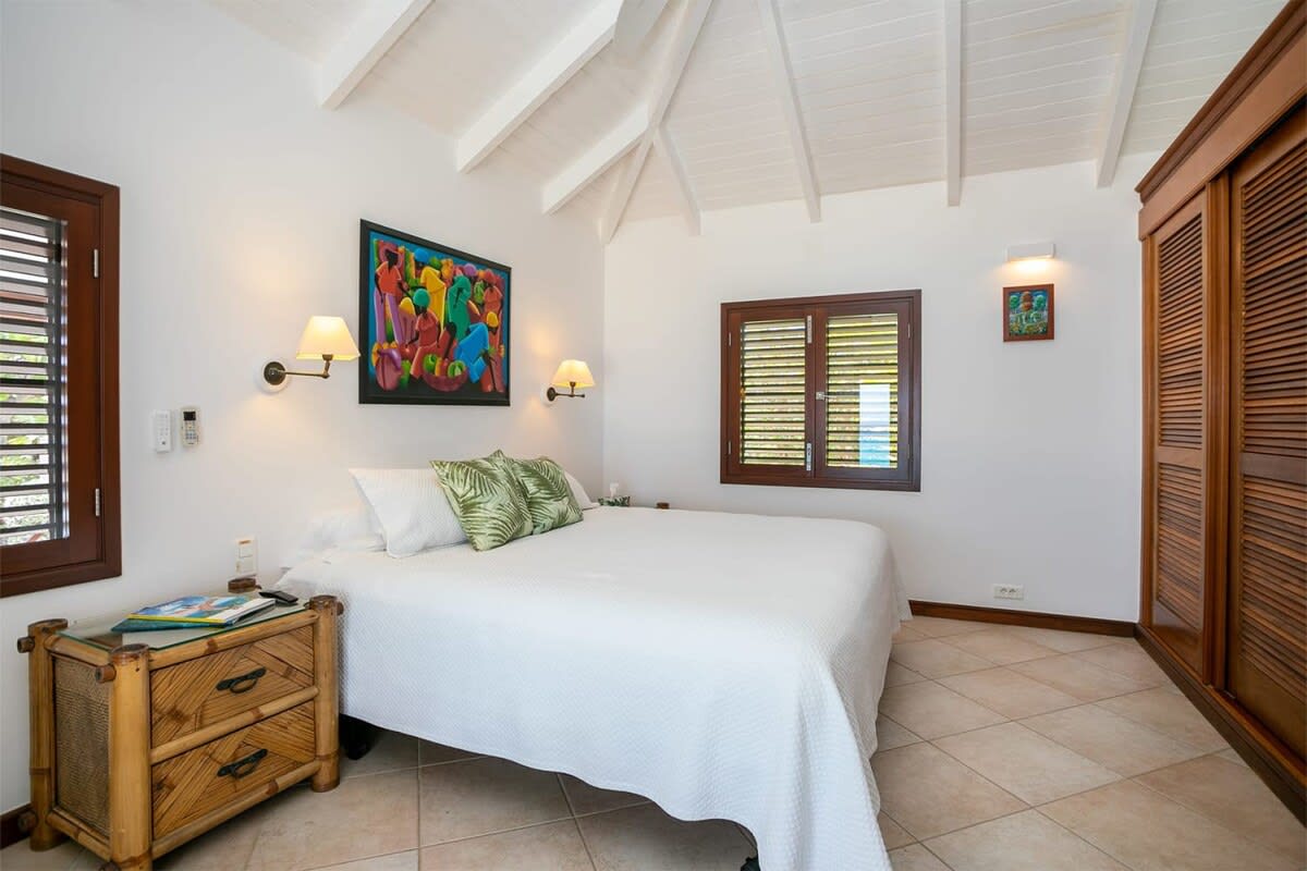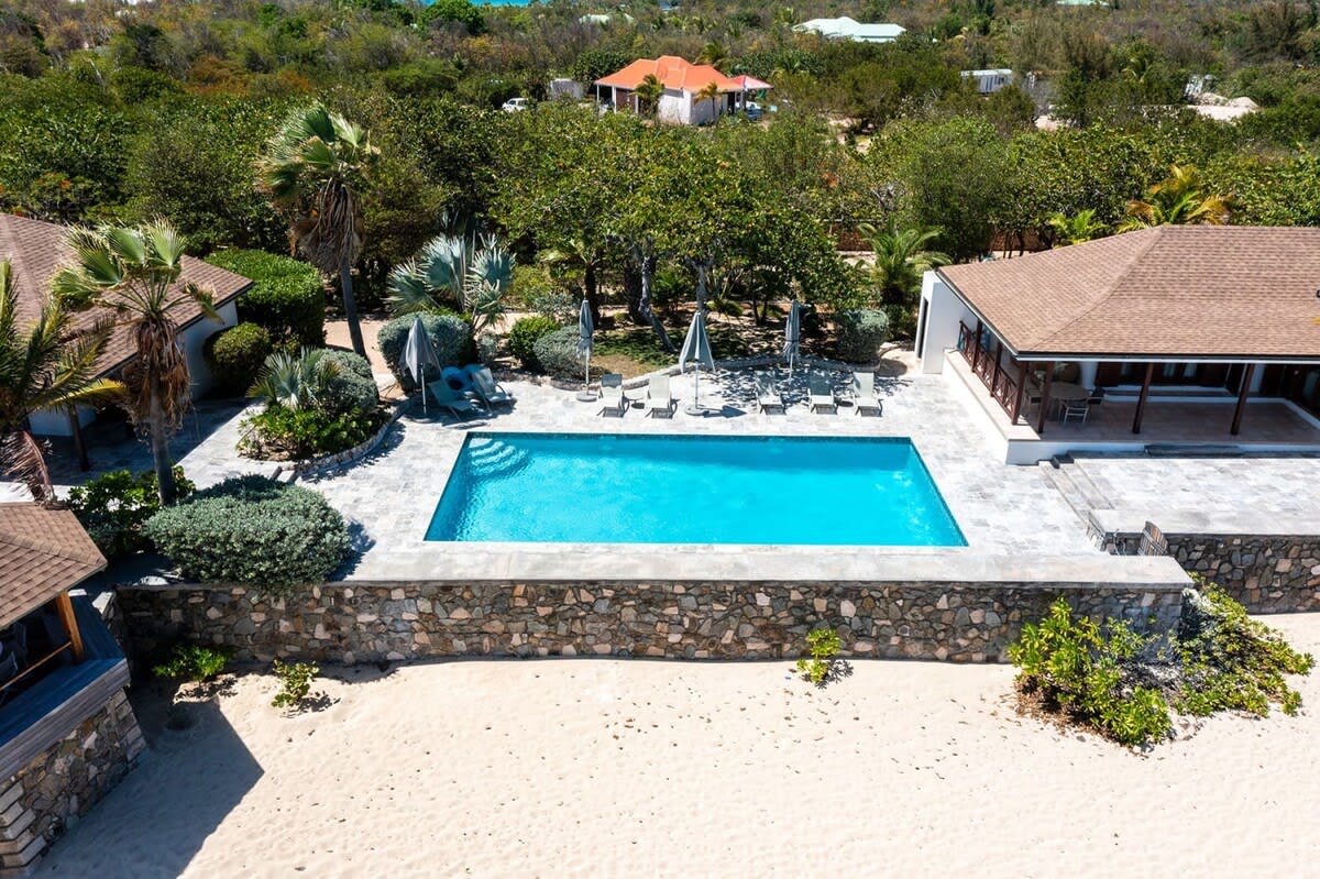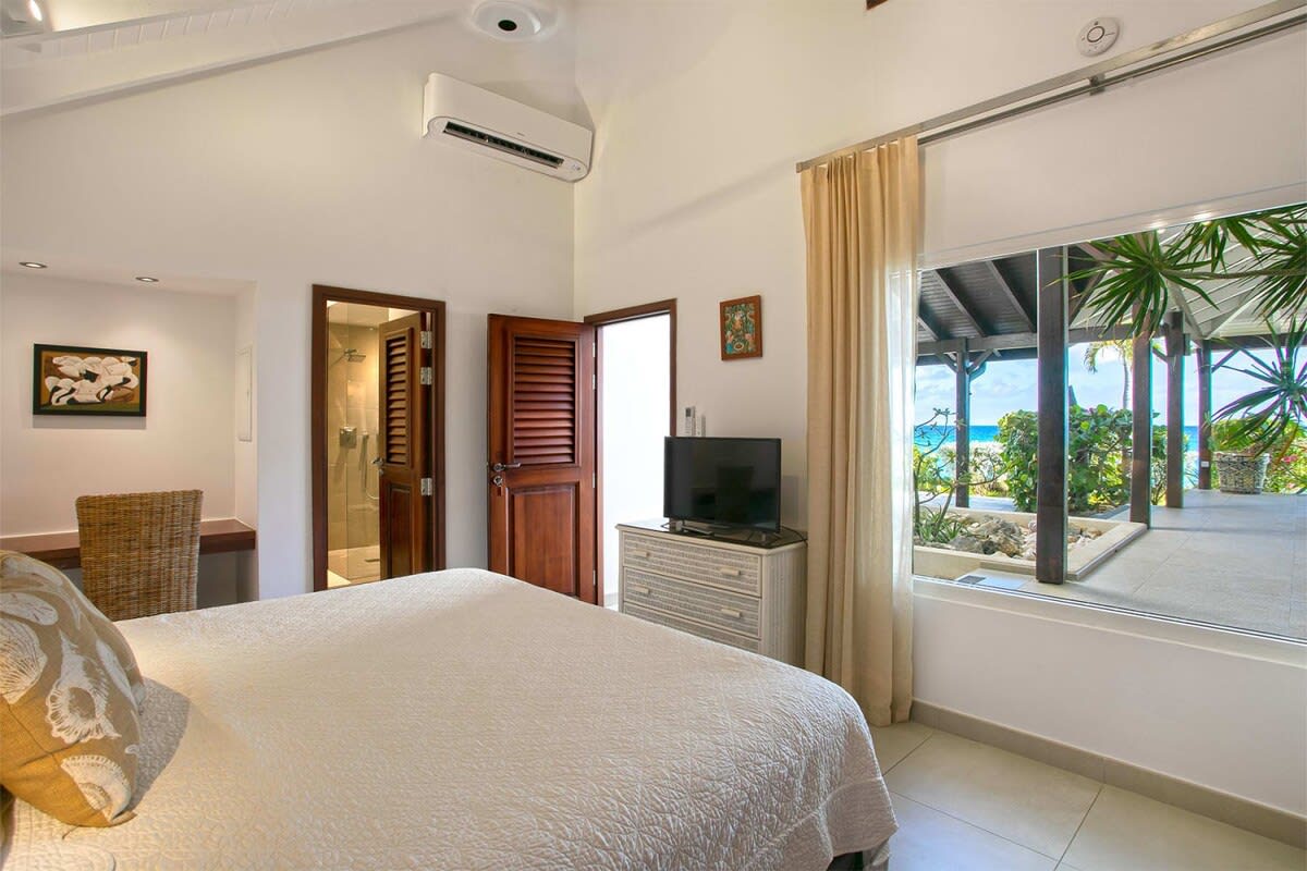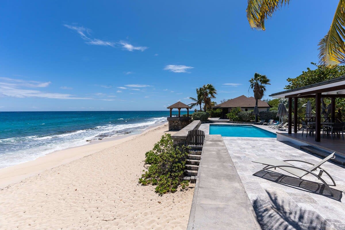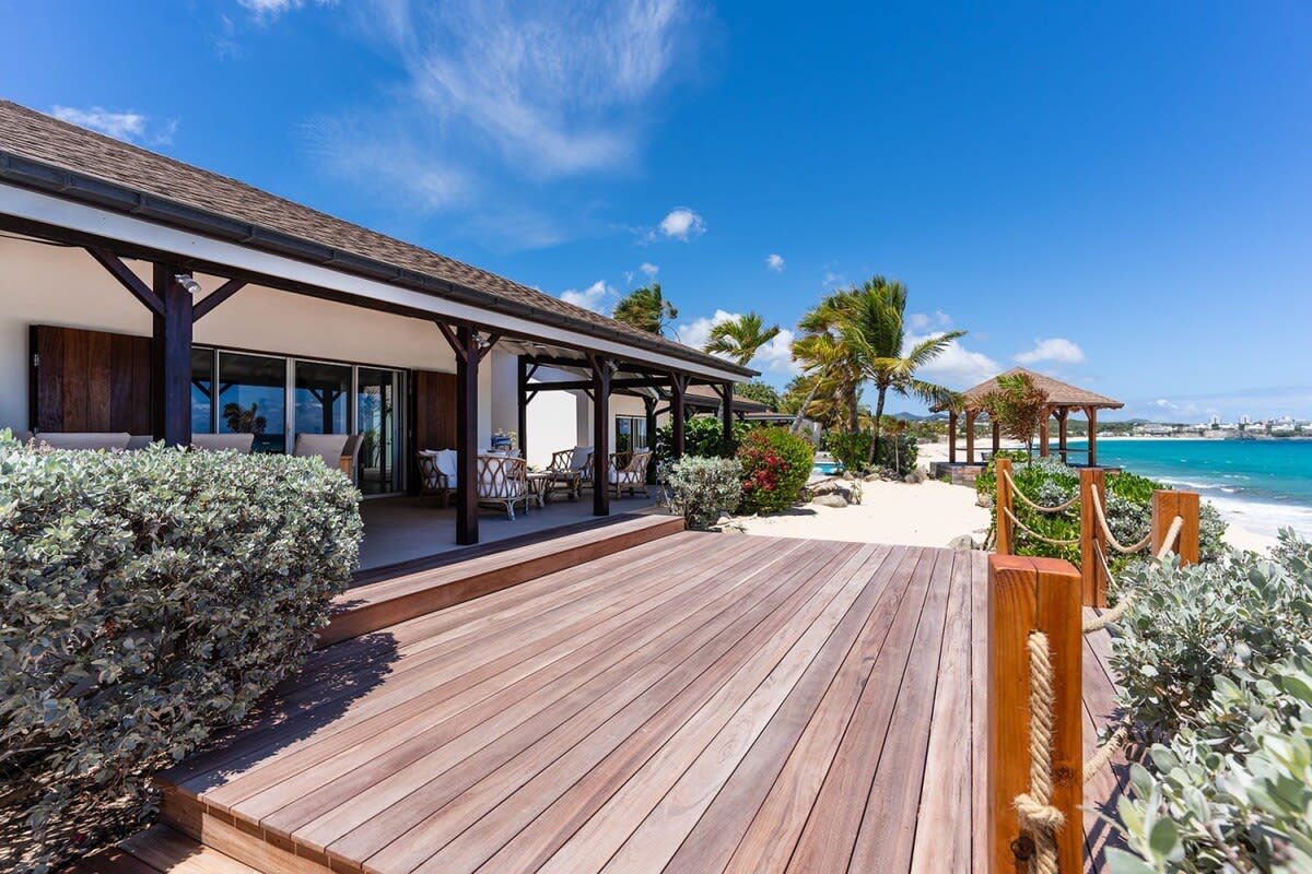 Villa Blue Beach sits on the immaculate Baie Longue Beach in Terres Basses, Saint Martin.Villa Blue Beach's breathtaking setting on Baie Longue beach in Terres Basses, Saint Martin, is an ocean lover's dream. Entering the fabulous coral stone drive and courtyard, the first things you see are iconic sea grapes and tropical shrubs topped by the brilliant blue sky; the first thing you hear is the sound of waves crashing onshore. You smell the intoxicating salty sea. This is heaven. Blue Beach sits on a hillock above the shore. It's an exotic, luxurious cottage that exudes Old World Caribbean style overlaid with a contemporary attitude. The views are simply breathtaking. You see the full length of Baie Lounge beach; straight ahead is the sapphire blue sea and the magical island of Saba. Sunsets are amazing. Embedded in lush tropical gardens, the house is composed of two wings flanking a large pool centered in a tumbled travertine terrace that expands the full length of the residence. Built on multi-levels, Villa Blue Beach's sweeping carved stairs connect the terrace spaces. The entire structure is just steps from the sandy shore. A pretty gazebo for watching sunsets sits at the terrace edge. At one end of the verandah is a two-bedroom cottage with a private patio. Both bedrooms have sea views; one has a kitchenette. The decor is romantic; serene, white, and comfortable. Beautiful custom mahogany Creole windows and doors add to the atmosphere. Each bedroom has an en-suite bathroom in pretty tiles. The main wing sits at the opposite end of the terrace. The open, airy great room, fully open to the view and the breezes, has spacious seating for relaxing. Rattan and teak furniture accented with tropical colors define the area. A well-equipped, modern galley-style kitchen opens to the great room and the views. Deep-covered verandahs with outdoor seating and dining spaces extend from the great room. You are steps from the ocean. A low coral stone sea wall, lined with silver buttonwood, palms, and bougainvillea, separates the terraces from the beach. Two additional bedrooms are off the great room. Both have sea views, and spa-style bathrooms, and are charmingly furnished in rattan, wicker, and teak with white linens. To expand sleeping capacity, Blue Beach can be rented along with its sister villa, Turtle Nest, right next door. It's like having Baie Longue Beach all to yourself. You are secluded, yet close to amenities. The beach is right in front of you. The fabulous restaurants and food purveyors in Baie Nettle and Porto Cupecoy are a few minutes' drive. You are 10 minutes to the French capital of Marigot, with its shops, restaurants, markets, and galleries, and 8 minutes to the airport. Grand Case and Philipsburg are 30 minutes away.