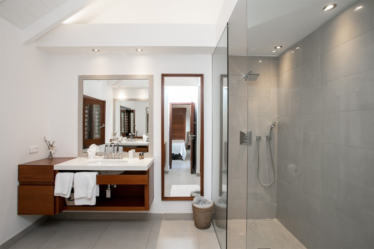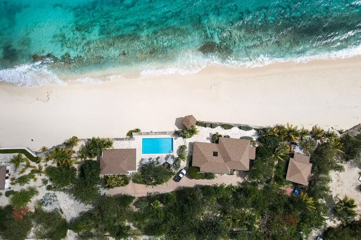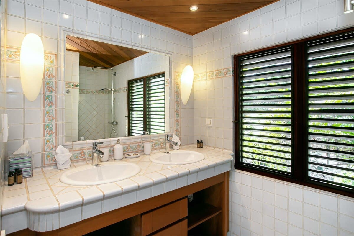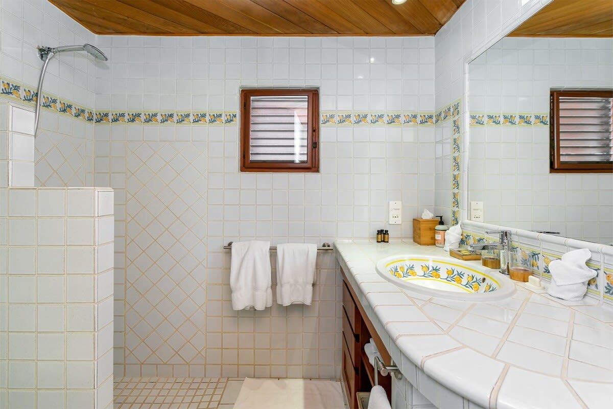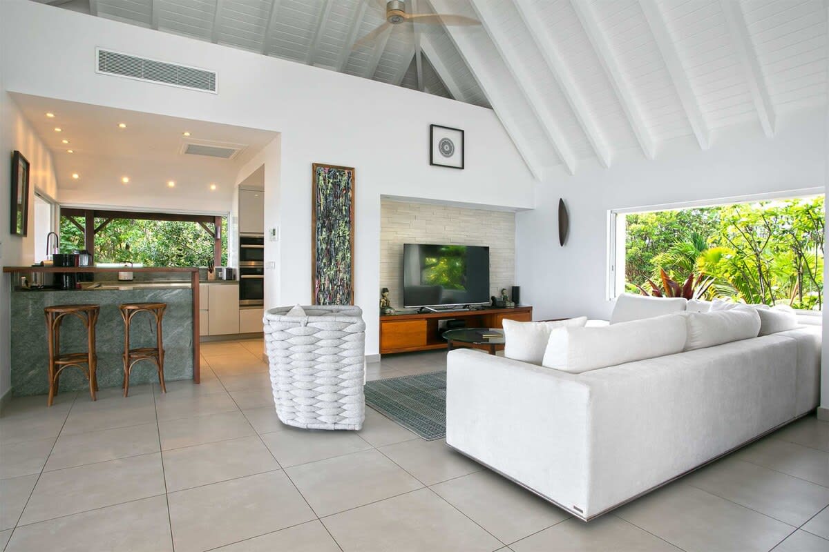 Villa Blue Beach sits on the immaculate Baie Longue Beach in Terres Basses, Saint Martin.Villa Blue Beach's breathtaking setting on Baie Longue beach in Terres Basses, Saint Martin, is an ocean lover's dream. Entering the fabulous coral stone drive and courtyard, the first things you see are iconic sea grapes and tropical shrubs topped by the brilliant blue sky; the first thing you hear is the sound of waves crashing onshore. You smell the intoxicating salty sea. This is heaven. Blue Beach sits on a hillock above the shore. It's an exotic, luxurious cottage that exudes Old World Caribbean style overlaid with a contemporary attitude. The views are simply breathtaking. You see the full length of Baie Lounge beach; straight ahead is the sapphire blue sea and the magical island of Saba. Sunsets are amazing. Embedded in lush tropical gardens, the house is composed of two wings flanking a large pool centered in a tumbled travertine terrace that expands the full length of the residence. Built on multi-levels, Villa Blue Beach's sweeping carved stairs connect the terrace spaces. The entire structure is just steps from the sandy shore. A pretty gazebo for watching sunsets sits at the terrace edge. At one end of the verandah is a two-bedroom cottage with a private patio. Both bedrooms have sea views; one has a kitchenette. The decor is romantic; serene, white, and comfortable. Beautiful custom mahogany Creole windows and doors add to the atmosphere. Each bedroom has an en-suite bathroom in pretty tiles. The main wing sits at the opposite end of the terrace. The open, airy great room, fully open to the view and the breezes, has spacious seating for relaxing. Rattan and teak furniture accented with tropical colors define the area. A well-equipped, modern galley-style kitchen opens to the great room and the views. Deep-covered verandahs with outdoor seating and dining spaces extend from the great room. You are steps from the ocean. A low coral stone sea wall, lined with silver buttonwood, palms, and bougainvillea, separates the terraces from the beach. Two additional bedrooms are off the great room. Both have sea views, and spa-style bathrooms, and are charmingly furnished in rattan, wicker, and teak with white linens. To expand sleeping capacity, Blue Beach can be rented along with its sister villa, Turtle Nest, right next door. It's like having Baie Longue Beach all to yourself. You are secluded, yet close to amenities. The beach is right in front of you. The fabulous restaurants and food purveyors in Baie Nettle and Porto Cupecoy are a few minutes' drive. You are 10 minutes to the French capital of Marigot, with its shops, restaurants, markets, and galleries, and 8 minutes to the airport. Grand Case and Philipsburg are 30 minutes away.