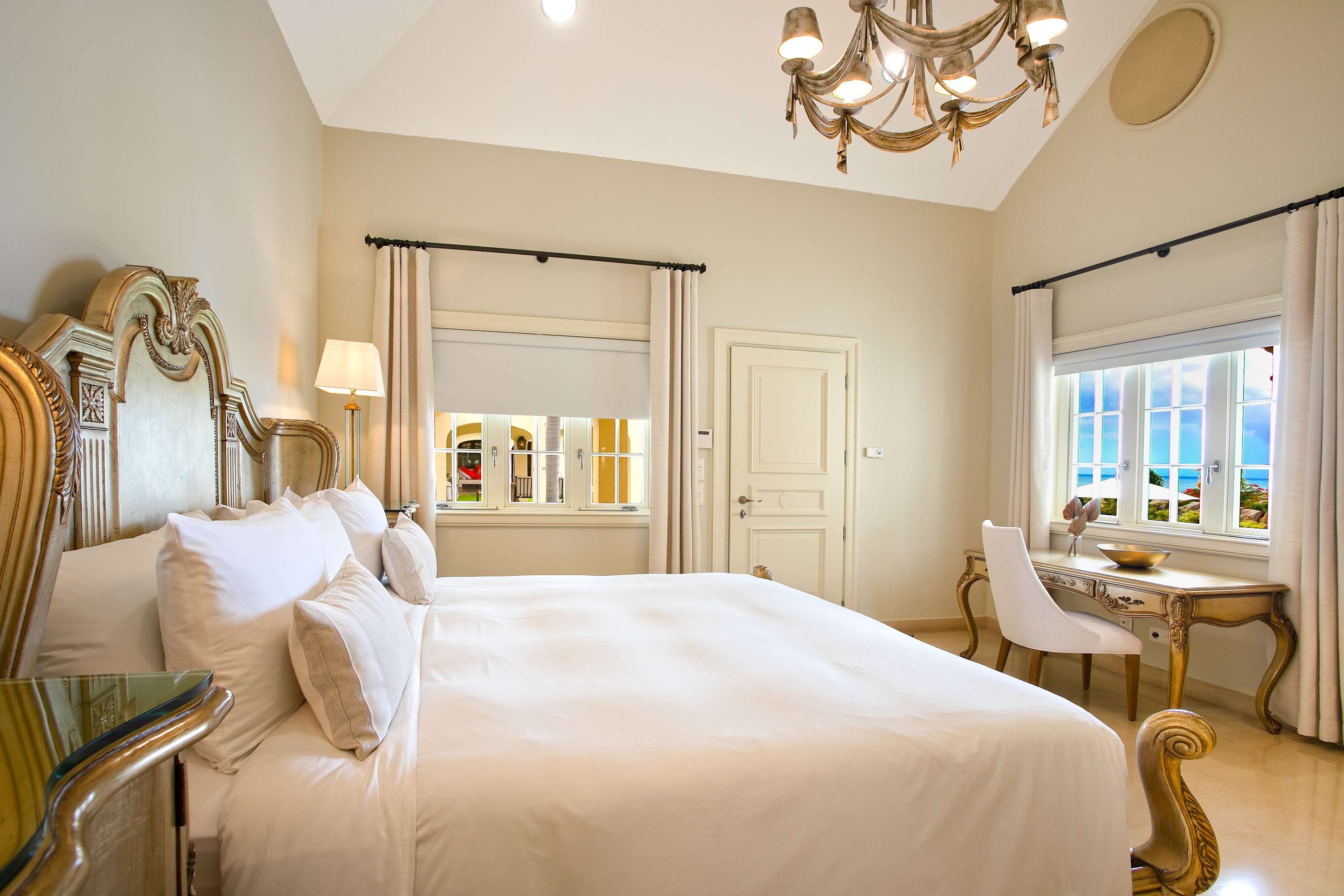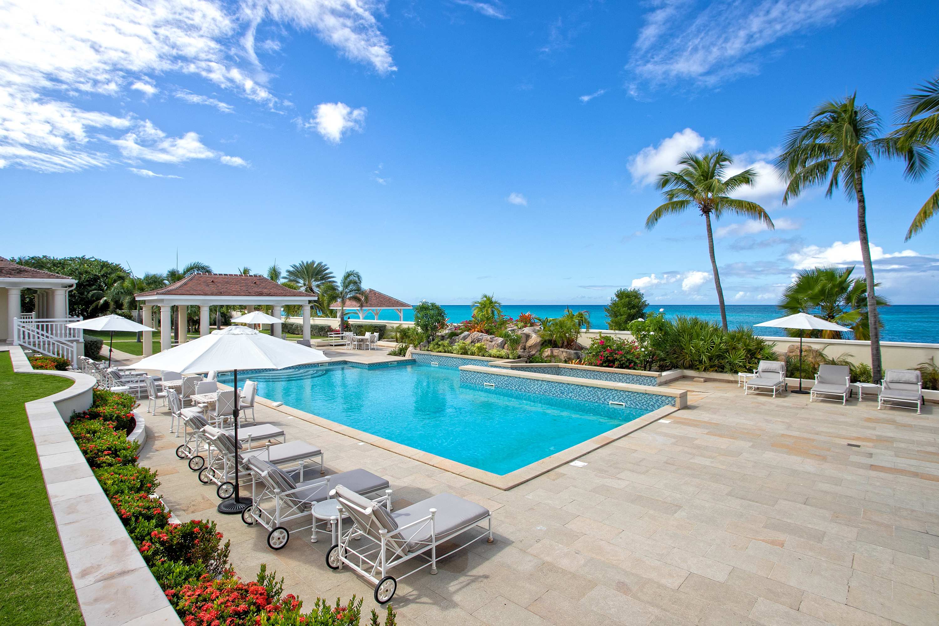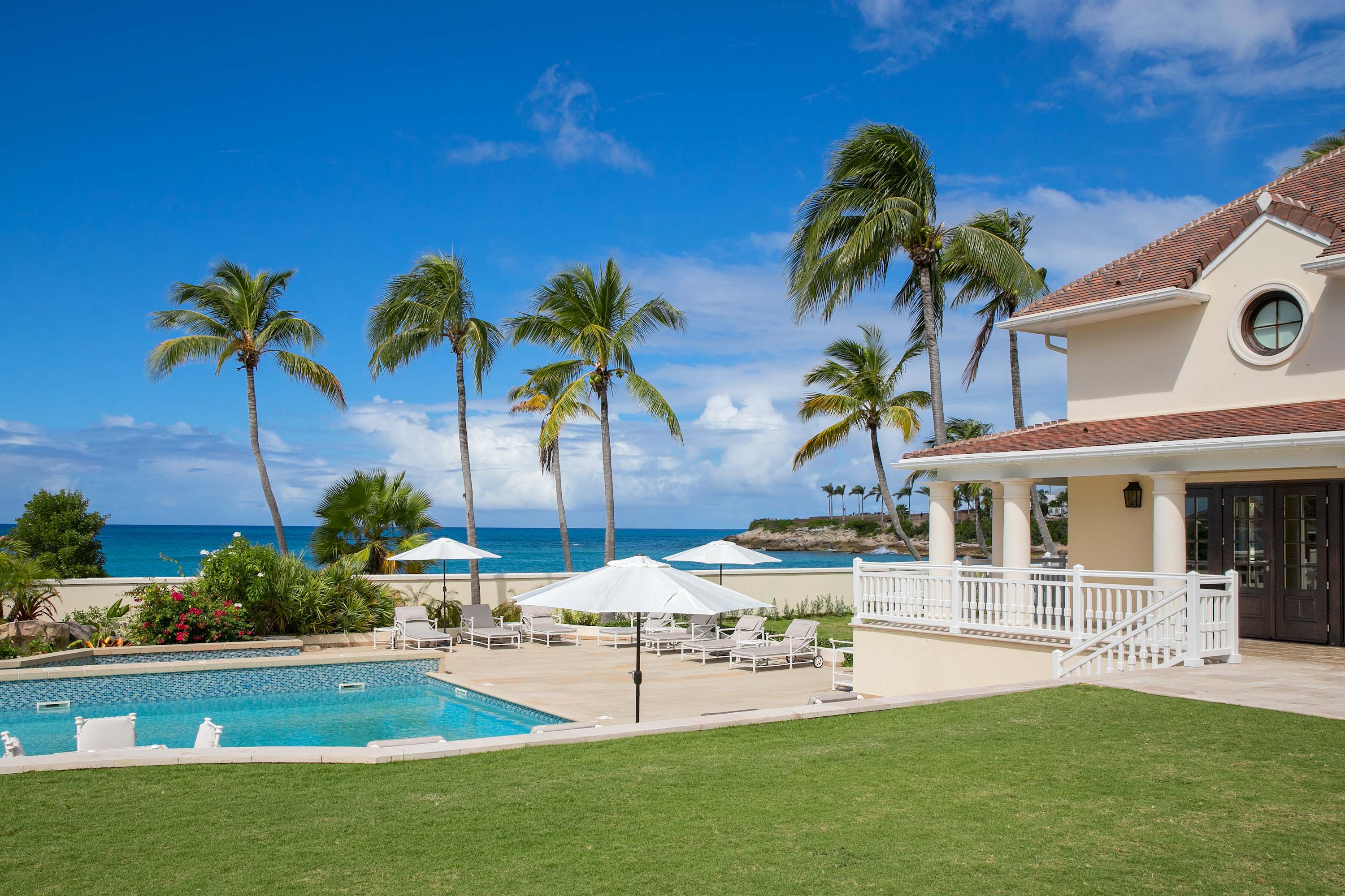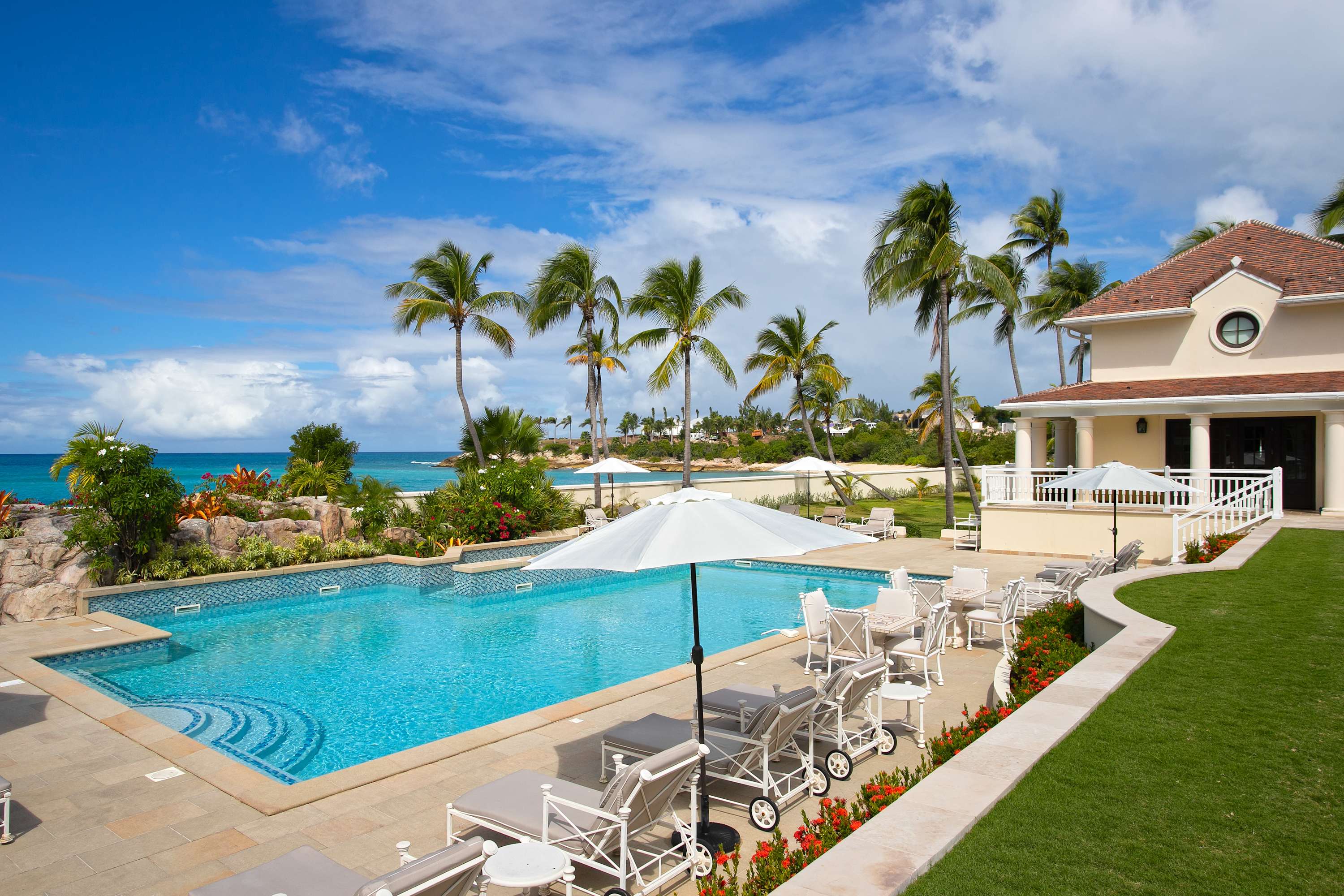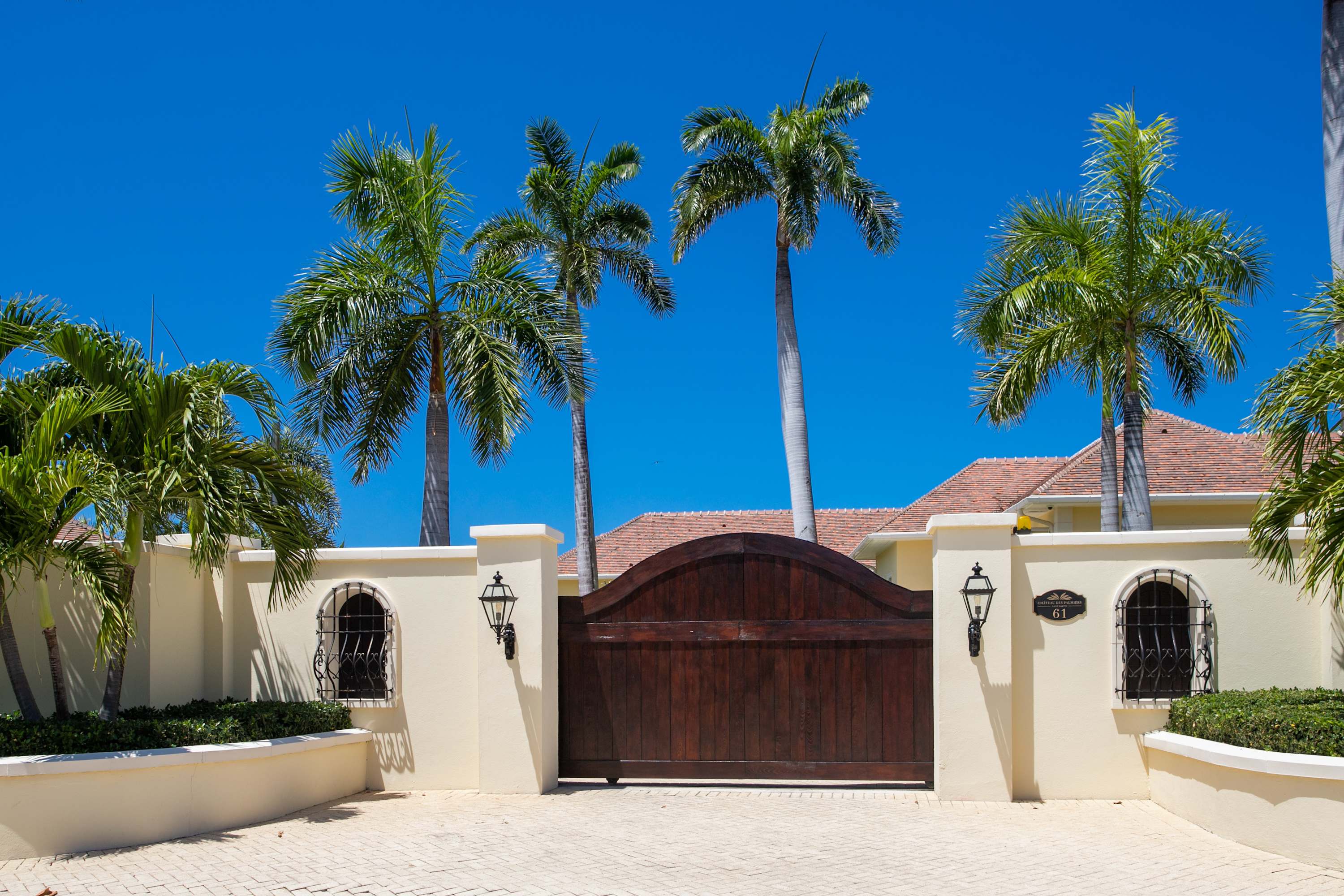 Villa Chateau des Palmiers is a fully staffed beachfront estate on Plum Bay in Terres Basses, St. Martin.Le Chateau des Palmiers is a world-class beachfront estate that includes a 6-bedroom ocean-side villa and a 4-bedroom garden-side villa in Terres Basses, Saint Martin. Situated on the white sand beach at Plum Bay, this fabulous property provides an intimate, relaxed, and attentive environment within the walls of a gated enclave. The many amenities include a huge heated pool, an open-air and air-conditioned fitness center, a tennis court, and a covered outdoor bar, billiards, and dining areas. The oceanside villa features 6 king size bedrooms with full private baths including a two-story master suite with a master bath with a jacuzzi tub and two private balconies facing the pool and ocean. The remaining interior spaces include a fully equipped kitchen, a formal living room, a formal dining room seating 10, and a casual outside dining area and a media room. The 4 bedroom garden side villa features the "Jungle Room” with a king-size bed and small living room, the “Palm Room” with a king-size mahogany bed, and a 2 bedroom suite with queen size beds, a shared living room, and a cozy dining room. There is also a huge commercial catering kitchen. Other amenities include air conditioning in all rooms, an outdoor sound system, and internet access. All bedrooms have independent TV receiver & DVD, the media room and master bedroom have a large satellite dish & DVD. There is an on-site Chef and experienced security staff available along with a state-of-the-art security system. Enjoy the beautiful Caribbean sunsets from this stunning one-of-a-kind Château and experience the vacation of a lifetime.Featured Amenities include Housekeeping 7 days a week, Turn down service, Chef service 3 meals per day, Onsite property manager and assistance, Daily concierge service. In addition to being available for rental, Villa Chateau des Palmiers is listed for sale.