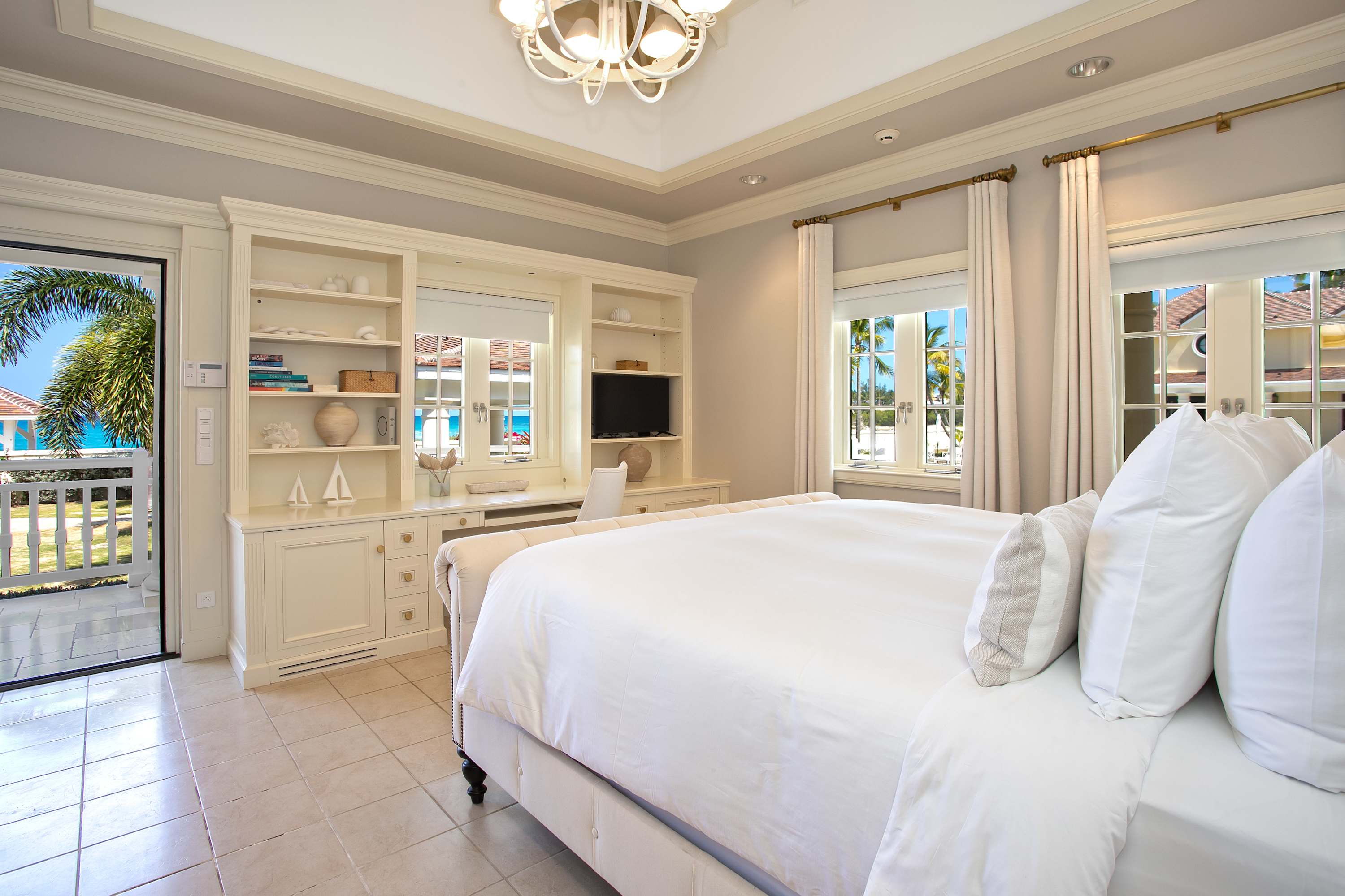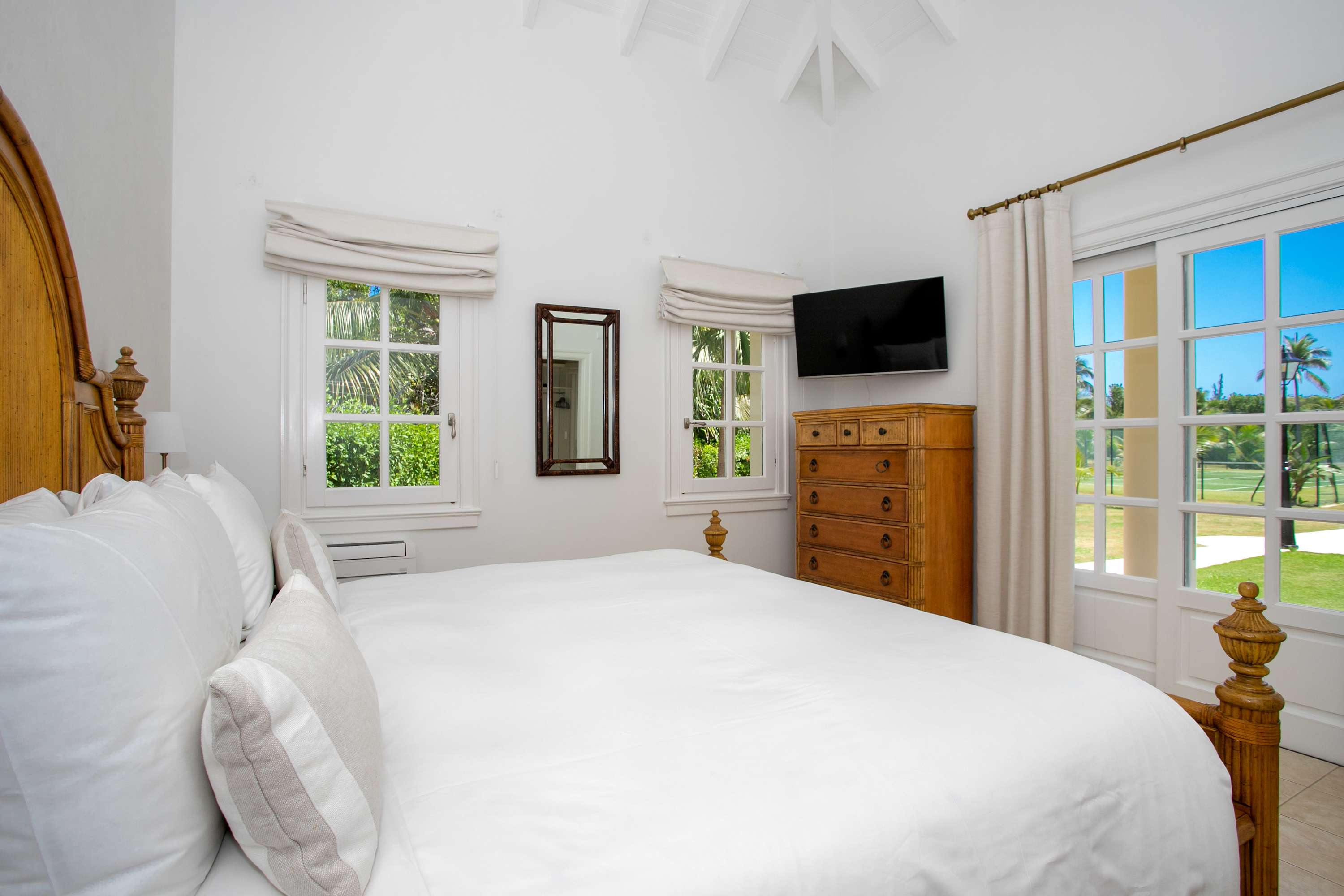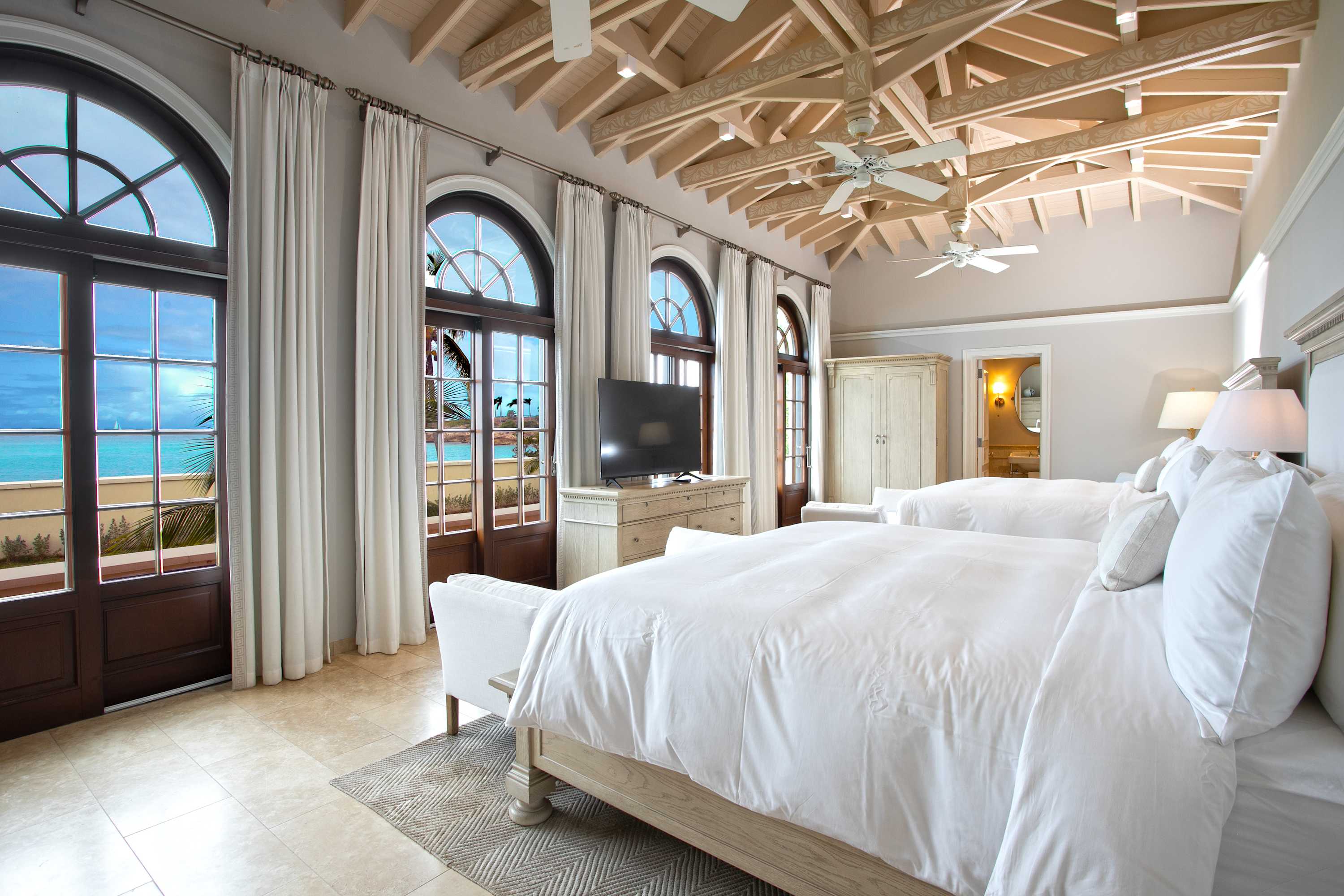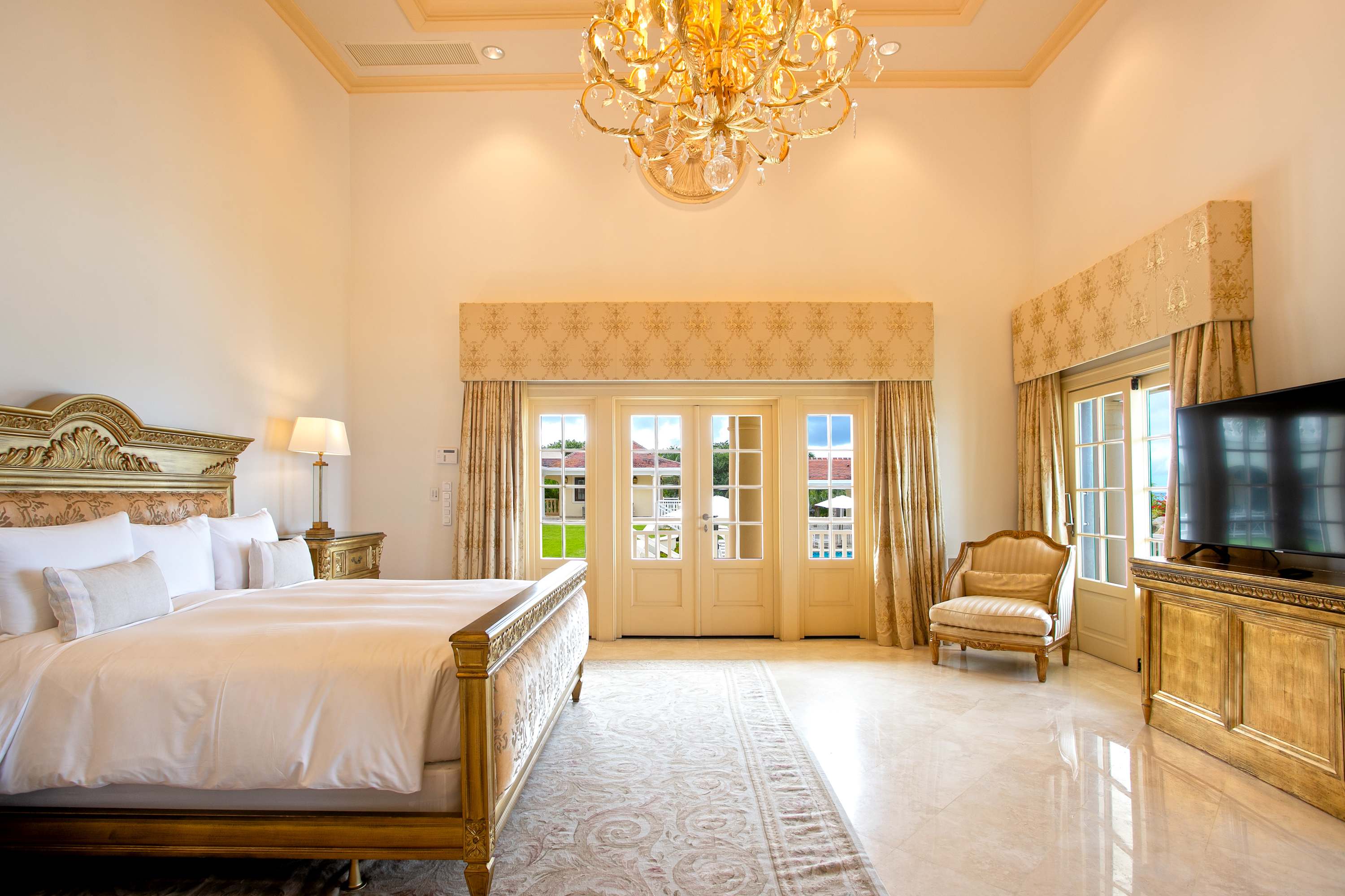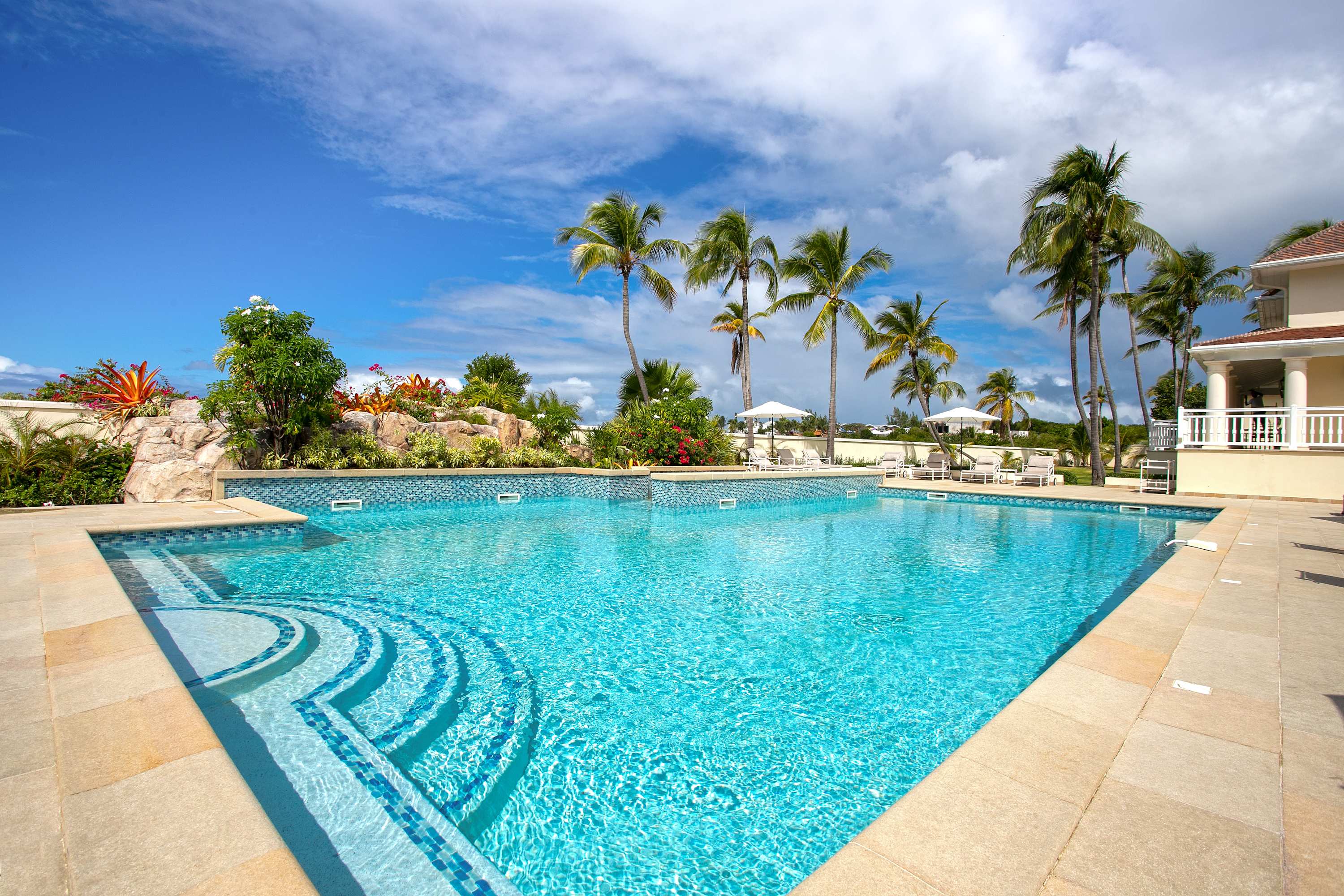 Villa Chateau des Palmiers is a fully staffed beachfront estate on Plum Bay in Terres Basses, St. Martin.Le Chateau des Palmiers is a world-class beachfront estate that includes a 6-bedroom ocean-side villa and a 4-bedroom garden-side villa in Terres Basses, Saint Martin. Situated on the white sand beach at Plum Bay, this fabulous property provides an intimate, relaxed, and attentive environment within the walls of a gated enclave. The many amenities include a huge heated pool, an open-air and air-conditioned fitness center, a tennis court, and a covered outdoor bar, billiards, and dining areas. The oceanside villa features 6 king size bedrooms with full private baths including a two-story master suite with a master bath with a jacuzzi tub and two private balconies facing the pool and ocean. The remaining interior spaces include a fully equipped kitchen, a formal living room, a formal dining room seating 10, and a casual outside dining area and a media room. The 4 bedroom garden side villa features the "Jungle Room” with a king-size bed and small living room, the “Palm Room” with a king-size mahogany bed, and a 2 bedroom suite with queen size beds, a shared living room, and a cozy dining room. There is also a huge commercial catering kitchen. Other amenities include air conditioning in all rooms, an outdoor sound system, and internet access. All bedrooms have independent TV receiver & DVD, the media room and master bedroom have a large satellite dish & DVD. There is an on-site Chef and experienced security staff available along with a state-of-the-art security system. Enjoy the beautiful Caribbean sunsets from this stunning one-of-a-kind Château and experience the vacation of a lifetime.Featured Amenities include Housekeeping 7 days a week, Turn down service, Chef service 3 meals per day, Onsite property manager and assistance, Daily concierge service. In addition to being available for rental, Villa Chateau des Palmiers is listed for sale.