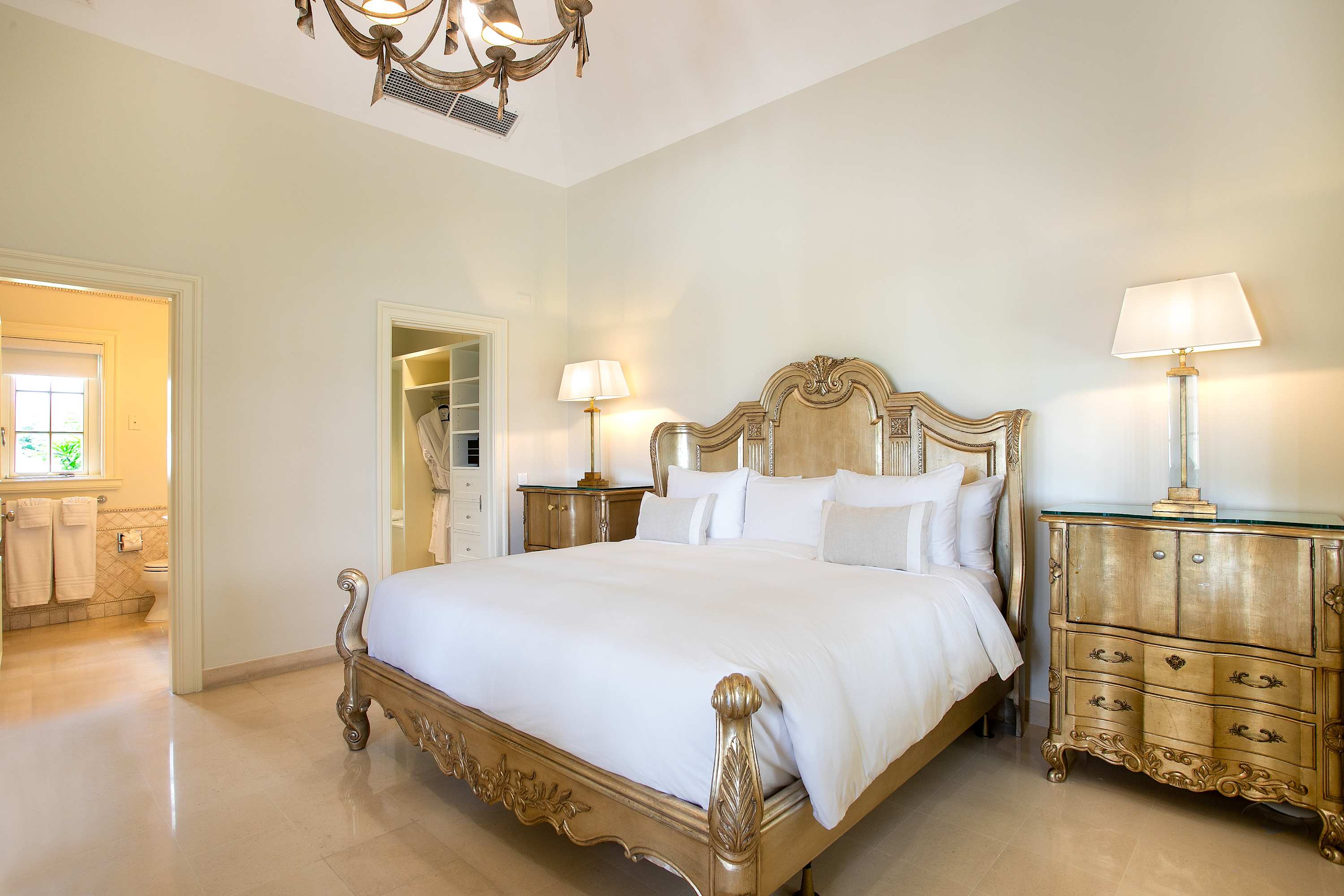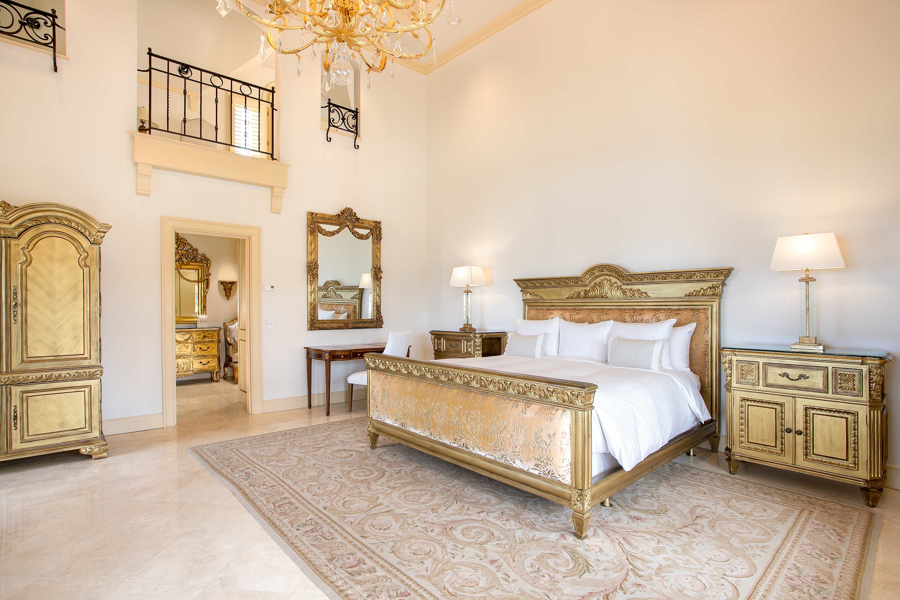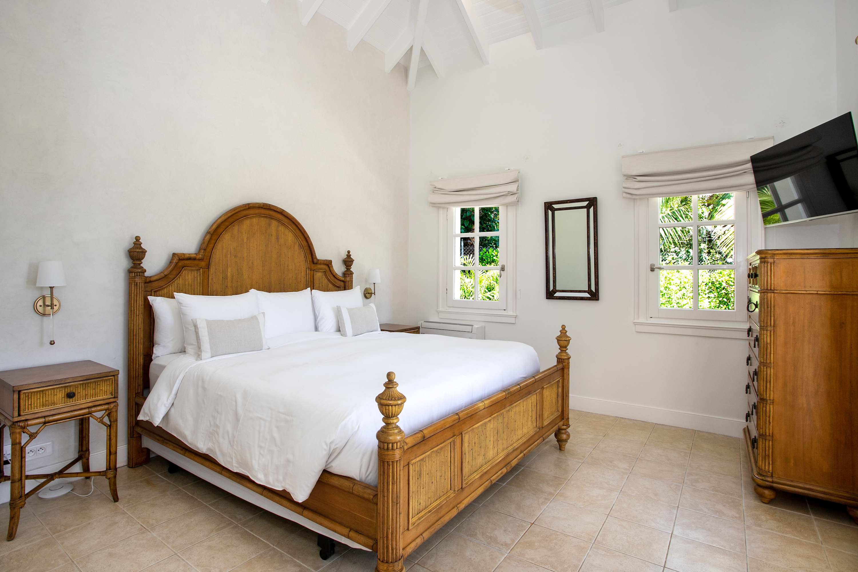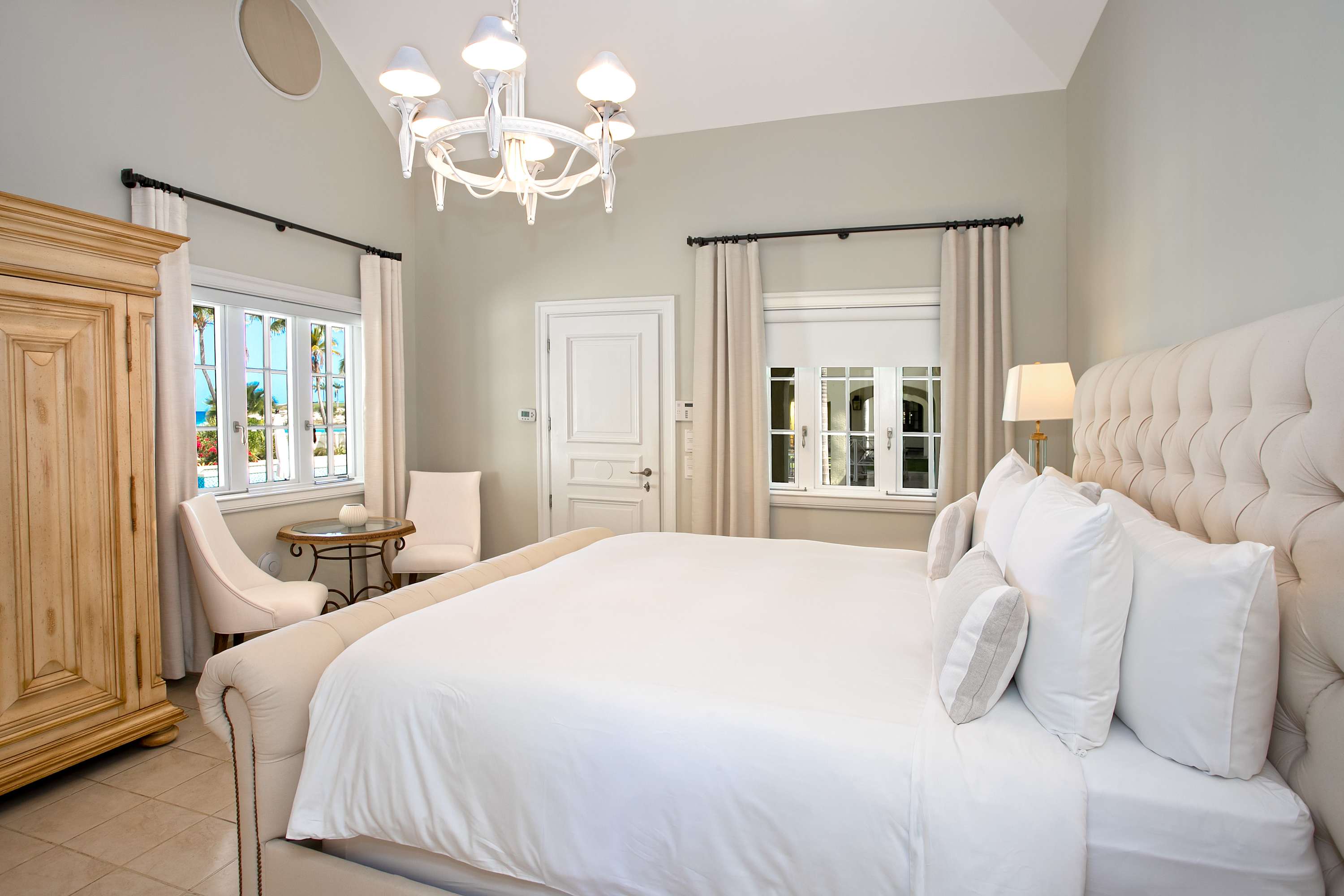 Villa Chateau des Palmiers is a fully staffed beachfront estate on Plum Bay in Terres Basses, St. Martin.Le Chateau des Palmiers is a world-class beachfront estate that includes a 6-bedroom ocean-side villa and a 4-bedroom garden-side villa in Terres Basses, Saint Martin. Situated on the white sand beach at Plum Bay, this fabulous property provides an intimate, relaxed, and attentive environment within the walls of a gated enclave. The many amenities include a huge heated pool, an open-air and air-conditioned fitness center, a tennis court, and a covered outdoor bar, billiards, and dining areas. The oceanside villa features 6 king size bedrooms with full private baths including a two-story master suite with a master bath with a jacuzzi tub and two private balconies facing the pool and ocean. The remaining interior spaces include a fully equipped kitchen, a formal living room, a formal dining room seating 10, and a casual outside dining area and a media room. The 4 bedroom garden side villa features the "Jungle Room” with a king-size bed and small living room, the “Palm Room” with a king-size mahogany bed, and a 2 bedroom suite with queen size beds, a shared living room, and a cozy dining room. There is also a huge commercial catering kitchen. Other amenities include air conditioning in all rooms, an outdoor sound system, and internet access. All bedrooms have independent TV receiver & DVD, the media room and master bedroom have a large satellite dish & DVD. There is an on-site Chef and experienced security staff available along with a state-of-the-art security system. Enjoy the beautiful Caribbean sunsets from this stunning one-of-a-kind Château and experience the vacation of a lifetime.Featured Amenities include Housekeeping 7 days a week, Turn down service, Chef service 3 meals per day, Onsite property manager and assistance, Daily concierge service. In addition to being available for rental, Villa Chateau des Palmiers is listed for sale.