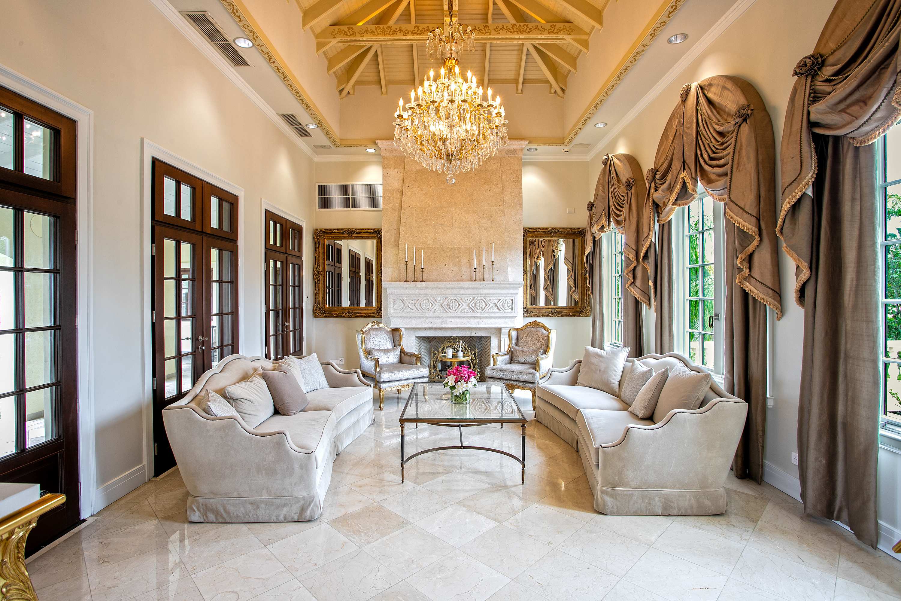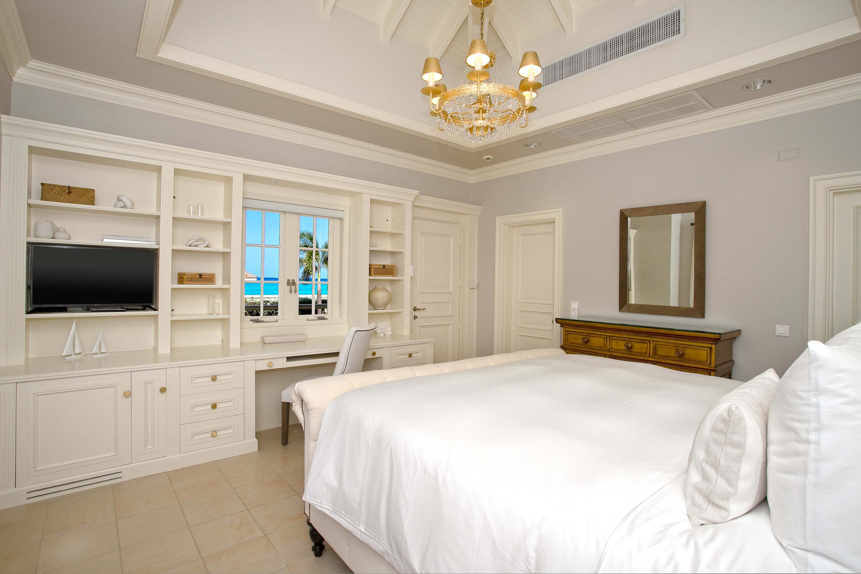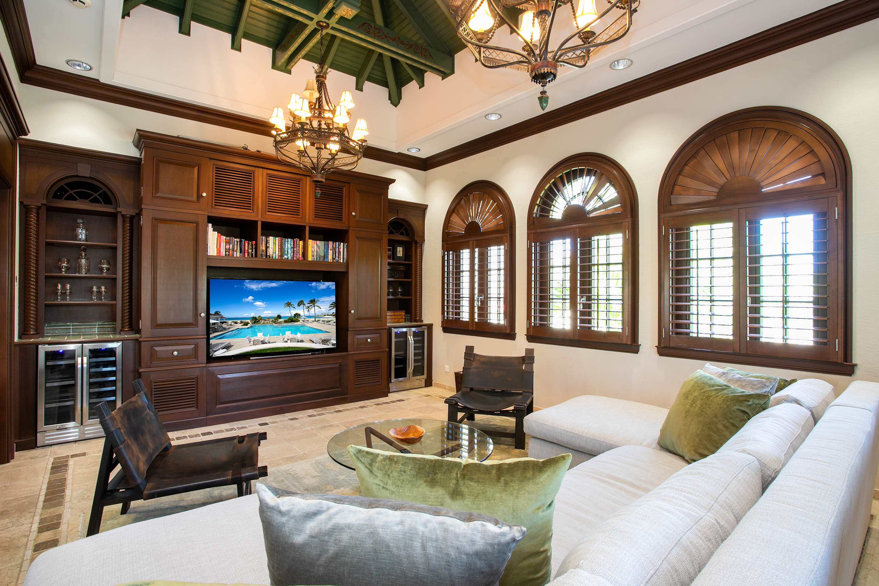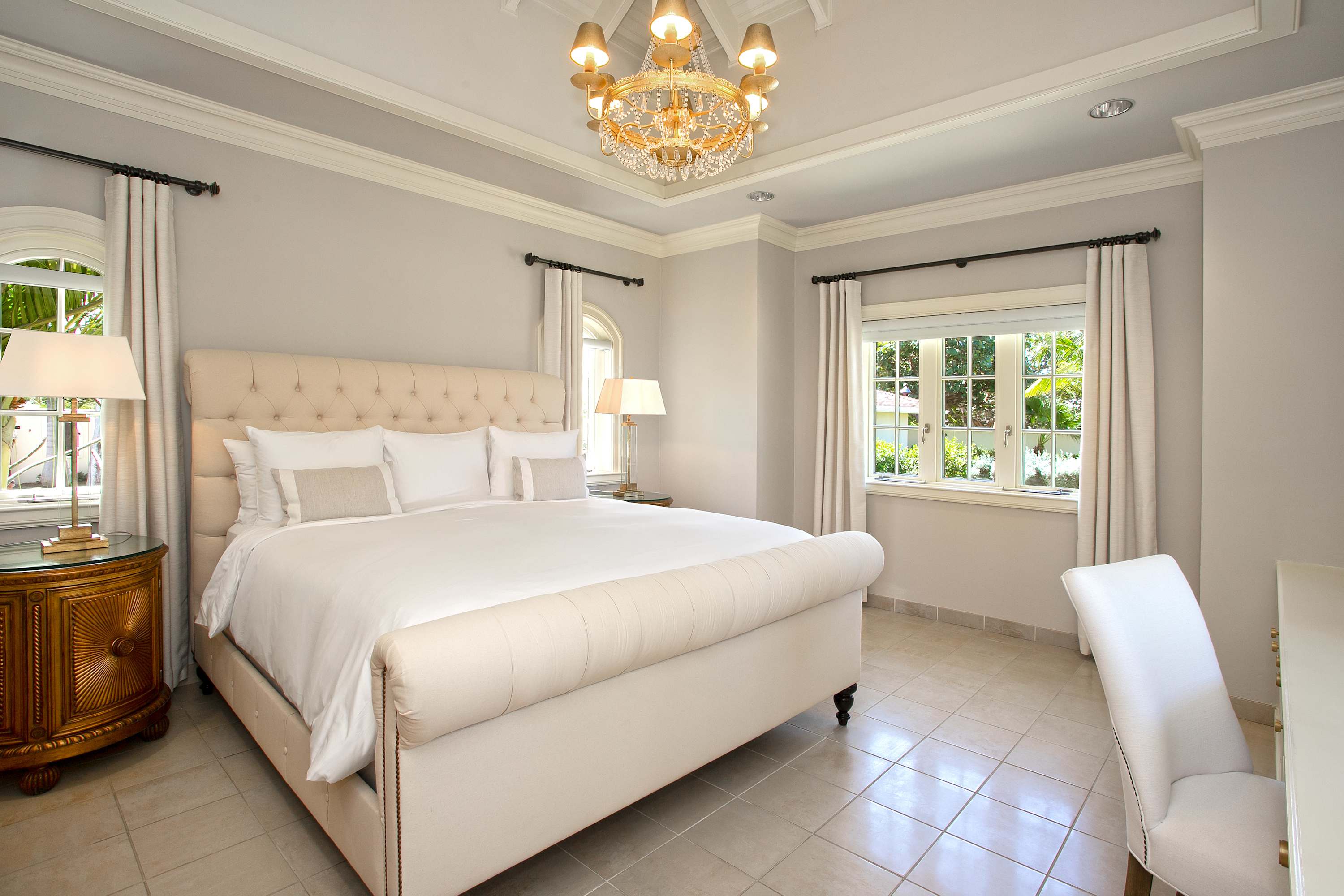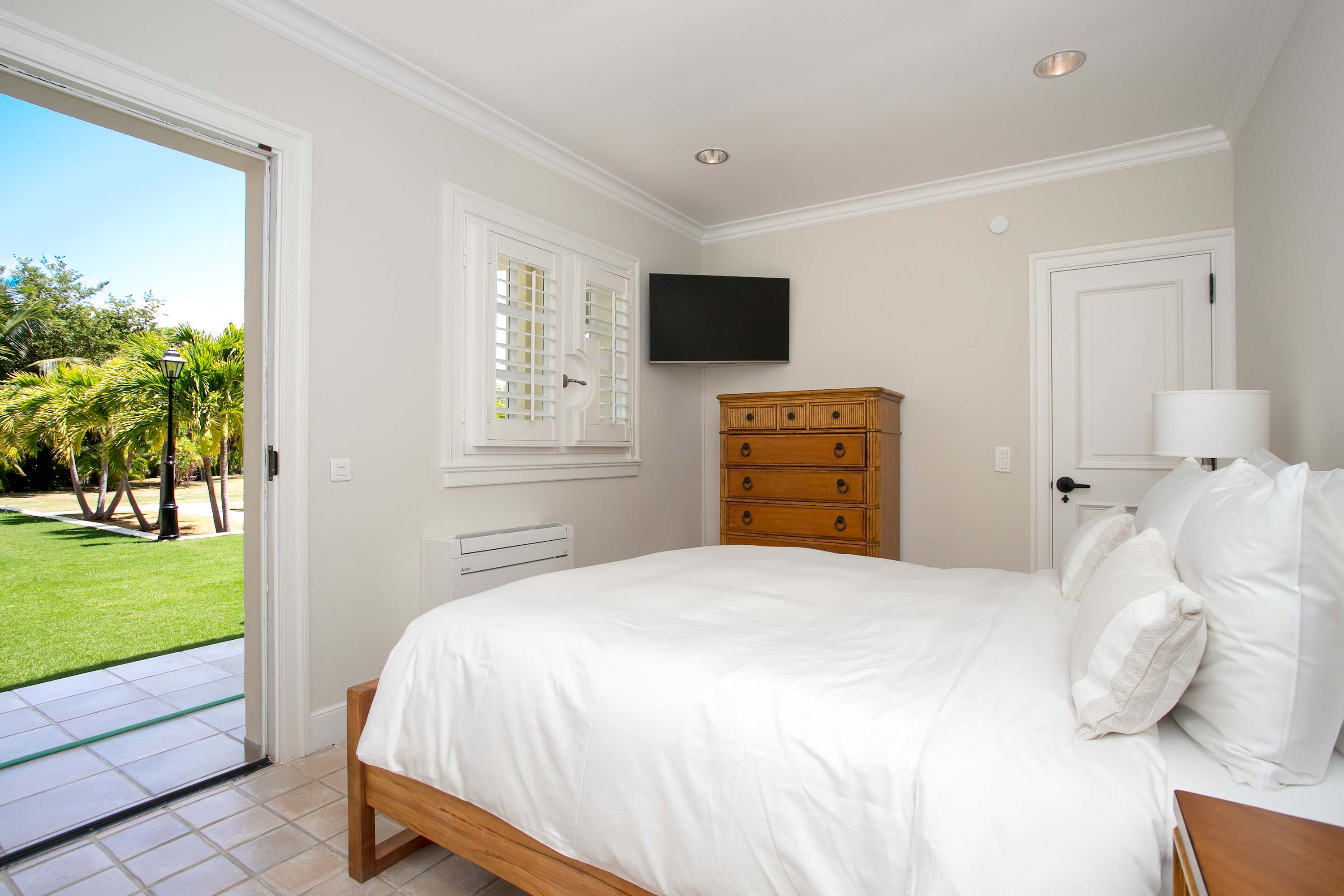 Villa Chateau des Palmiers is a fully staffed beachfront estate on Plum Bay in Terres Basses, St. Martin.Le Chateau des Palmiers is a world-class beachfront estate that includes a 6-bedroom ocean-side villa and a 4-bedroom garden-side villa in Terres Basses, Saint Martin. Situated on the white sand beach at Plum Bay, this fabulous property provides an intimate, relaxed, and attentive environment within the walls of a gated enclave. The many amenities include a huge heated pool, an open-air and air-conditioned fitness center, a tennis court, and a covered outdoor bar, billiards, and dining areas. The oceanside villa features 6 king size bedrooms with full private baths including a two-story master suite with a master bath with a jacuzzi tub and two private balconies facing the pool and ocean. The remaining interior spaces include a fully equipped kitchen, a formal living room, a formal dining room seating 10, and a casual outside dining area and a media room. The 4 bedroom garden side villa features the "Jungle Room” with a king-size bed and small living room, the “Palm Room” with a king-size mahogany bed, and a 2 bedroom suite with queen size beds, a shared living room, and a cozy dining room. There is also a huge commercial catering kitchen. Other amenities include air conditioning in all rooms, an outdoor sound system, and internet access. All bedrooms have independent TV receiver & DVD, the media room and master bedroom have a large satellite dish & DVD. There is an on-site Chef and experienced security staff available along with a state-of-the-art security system. Enjoy the beautiful Caribbean sunsets from this stunning one-of-a-kind Château and experience the vacation of a lifetime.Featured Amenities include Housekeeping 7 days a week, Turn down service, Chef service 3 meals per day, Onsite property manager and assistance, Daily concierge service. In addition to being available for rental, Villa Chateau des Palmiers is listed for sale.