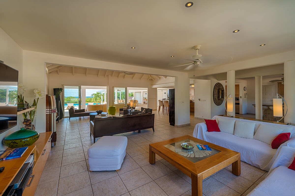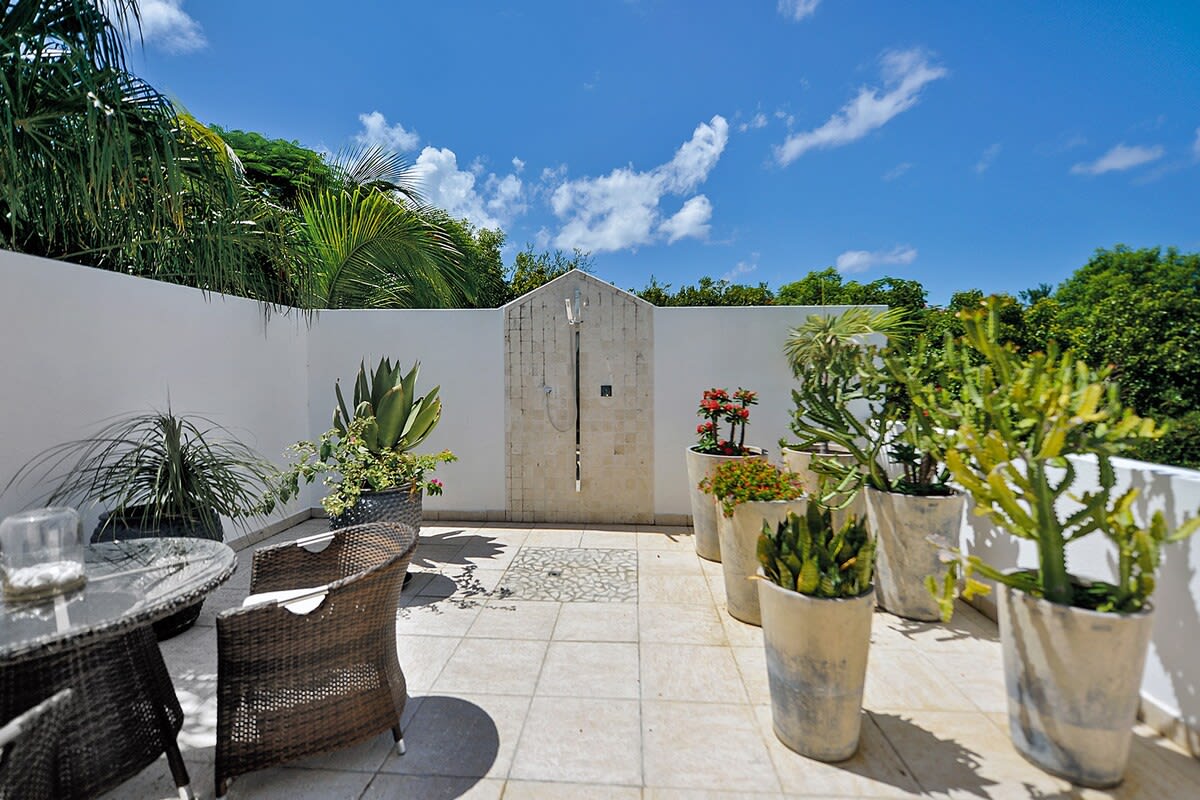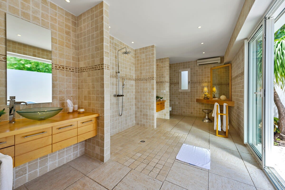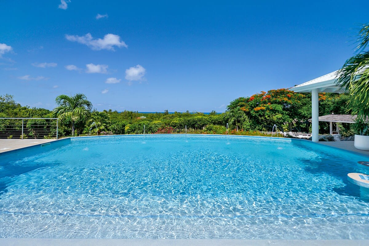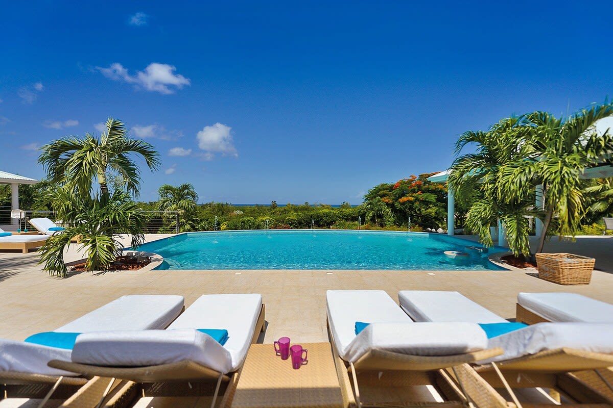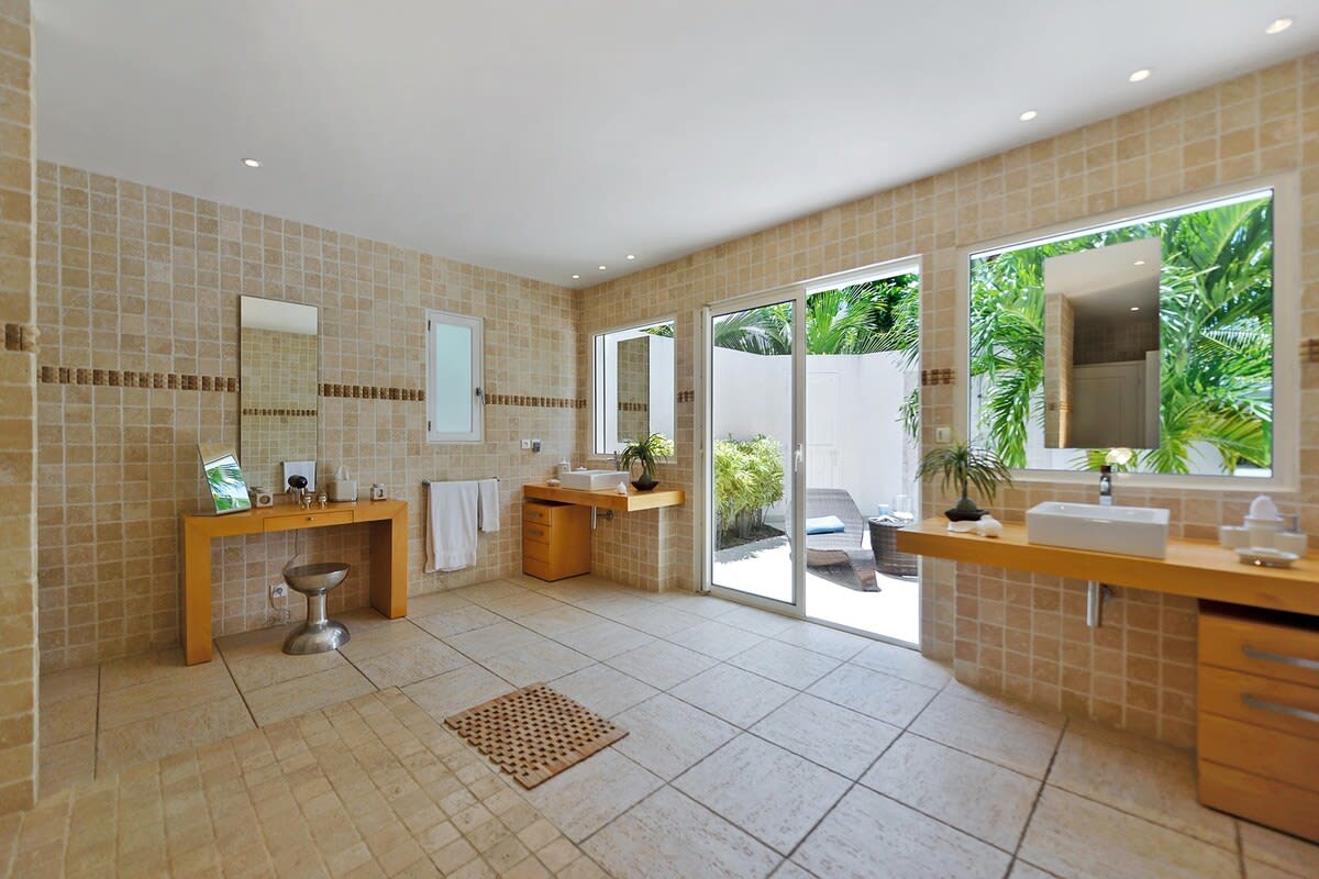 Villa Encore is the perfect place for a tropical getaway with its beautiful garden and pool located in Terres Basses, St. Martin.You arrive at Villa Encore in Terres Basses along a long, inviting drive filled with palms, exotic tropical flowers, trees, and shrubs. Beautiful gardens fill the entry courtyard and completely surround the villa. The Moorish-inspired soaring arched entrance showcases the glimpse of brilliant sapphire blue Caribbean Sea and sky as you enter the cool interiors. The turquoise pool, framed by palms and flamboyant, runs the length of the terrace connecting the villa with the view. Inside the villa, the expansive spaces offer multi areas for relaxing, dining, and cooking. Refined travertine tile floors harmoniously flow throughout. Floor-to-ceiling sliding doors open to the view and the breezes. Villa Encore's spacious, well-equipped kitchen is one of the largest on the island, providing a perfect platform to create inspired gourmet meals. Light woods, granite, and travertine are accented by stainless appliances including two professional-sized refrigerators. Wrap-around countertops provides spacious indoor dining overlooking the chef's preparations and the view. The double living room is divided by color; one side a blend of neutrals and the other blending white plus color. The style mixes contemporary with a touch of exotic. Villa Encore's outdoor spaces take full advantage of the view and the gorgeous gardens. Multiple seating areas are scattered around the terraces providing large outdoor dining and comfortable seating opportunities. A built-in BBQ sits off the lower dining area. Sculpted loungers surround the heated pool. Exotic plantings are embedded in the terrace. Overhead, under the covered areas, Singapore-style fans provide gentle breezes. For an enhanced view, a covered roof terrace creates a poetic perch to view the Caribbean Sea. Villa Encore's five equal size bedrooms connect off the terrace. Each one has an incredible view. The stylish spa-style bathrooms have sea views plus outdoor showers with private seating. It's a beautiful way to connect with tropical nature. The bedroom decor mixes interesting contemporary lines and textures with exotic touches like teak poster beds, interesting art, and tranquil colors. A sixth garden-view bedroom is a recent addition to the property designed and decorated with the same contemporary touches of the original five bedrooms. A nicely equipped gym, with an outdoor shower and sea view, are just off the great room. Villa Encore is private and secluded, yet close to amenities. The fabulous restaurants and food purveyors in Baie Nettle are a few minutes' drive. You are 8 minutes to the French capital of Marigot, with its shops, restaurants, markets, and galleries, and 10 minutes to Princess Juliana International Airport. Grand Case and Philipsburg are 30 minutes away.