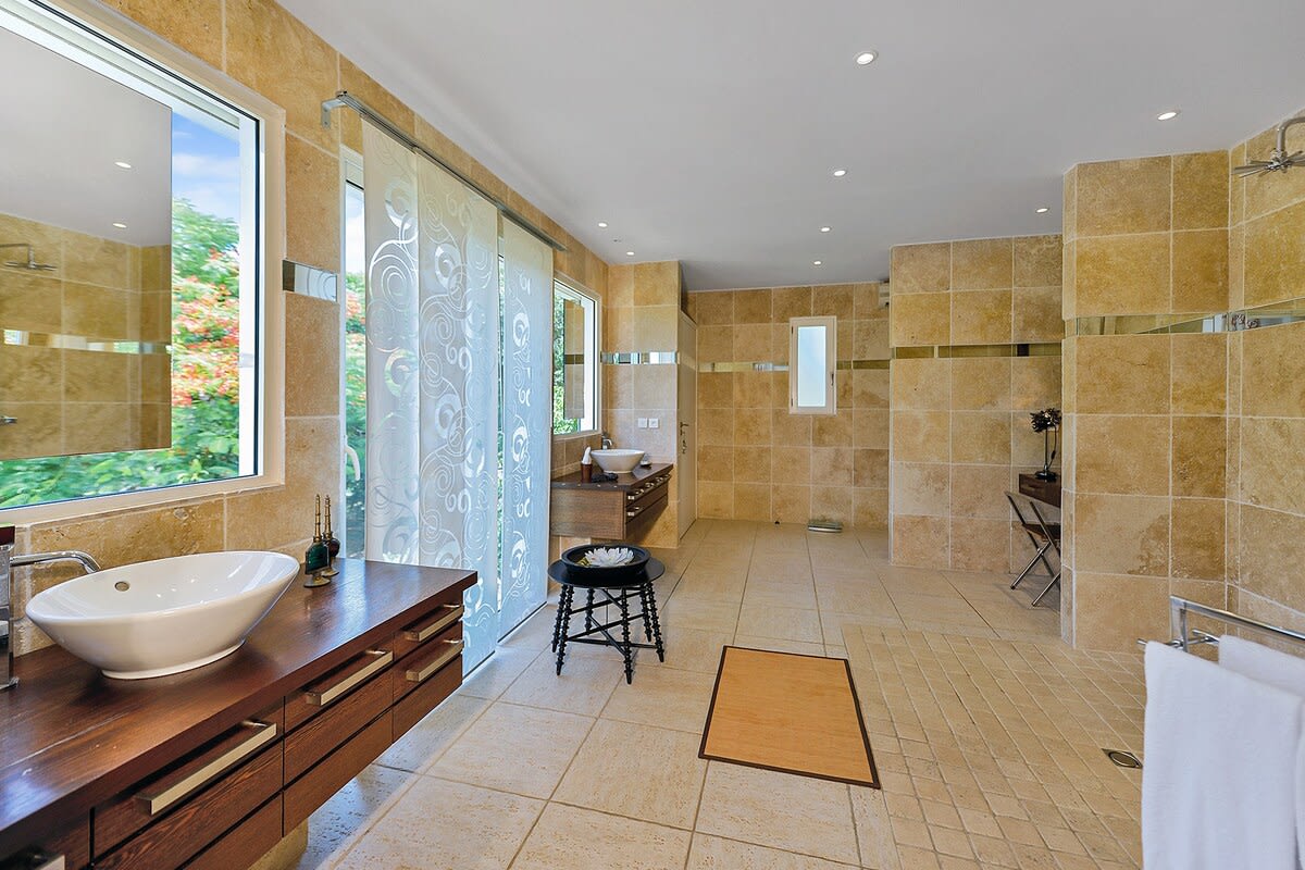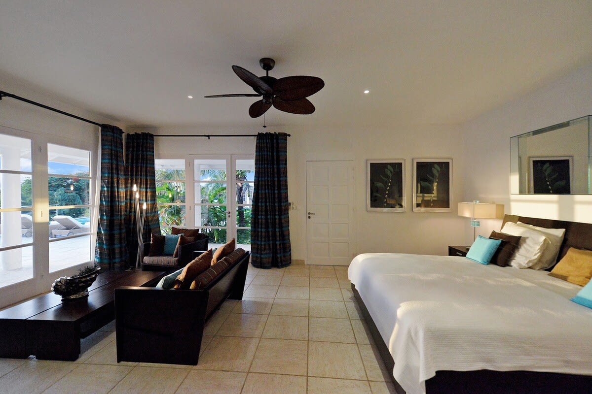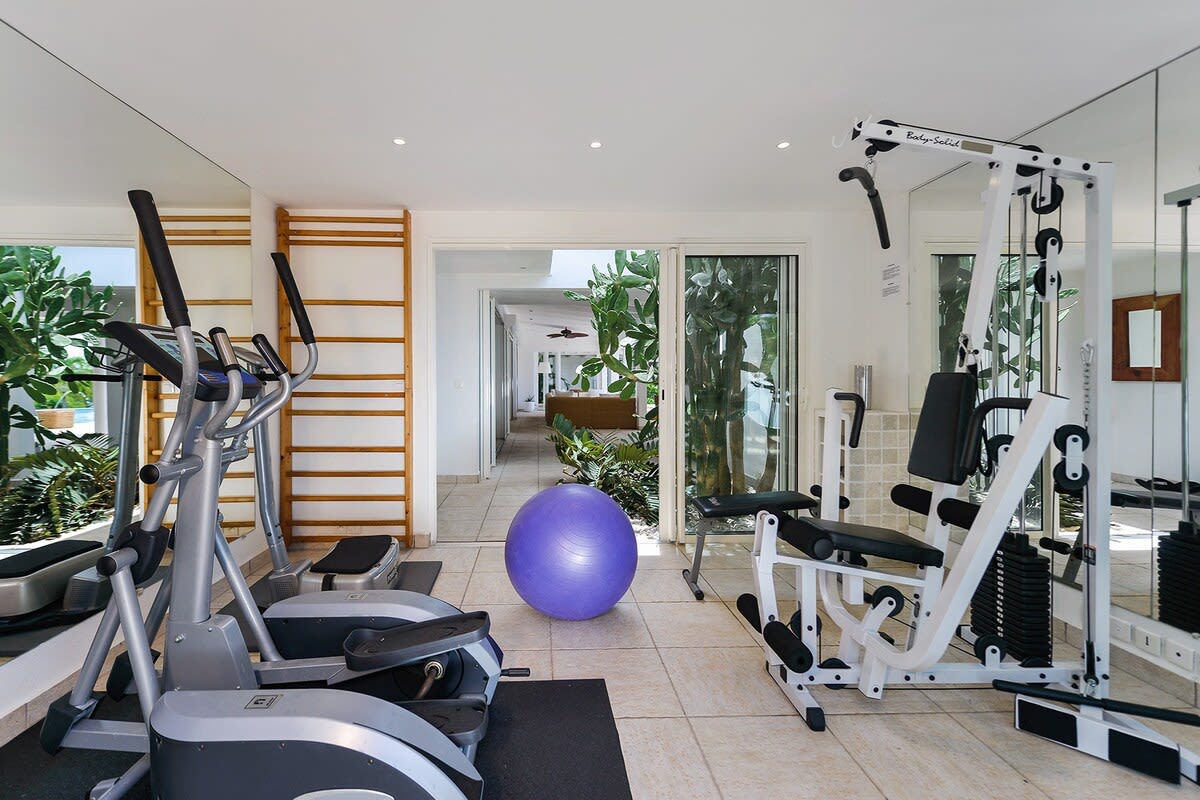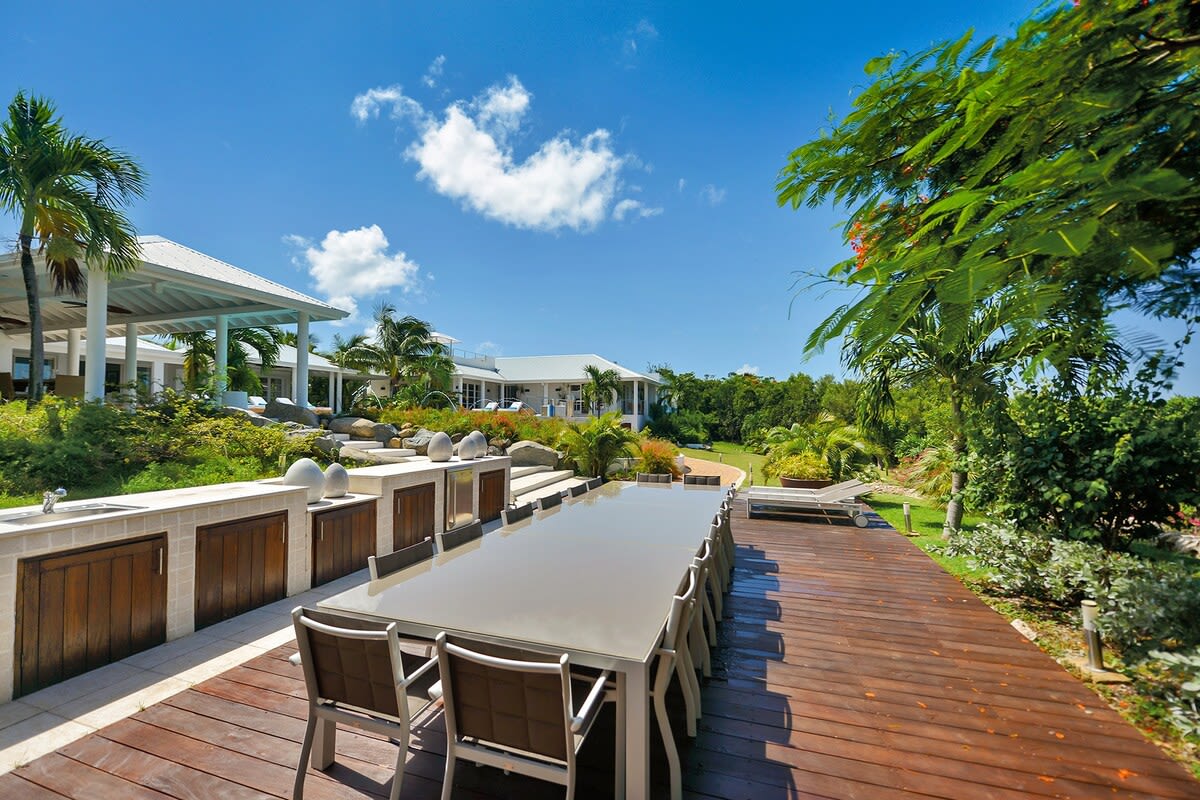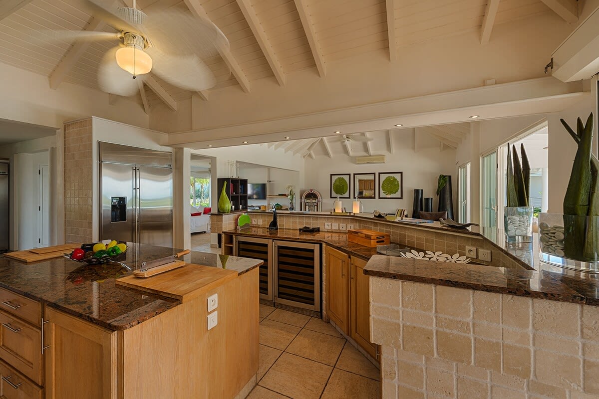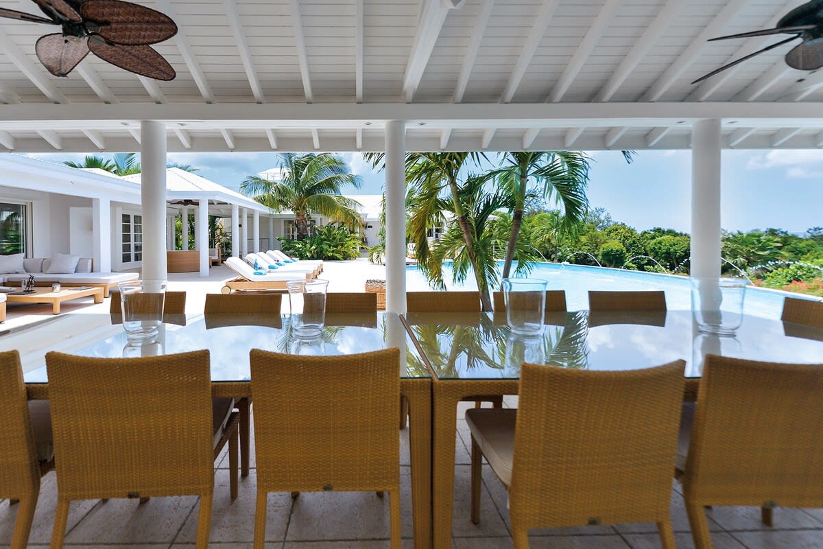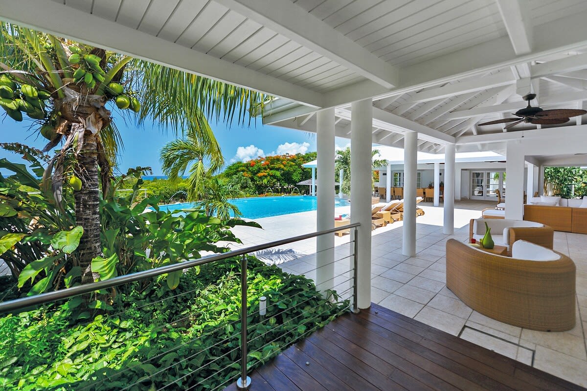 Villa Encore is the perfect place for a tropical getaway with its beautiful garden and pool located in Terres Basses, St. Martin.You arrive at Villa Encore in Terres Basses along a long, inviting drive filled with palms, exotic tropical flowers, trees, and shrubs. Beautiful gardens fill the entry courtyard and completely surround the villa. The Moorish-inspired soaring arched entrance showcases the glimpse of brilliant sapphire blue Caribbean Sea and sky as you enter the cool interiors. The turquoise pool, framed by palms and flamboyant, runs the length of the terrace connecting the villa with the view. Inside the villa, the expansive spaces offer multi areas for relaxing, dining, and cooking. Refined travertine tile floors harmoniously flow throughout. Floor-to-ceiling sliding doors open to the view and the breezes. Villa Encore's spacious, well-equipped kitchen is one of the largest on the island, providing a perfect platform to create inspired gourmet meals. Light woods, granite, and travertine are accented by stainless appliances including two professional-sized refrigerators. Wrap-around countertops provides spacious indoor dining overlooking the chef's preparations and the view. The double living room is divided by color; one side a blend of neutrals and the other blending white plus color. The style mixes contemporary with a touch of exotic. Villa Encore's outdoor spaces take full advantage of the view and the gorgeous gardens. Multiple seating areas are scattered around the terraces providing large outdoor dining and comfortable seating opportunities. A built-in BBQ sits off the lower dining area. Sculpted loungers surround the heated pool. Exotic plantings are embedded in the terrace. Overhead, under the covered areas, Singapore-style fans provide gentle breezes. For an enhanced view, a covered roof terrace creates a poetic perch to view the Caribbean Sea. Villa Encore's five equal size bedrooms connect off the terrace. Each one has an incredible view. The stylish spa-style bathrooms have sea views plus outdoor showers with private seating. It's a beautiful way to connect with tropical nature. The bedroom decor mixes interesting contemporary lines and textures with exotic touches like teak poster beds, interesting art, and tranquil colors. A sixth garden-view bedroom is a recent addition to the property designed and decorated with the same contemporary touches of the original five bedrooms. A nicely equipped gym, with an outdoor shower and sea view, are just off the great room. Villa Encore is private and secluded, yet close to amenities. The fabulous restaurants and food purveyors in Baie Nettle are a few minutes' drive. You are 8 minutes to the French capital of Marigot, with its shops, restaurants, markets, and galleries, and 10 minutes to Princess Juliana International Airport. Grand Case and Philipsburg are 30 minutes away.