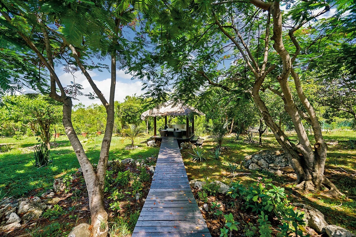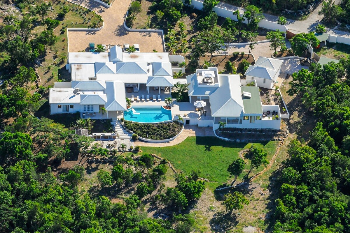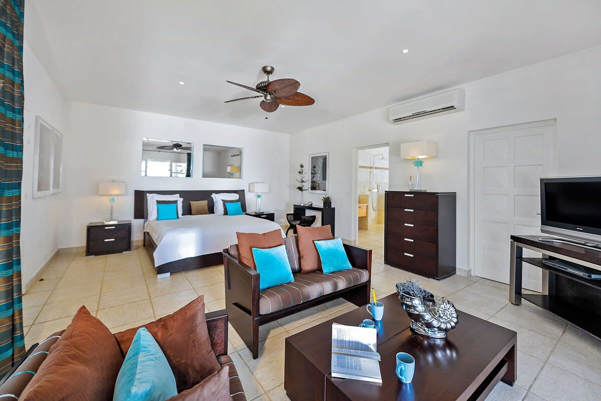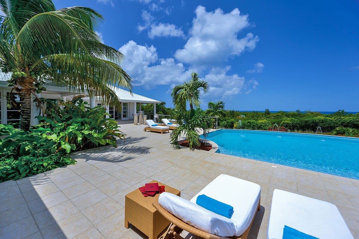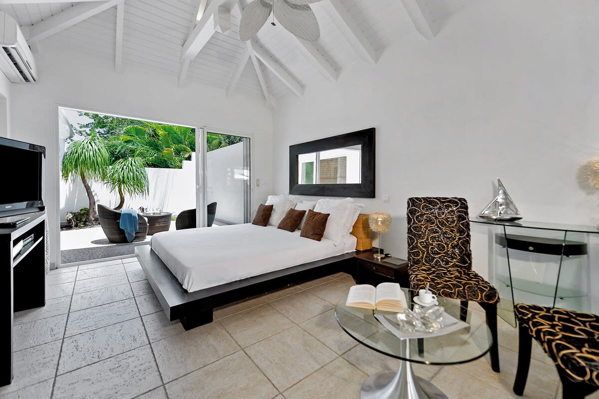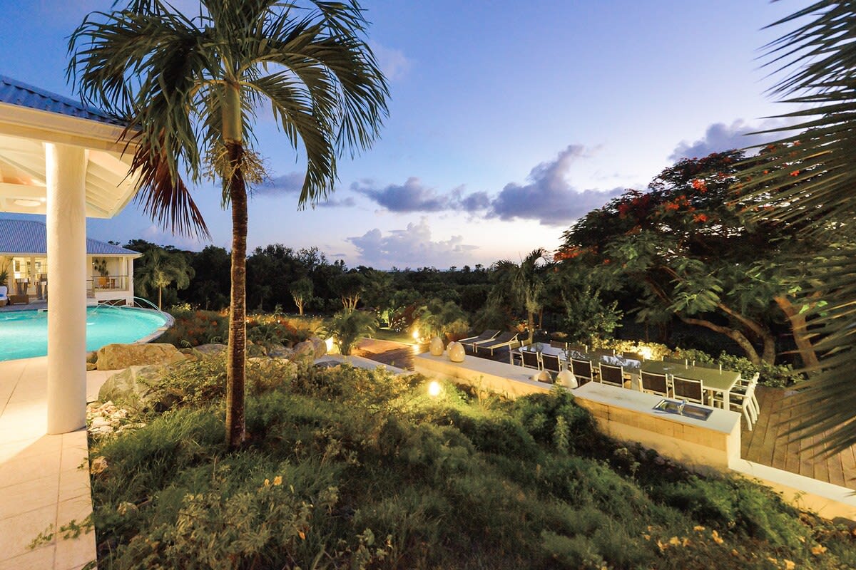 Villa Encore is the perfect place for a tropical getaway with its beautiful garden and pool located in Terres Basses, St. Martin.You arrive at Villa Encore in Terres Basses along a long, inviting drive filled with palms, exotic tropical flowers, trees, and shrubs. Beautiful gardens fill the entry courtyard and completely surround the villa. The Moorish-inspired soaring arched entrance showcases the glimpse of brilliant sapphire blue Caribbean Sea and sky as you enter the cool interiors. The turquoise pool, framed by palms and flamboyant, runs the length of the terrace connecting the villa with the view. Inside the villa, the expansive spaces offer multi areas for relaxing, dining, and cooking. Refined travertine tile floors harmoniously flow throughout. Floor-to-ceiling sliding doors open to the view and the breezes. Villa Encore's spacious, well-equipped kitchen is one of the largest on the island, providing a perfect platform to create inspired gourmet meals. Light woods, granite, and travertine are accented by stainless appliances including two professional-sized refrigerators. Wrap-around countertops provides spacious indoor dining overlooking the chef's preparations and the view. The double living room is divided by color; one side a blend of neutrals and the other blending white plus color. The style mixes contemporary with a touch of exotic. Villa Encore's outdoor spaces take full advantage of the view and the gorgeous gardens. Multiple seating areas are scattered around the terraces providing large outdoor dining and comfortable seating opportunities. A built-in BBQ sits off the lower dining area. Sculpted loungers surround the heated pool. Exotic plantings are embedded in the terrace. Overhead, under the covered areas, Singapore-style fans provide gentle breezes. For an enhanced view, a covered roof terrace creates a poetic perch to view the Caribbean Sea. Villa Encore's five equal size bedrooms connect off the terrace. Each one has an incredible view. The stylish spa-style bathrooms have sea views plus outdoor showers with private seating. It's a beautiful way to connect with tropical nature. The bedroom decor mixes interesting contemporary lines and textures with exotic touches like teak poster beds, interesting art, and tranquil colors. A sixth garden-view bedroom is a recent addition to the property designed and decorated with the same contemporary touches of the original five bedrooms. A nicely equipped gym, with an outdoor shower and sea view, are just off the great room. Villa Encore is private and secluded, yet close to amenities. The fabulous restaurants and food purveyors in Baie Nettle are a few minutes' drive. You are 8 minutes to the French capital of Marigot, with its shops, restaurants, markets, and galleries, and 10 minutes to Princess Juliana International Airport. Grand Case and Philipsburg are 30 minutes away.