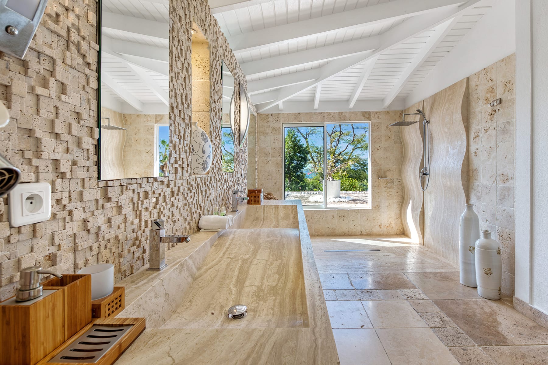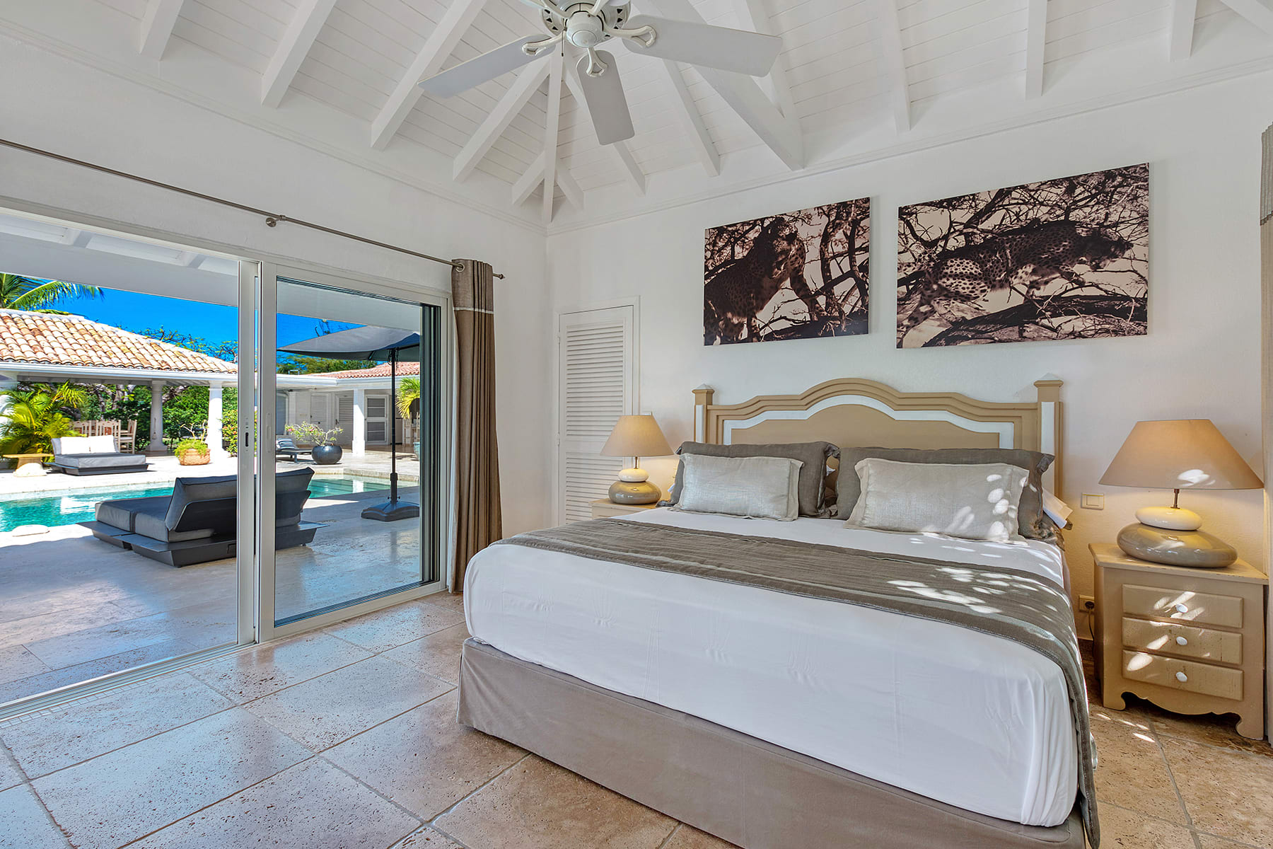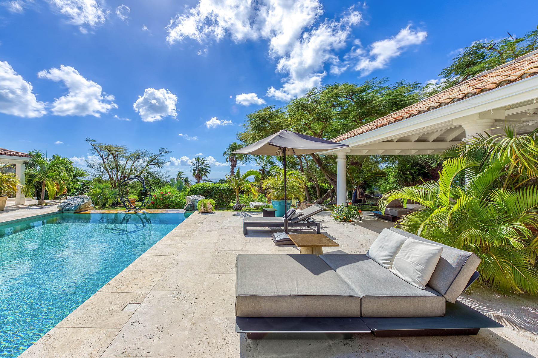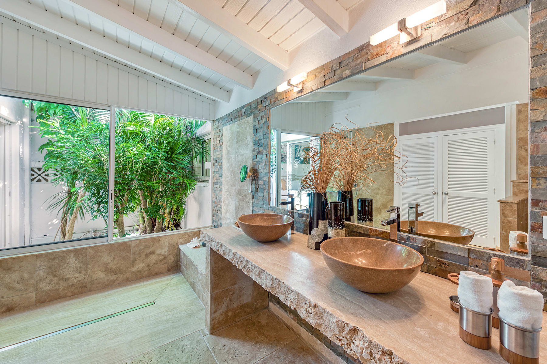 Villa La Pinta has tropical features with a tennis court and ocean view in Terres Basses, St. Martin.Down the long driveway lined with coral stone walls and flamboyant, you arrive in the courtyard of the elegant Creole style Villa La Pinta. It is a quiet, private oasis that sets the stage for relaxing outdoor living and a lush tropical view that begins the moment you enter the villa. The large turquoise pool, accented with a visually pleasing sculpture, draws your eye straight to the stately palms and beyond to the cerulean sea. There is a beautiful flow to the house; an almost seamless connection inside to outside. Although very open, it is private. Large covered galleries create multiple options for dining, lounging, and sunning. It also creates a cool space for firing up the barbeque. Sleek, yet comfortable, new loungers surround the pool. The decor is serene and tasteful, both inside and outside. Villa La Pinta's open plan interior living area contains comfortable oversized seating and inside dining. Adjacent to the main living area is the well-equipped, modern kitchen in sleek white, steel, and black. All the interior living spaces open to the terrace and the view. The decor is eclectic, contemporary, and relaxed in white, beige, and taupe accented with driftwood and dark woods. Beautiful paintings, sculptures, and exotic African art add a very distinctive designer touch to the space. Four bedrooms are set off the pool terrace. The decor is in the mood of a luxe boutique hotel; elegant and serene, each room in a different, yet connective, rich neutral color palette; taupe, cream, charcoal, driftwood, and metallic. The en suite bathrooms are works of art with travertine tiles, dark stone, marble countertops, sculpted sinks, and beautiful fixtures. Several bathrooms overlook the gardens; one overlooks the sea. For larger gatherings, the sister villa, La Nina, shares the same lot and provides an additional two bedrooms. The two also share a tennis court and gym. Although secluded, you are close to amenities. It's a short drive to two of St. Martin's best beaches - Plum Bay and Baie Longue. Villa La Pinta is located just ten minutes from Princess Juliana International Airport (SXM). Baie Nettle's new restaurants are 5 minutes away and a further 5 minutes you reach the charming French capital of Marigot with shops and galleries, historic buildings, and the Creole Market. Drive 25 minutes to Grand Case and Philipsburg's shopping haven.