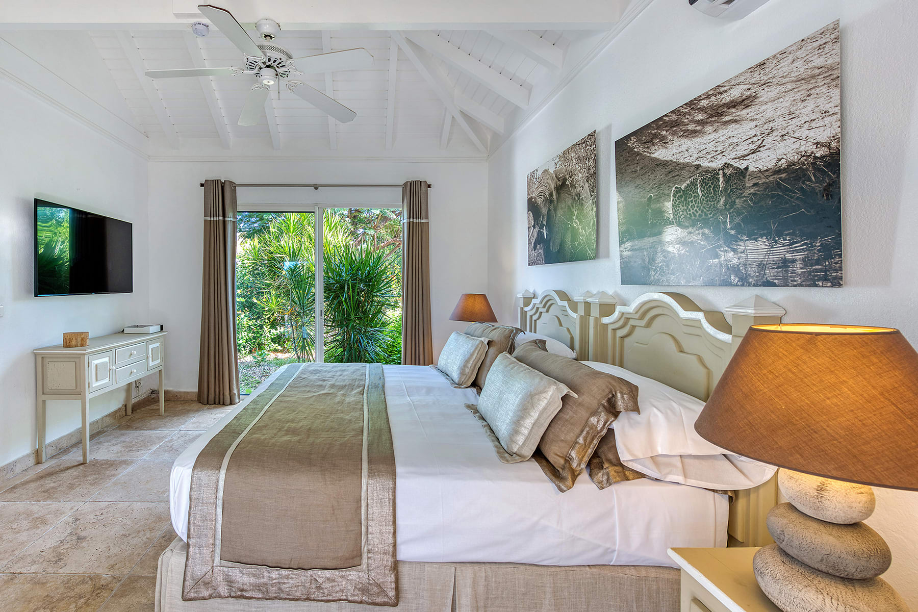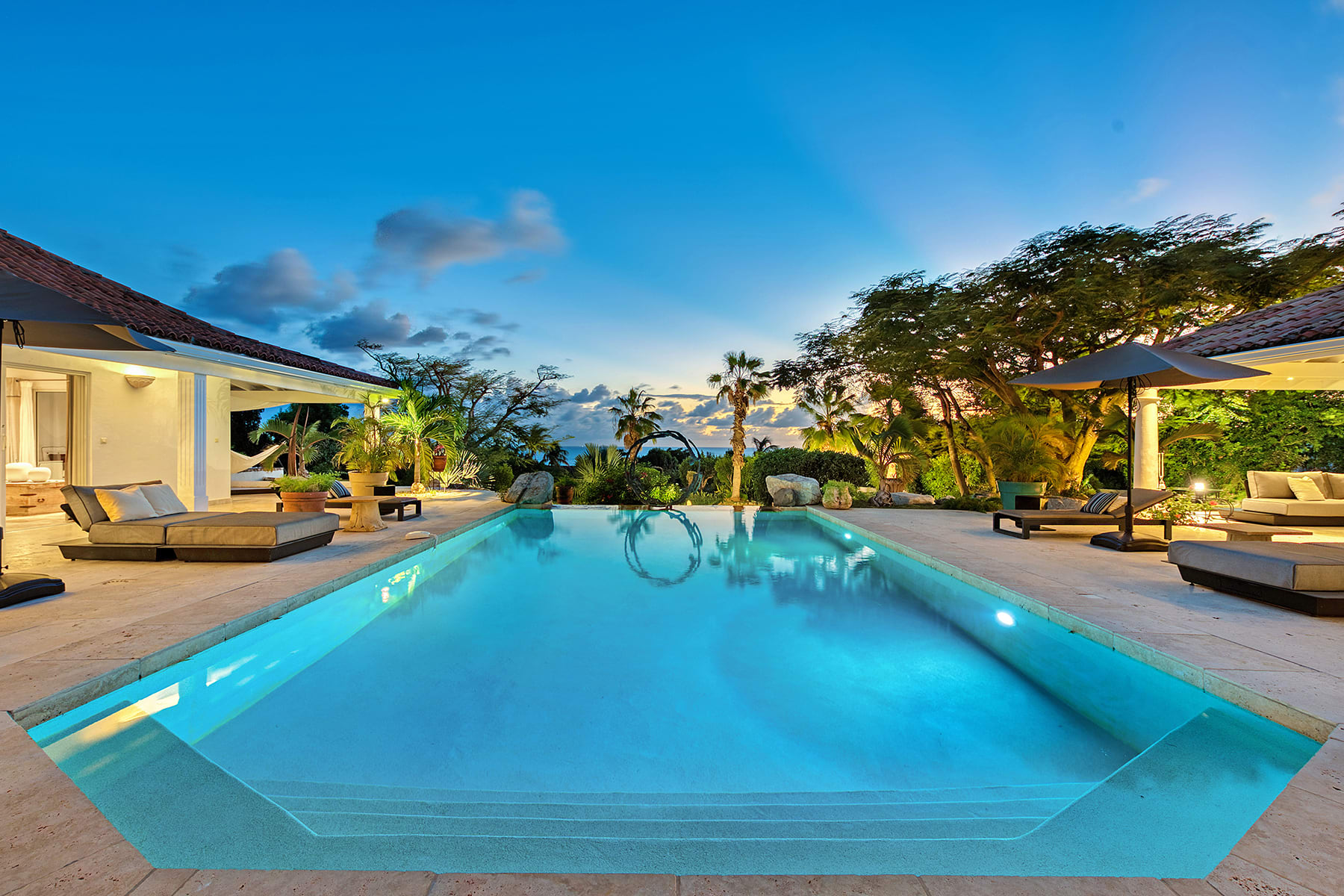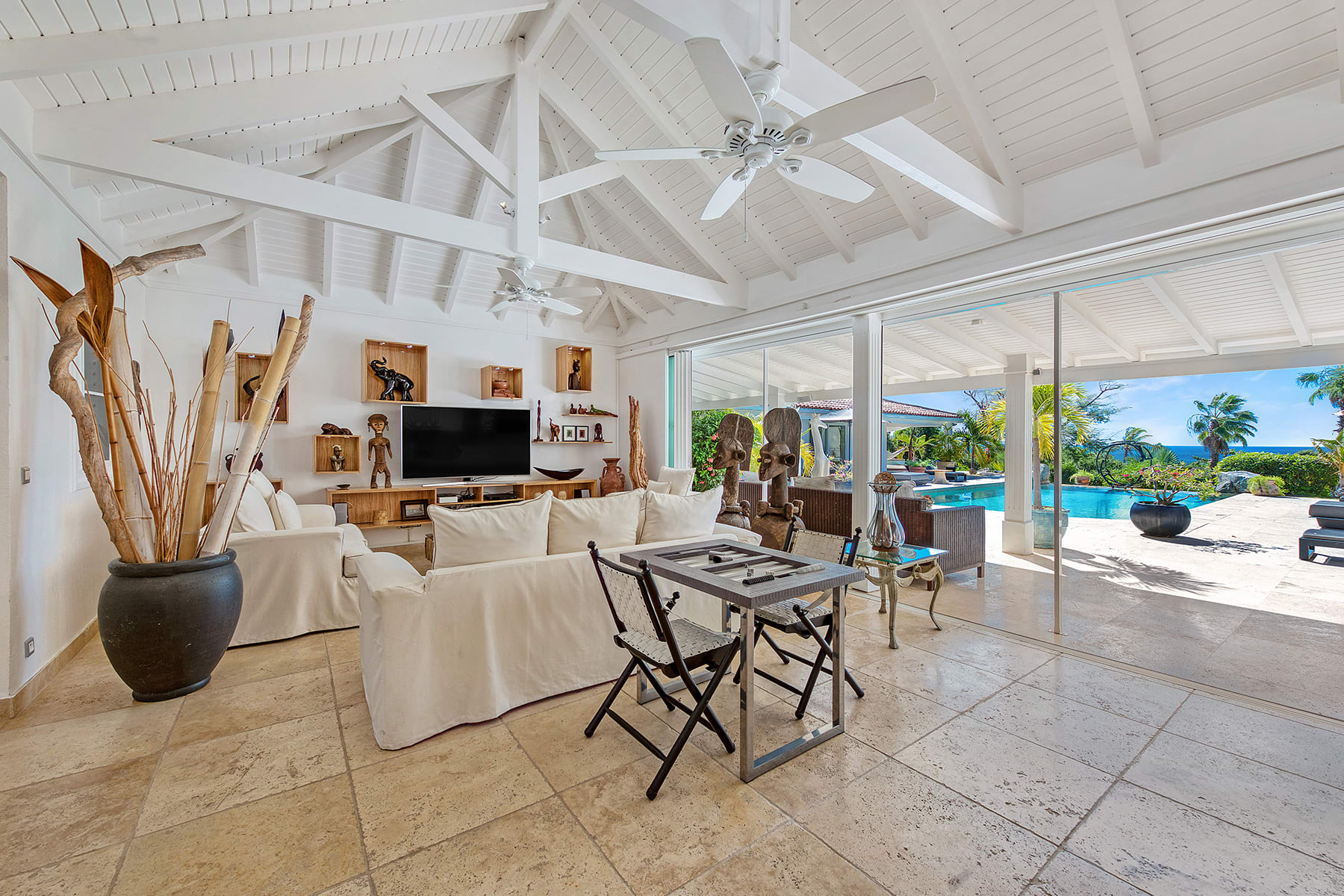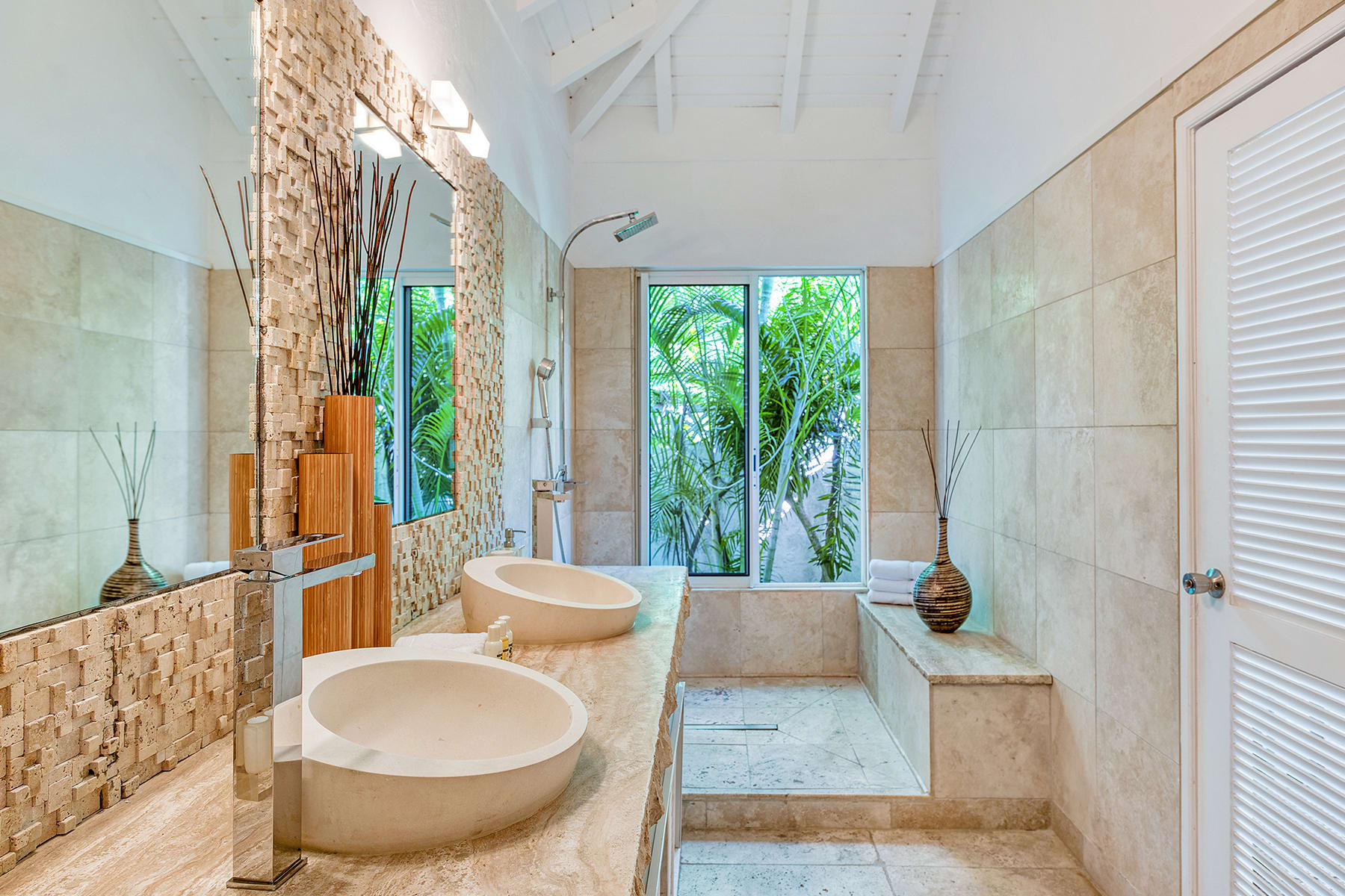 Villa La Pinta has tropical features with a tennis court and ocean view in Terres Basses, St. Martin.Down the long driveway lined with coral stone walls and flamboyant, you arrive in the courtyard of the elegant Creole style Villa La Pinta. It is a quiet, private oasis that sets the stage for relaxing outdoor living and a lush tropical view that begins the moment you enter the villa. The large turquoise pool, accented with a visually pleasing sculpture, draws your eye straight to the stately palms and beyond to the cerulean sea. There is a beautiful flow to the house; an almost seamless connection inside to outside. Although very open, it is private. Large covered galleries create multiple options for dining, lounging, and sunning. It also creates a cool space for firing up the barbeque. Sleek, yet comfortable, new loungers surround the pool. The decor is serene and tasteful, both inside and outside. Villa La Pinta's open plan interior living area contains comfortable oversized seating and inside dining. Adjacent to the main living area is the well-equipped, modern kitchen in sleek white, steel, and black. All the interior living spaces open to the terrace and the view. The decor is eclectic, contemporary, and relaxed in white, beige, and taupe accented with driftwood and dark woods. Beautiful paintings, sculptures, and exotic African art add a very distinctive designer touch to the space. Four bedrooms are set off the pool terrace. The decor is in the mood of a luxe boutique hotel; elegant and serene, each room in a different, yet connective, rich neutral color palette; taupe, cream, charcoal, driftwood, and metallic. The en suite bathrooms are works of art with travertine tiles, dark stone, marble countertops, sculpted sinks, and beautiful fixtures. Several bathrooms overlook the gardens; one overlooks the sea. For larger gatherings, the sister villa, La Nina, shares the same lot and provides an additional two bedrooms. The two also share a tennis court and gym. Although secluded, you are close to amenities. It's a short drive to two of St. Martin's best beaches - Plum Bay and Baie Longue. Villa La Pinta is located just ten minutes from Princess Juliana International Airport (SXM). Baie Nettle's new restaurants are 5 minutes away and a further 5 minutes you reach the charming French capital of Marigot with shops and galleries, historic buildings, and the Creole Market. Drive 25 minutes to Grand Case and Philipsburg's shopping haven.