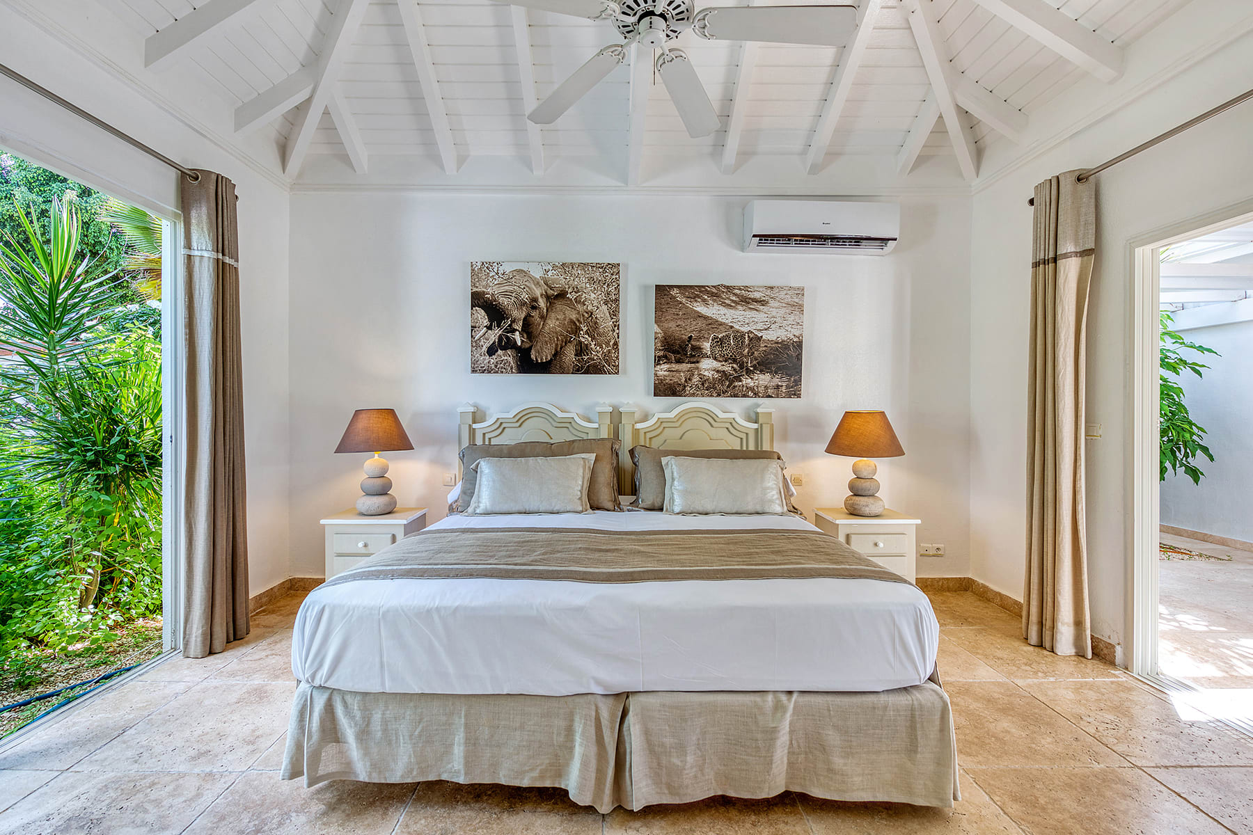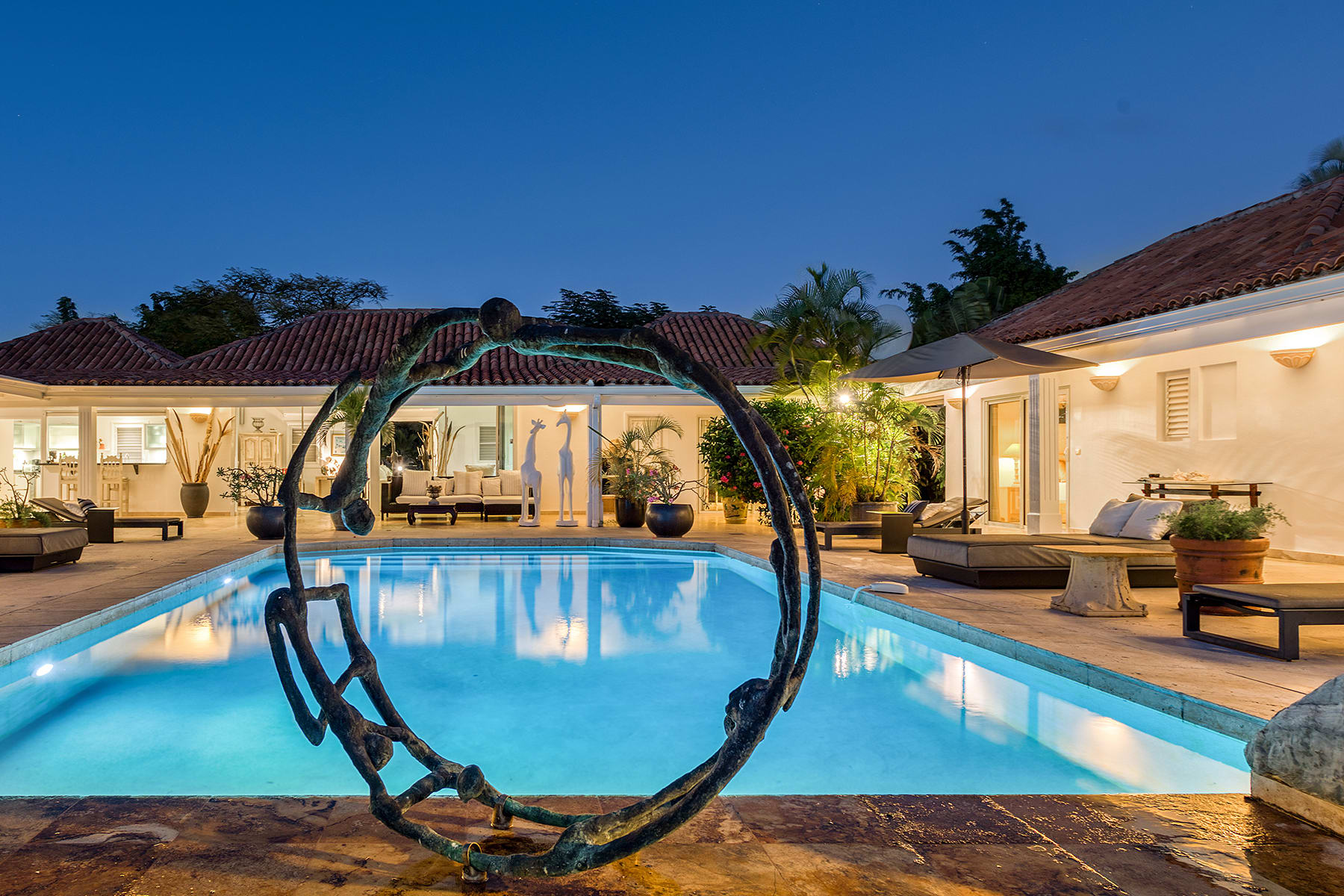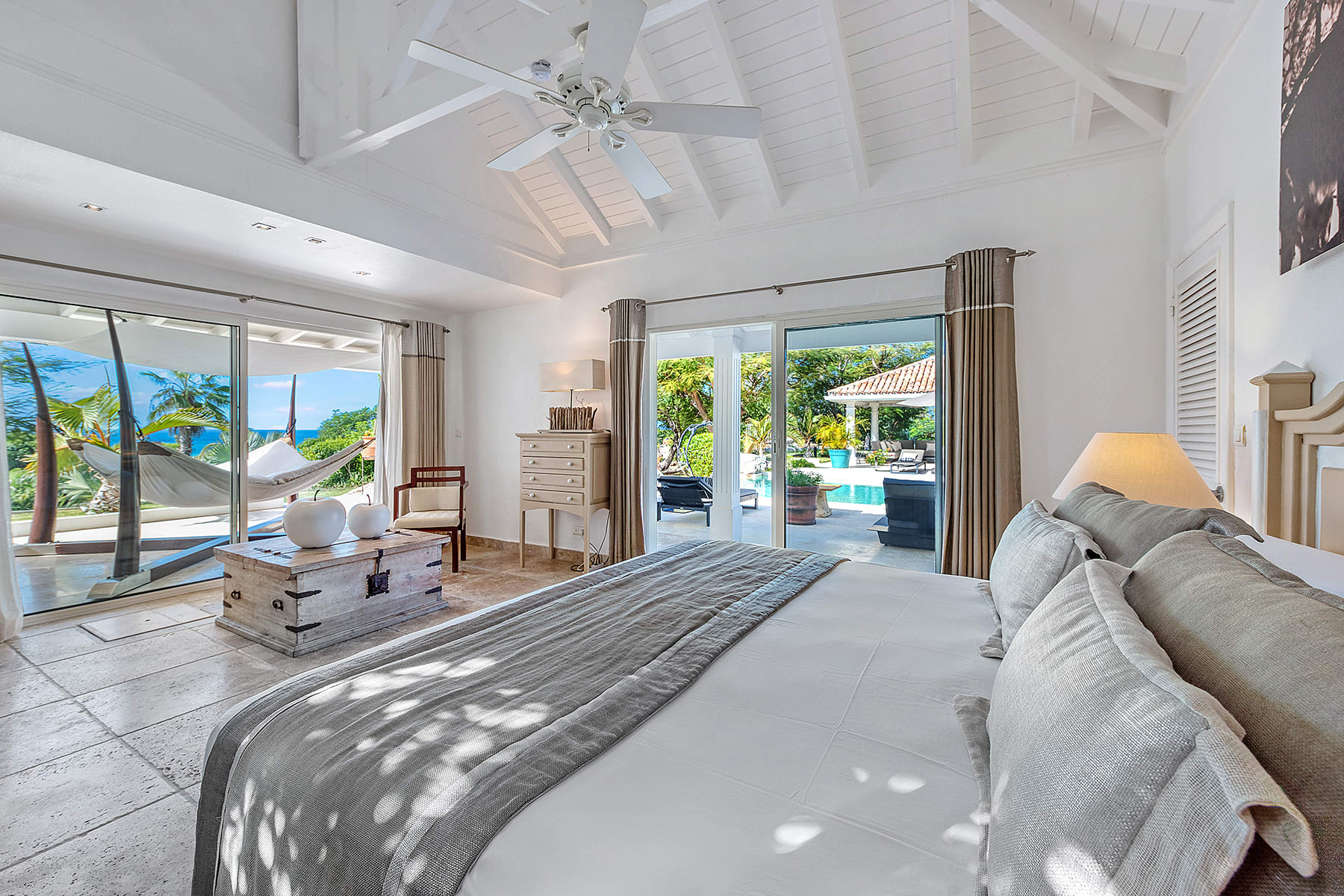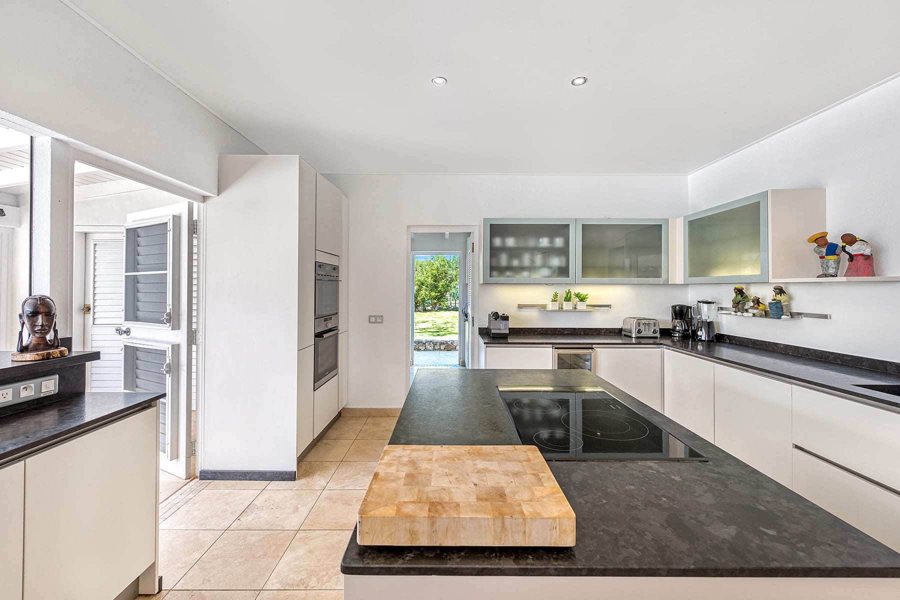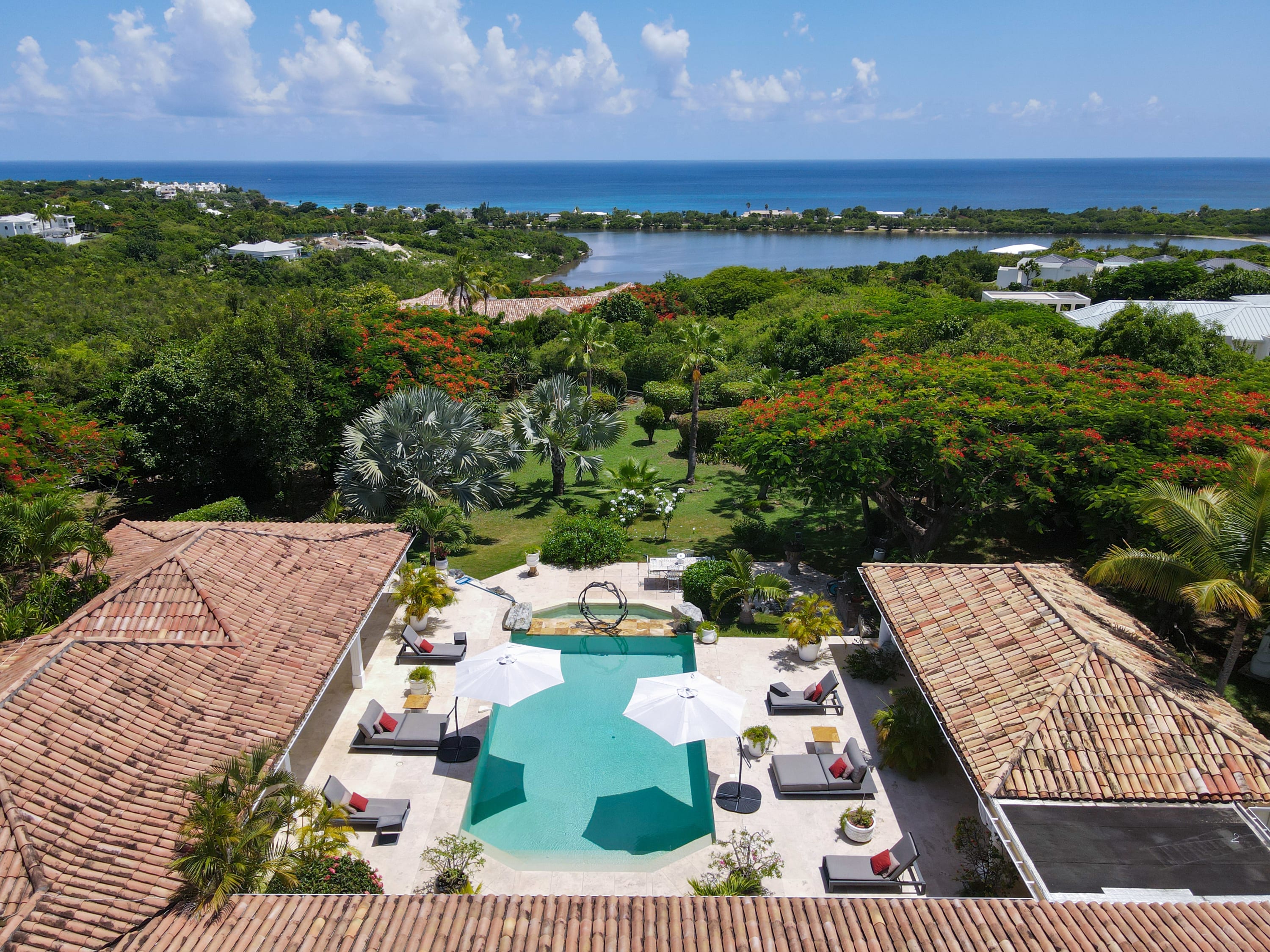 Villa La Pinta has tropical features with a tennis court and ocean view in Terres Basses, St. Martin.Down the long driveway lined with coral stone walls and flamboyant, you arrive in the courtyard of the elegant Creole style Villa La Pinta. It is a quiet, private oasis that sets the stage for relaxing outdoor living and a lush tropical view that begins the moment you enter the villa. The large turquoise pool, accented with a visually pleasing sculpture, draws your eye straight to the stately palms and beyond to the cerulean sea. There is a beautiful flow to the house; an almost seamless connection inside to outside. Although very open, it is private. Large covered galleries create multiple options for dining, lounging, and sunning. It also creates a cool space for firing up the barbeque. Sleek, yet comfortable, new loungers surround the pool. The decor is serene and tasteful, both inside and outside. Villa La Pinta's open plan interior living area contains comfortable oversized seating and inside dining. Adjacent to the main living area is the well-equipped, modern kitchen in sleek white, steel, and black. All the interior living spaces open to the terrace and the view. The decor is eclectic, contemporary, and relaxed in white, beige, and taupe accented with driftwood and dark woods. Beautiful paintings, sculptures, and exotic African art add a very distinctive designer touch to the space. Four bedrooms are set off the pool terrace. The decor is in the mood of a luxe boutique hotel; elegant and serene, each room in a different, yet connective, rich neutral color palette; taupe, cream, charcoal, driftwood, and metallic. The en suite bathrooms are works of art with travertine tiles, dark stone, marble countertops, sculpted sinks, and beautiful fixtures. Several bathrooms overlook the gardens; one overlooks the sea. For larger gatherings, the sister villa, La Nina, shares the same lot and provides an additional two bedrooms. The two also share a tennis court and gym. Although secluded, you are close to amenities. It's a short drive to two of St. Martin's best beaches - Plum Bay and Baie Longue. Villa La Pinta is located just ten minutes from Princess Juliana International Airport (SXM). Baie Nettle's new restaurants are 5 minutes away and a further 5 minutes you reach the charming French capital of Marigot with shops and galleries, historic buildings, and the Creole Market. Drive 25 minutes to Grand Case and Philipsburg's shopping haven.