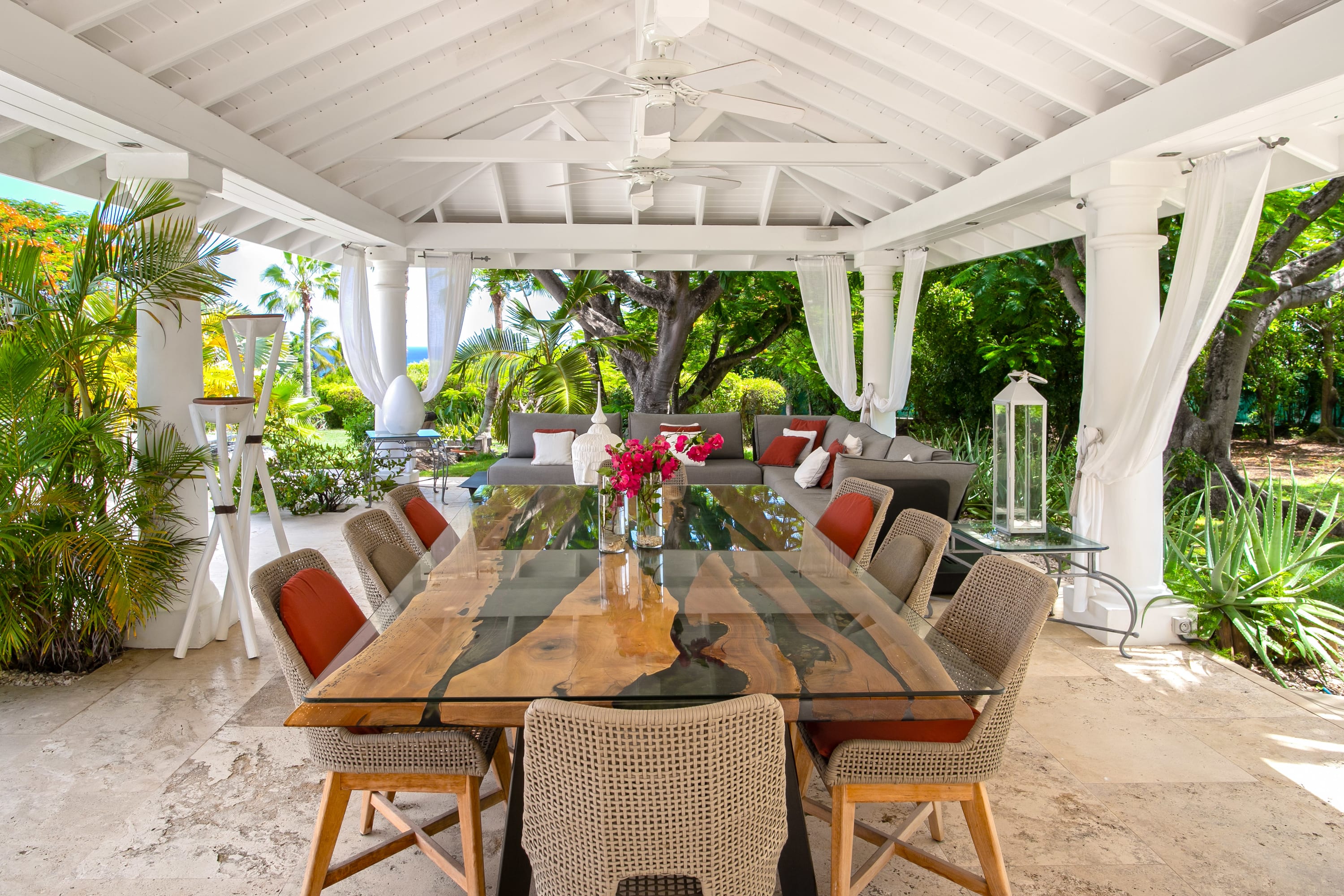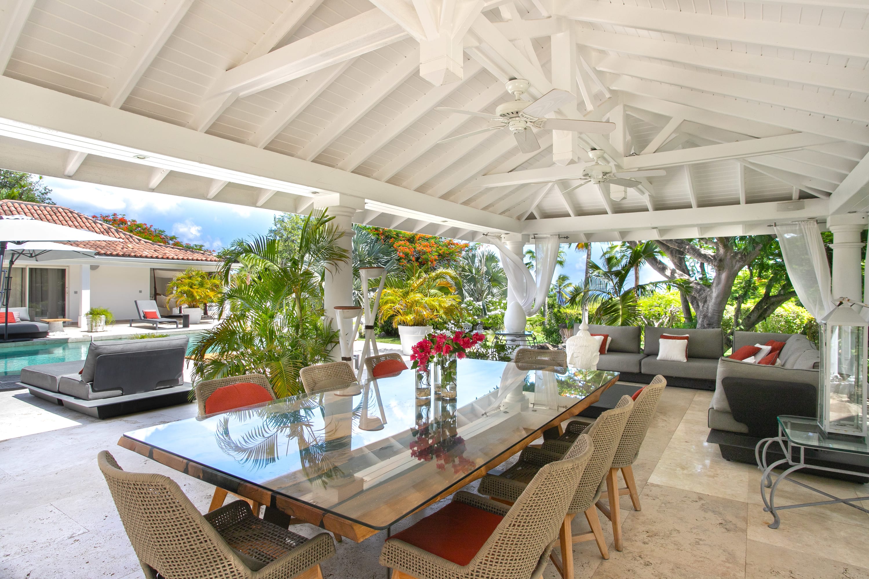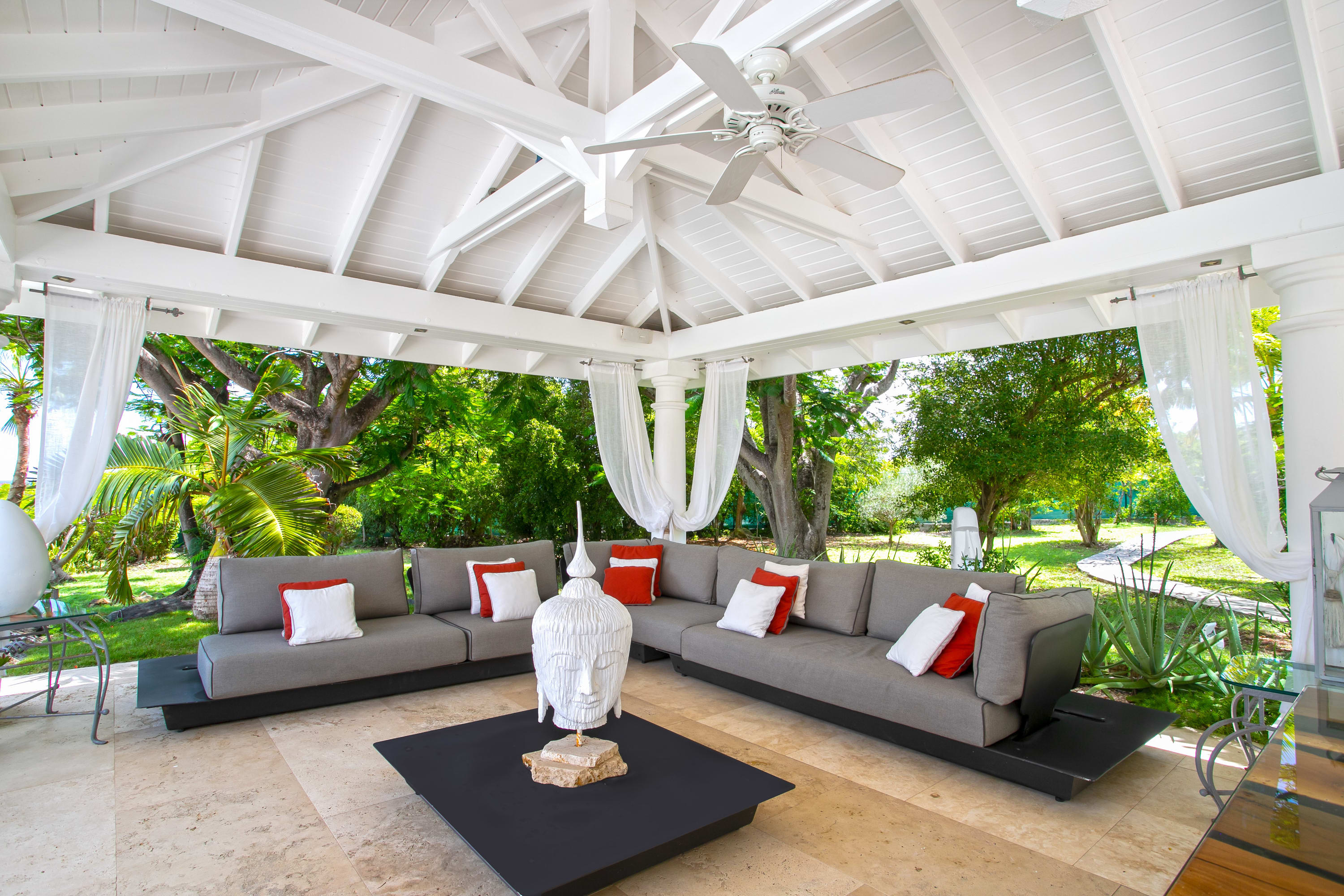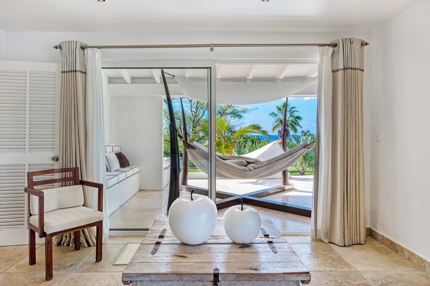 Villa La Pinta has tropical features with a tennis court and ocean view in Terres Basses, St. Martin.Down the long driveway lined with coral stone walls and flamboyant, you arrive in the courtyard of the elegant Creole style Villa La Pinta. It is a quiet, private oasis that sets the stage for relaxing outdoor living and a lush tropical view that begins the moment you enter the villa. The large turquoise pool, accented with a visually pleasing sculpture, draws your eye straight to the stately palms and beyond to the cerulean sea. There is a beautiful flow to the house; an almost seamless connection inside to outside. Although very open, it is private. Large covered galleries create multiple options for dining, lounging, and sunning. It also creates a cool space for firing up the barbeque. Sleek, yet comfortable, new loungers surround the pool. The decor is serene and tasteful, both inside and outside. Villa La Pinta's open plan interior living area contains comfortable oversized seating and inside dining. Adjacent to the main living area is the well-equipped, modern kitchen in sleek white, steel, and black. All the interior living spaces open to the terrace and the view. The decor is eclectic, contemporary, and relaxed in white, beige, and taupe accented with driftwood and dark woods. Beautiful paintings, sculptures, and exotic African art add a very distinctive designer touch to the space. Four bedrooms are set off the pool terrace. The decor is in the mood of a luxe boutique hotel; elegant and serene, each room in a different, yet connective, rich neutral color palette; taupe, cream, charcoal, driftwood, and metallic. The en suite bathrooms are works of art with travertine tiles, dark stone, marble countertops, sculpted sinks, and beautiful fixtures. Several bathrooms overlook the gardens; one overlooks the sea. For larger gatherings, the sister villa, La Nina, shares the same lot and provides an additional two bedrooms. The two also share a tennis court and gym. Although secluded, you are close to amenities. It's a short drive to two of St. Martin's best beaches - Plum Bay and Baie Longue. Villa La Pinta is located just ten minutes from Princess Juliana International Airport (SXM). Baie Nettle's new restaurants are 5 minutes away and a further 5 minutes you reach the charming French capital of Marigot with shops and galleries, historic buildings, and the Creole Market. Drive 25 minutes to Grand Case and Philipsburg's shopping haven.