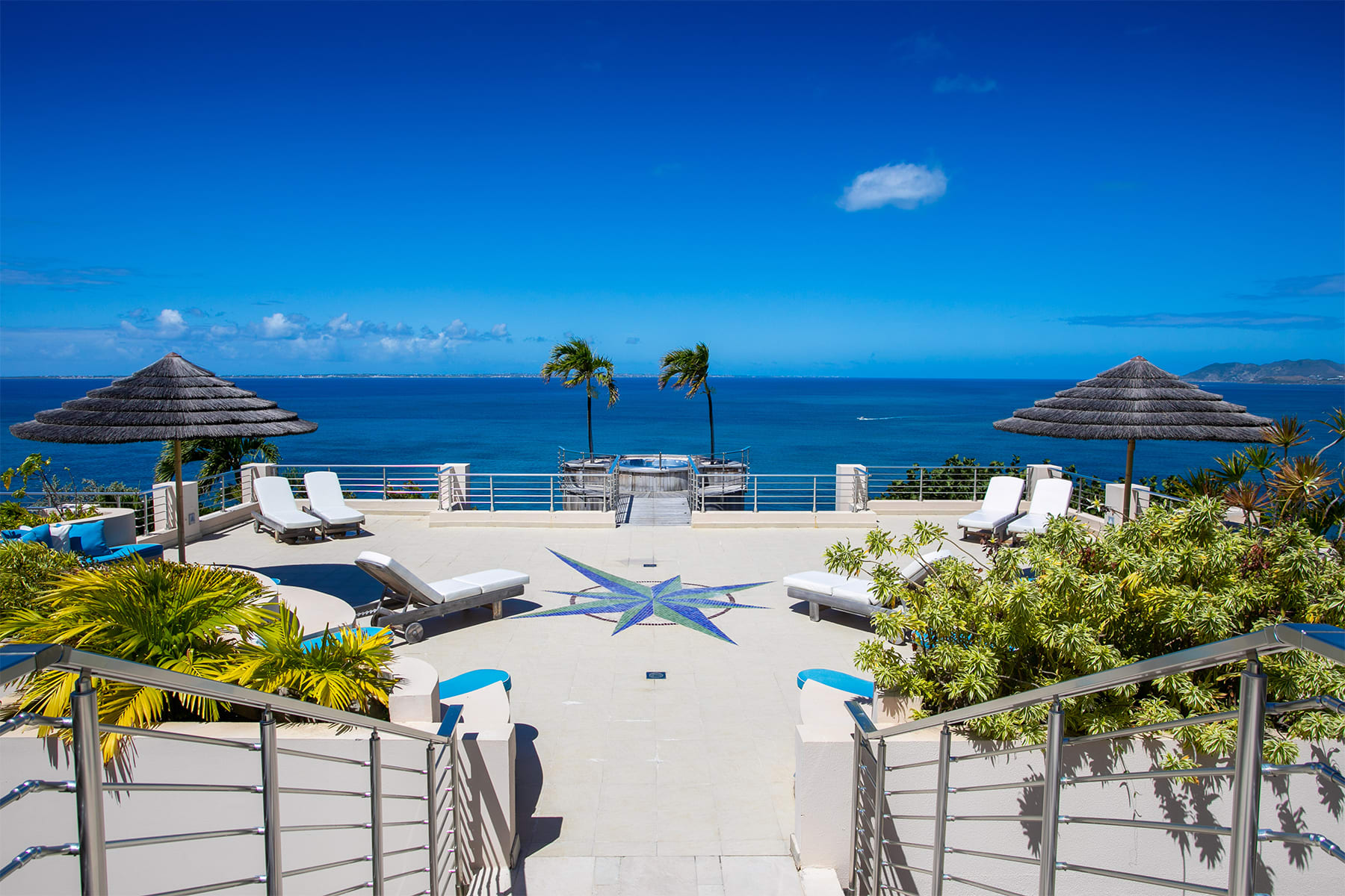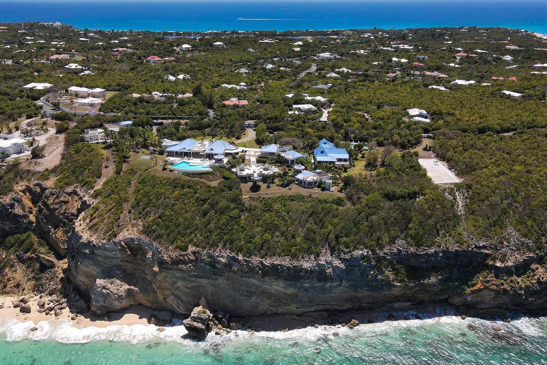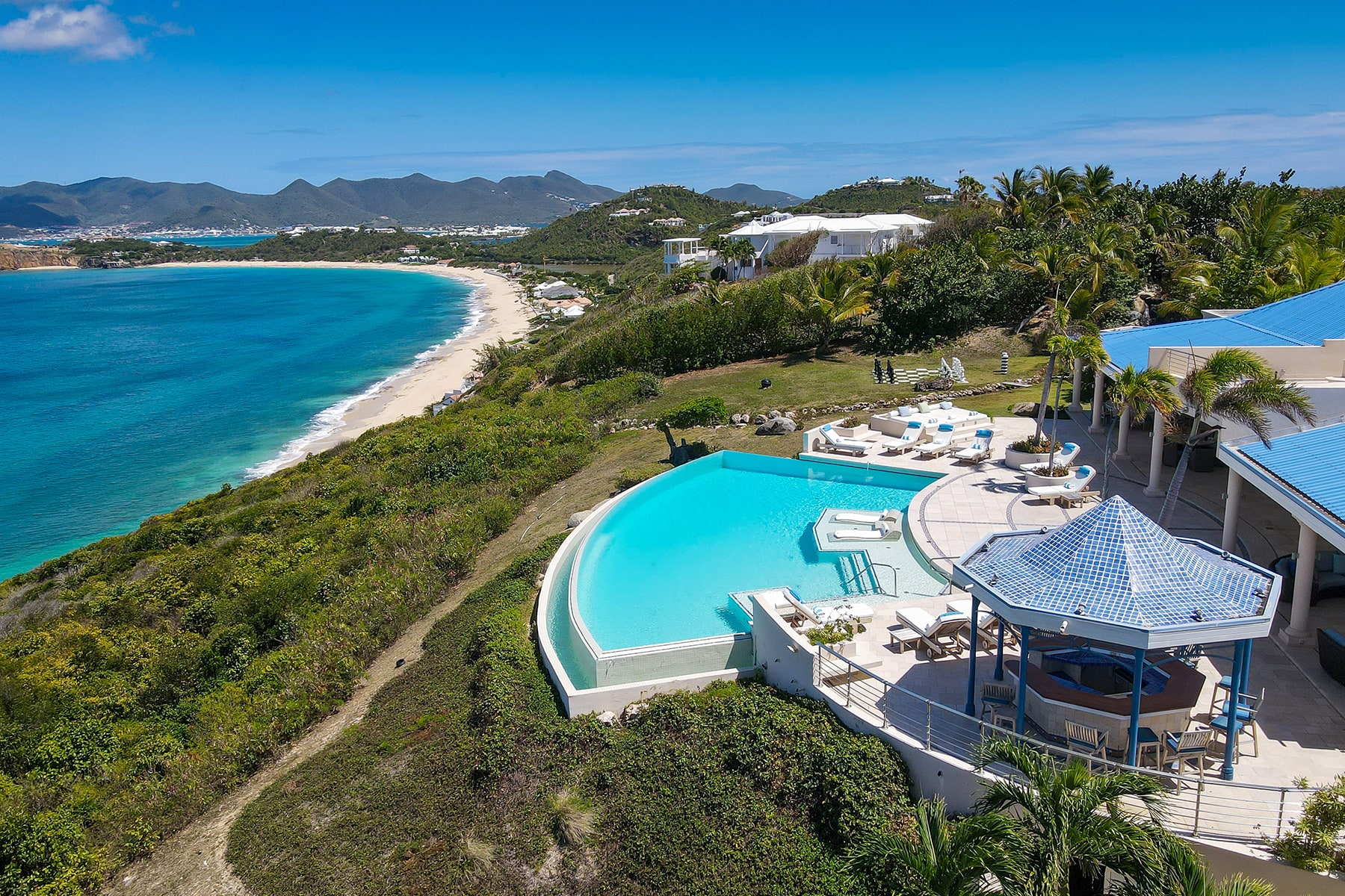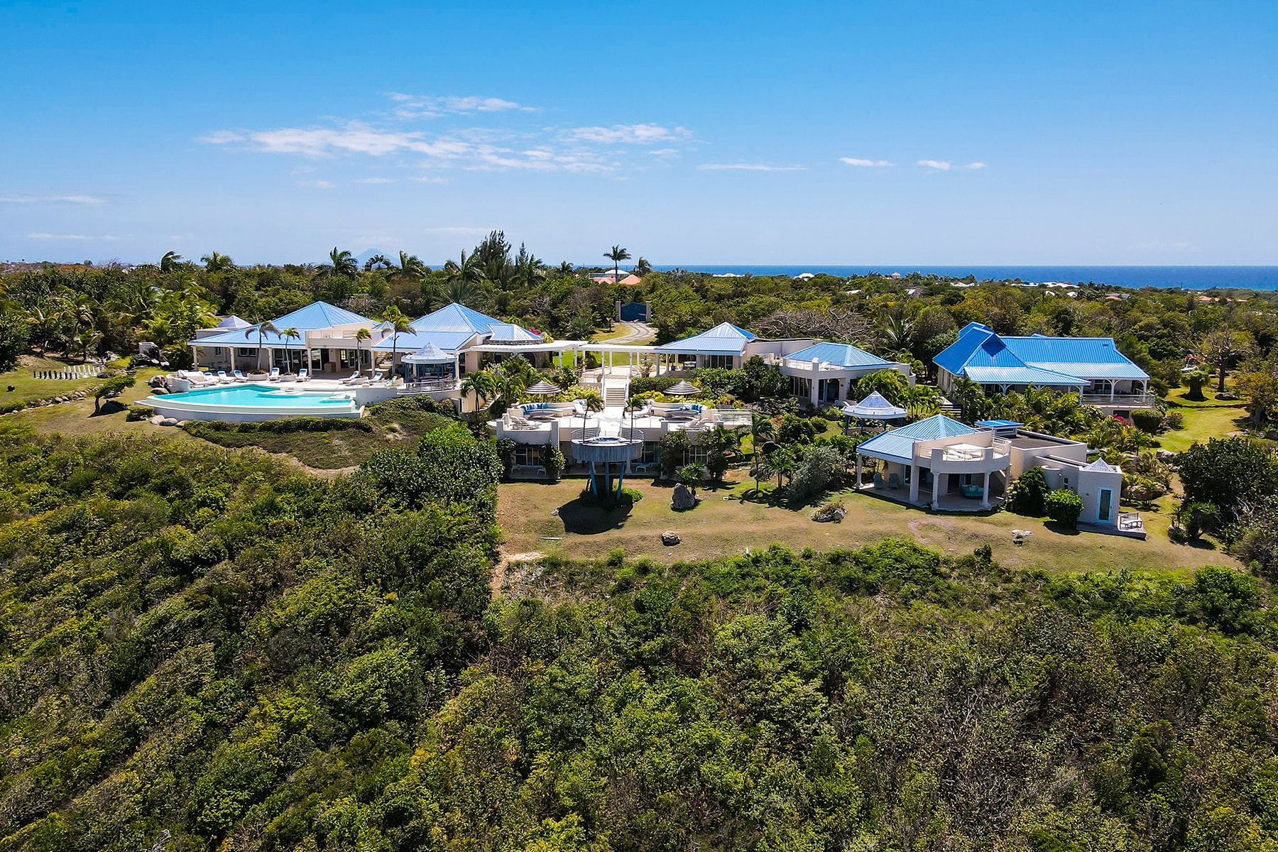 Villa Mes Amis is a massive cliffside estate with epic ocean views in Terres Basses, St. Martin.Welcome to Villa Mes Amis in Terres Basses, Saint Martin, a name that beautifully translates to "my friends" in French, perfectly encapsulating the essence of this expansive and inviting retreat, ideal for destination events or luxurious group getaways. Nestled on seven private acres in the scenic Falaise des Oiseaux area of Terres Basses, Villa Mes Amis is a true estate boasting an unobstructed cliffside view of the sea and the surrounding coastal landscape, divided among three magnificent structures.The primary villa features an impressive reception area and a spacious lounge, providing breathtaking views. Enhancing the experience, an infinity edge pool and Jacuzzi at the cliff's edge offer a seamless connection with the sky, sea, air, and light. Villa Mes Amis' Caribbean atmosphere permeates the indoor spaces, with casual lounge and dining areas leading to the formal dining space and gourmet kitchen, all framed by sliding glass doors.Within the main villa, seven of the thirteen bedroom suites are nestled, each equipped with en suite baths featuring indoor and outdoor showers. The master bath boasts a private terrace. The second villa offers three additional bedrooms, appealing living spaces, and a stepped swimming pool that stands as a destination in itself. Finally, the third villa houses the three newest bedrooms, each with a king-size bed and en-suite bathrooms.The entire Villa Mes Amis grants access to amenities such as a media room and gym in the main villa, complementing the impressive pool, lounge, and extensive acreage.For those seeking a pristine and private experience, Villa Mes Amis welcomes guests like old friends, offering the utmost comfort, peace, and relaxation for an unforgettable tropical getaway in the heart of St. Martin. Villa Mes Amis is located less than 15 minutes from the nearest grocery store, restaurants and shopping at Porto Cupecoy, and 20 minutes from Princess Juliana International Airport (SXM).