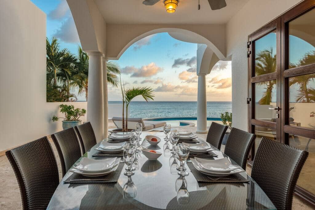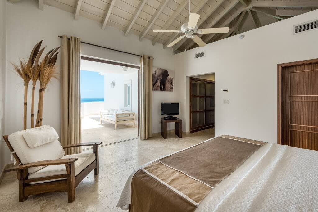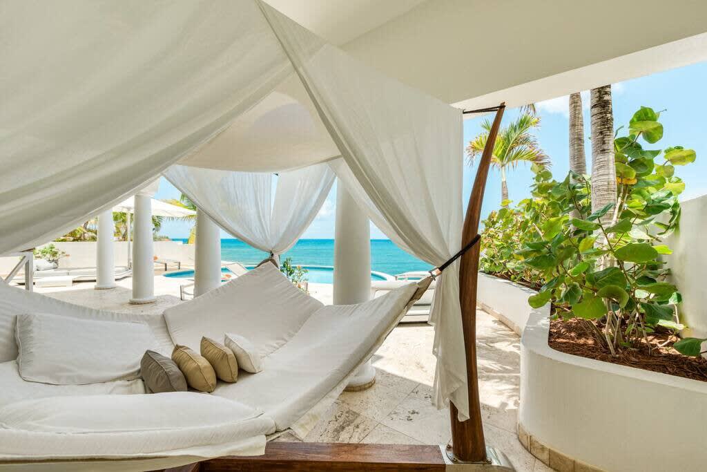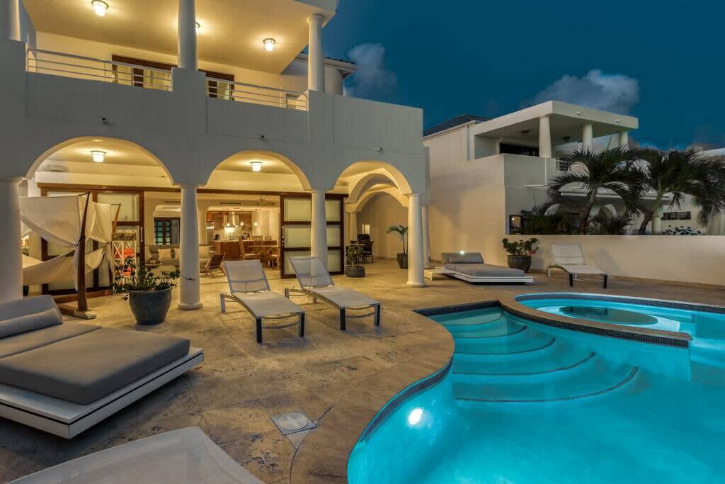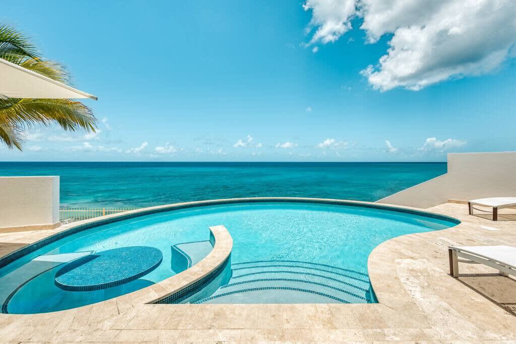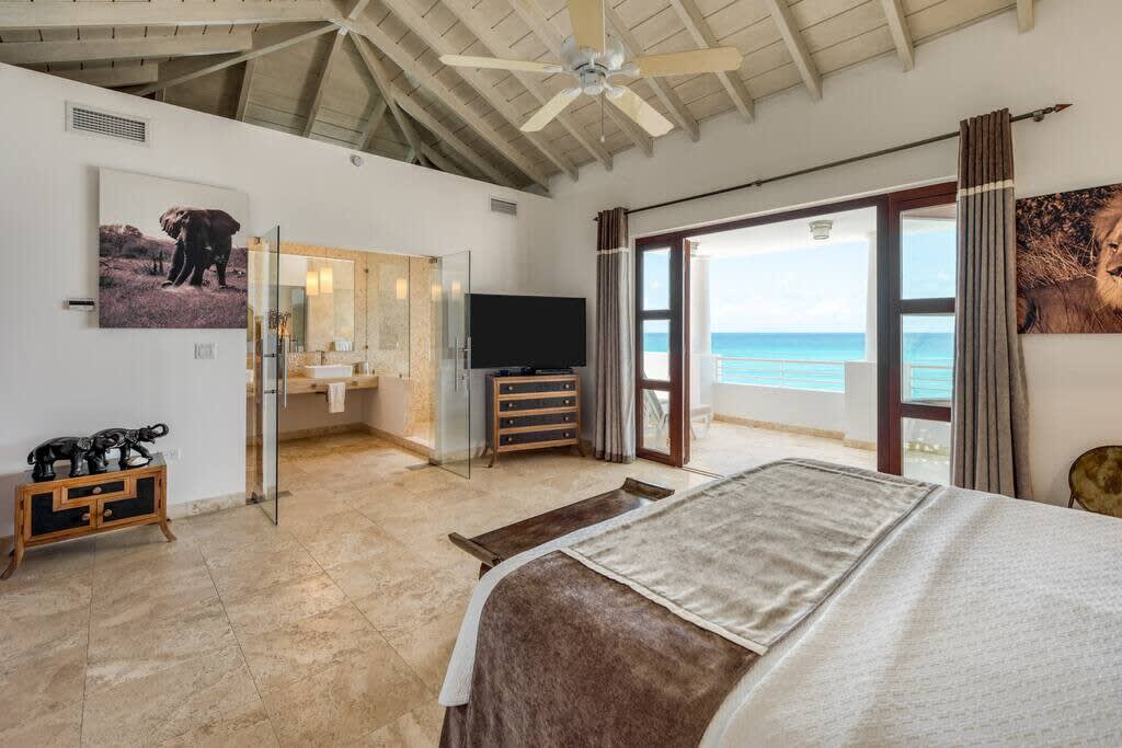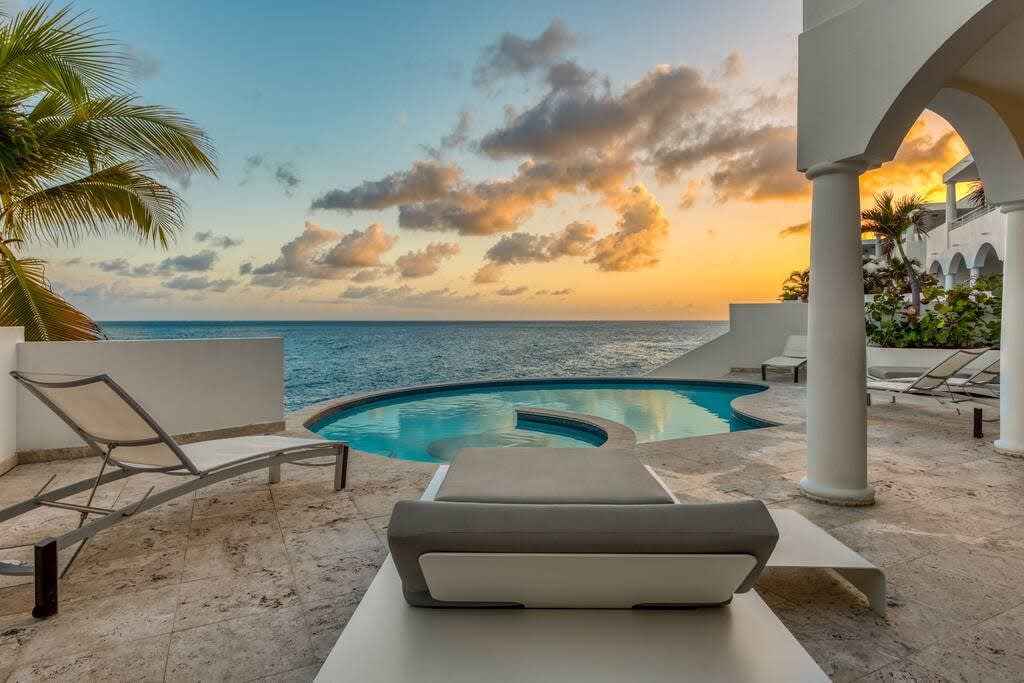 Villa Mumbai has views of Cupecoy Beach and is located in the residence of Shore Pointe, St. Maarten.Mumbai's exotic name reflects its exotic location, the private village of Cupecoy's Shore Pointe right on the French/Dutch Border. Like an exquisite miniature version of a gleaming white Greek island, the villas of Shore Pointe are individual, elegant gems within a luxurious gated community. Mumbai is set apart by a beautiful miniature garden filled with palms and fragrant flowers. The entryway continues the tropical plantings, setting the stage for a beautiful contemporary decor framing the stunning view of the Caribbean Sea and the outer islands. The interiors, with tumbled travertine floors, flow through stunning glass and wood doors right onto a spacious covered terrace and deck and beyond to the endless pool that seems to touch the ocean. Inside the colors are cool and soothing yet never boring. Exotic touches complement the neutral color scheme of creams, sand, white, soft greys, sage greens, and driftwood. Beautifully curated Asian and African art and artifacts, complemented by eclectic fabrics, add color and texture. Everywhere you look, your eye finds beauty. The open-plan living area features a high-end kitchen with luxury appliances, beautiful wood, and stainless. The indoor dining room is centered on a fabulous glass and driftwood dining table. The living area combines the lounging and media spaces with an office nook. The outdoor living areas provide covered dining and lounge highlighted by an exotic, yet quite comfortable, covered hammock. Just past the pool, stairs descend to the private beach entrance. The three equal size bedrooms have sea views, private outdoor seating areas, and beautiful custom walk-in closets. Each room has its own unique color scheme using beautiful fabrics and art that adorns the walls, windows, and furniture of each bedroom. The lower level bedroom opens to the travertine terrace, yet is very private. Ascend the artistic winding staircase to two very spacious bedrooms separated by hallways for a private feel. Every bedroom has a spa-style bathroom with walk-in showers; the decor combines wood, glass, tiles, and river stones. You are very close to amenities. A short walking distance to Porto Cupecoy with a terrific little gourmet market, wonderful restaurants, and stunning views. You are 5 minutes to the airport and 10 minutes to Simpson Bay & to Marigot.