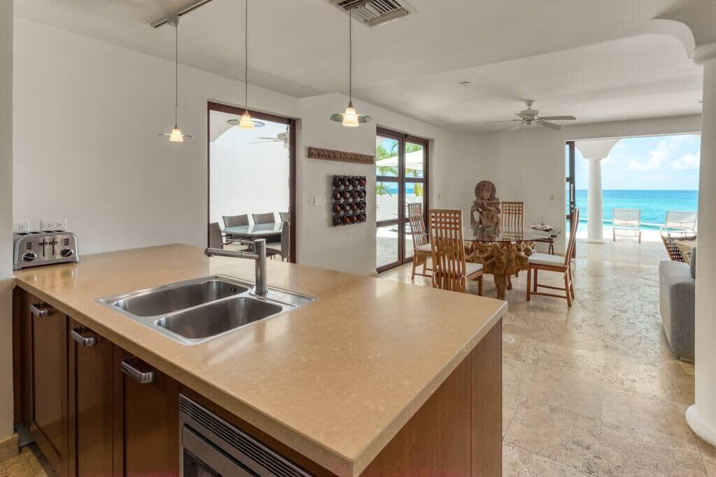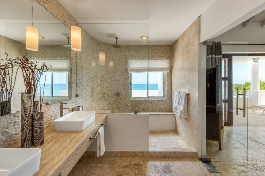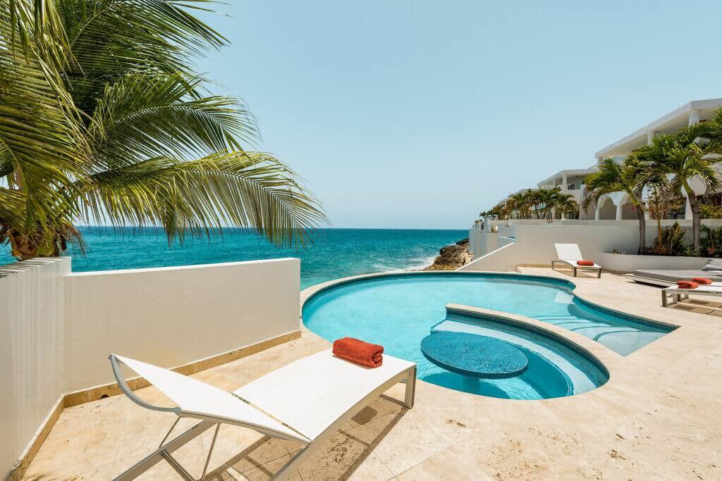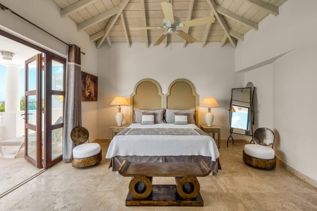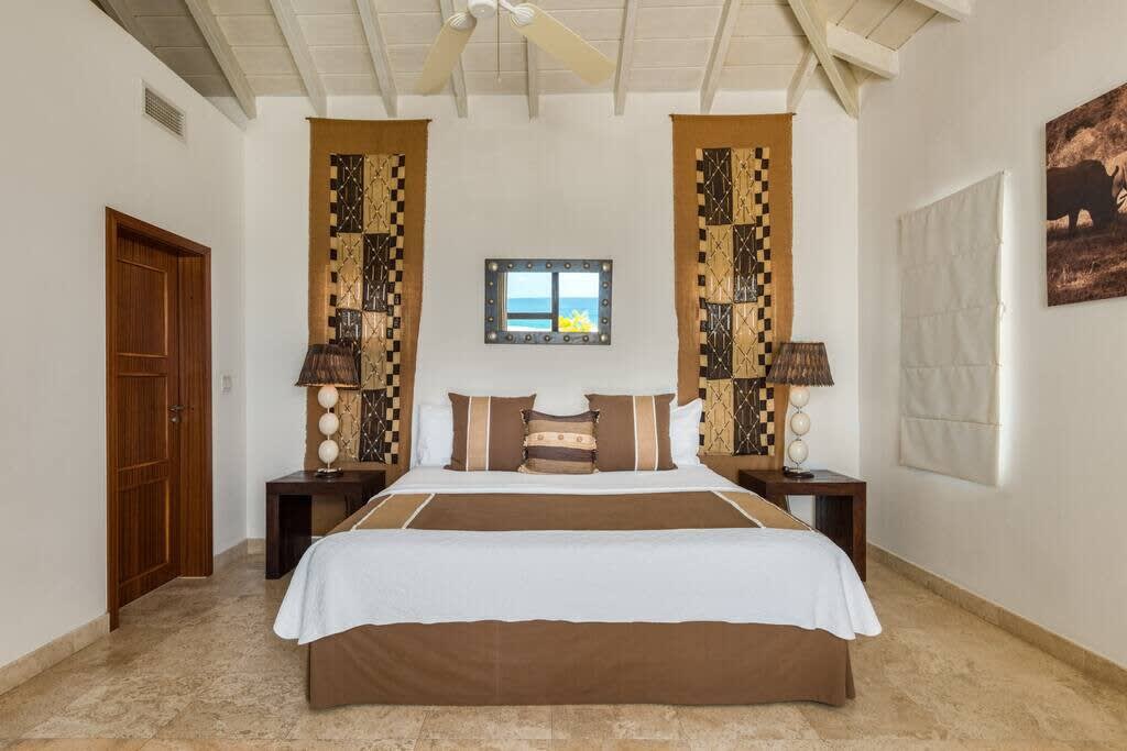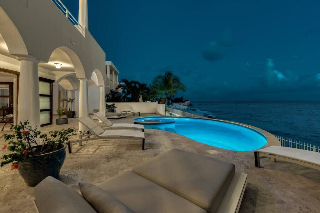 Villa Mumbai has views of Cupecoy Beach and is located in the residence of Shore Pointe, St. Maarten.Mumbai's exotic name reflects its exotic location, the private village of Cupecoy's Shore Pointe right on the French/Dutch Border. Like an exquisite miniature version of a gleaming white Greek island, the villas of Shore Pointe are individual, elegant gems within a luxurious gated community. Mumbai is set apart by a beautiful miniature garden filled with palms and fragrant flowers. The entryway continues the tropical plantings, setting the stage for a beautiful contemporary decor framing the stunning view of the Caribbean Sea and the outer islands. The interiors, with tumbled travertine floors, flow through stunning glass and wood doors right onto a spacious covered terrace and deck and beyond to the endless pool that seems to touch the ocean. Inside the colors are cool and soothing yet never boring. Exotic touches complement the neutral color scheme of creams, sand, white, soft greys, sage greens, and driftwood. Beautifully curated Asian and African art and artifacts, complemented by eclectic fabrics, add color and texture. Everywhere you look, your eye finds beauty. The open-plan living area features a high-end kitchen with luxury appliances, beautiful wood, and stainless. The indoor dining room is centered on a fabulous glass and driftwood dining table. The living area combines the lounging and media spaces with an office nook. The outdoor living areas provide covered dining and lounge highlighted by an exotic, yet quite comfortable, covered hammock. Just past the pool, stairs descend to the private beach entrance. The three equal size bedrooms have sea views, private outdoor seating areas, and beautiful custom walk-in closets. Each room has its own unique color scheme using beautiful fabrics and art that adorns the walls, windows, and furniture of each bedroom. The lower level bedroom opens to the travertine terrace, yet is very private. Ascend the artistic winding staircase to two very spacious bedrooms separated by hallways for a private feel. Every bedroom has a spa-style bathroom with walk-in showers; the decor combines wood, glass, tiles, and river stones. You are very close to amenities. A short walking distance to Porto Cupecoy with a terrific little gourmet market, wonderful restaurants, and stunning views. You are 5 minutes to the airport and 10 minutes to Simpson Bay & to Marigot.