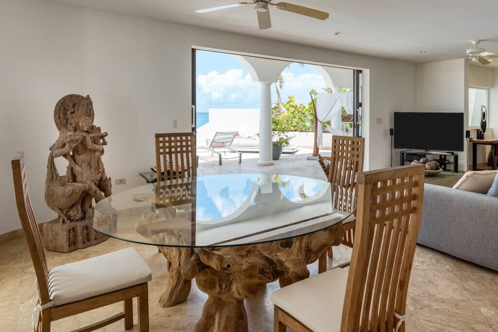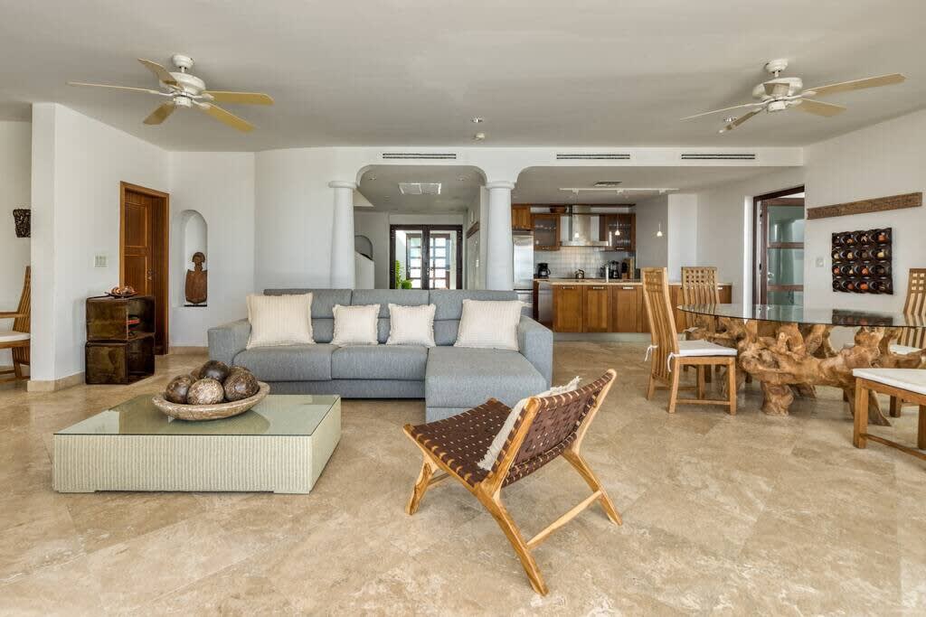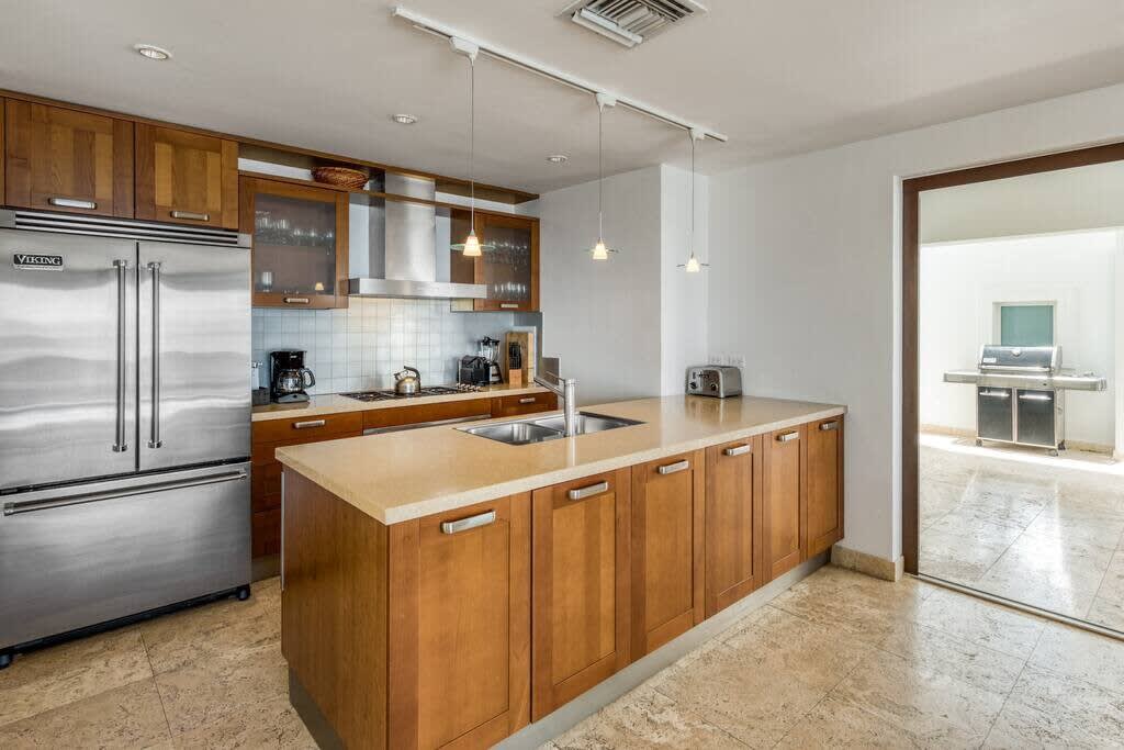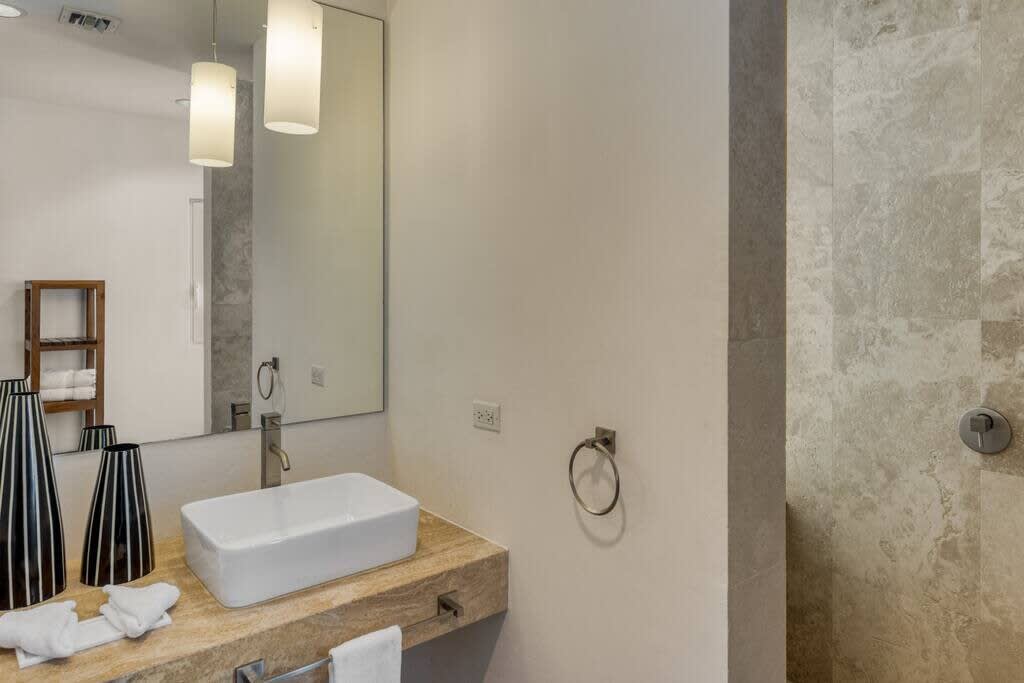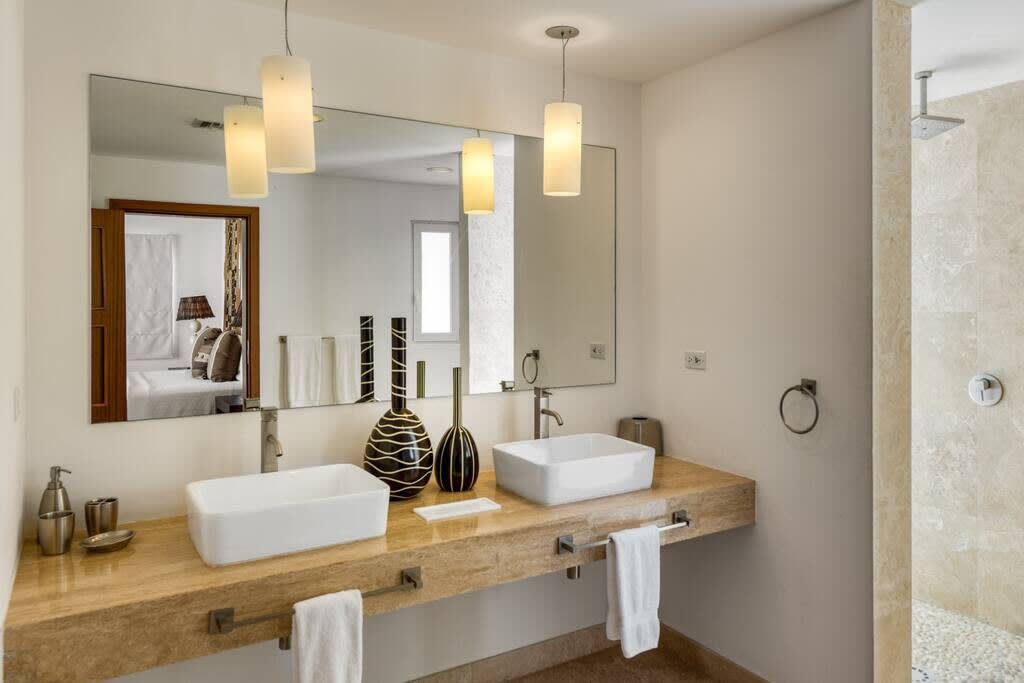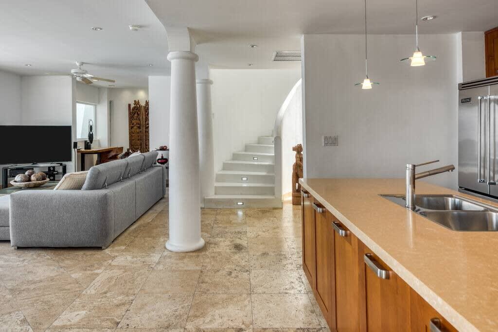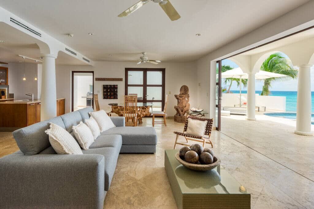 Villa Mumbai has views of Cupecoy Beach and is located in the residence of Shore Pointe, St. Maarten.Mumbai's exotic name reflects its exotic location, the private village of Cupecoy's Shore Pointe right on the French/Dutch Border. Like an exquisite miniature version of a gleaming white Greek island, the villas of Shore Pointe are individual, elegant gems within a luxurious gated community. Mumbai is set apart by a beautiful miniature garden filled with palms and fragrant flowers. The entryway continues the tropical plantings, setting the stage for a beautiful contemporary decor framing the stunning view of the Caribbean Sea and the outer islands. The interiors, with tumbled travertine floors, flow through stunning glass and wood doors right onto a spacious covered terrace and deck and beyond to the endless pool that seems to touch the ocean. Inside the colors are cool and soothing yet never boring. Exotic touches complement the neutral color scheme of creams, sand, white, soft greys, sage greens, and driftwood. Beautifully curated Asian and African art and artifacts, complemented by eclectic fabrics, add color and texture. Everywhere you look, your eye finds beauty. The open-plan living area features a high-end kitchen with luxury appliances, beautiful wood, and stainless. The indoor dining room is centered on a fabulous glass and driftwood dining table. The living area combines the lounging and media spaces with an office nook. The outdoor living areas provide covered dining and lounge highlighted by an exotic, yet quite comfortable, covered hammock. Just past the pool, stairs descend to the private beach entrance. The three equal size bedrooms have sea views, private outdoor seating areas, and beautiful custom walk-in closets. Each room has its own unique color scheme using beautiful fabrics and art that adorns the walls, windows, and furniture of each bedroom. The lower level bedroom opens to the travertine terrace, yet is very private. Ascend the artistic winding staircase to two very spacious bedrooms separated by hallways for a private feel. Every bedroom has a spa-style bathroom with walk-in showers; the decor combines wood, glass, tiles, and river stones. You are very close to amenities. A short walking distance to Porto Cupecoy with a terrific little gourmet market, wonderful restaurants, and stunning views. You are 5 minutes to the airport and 10 minutes to Simpson Bay & to Marigot.