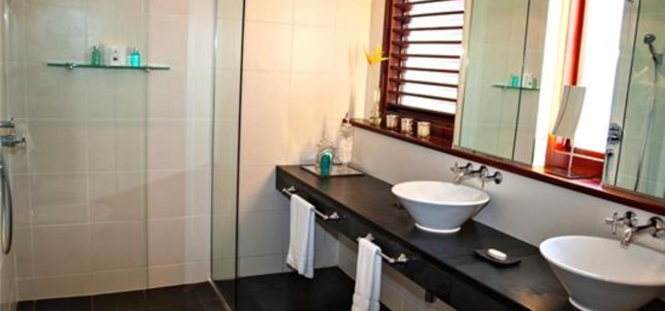 Polished wooden and stone flooring, crisp, white linens, modern prints and indigenous artwork help create a cool, comfortable, modern interior.