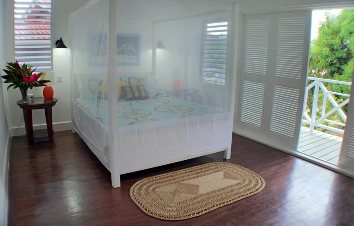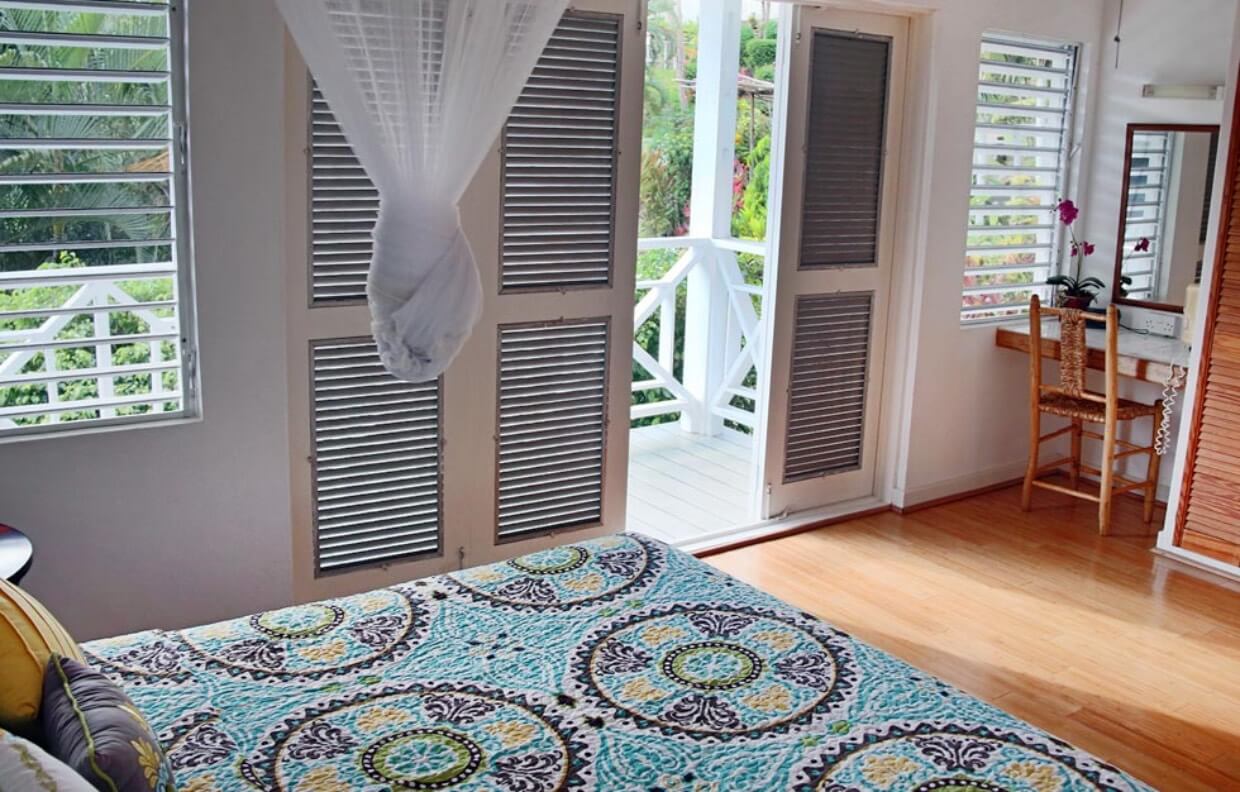 The upper level has a living room, bathroom, and fully-equipped kitchen. The sofa bed sleeps an additional two persons comfortably. Another set of French doors open onto a wonderful covered veranda overlooking Marigot Bay.