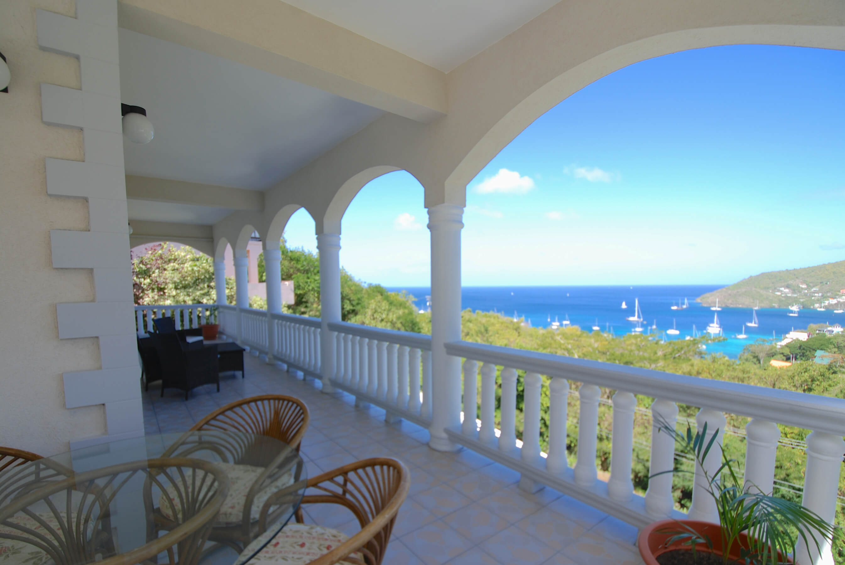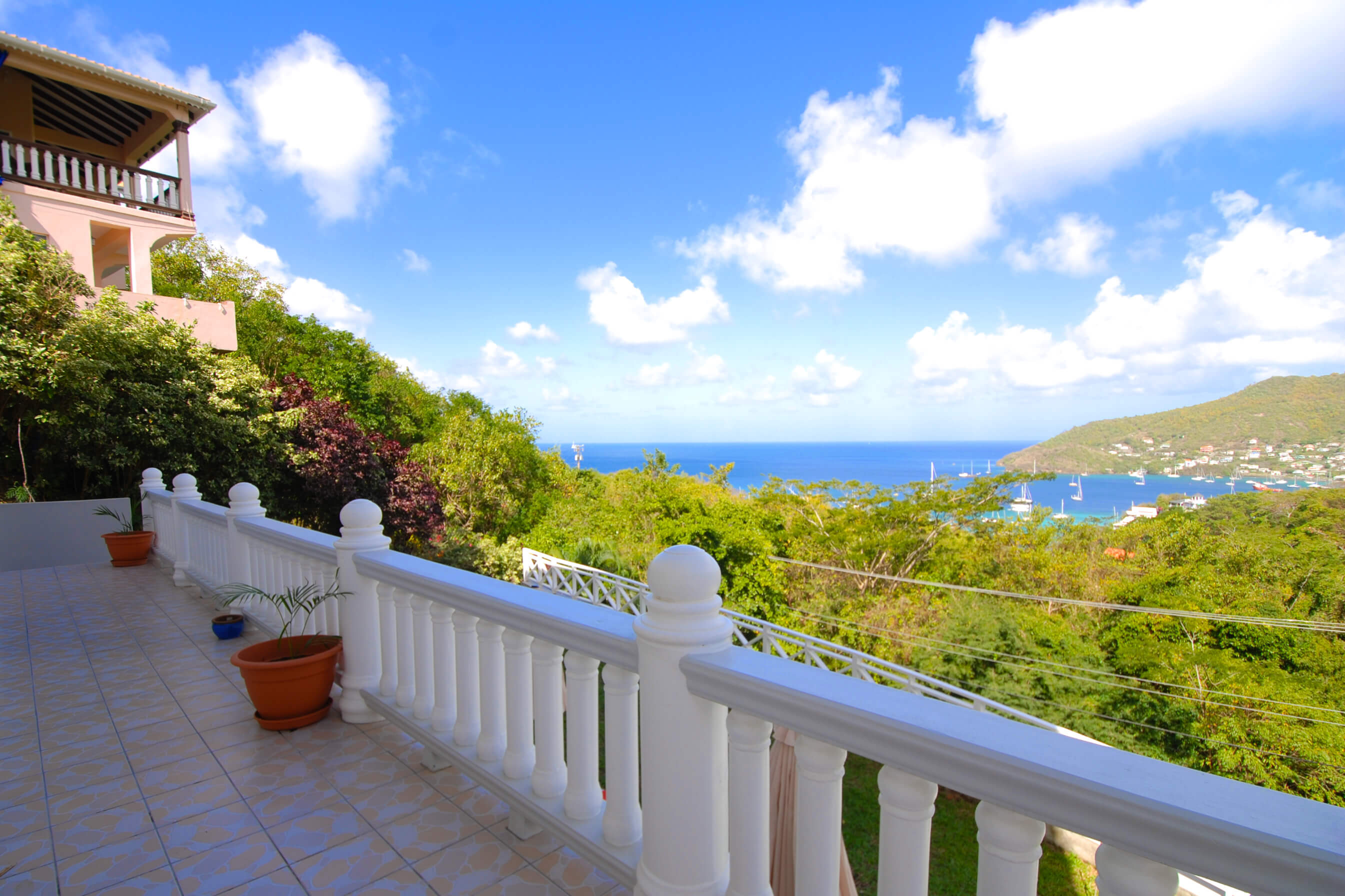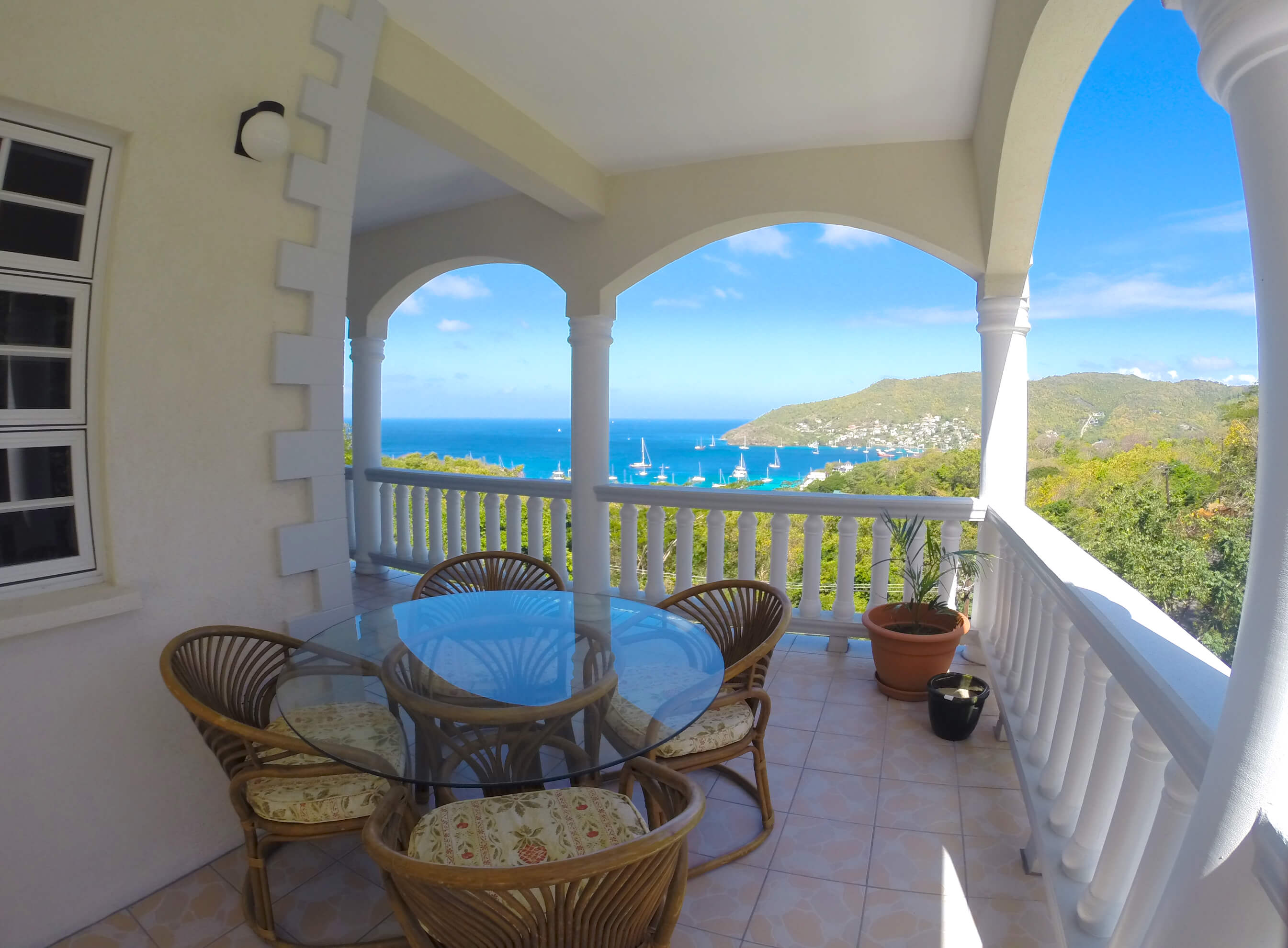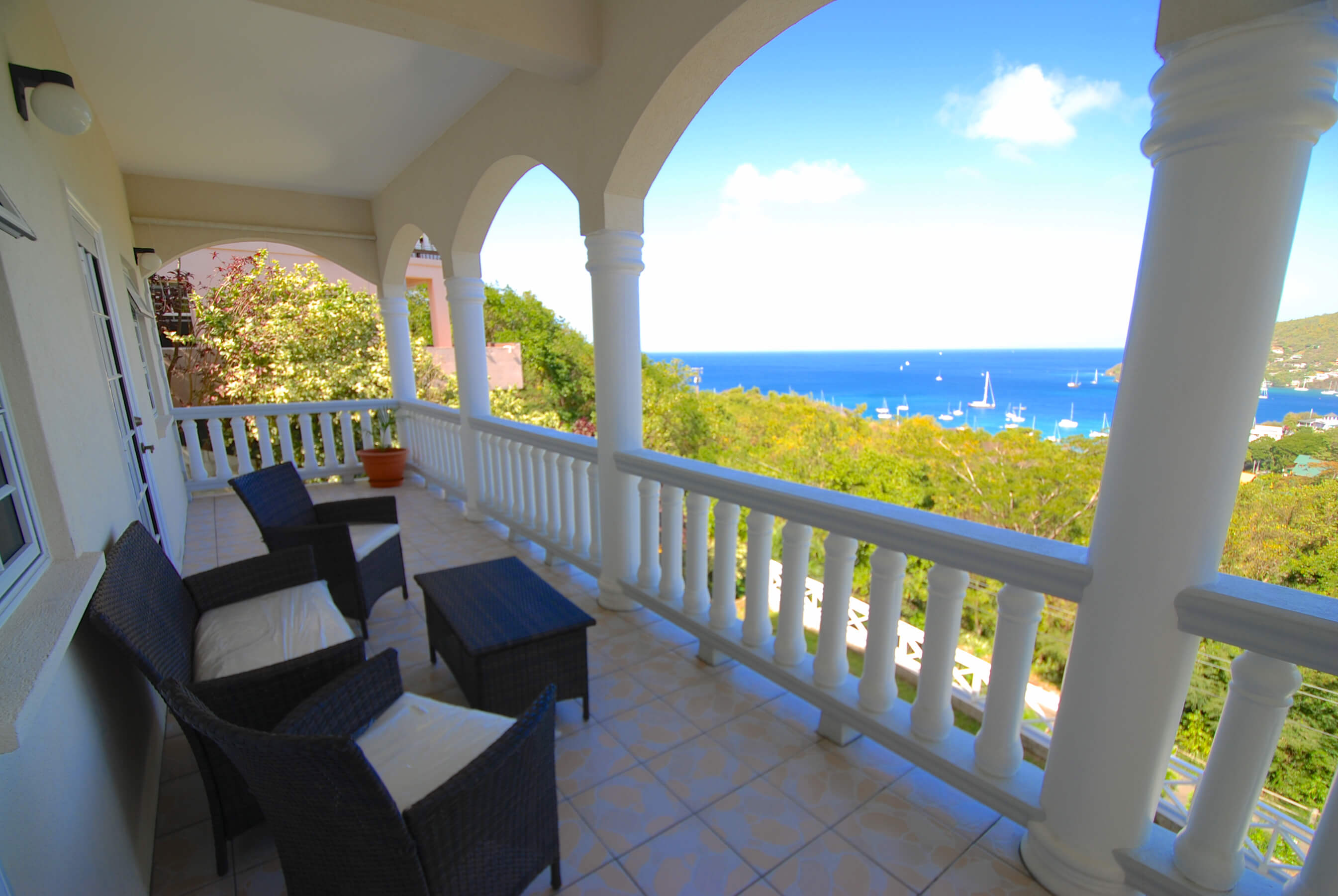 These apartments sit on a great location in the sought after and peaceful Bequia Estates. The 2 bedroom upper apartment combined with the lower 1 bed apartment would be ideal for a group of 6 guests with lots of space and privacy. Access between the 2 apartments is via external steps. The elevated location on the headland overlooking Admiralty Bay offers wonderful expansive views and cooling breezes whilst still close enough to be able to take a stroll down to the islands best beaches or into Port Elizabeth. There is also ample parking above the property.