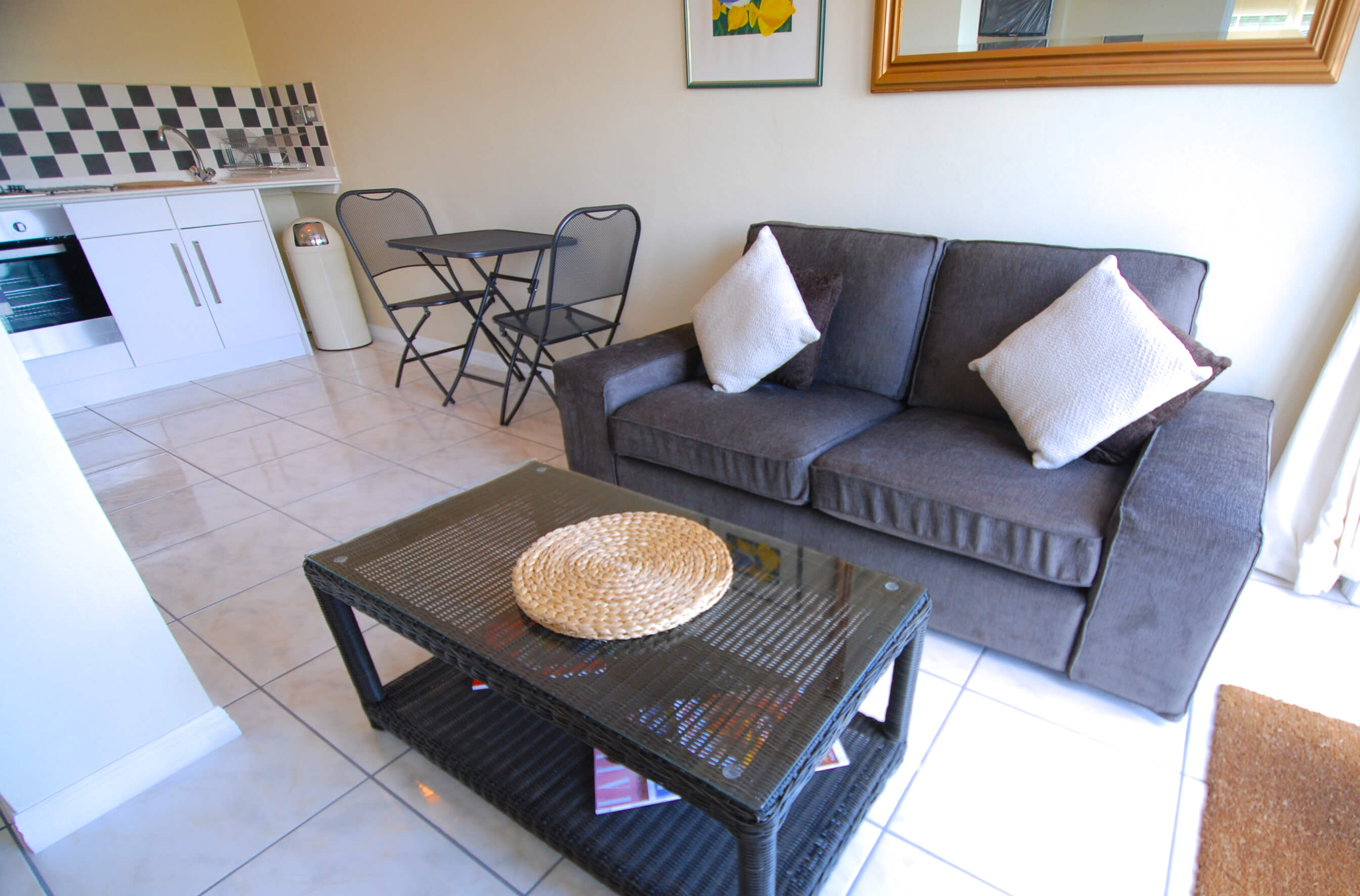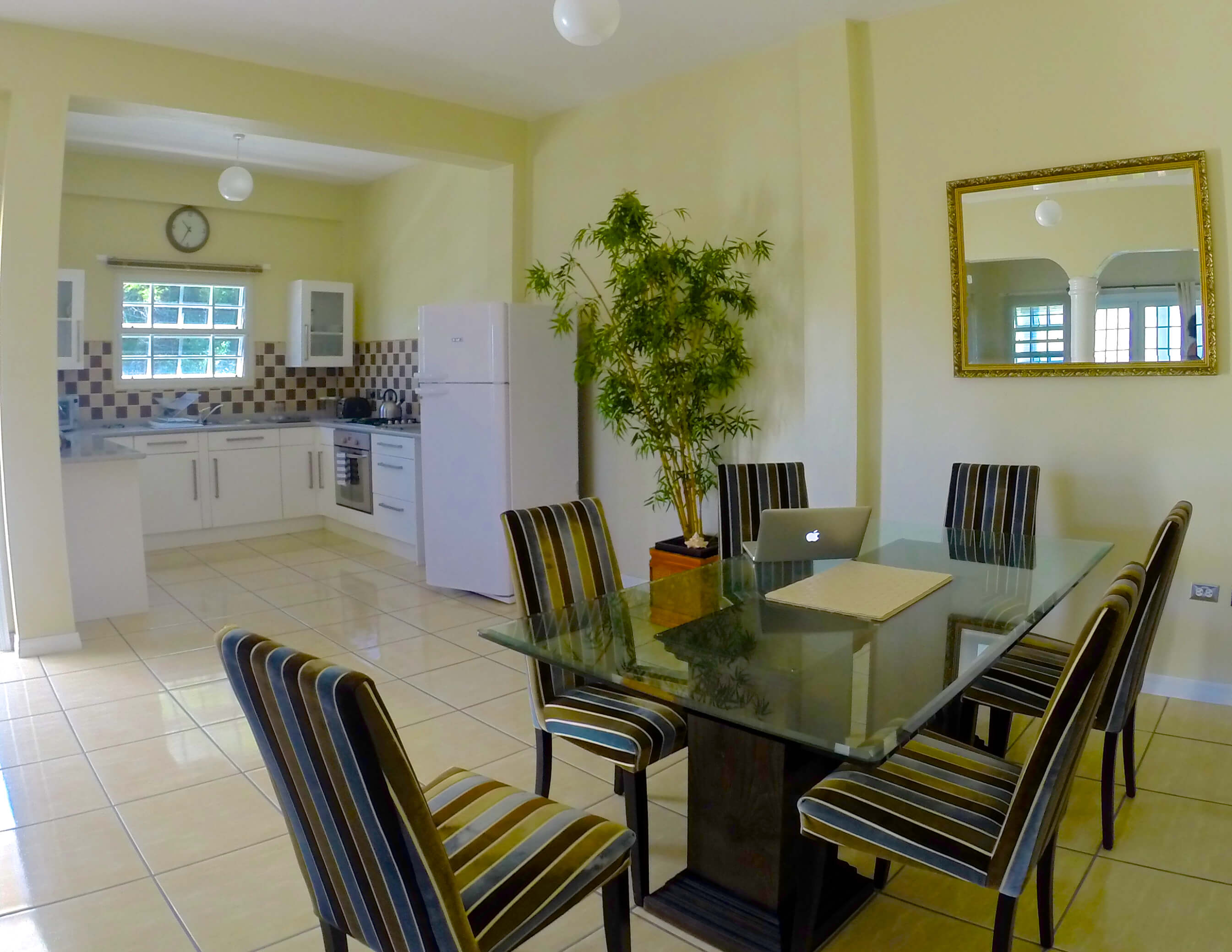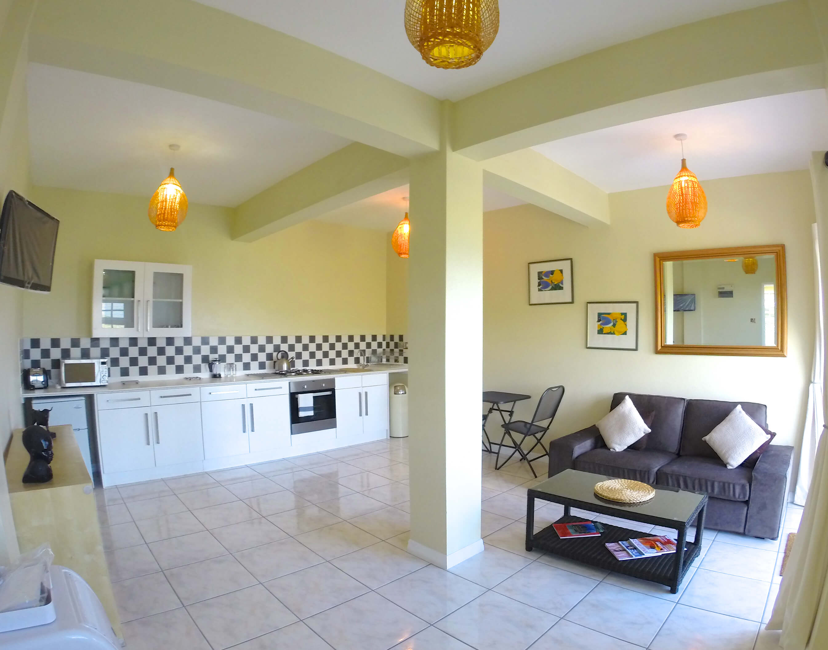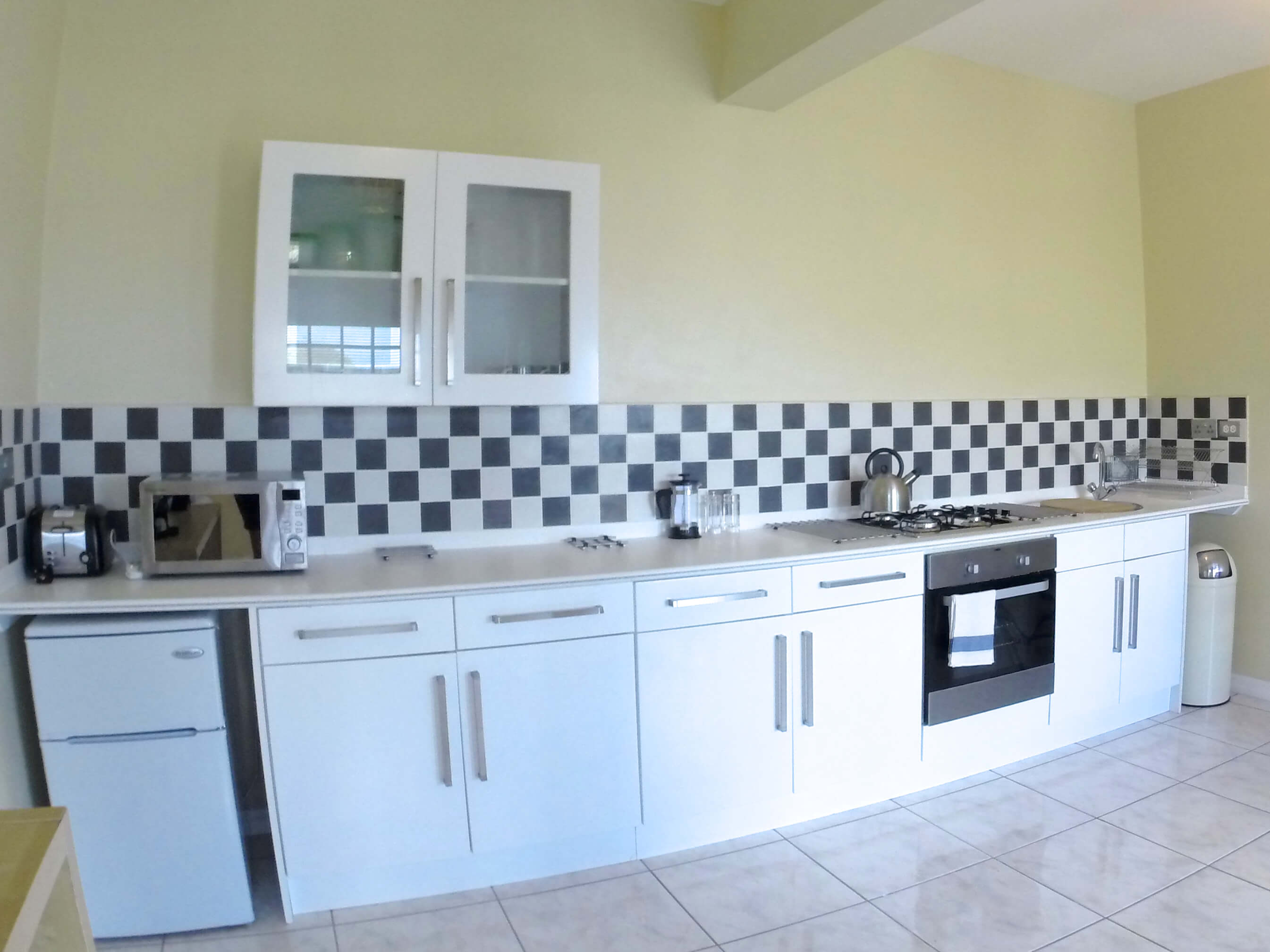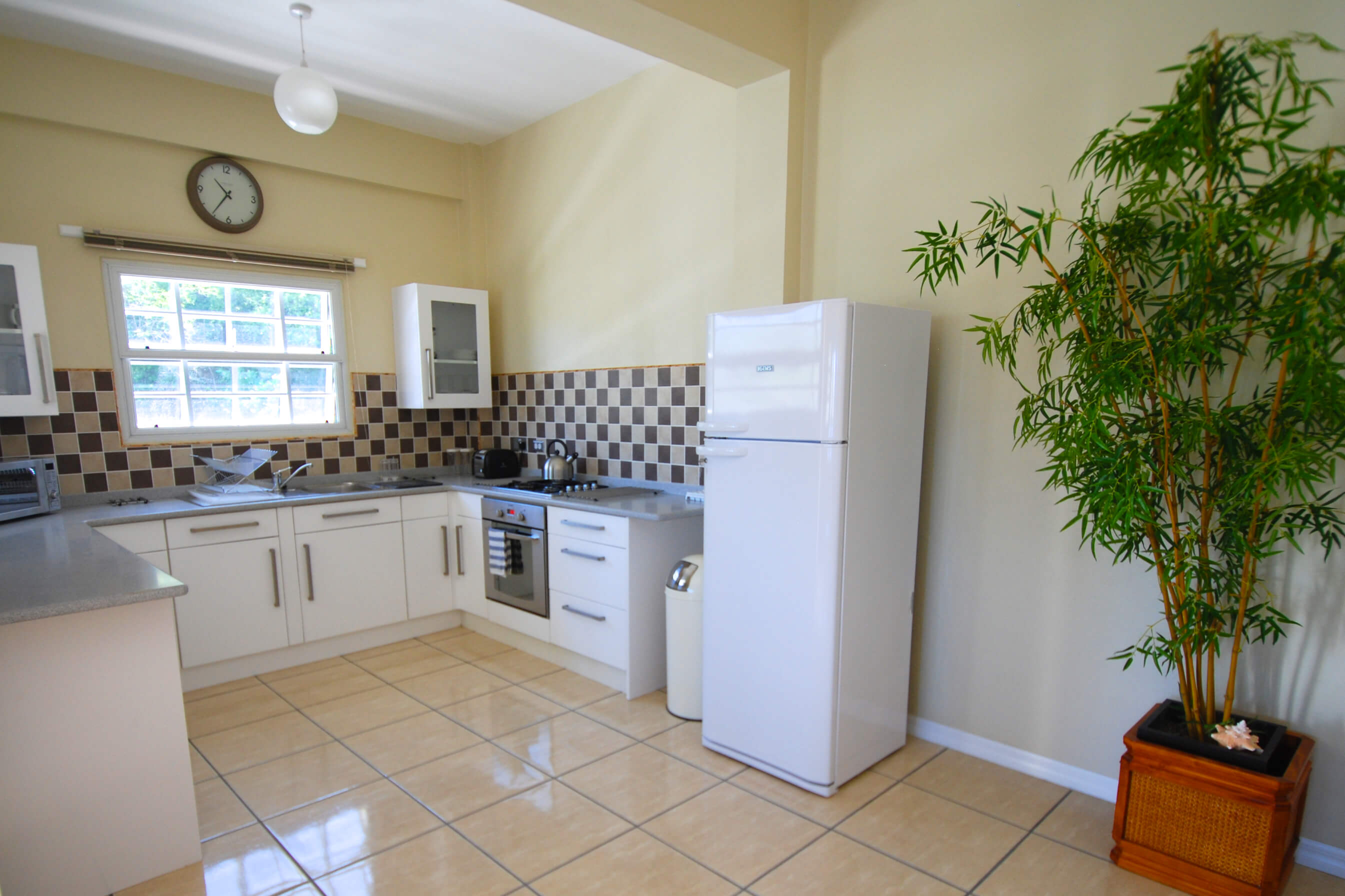 Each apartment has an open plan kitchen / dining / living area are large and comfortable and open out onto the balcony through double doors with large corner sofa and flat screen TV upstairs and smaller sofa & TV downstairs. The kitchens are particularly well equipped with all appliances you would need. There is a nice shady, grassed garden area below - the ideal spot to relax on a sunlounger, perhaps read a book whilst enjoying the views or for children to play safely on. There is a portable air conditioning unit in each apartment which can be moved between bedrooms / living area if required.