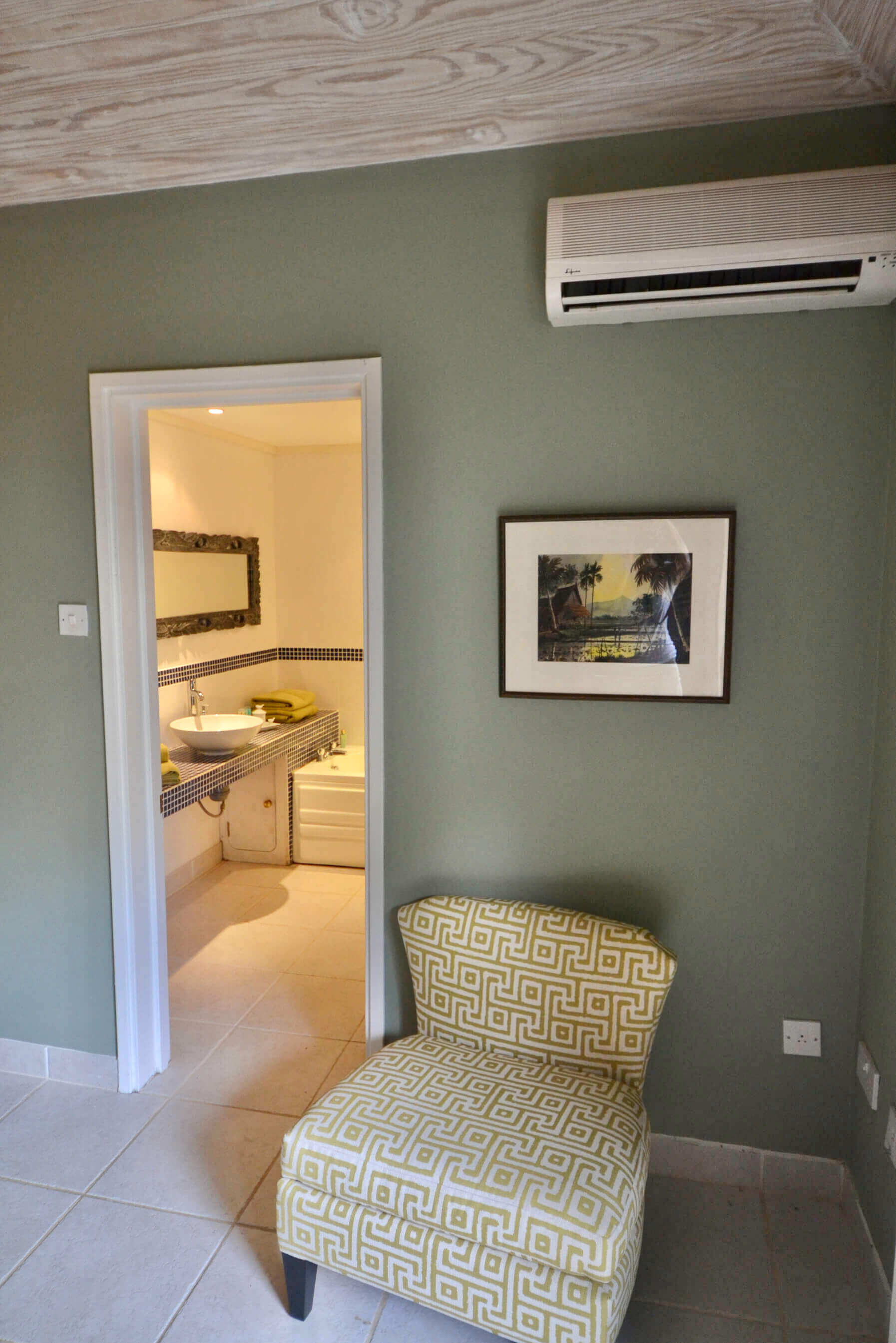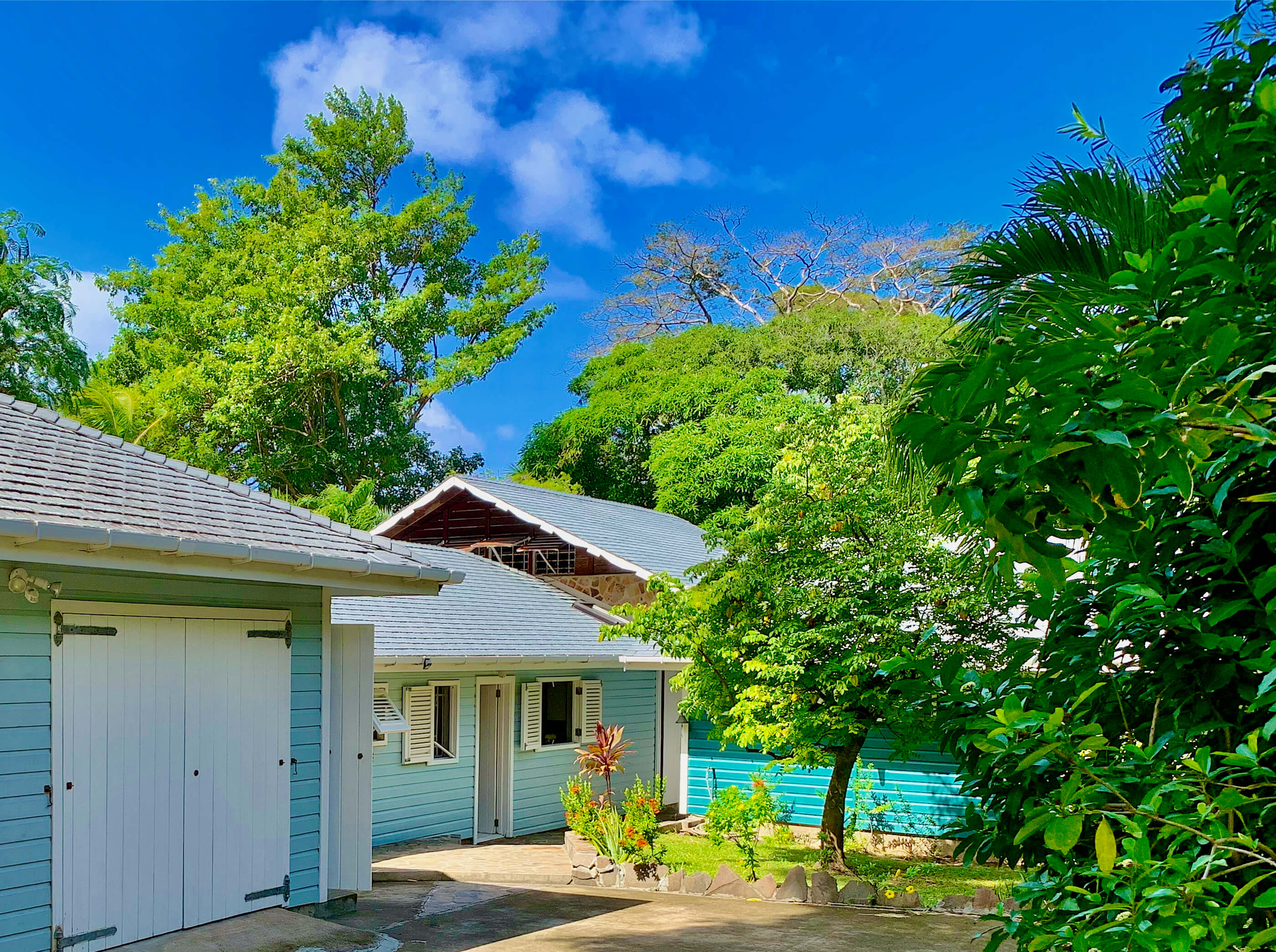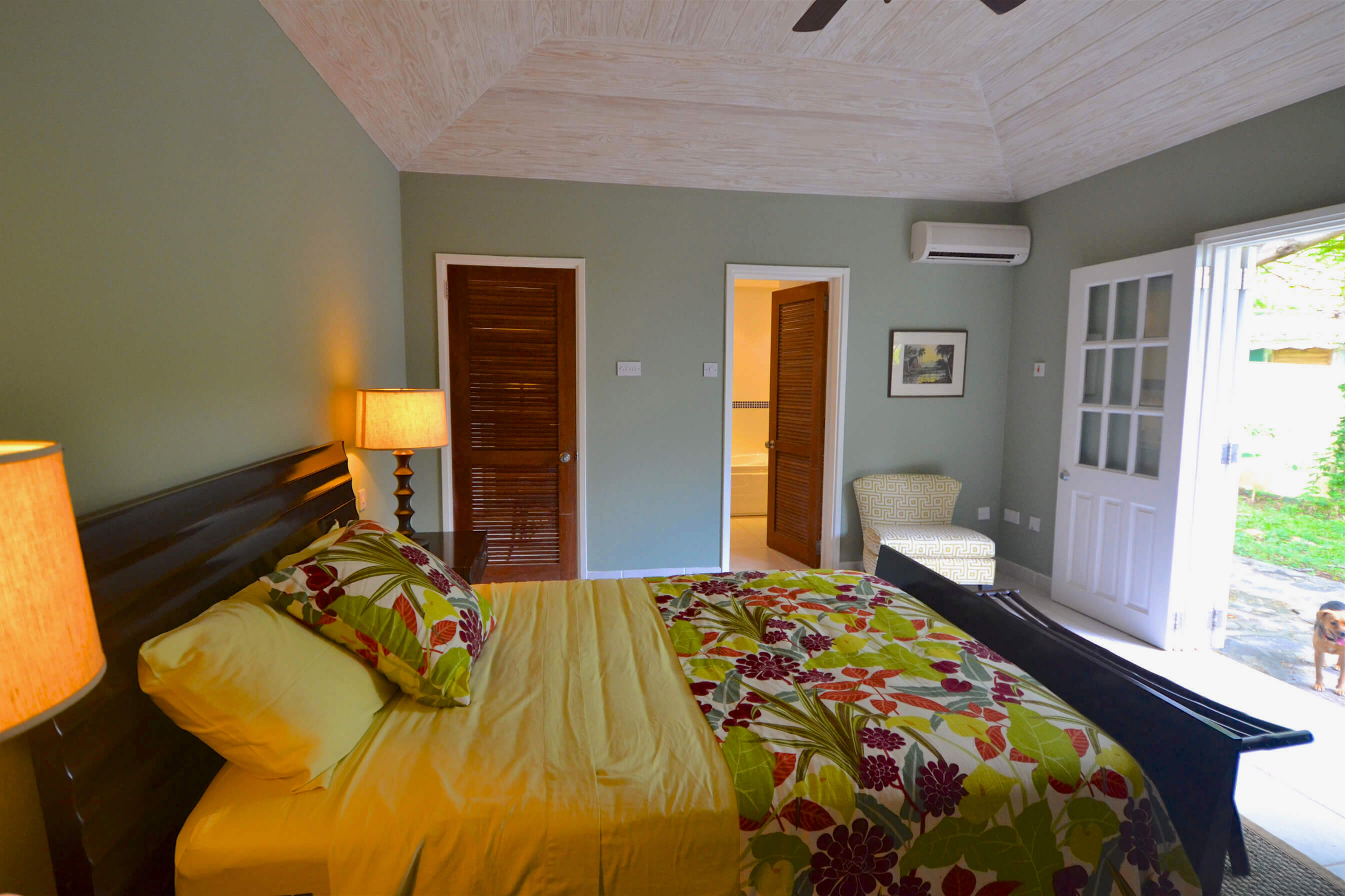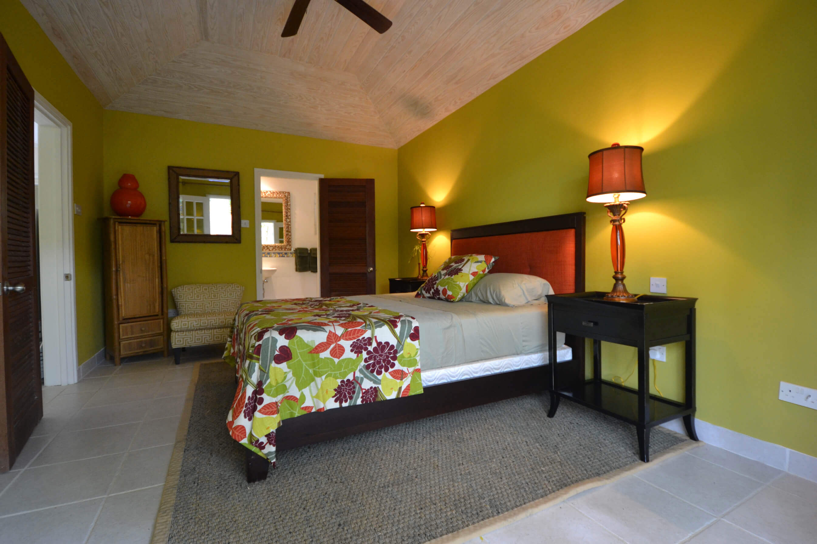 The 2 bedrooms are interconnected and have private louvered french windows that lead out to the shaded garden. These comfortable rooms, full of character yet uncluttered, have generous proportions both with Queen sized beds. Shaded by the mature trees and cooled by the trade winds breeze, with AC and ceiling fans these relaxed and romantic bedrooms offer the perfect place to start your day on the island of Bequia.