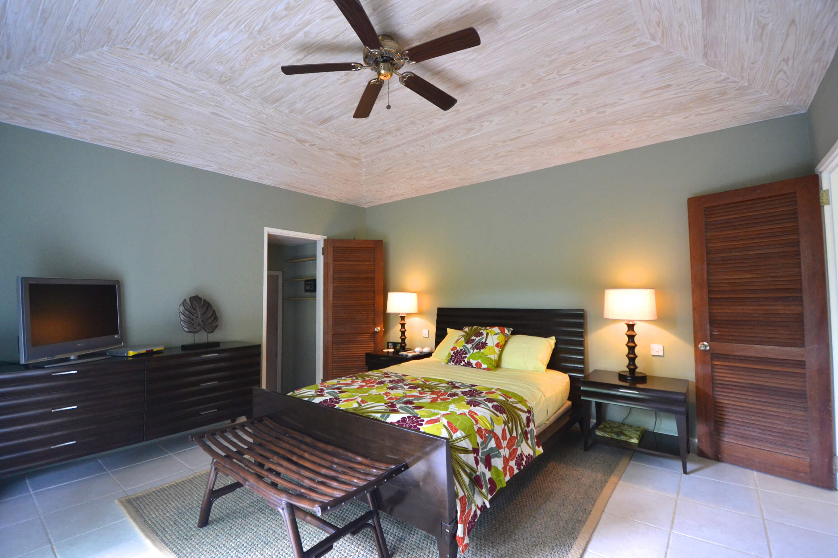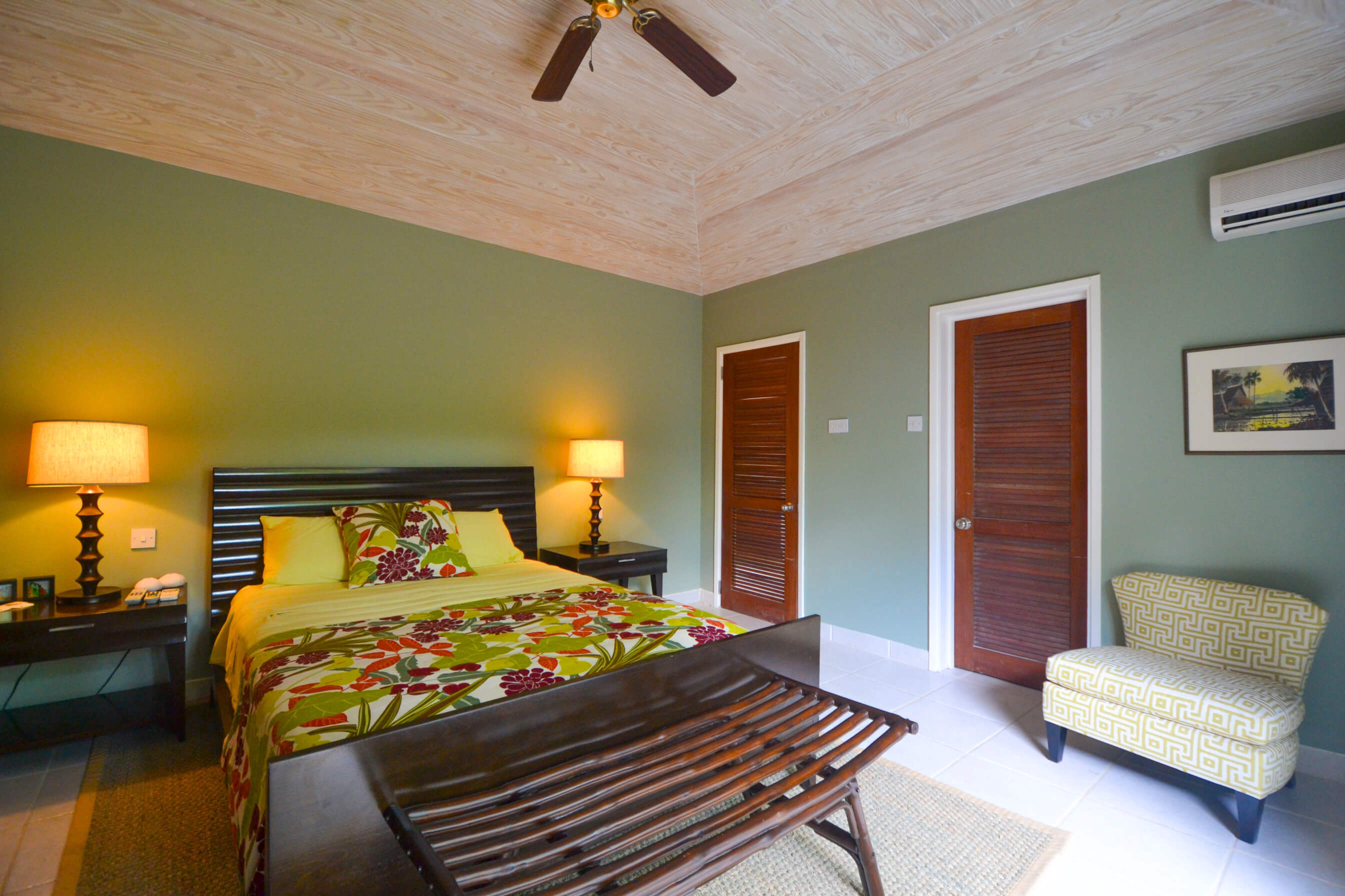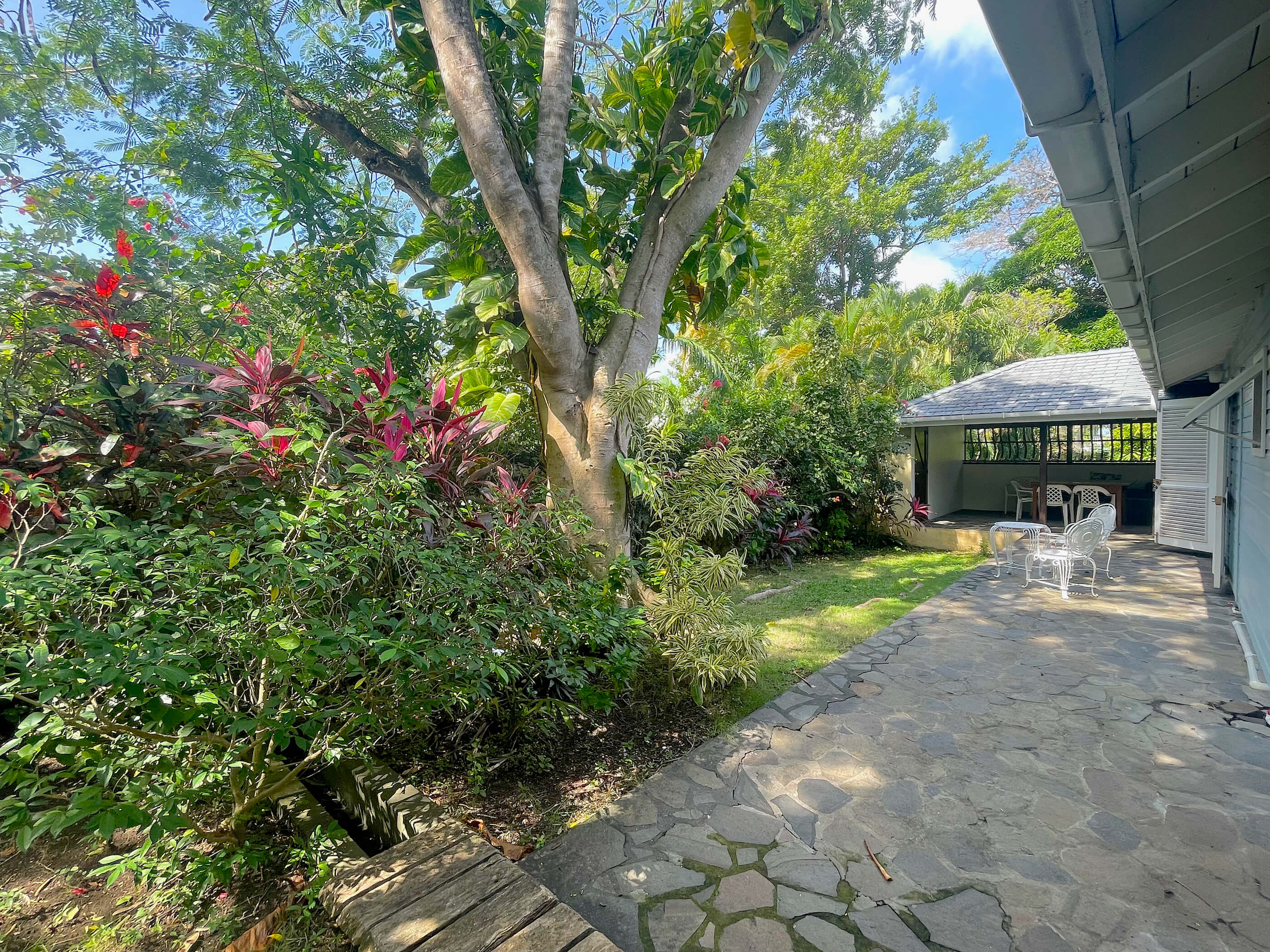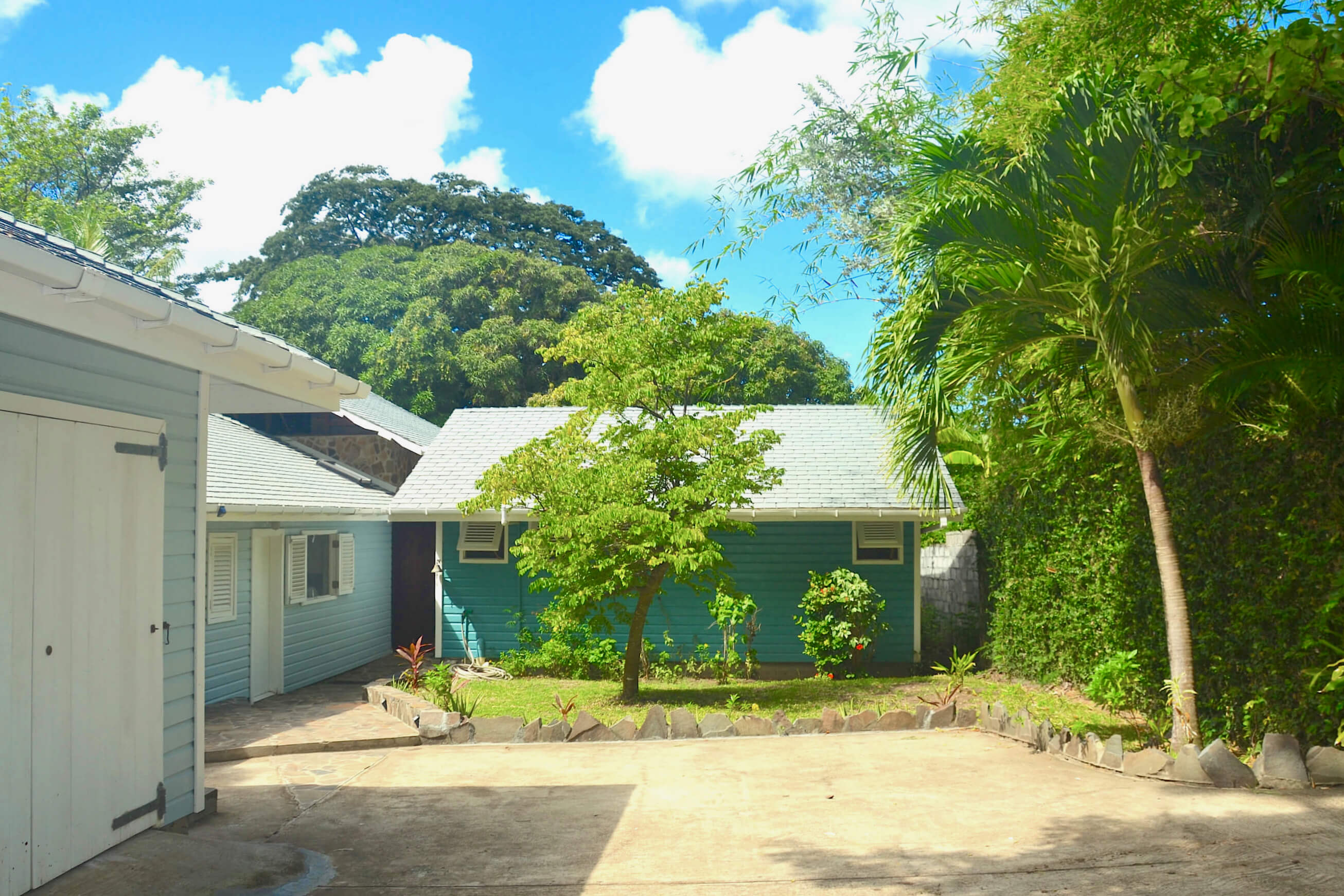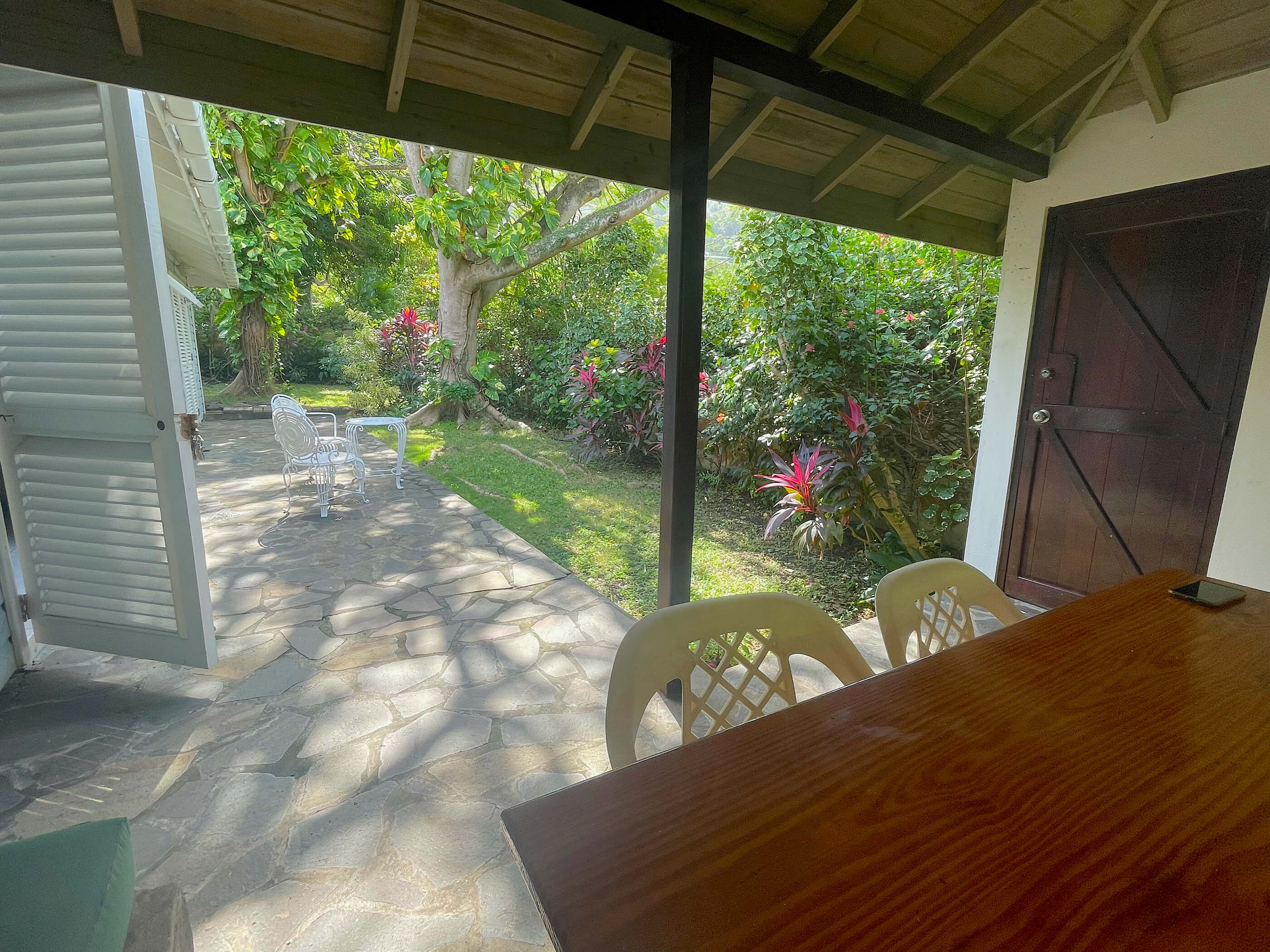 The 2 bedrooms are interconnected and have private louvered french windows that lead out to the shaded garden. These comfortable rooms, full of character yet uncluttered, have generous proportions both with Queen sized beds. Shaded by the mature trees and cooled by the trade winds breeze, with AC and ceiling fans these relaxed and romantic bedrooms offer the perfect place to start your day on the island of Bequia.