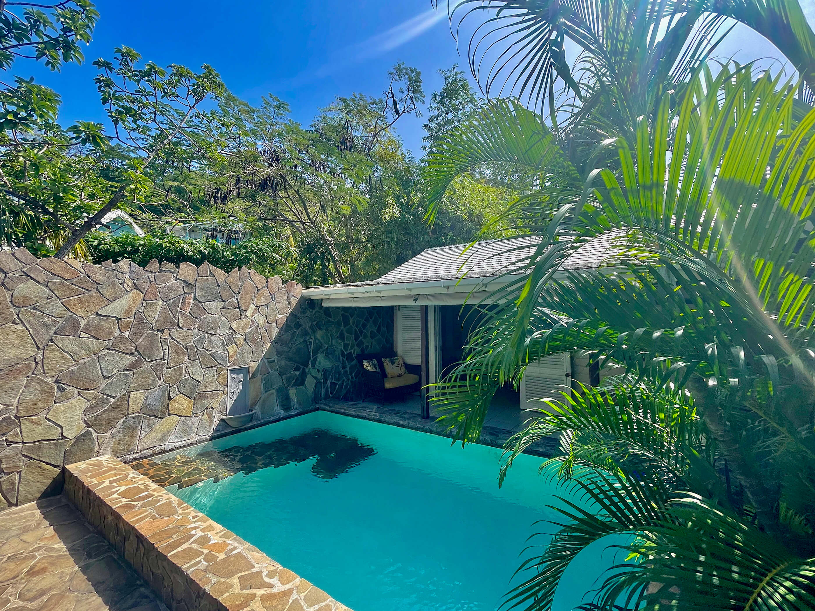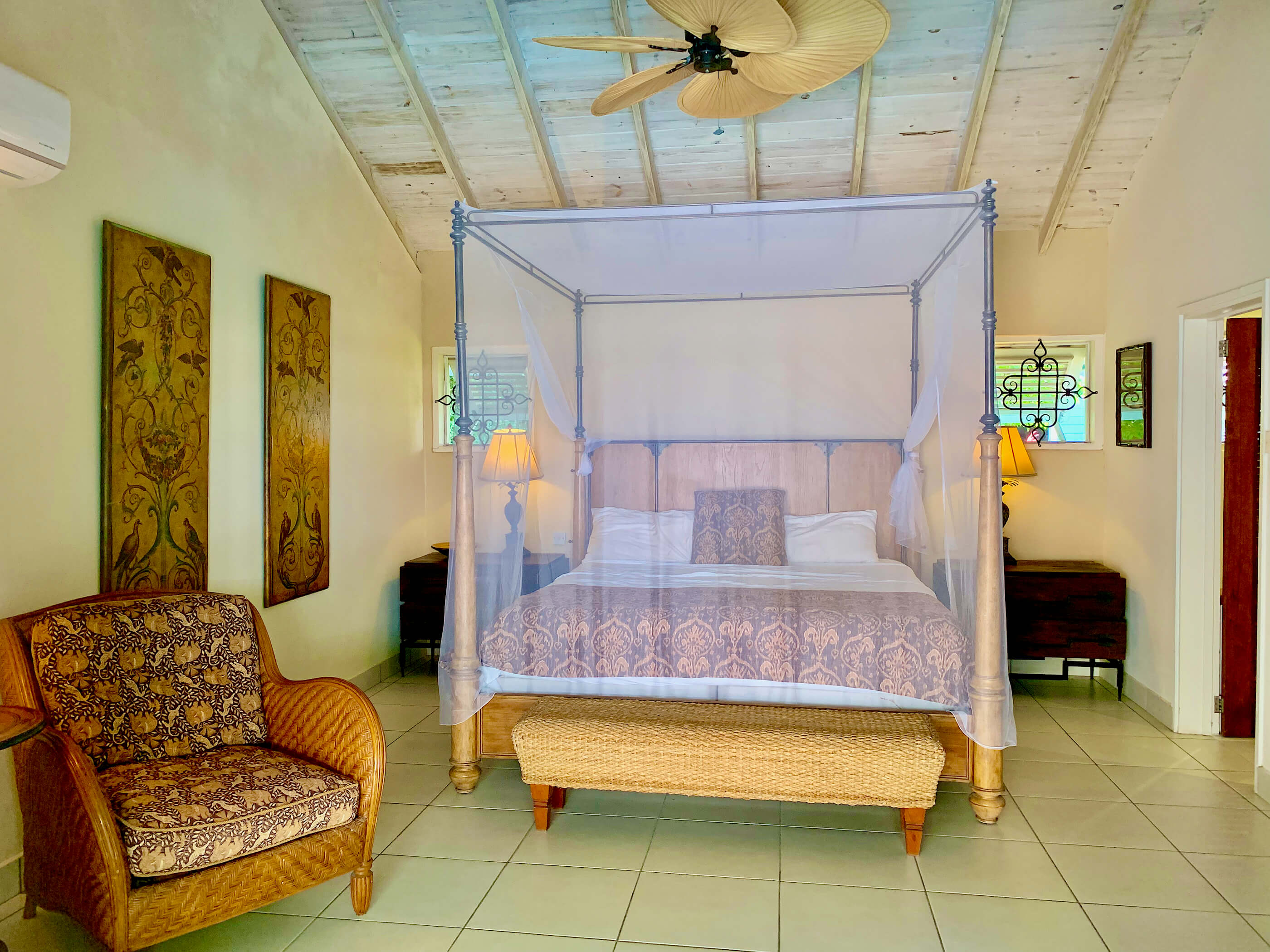 StoneHouse & Cottage has a lovely traditional Caribbean feel, with natural stone and wood exterior. Recently renovated to a high standard, the furnishings are of great quality and fit perfectly with the colour scheme and traditional style, and there are ceiling fans throughout, along with air conditioning in the bedrooms.