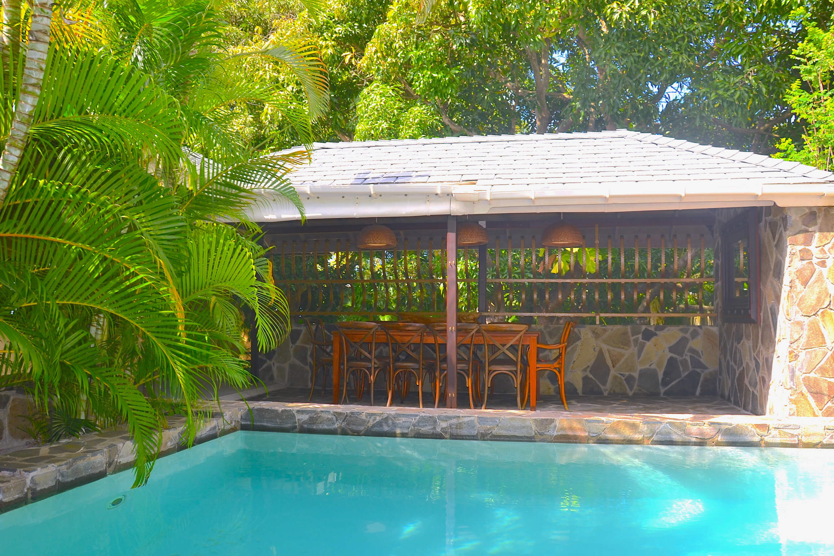 Guests can enjoy al fresco dining at Stone House, at a beautiful table with seating for 4 guests, overlooking the pool. There are also other dining areas inside. The kitchen has a huge amount of storage space in which to prepare your meals, and is very well equipped.