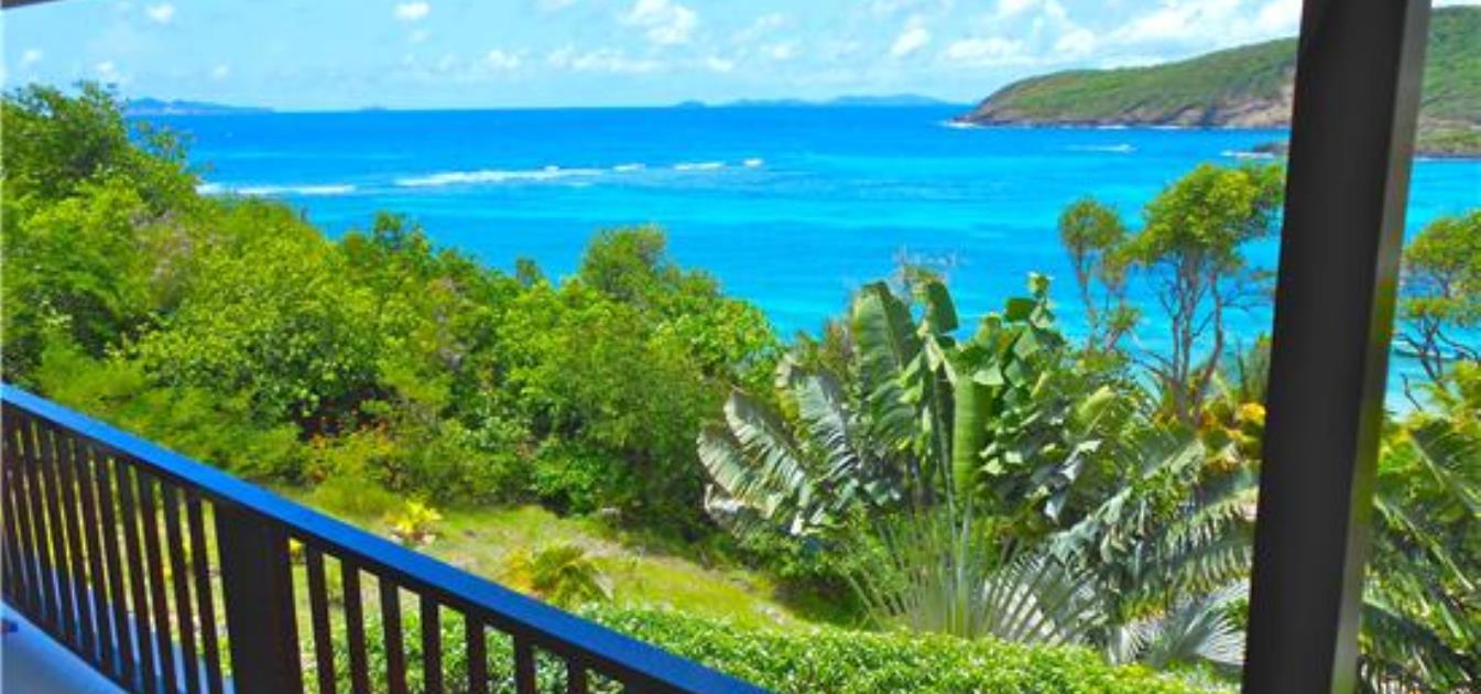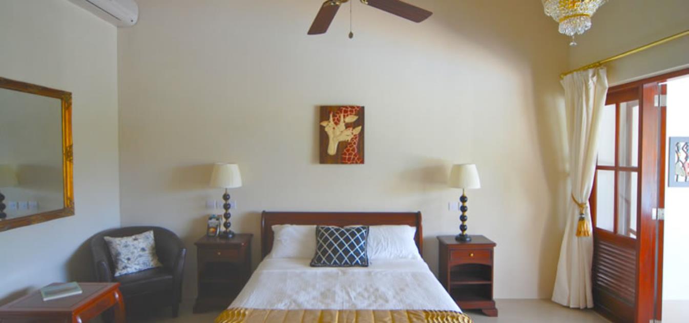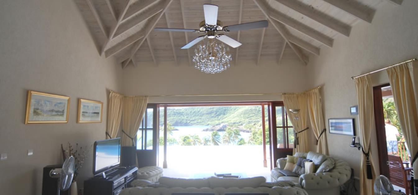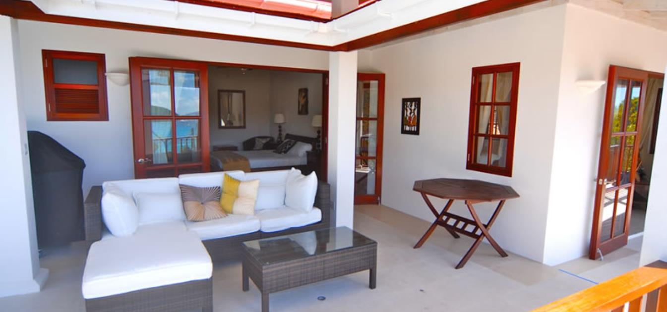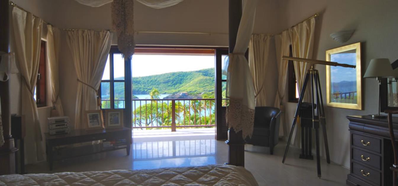 All the bedrooms throughout the property have 10 foot wide mahogany French doors opening south onto the verandas with views over Industry Bay toward Mustique.