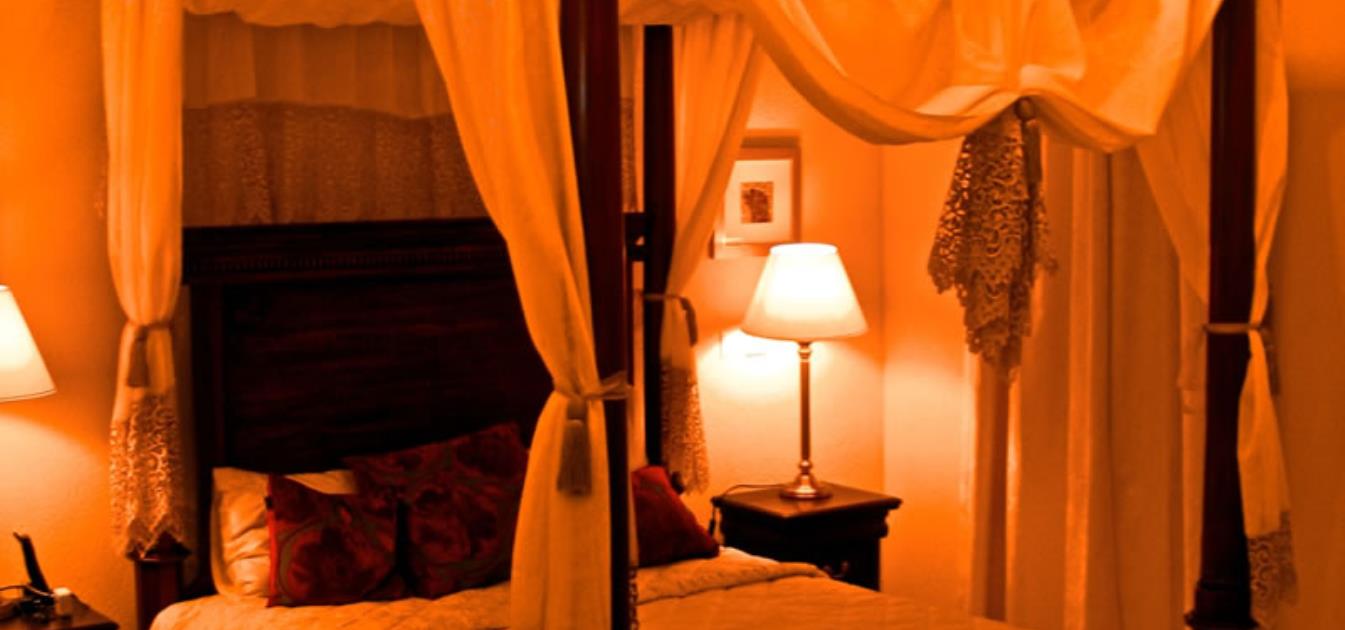 Magnificent Four poster King sized bed in the master mahogany bedroom. You can relax in luxury with both air conditioning and ceiling fan. Romantic Gustav Klimt pictures hang in gold frames lit with a cut-glass chandelier.