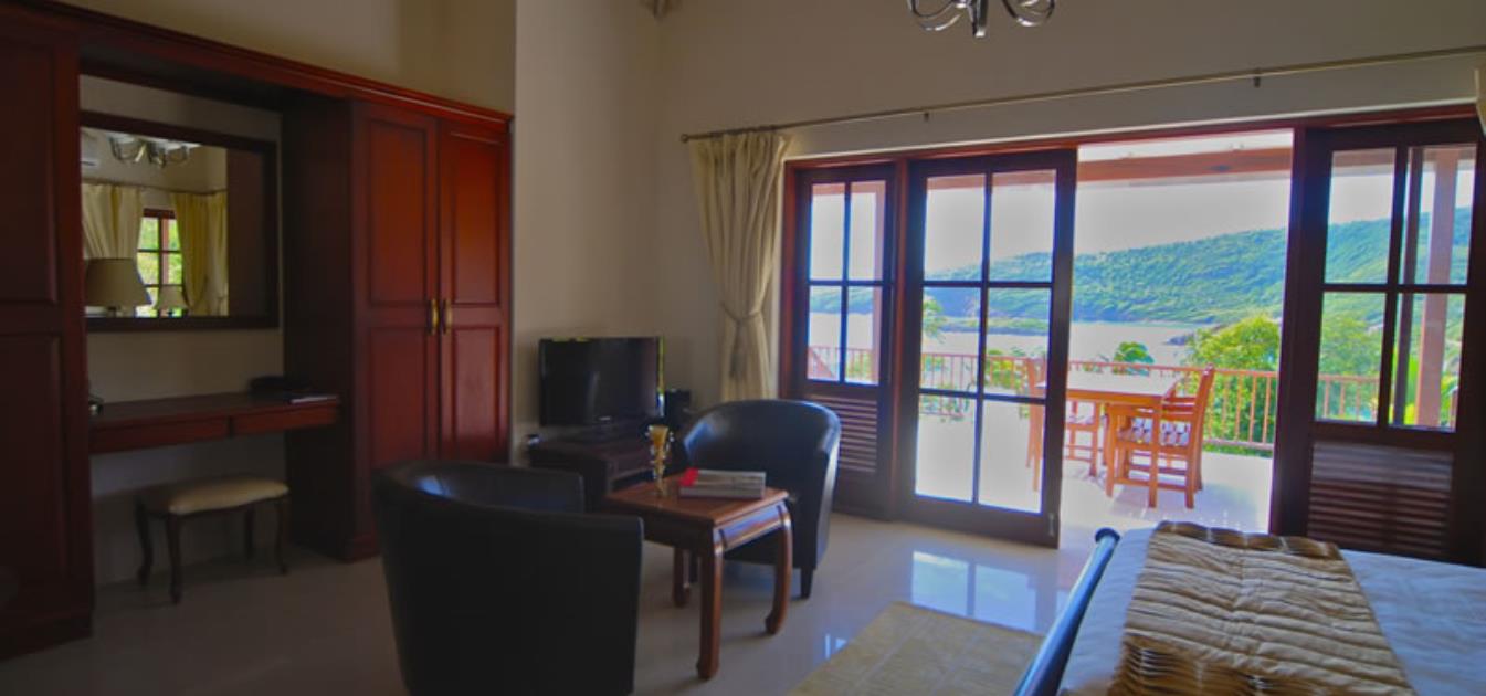 Panorama sleeps 2 guests and is located on the Upper pool level of 340 square ft with direct access via it's large 12 ft wide French doors to the upper levels 1,500 square ft of verandas, Sundecks and panoramic views. Of a traditional design with high, open, hand finished 'pickled' white boarded ceiling and mahogany furniture with a US 'Queen' size sleigh bed.