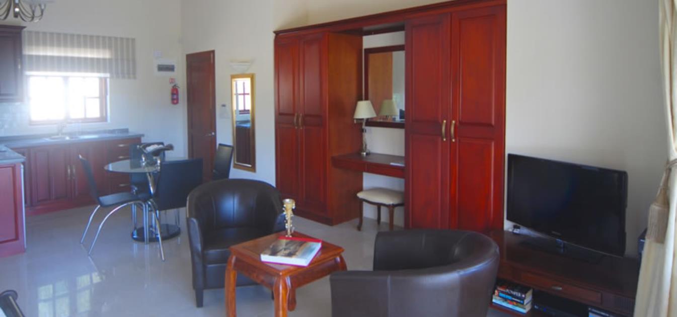 This luxurious studio apartment with sumptuous high quality furnishing has a/c and direct access to both private and communal verandas, a 30 foot infinity pool, ample sized sun deck and shaded dining and lounging gazebos. The airy open plan bedroom and living area create a refreshing stylish and comfortable atmosphere. A very pleasing place to stay and relax.