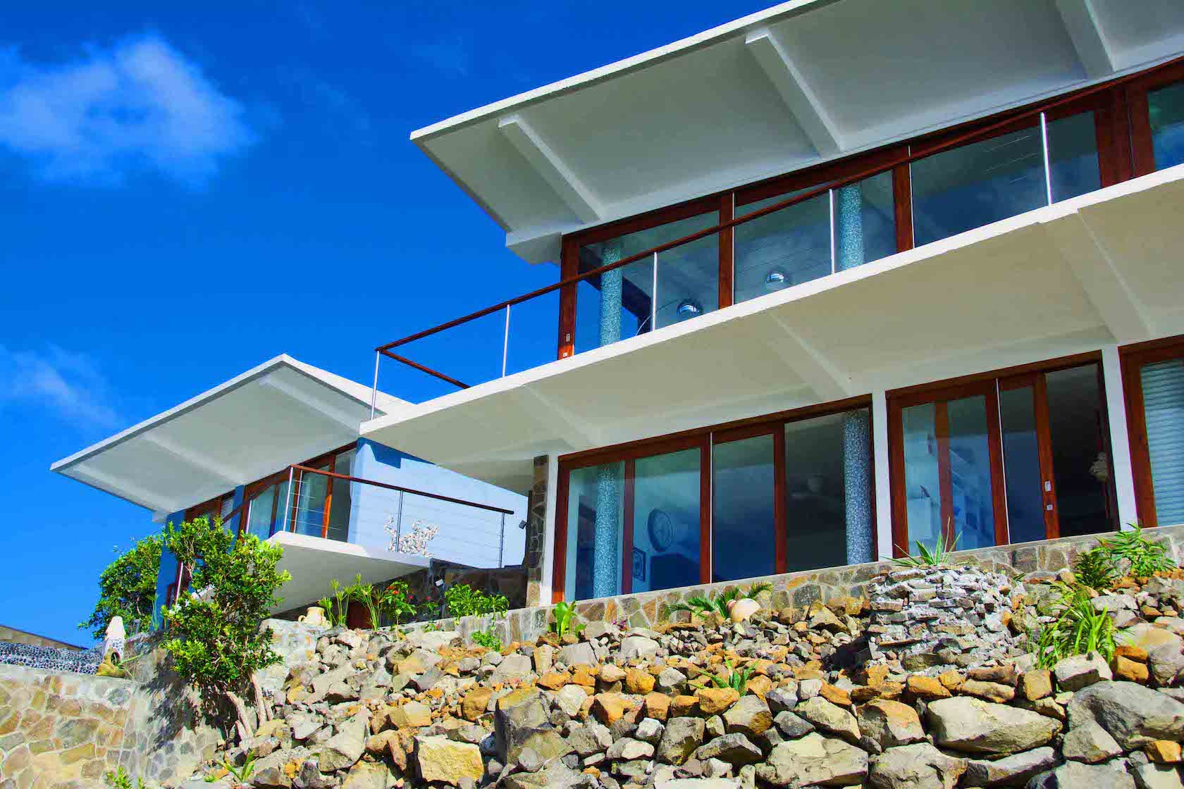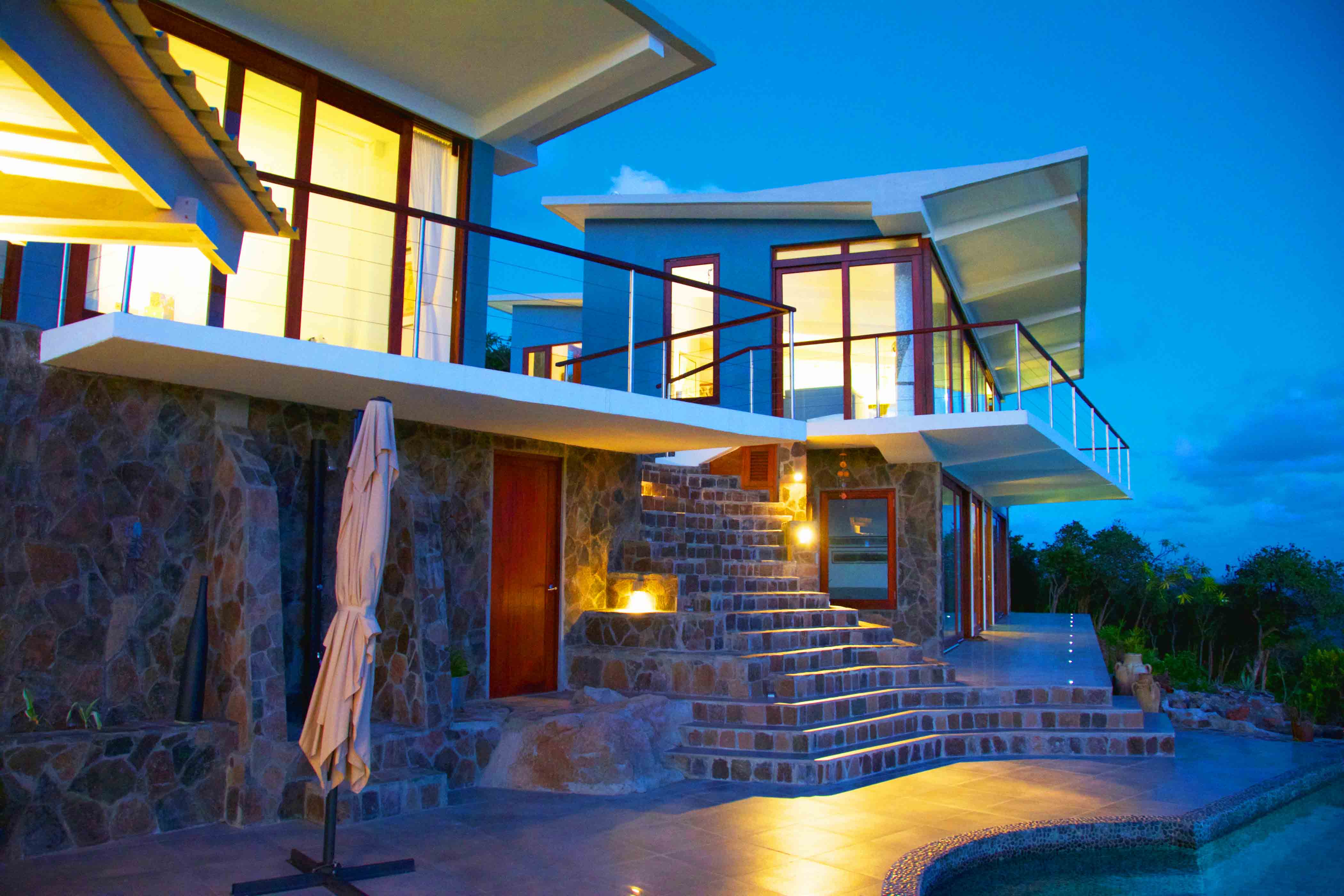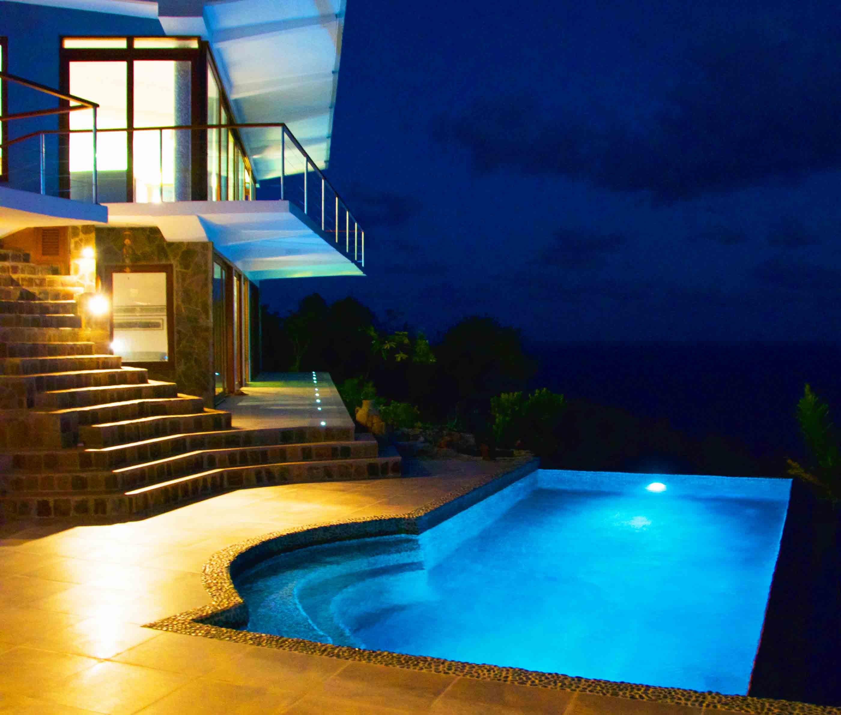 Floor to ceiling windows and doors keep the space light and airy, and allow full access to the spectacular panoramic views. These spaces open up completely along one side onto the spacious balcony overlooking the swimming pool, gardens and Crescent Bay below. To the right of the balcony are the natural stone steps which access the beautiful infinity swimming pool and sun deck area.