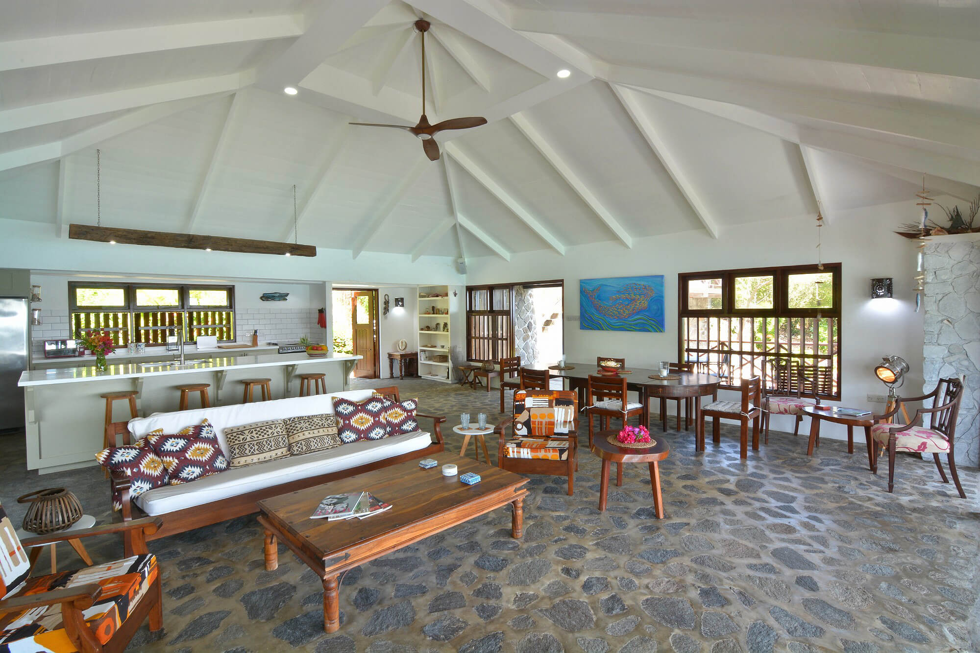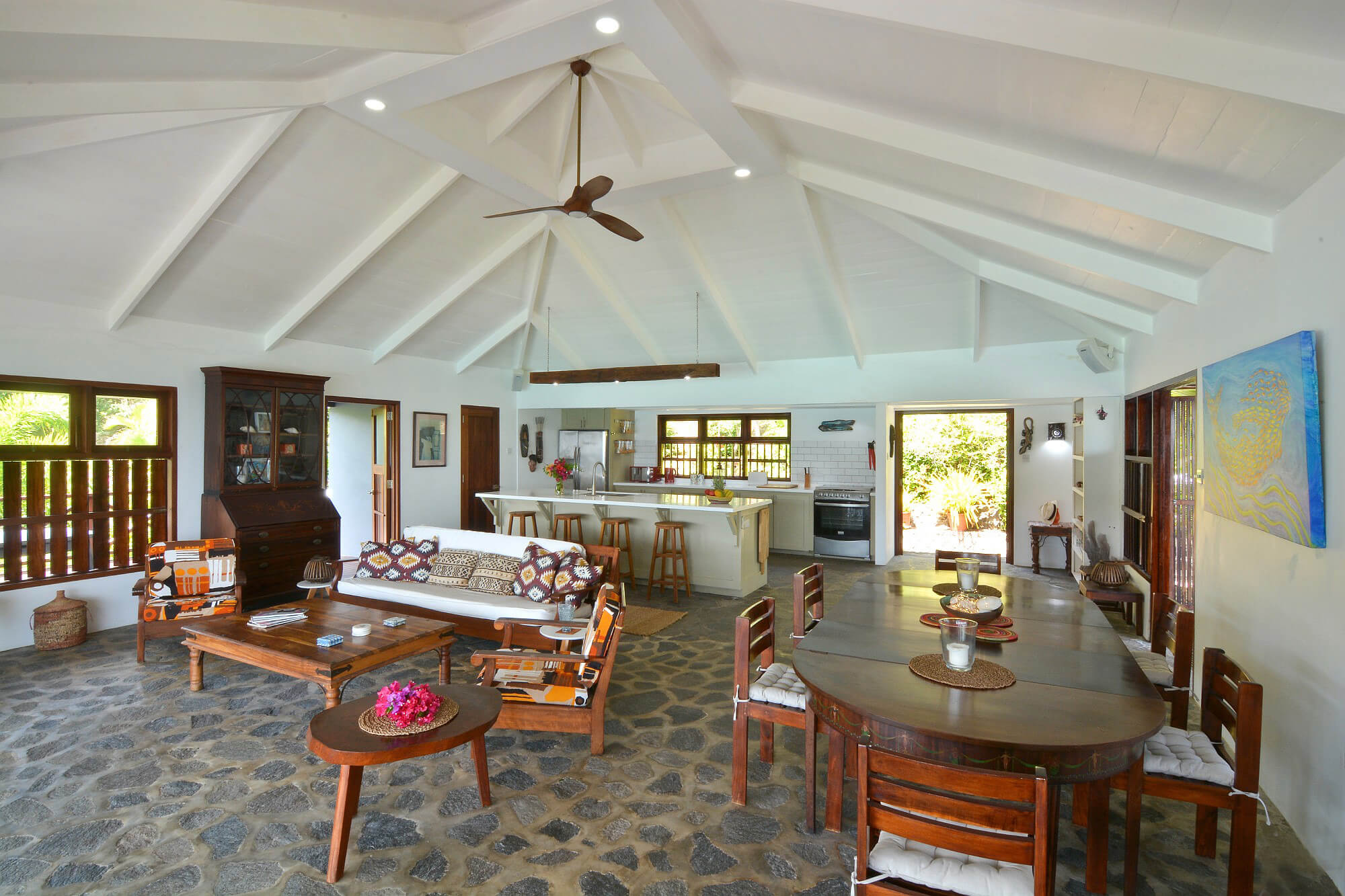 Recently renovated and modernised in a simple contemporary style. This is a cool building in every sense of the word, with spacious open plan rooms & high airy ceilings. The wonderful trade wind breezes help regulate the temperature to the perfect degree. All 4 bedrooms also have air conditioning. Beautifully maintained and styled with traditional natural materials and a modern flair.